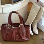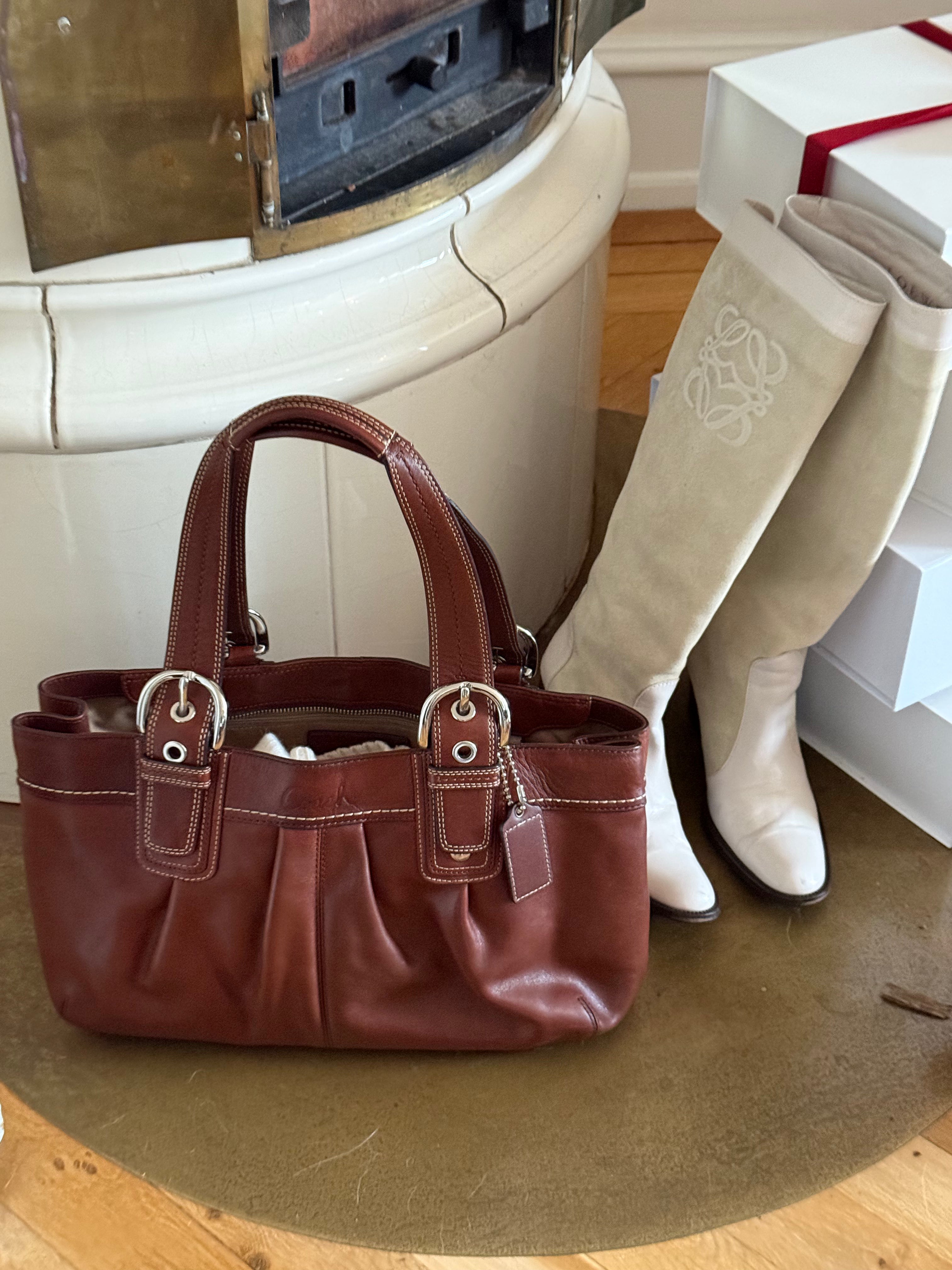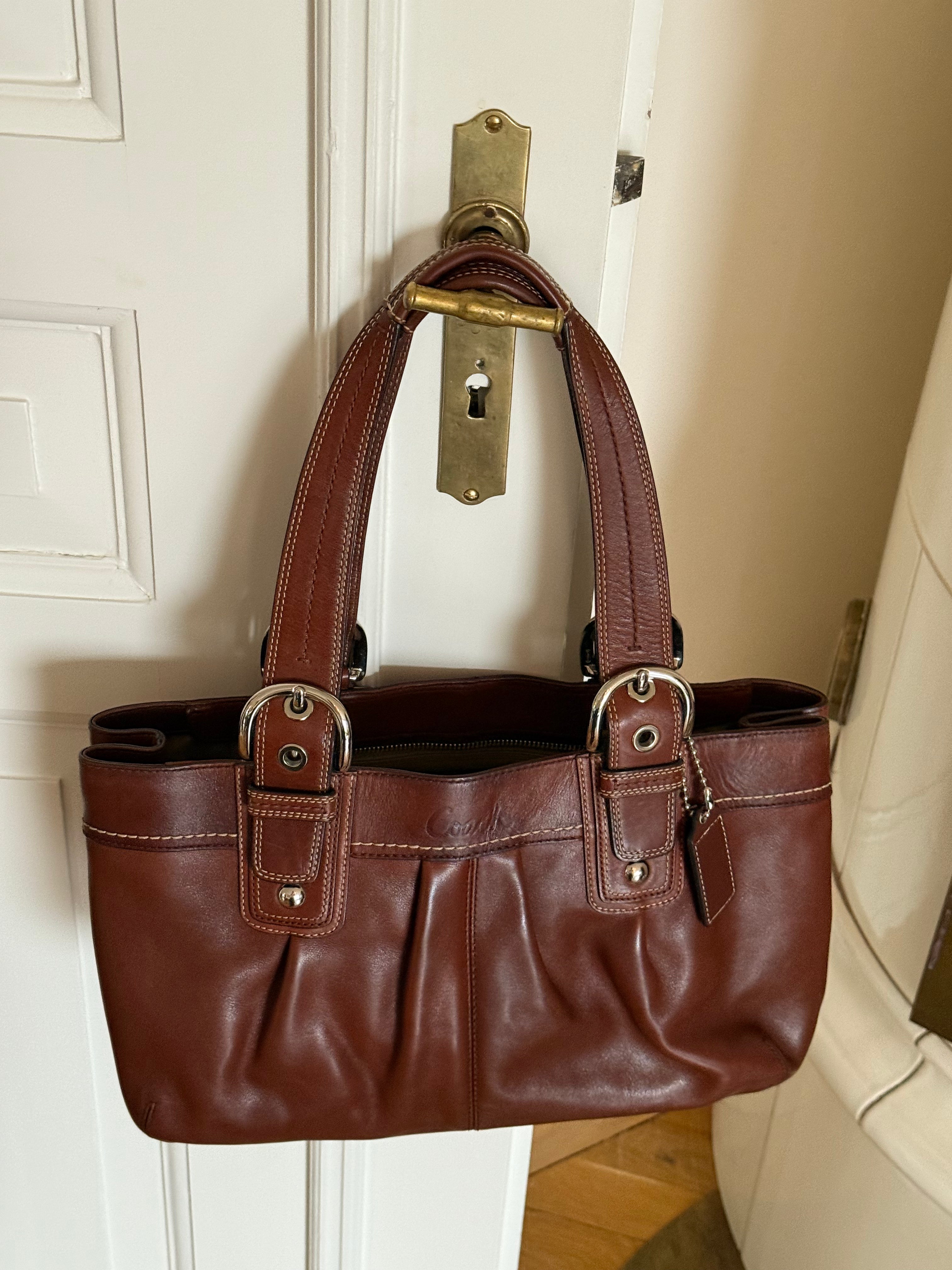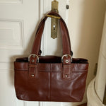 Vintage Coach tote bag in brown leather with silver-tone hardware and a spacious interior.