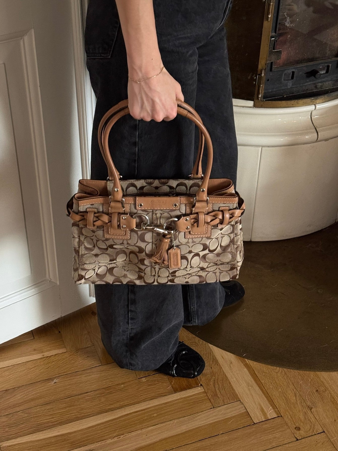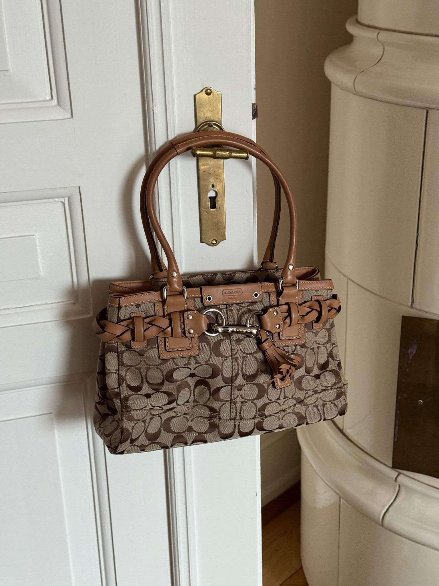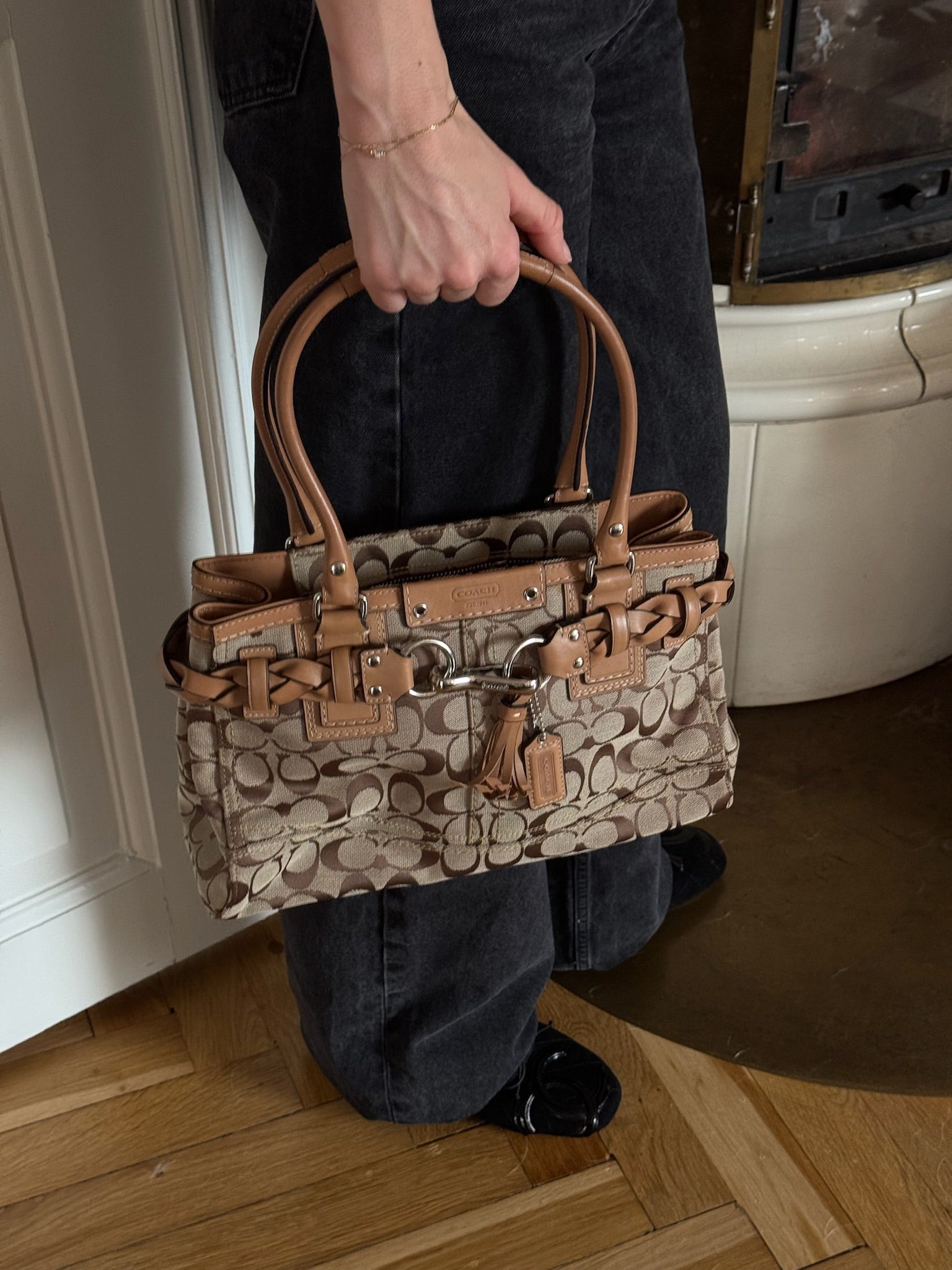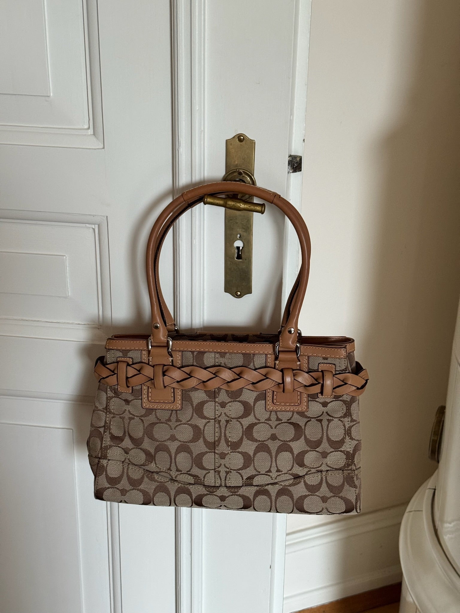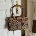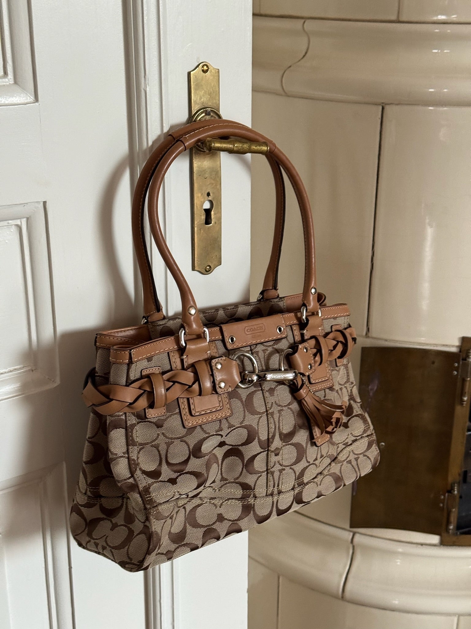 Never worn vintage Coach Hamilton hobo bag in signature sufflette canvas with beautifully braided brown leather and a signature horsebit detail. Features double handles and a spacious interior.