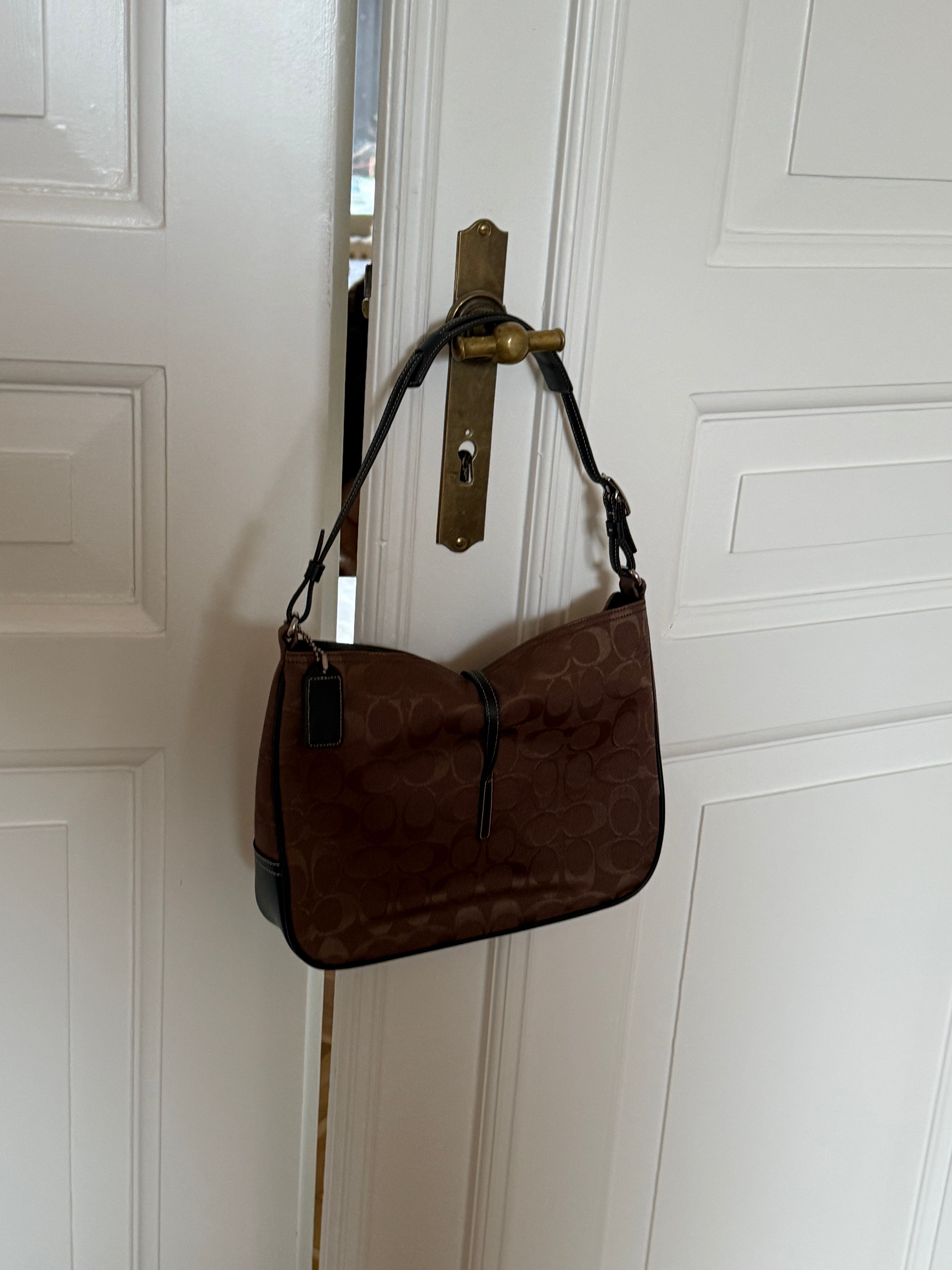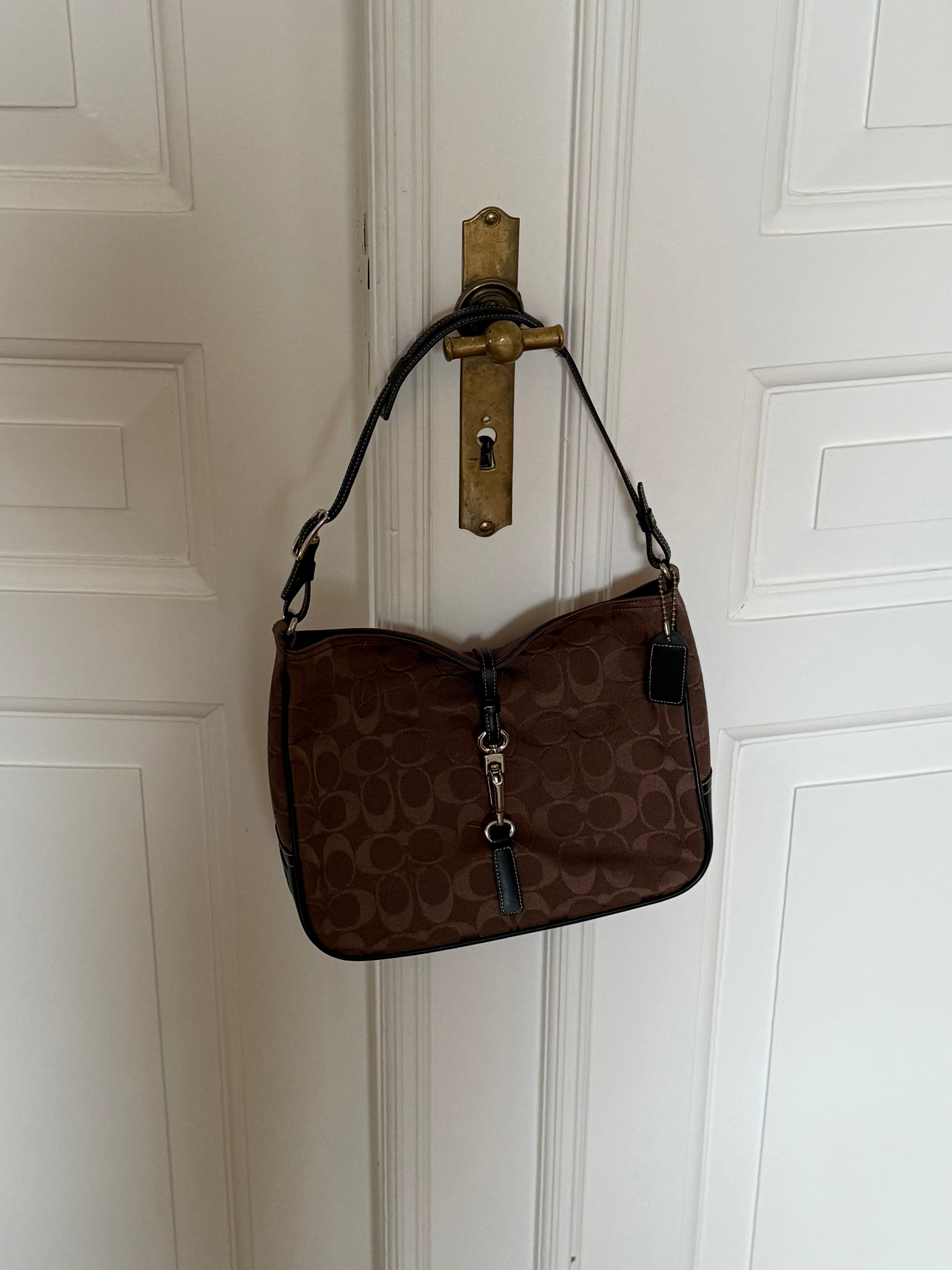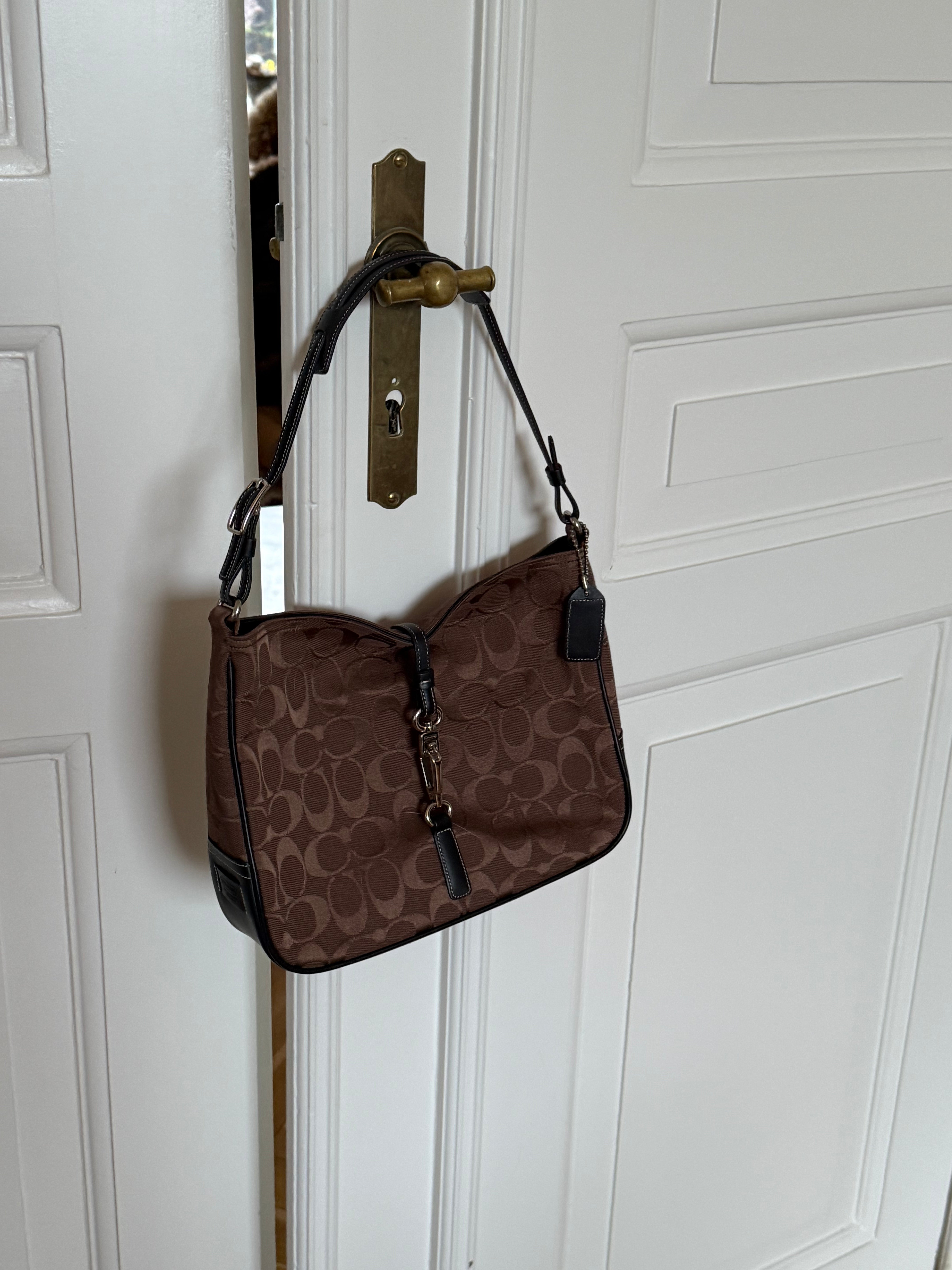 Vintage shoulder bag from Coach in brown monogram canvas and dark brown leather handles. Features white stitching and silver-tone hardware.