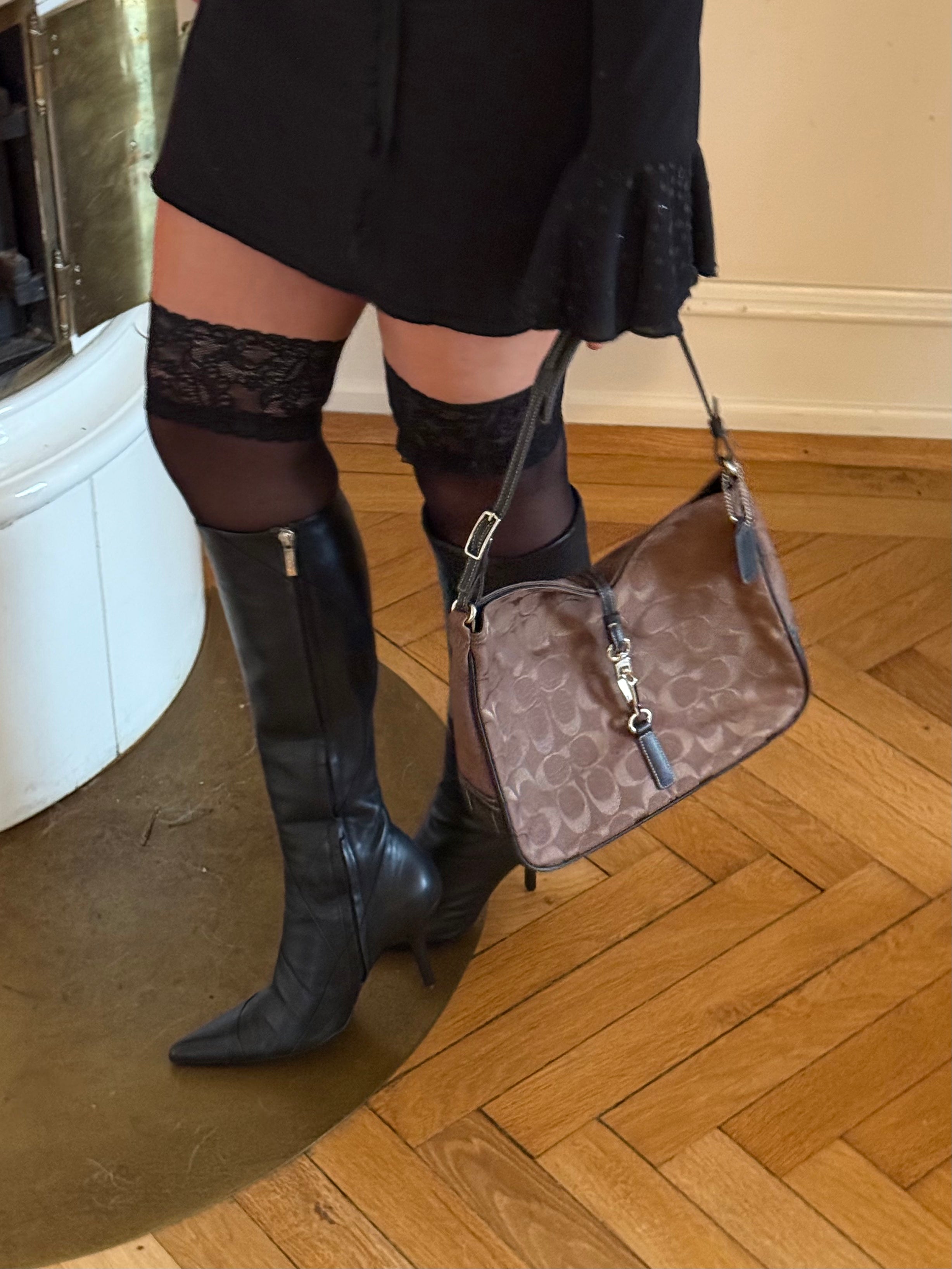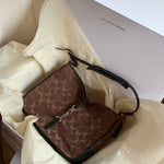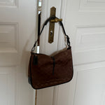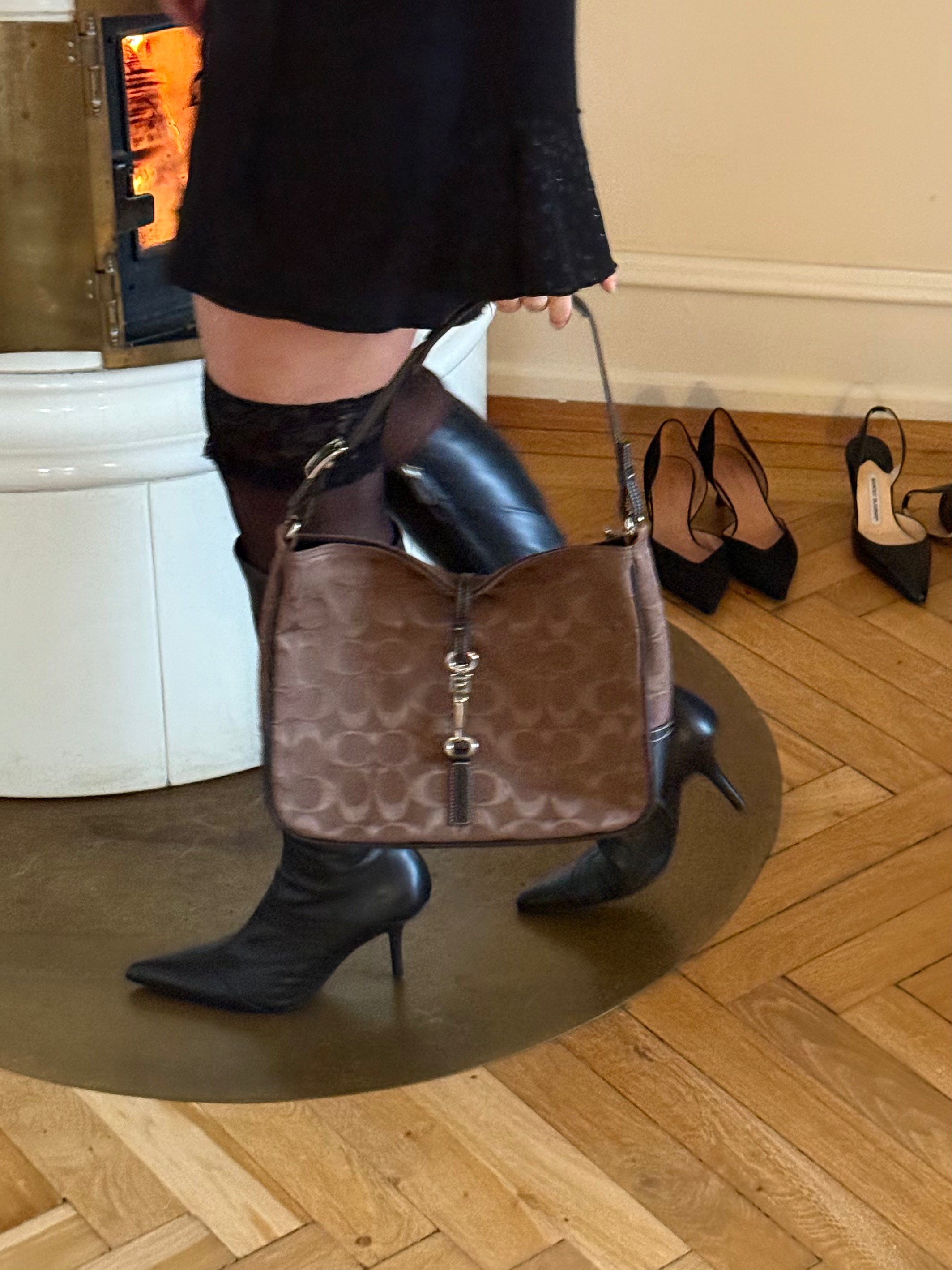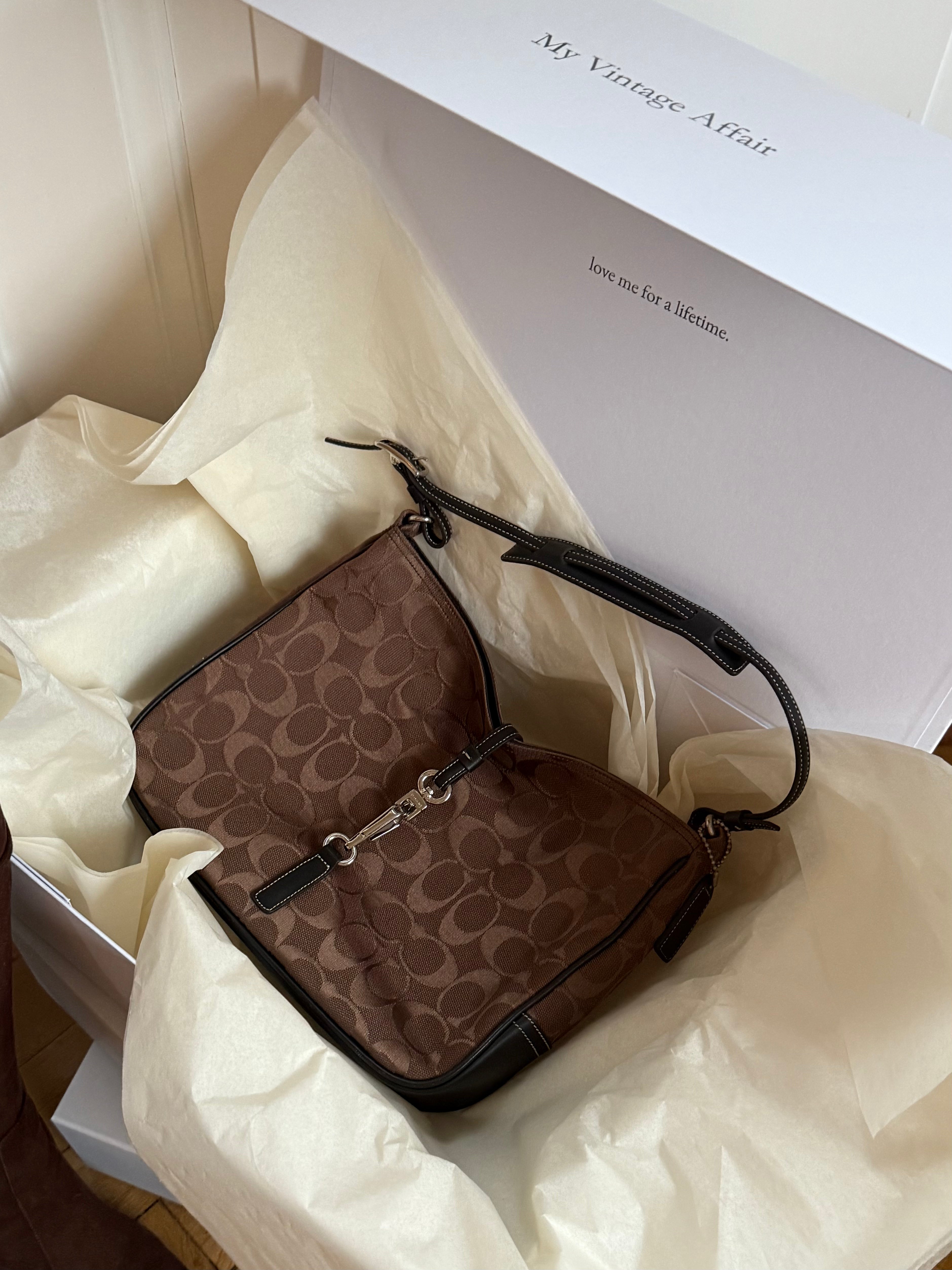 Vintage shoulder bag from Coach in brown monogram canvas and dark brown leather handles. Features white stitching and silver-tone hardware.