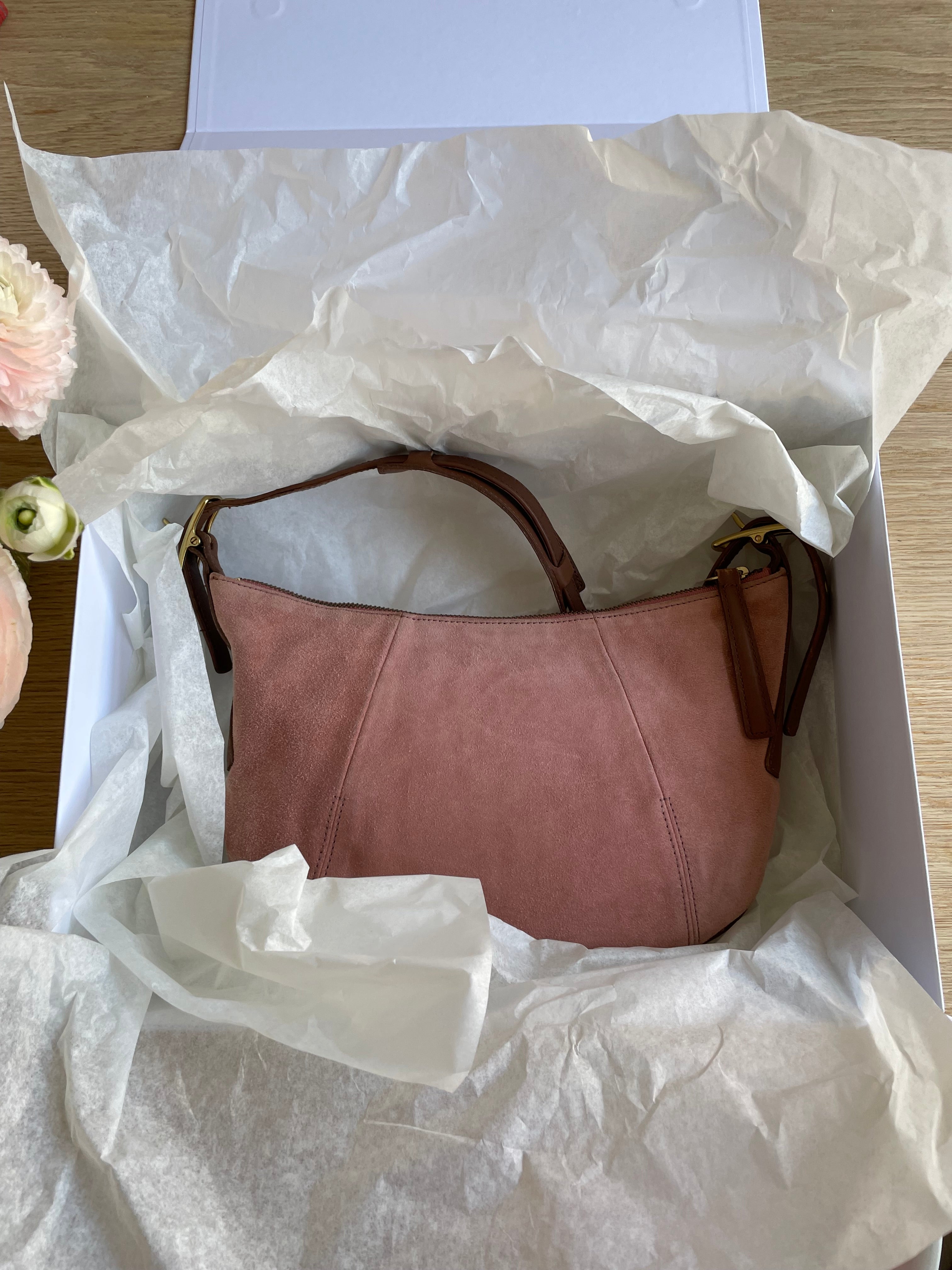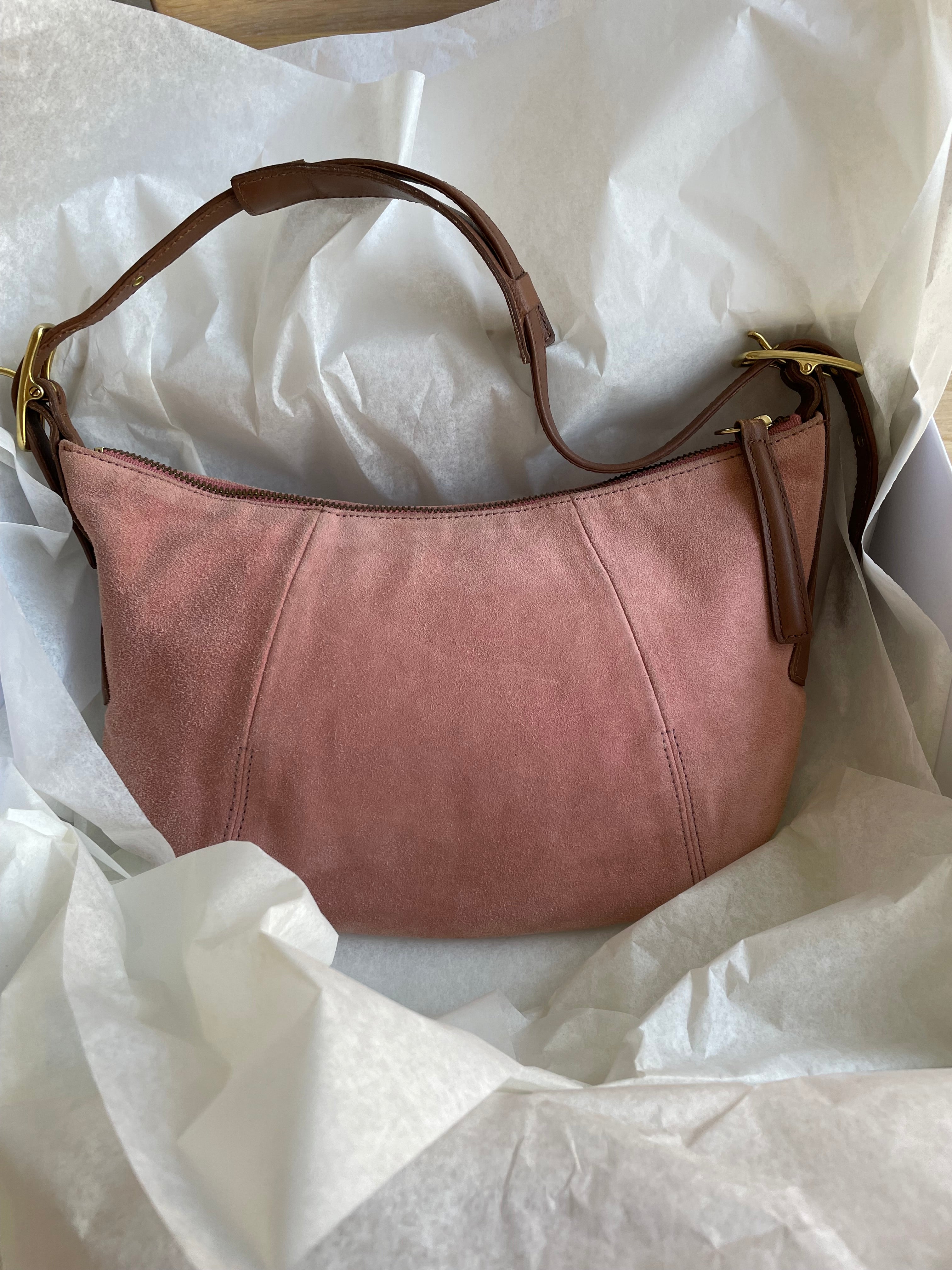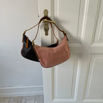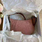 Vintage Coach bag in a rose/pink suede, gold-colored hardware and brown leather.