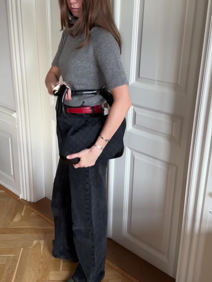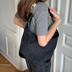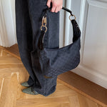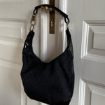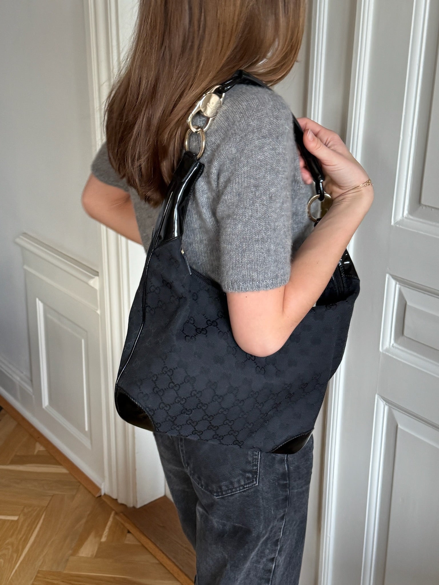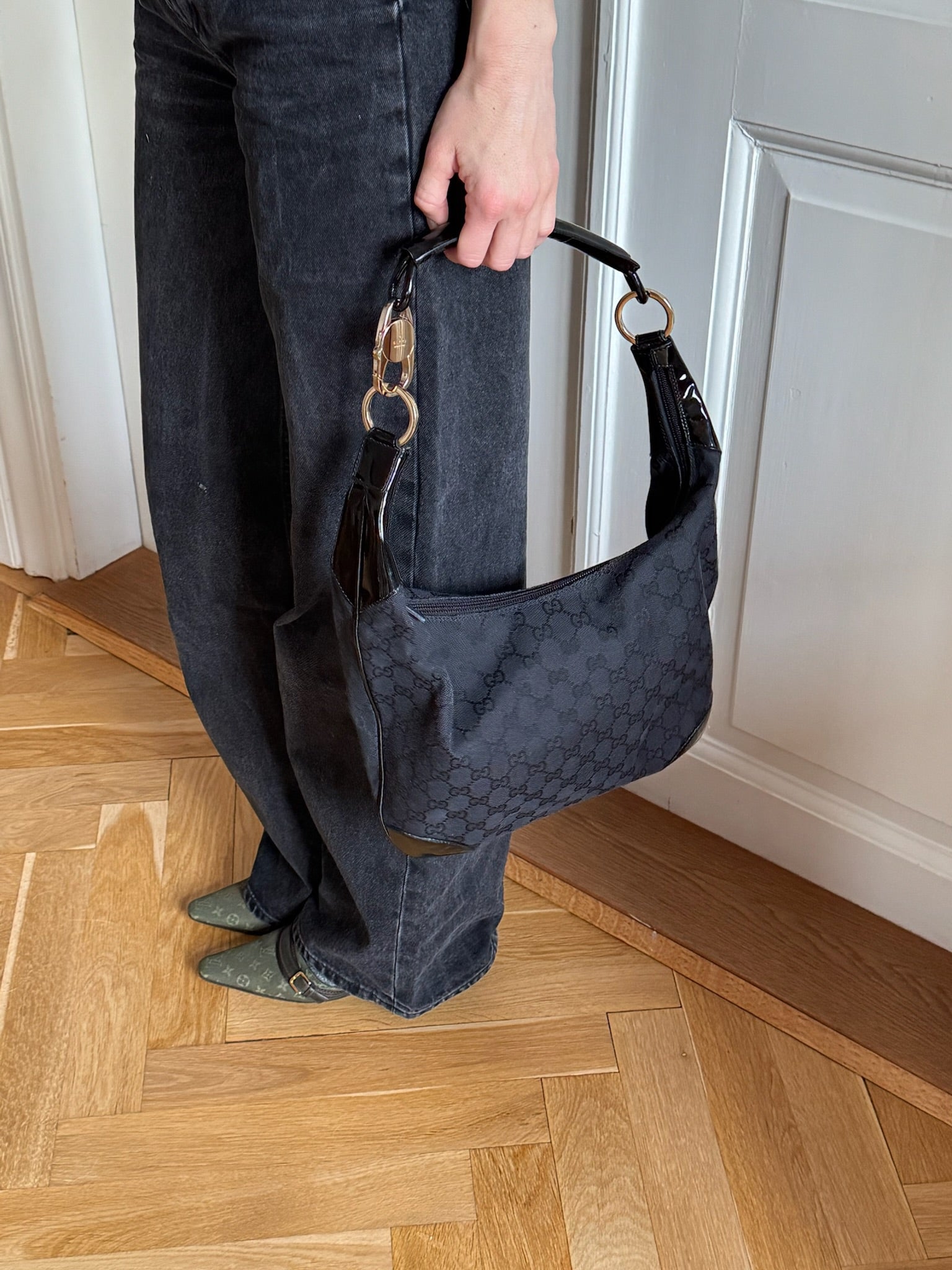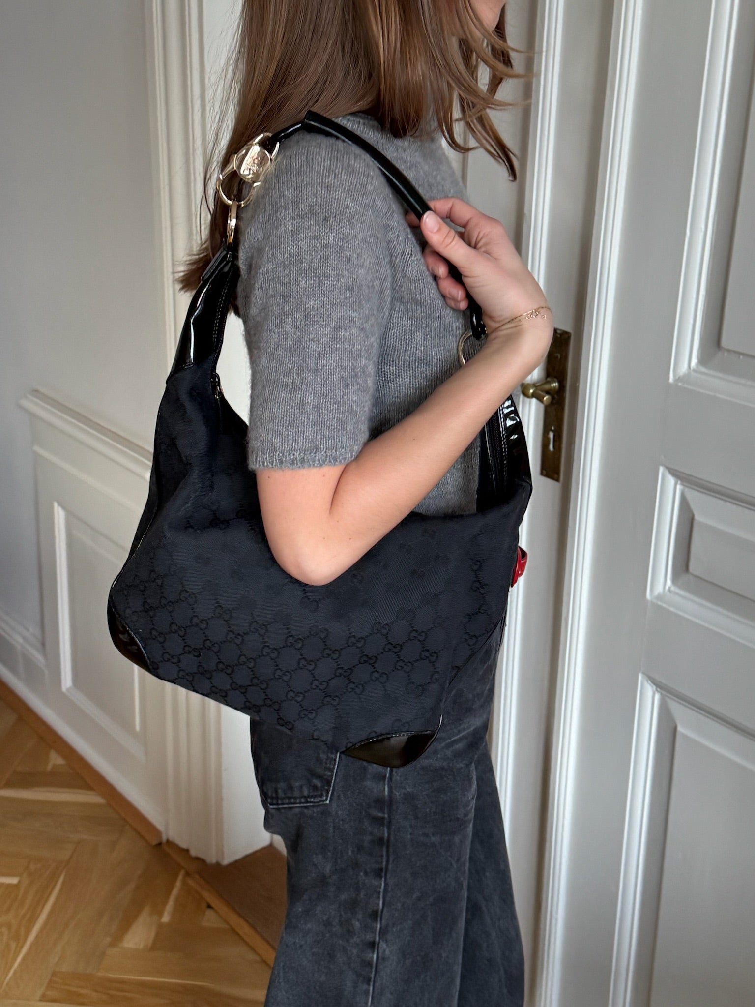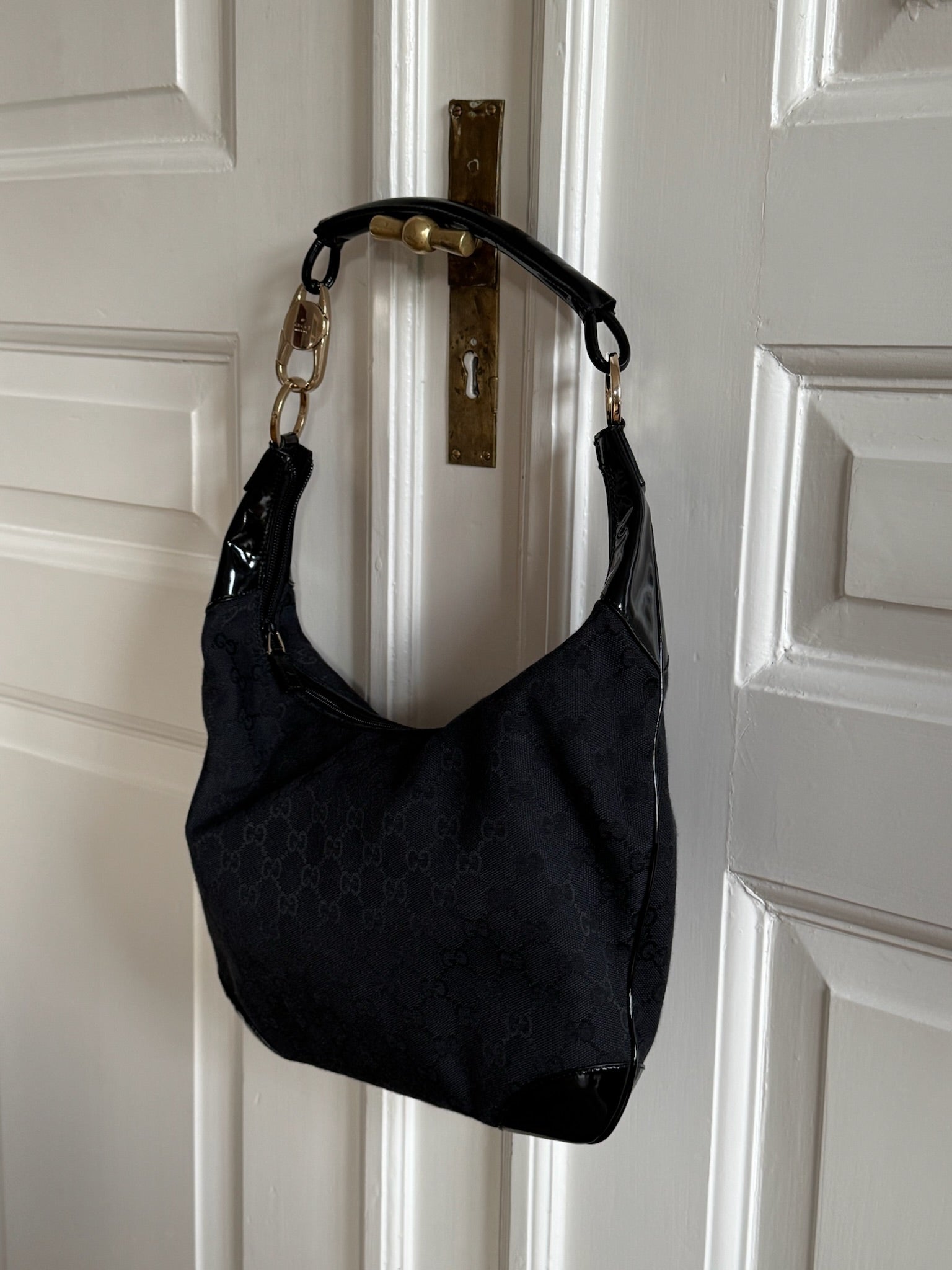 Vintage Gucci shoulder bag in monogram canvas and handles with patented black leather. The bag is in a 'as new' condition and comes with original dustbag.