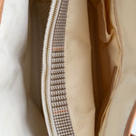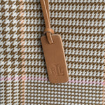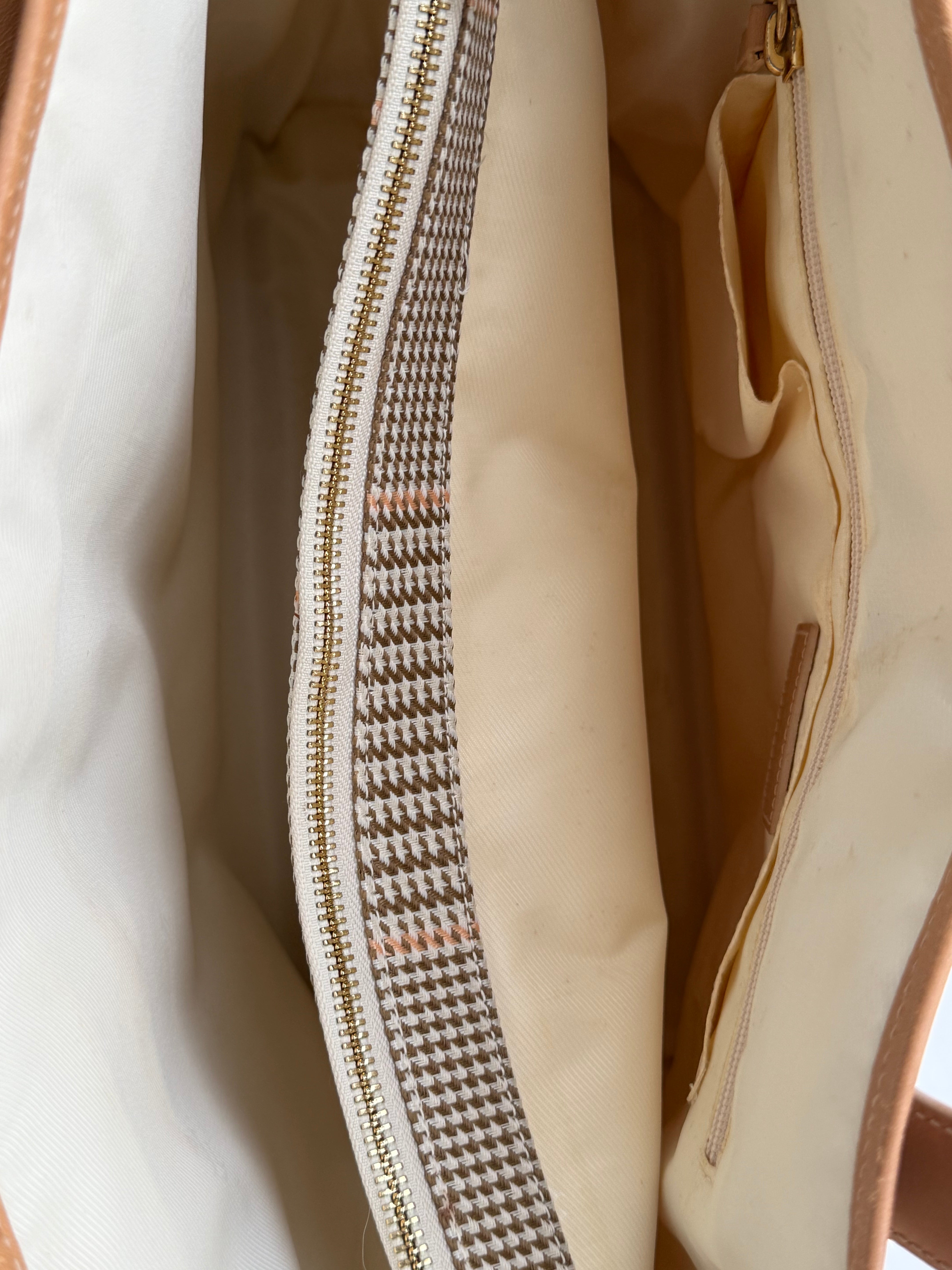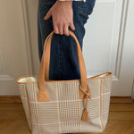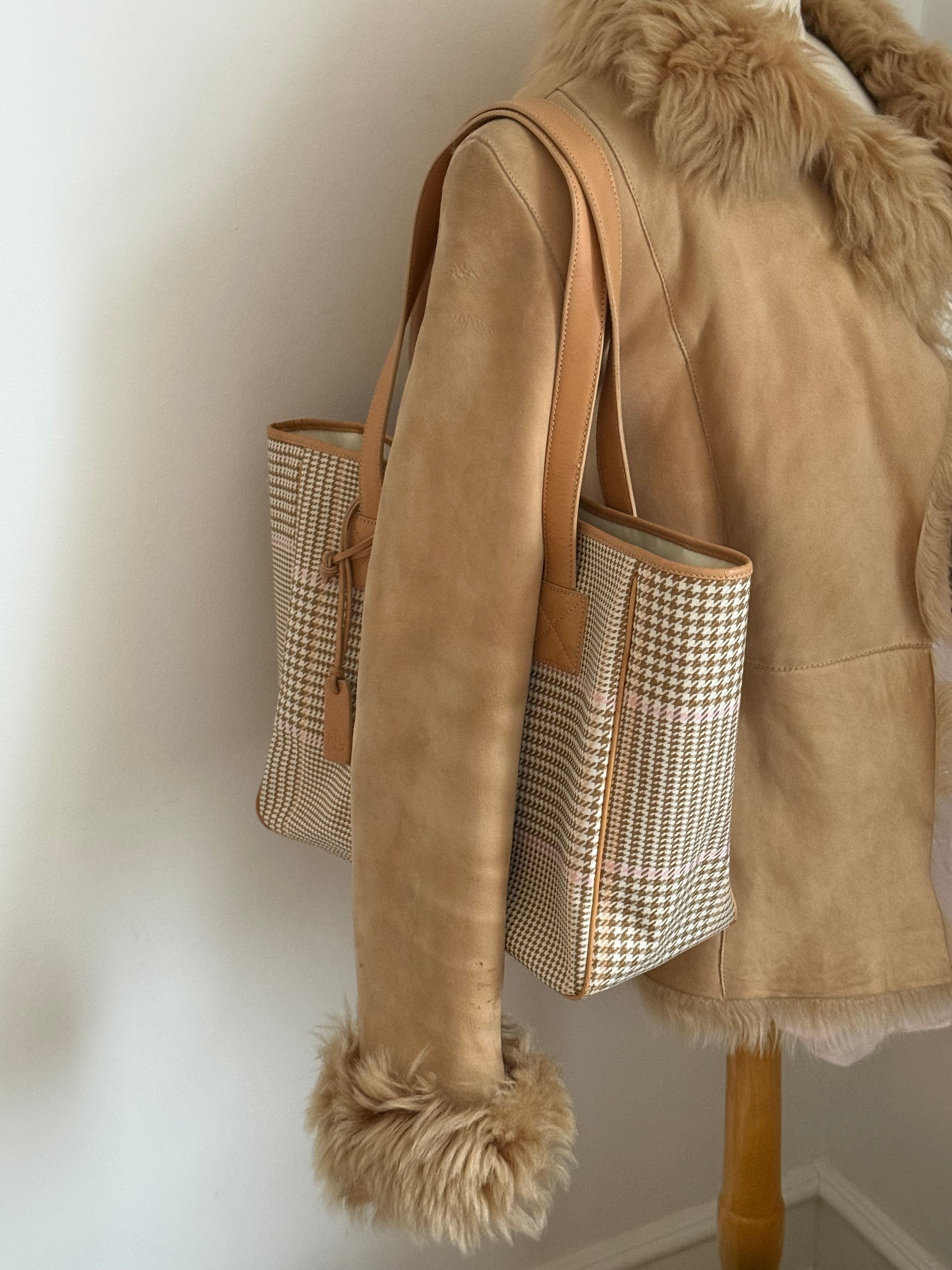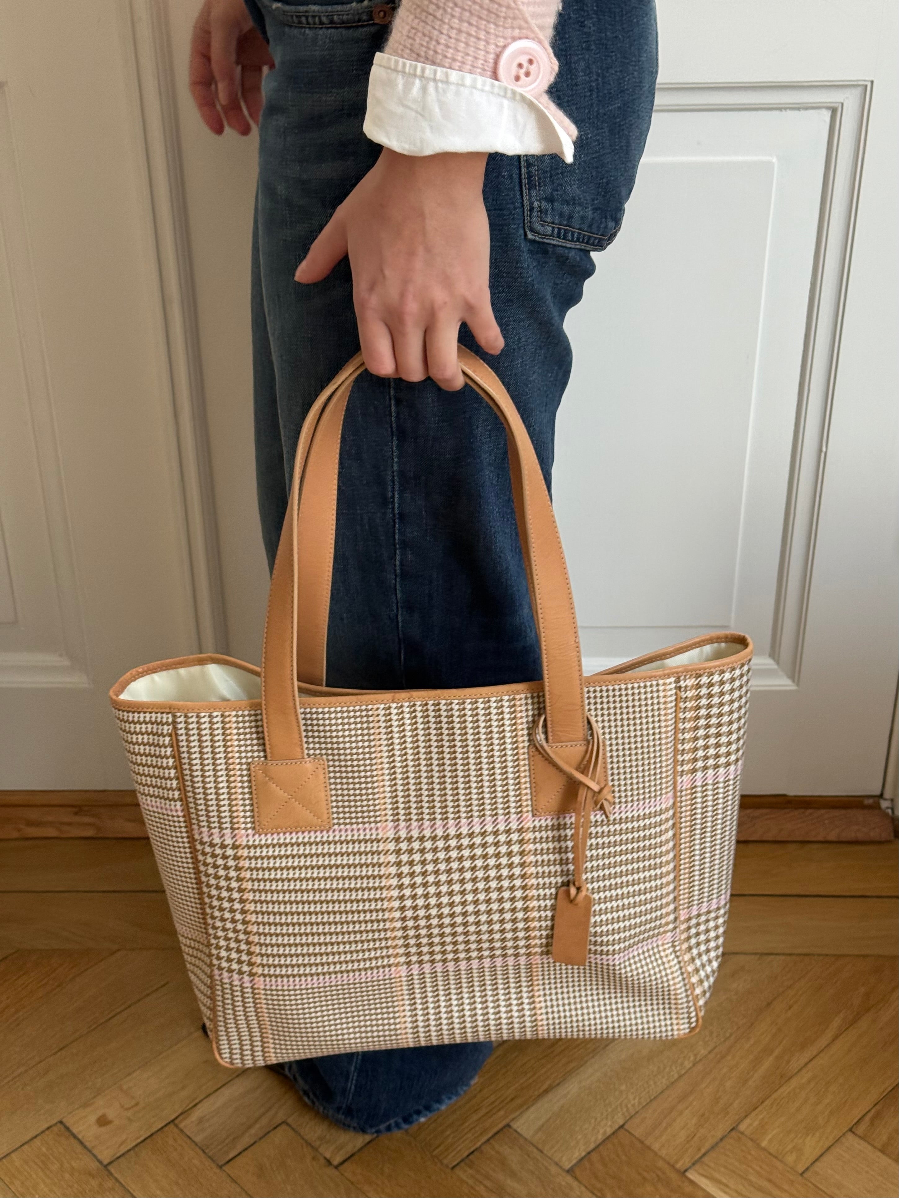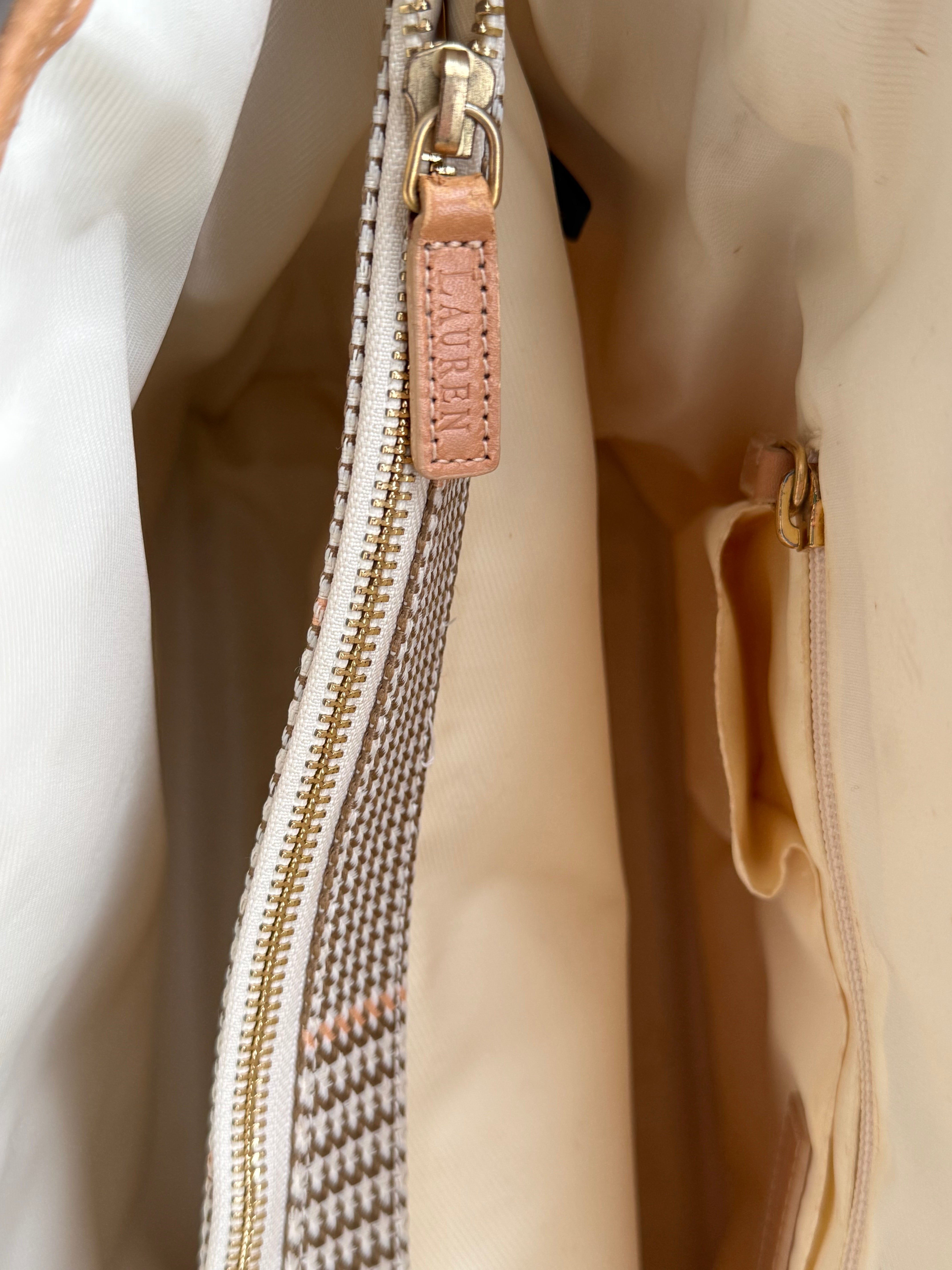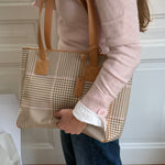 Vintage Ralph Lauren check tote in beige and pink coated canvas, complemented by beige leather handles. The bag features a spacious interior with three compartments, offering room for a laptop and much more, including one zippered section.