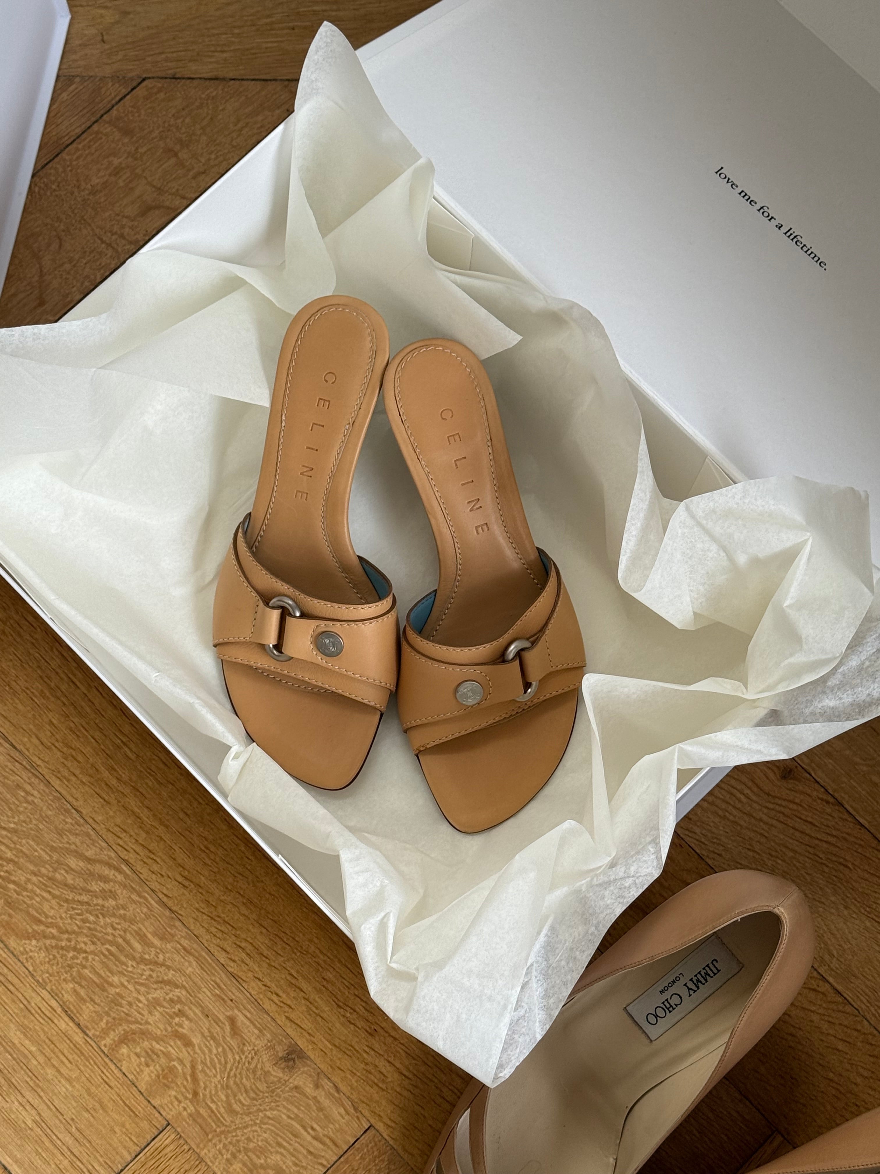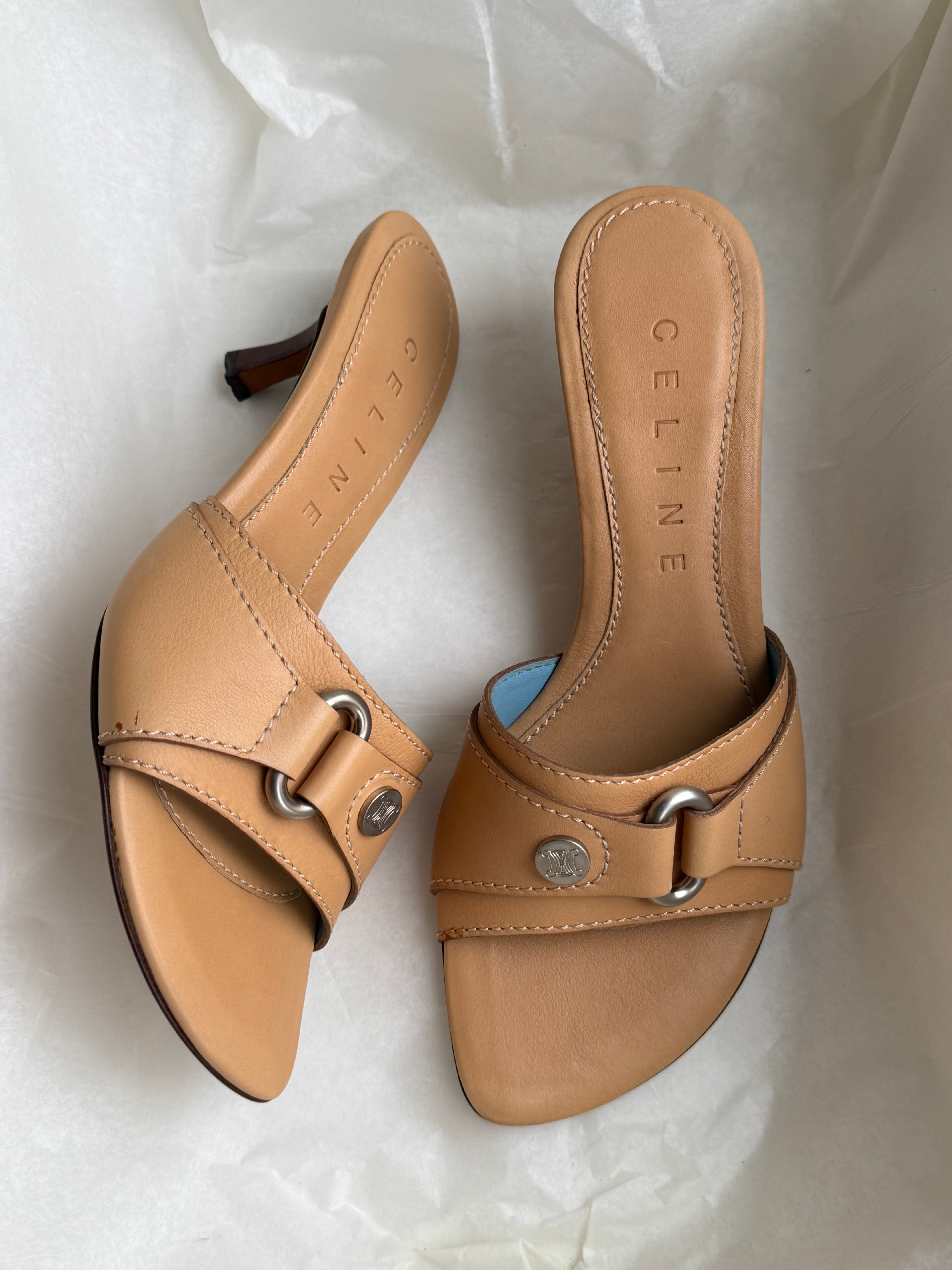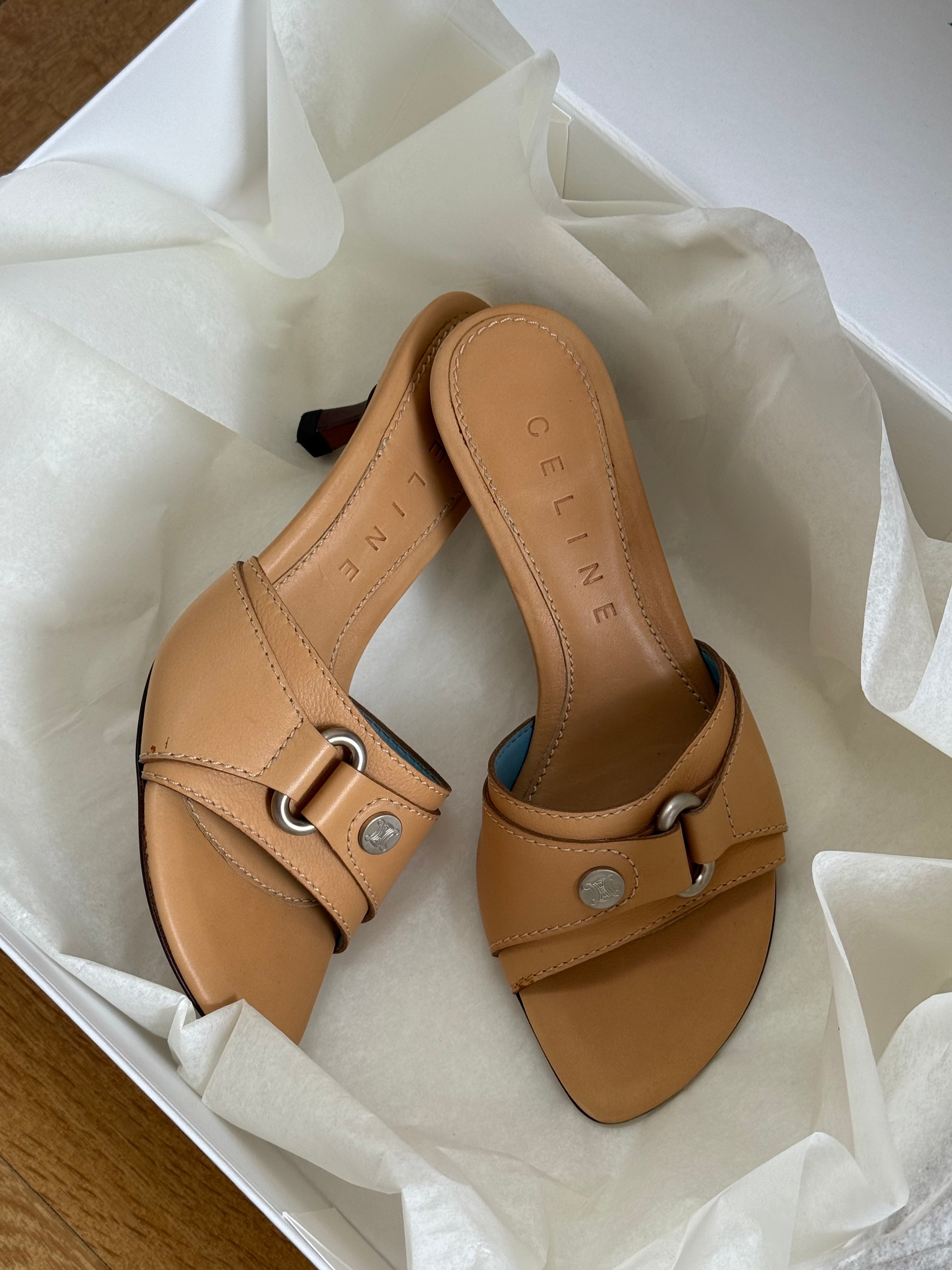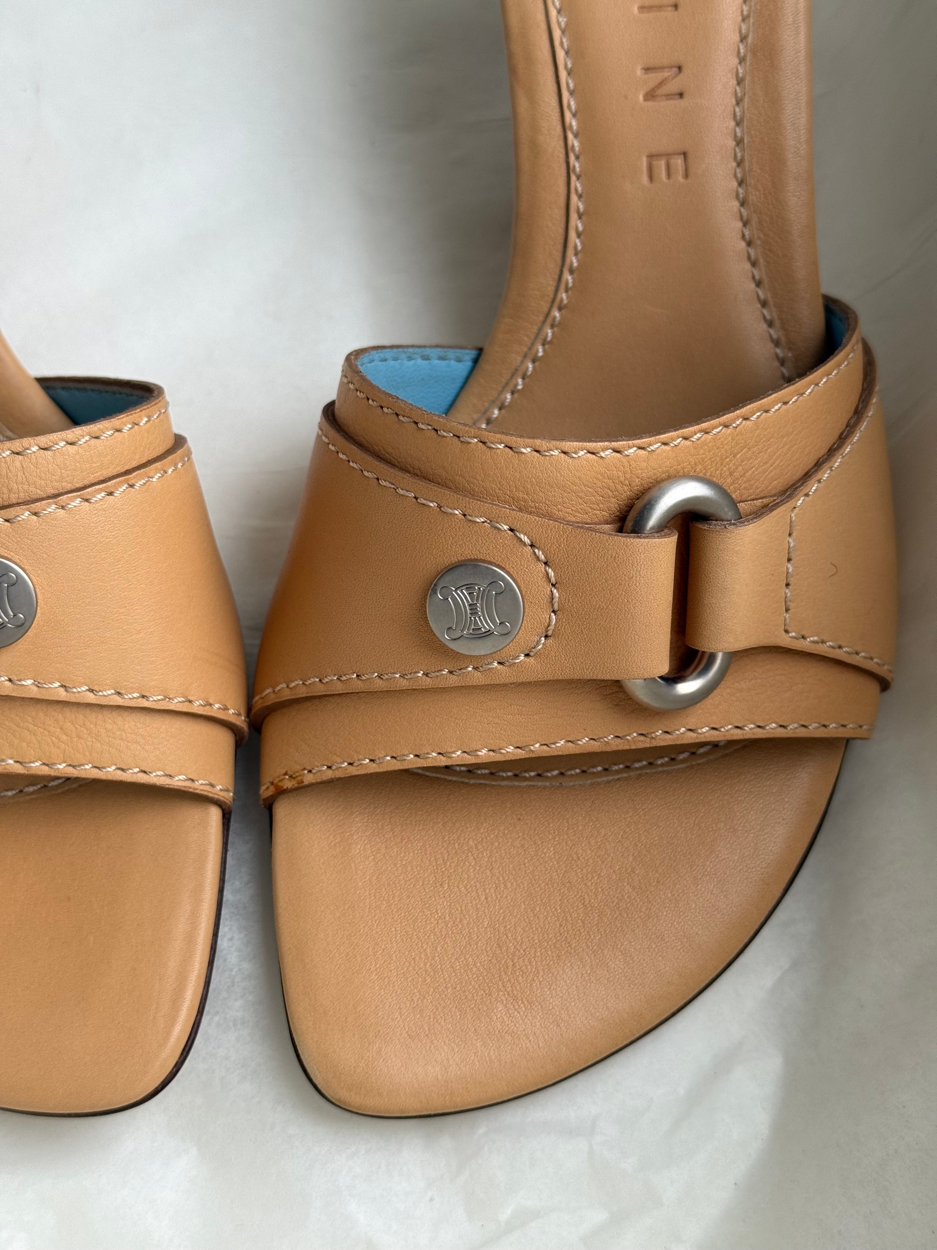 Vintage Celine leather mules with silver-tone hardware details and beautiful light blue lining.