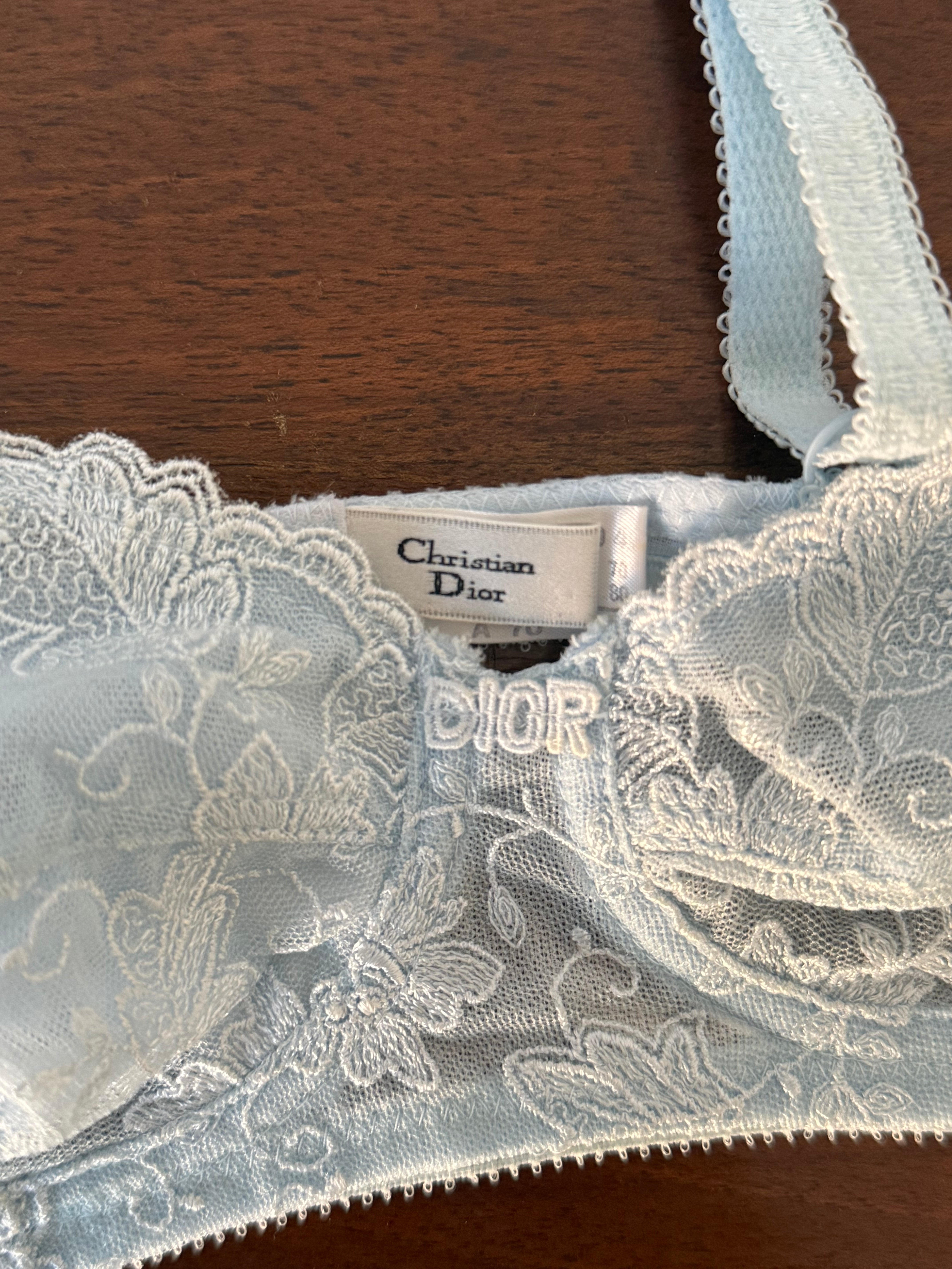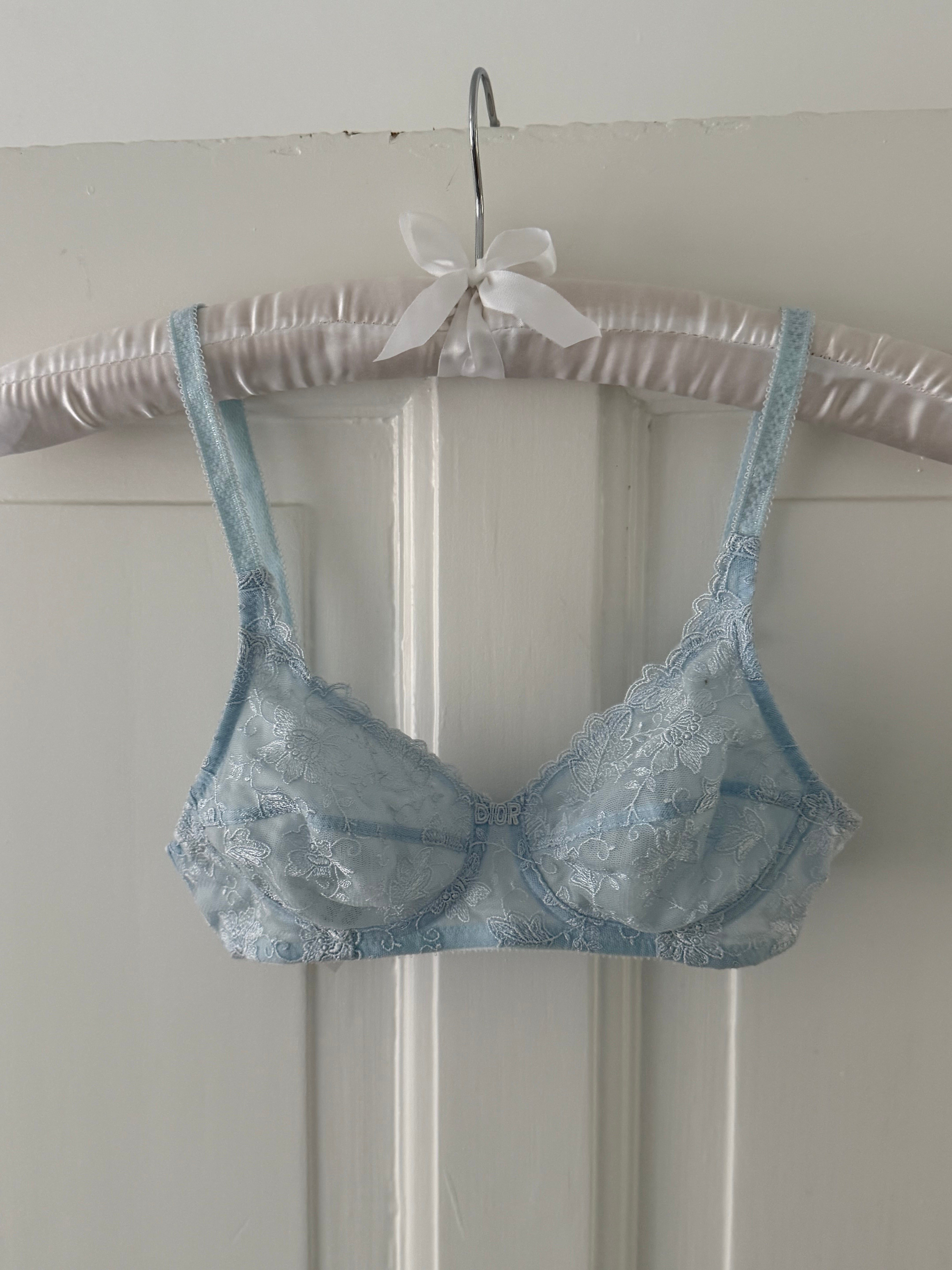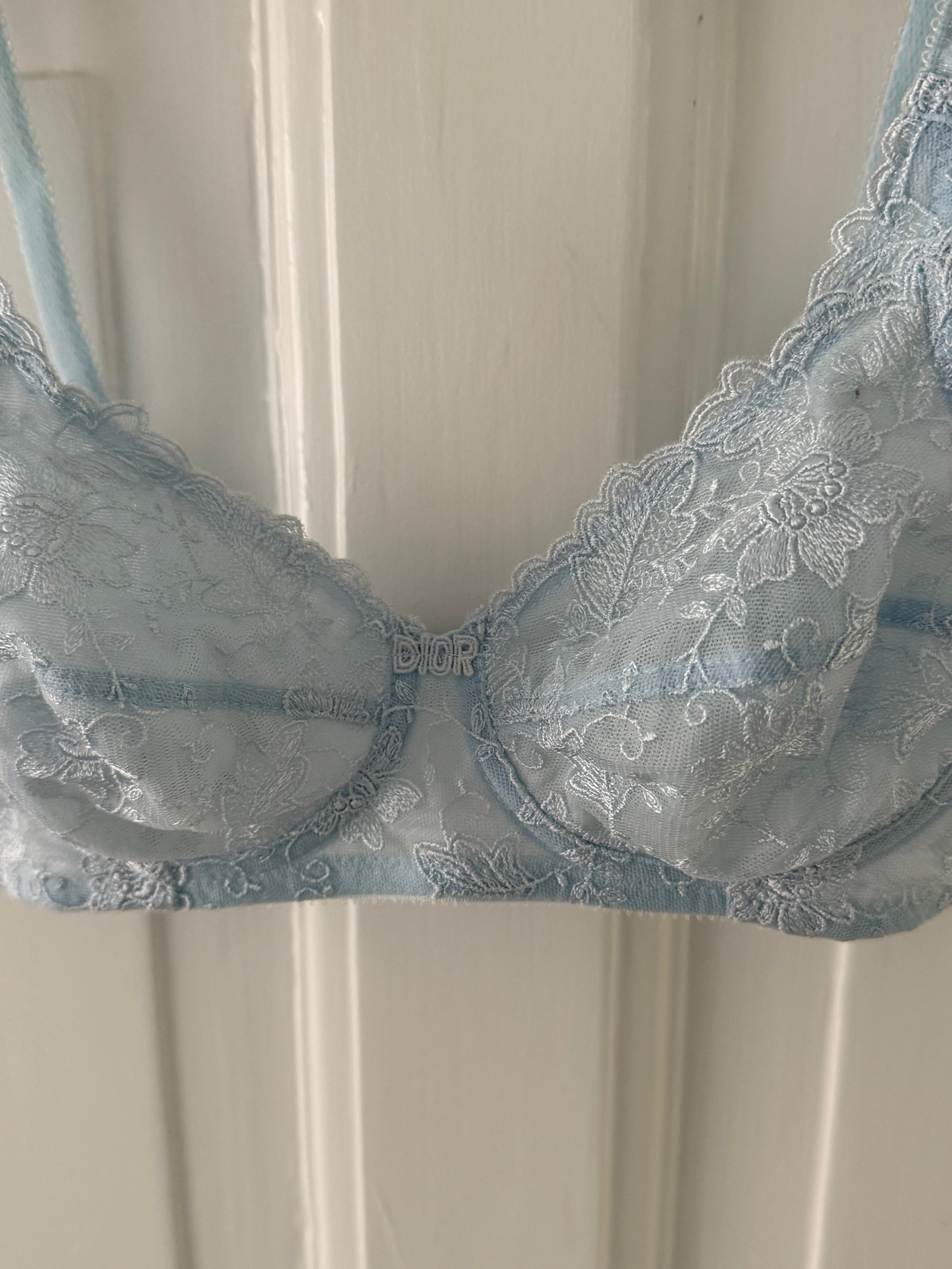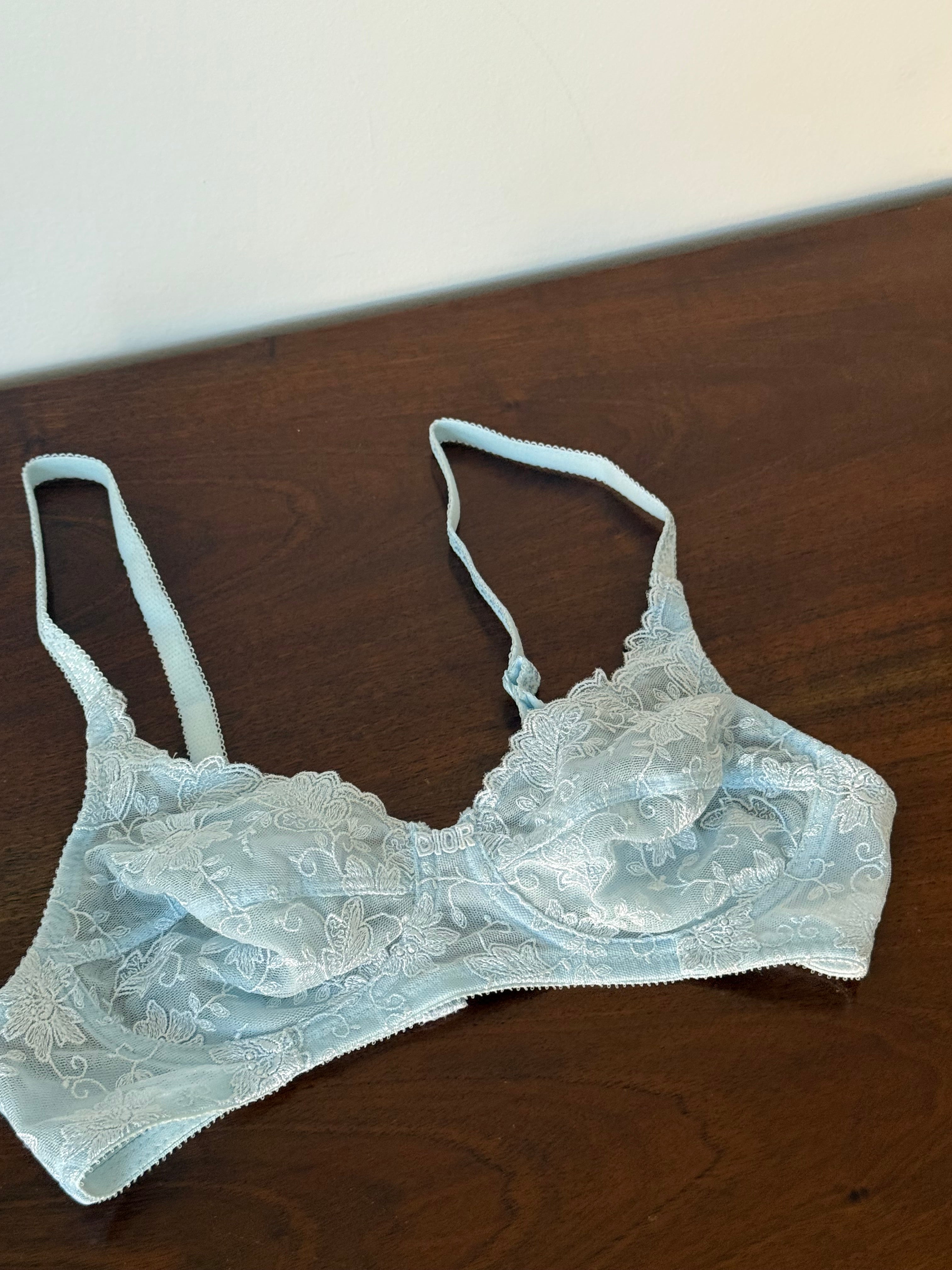 Delicate vintage Christian Dior bra in light blue lace with floral embroidery.