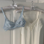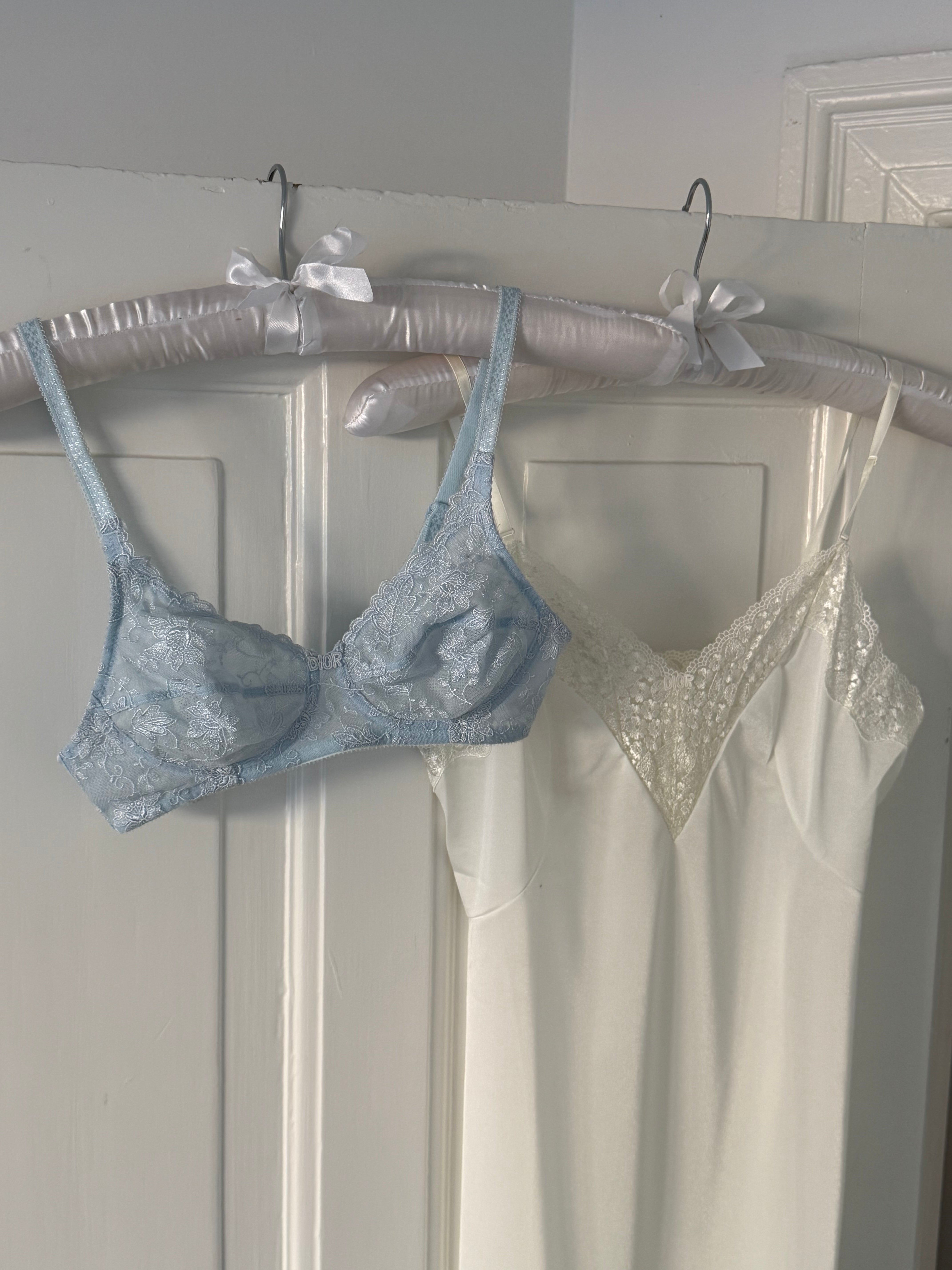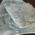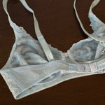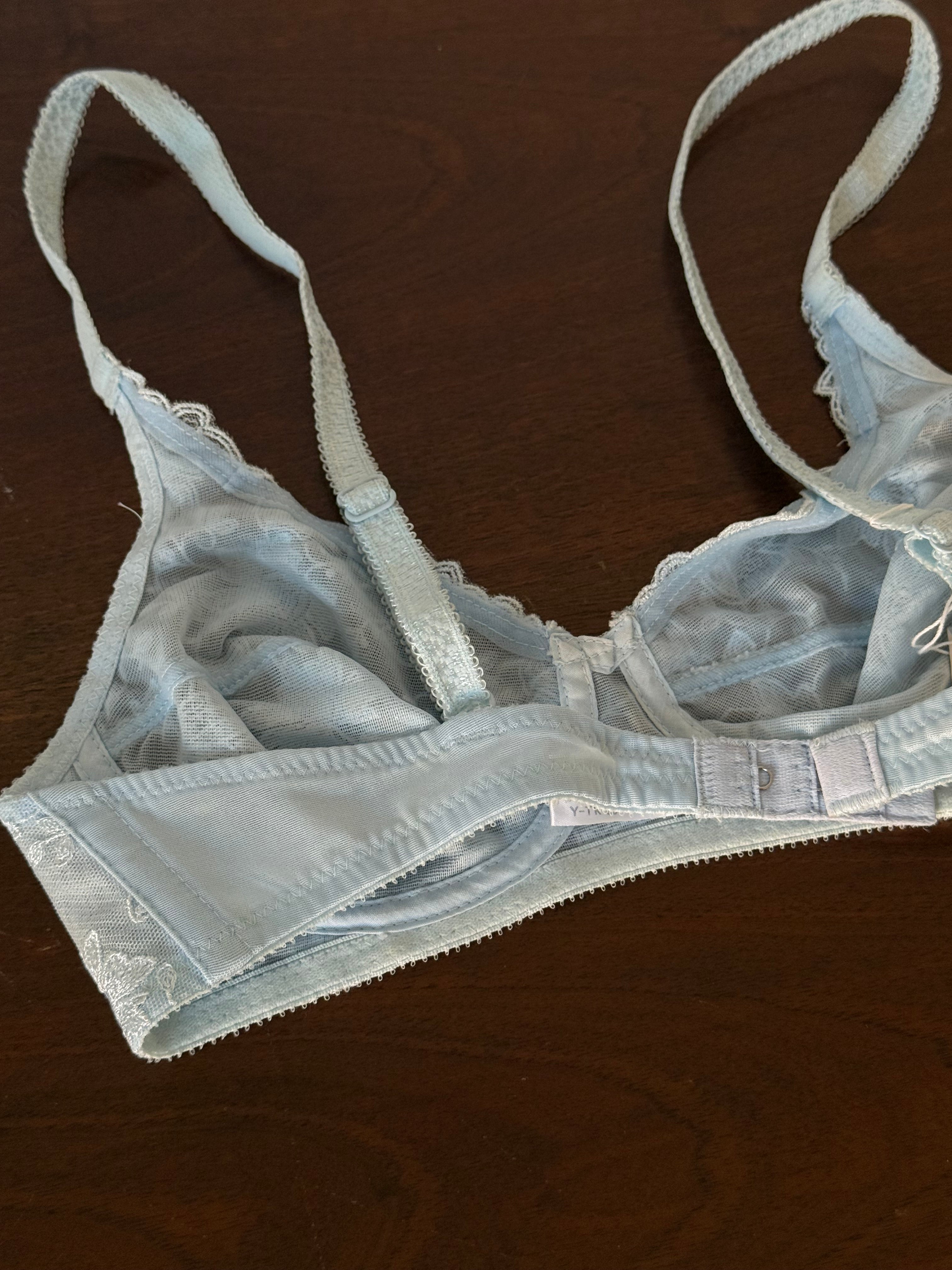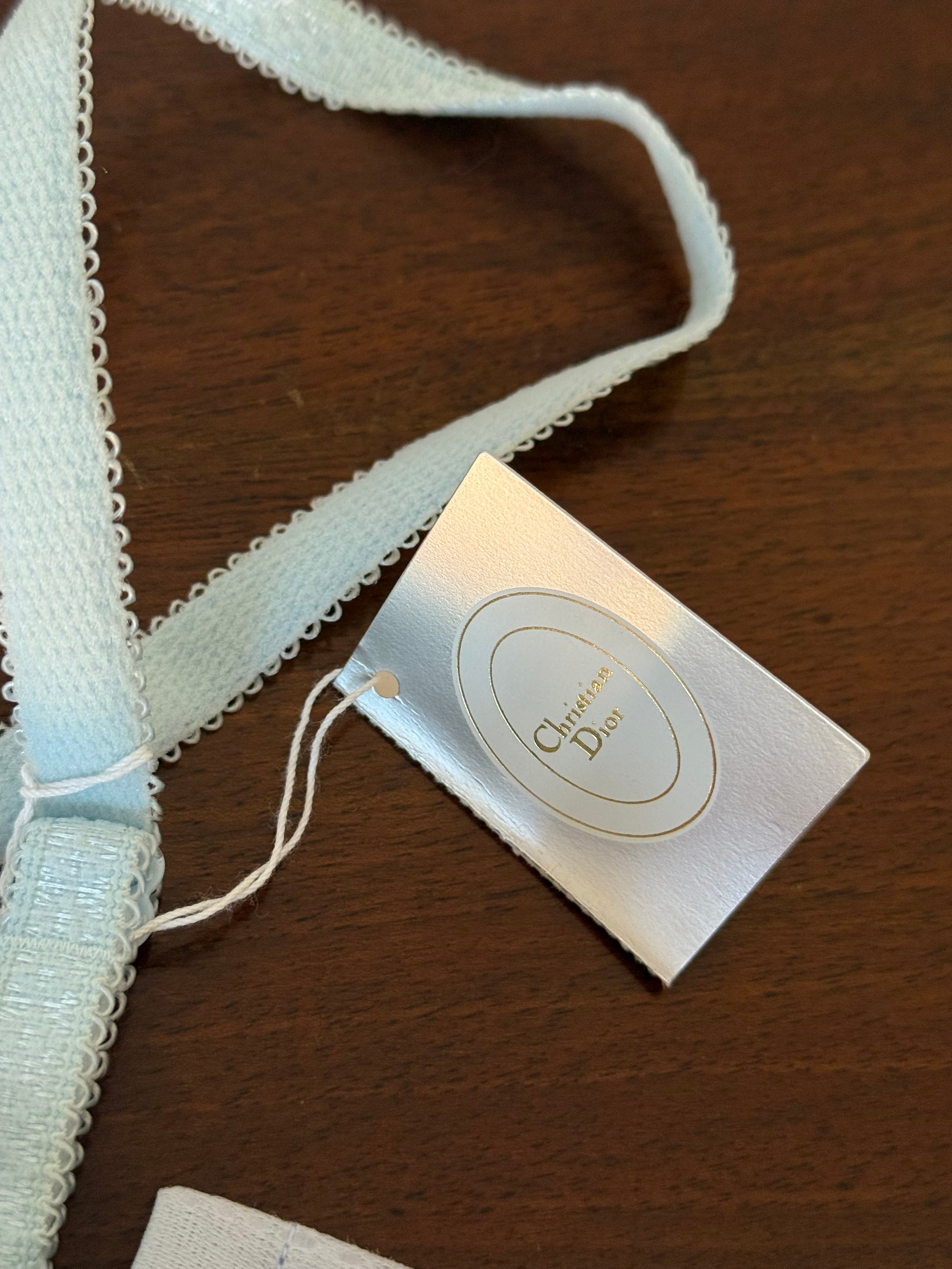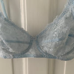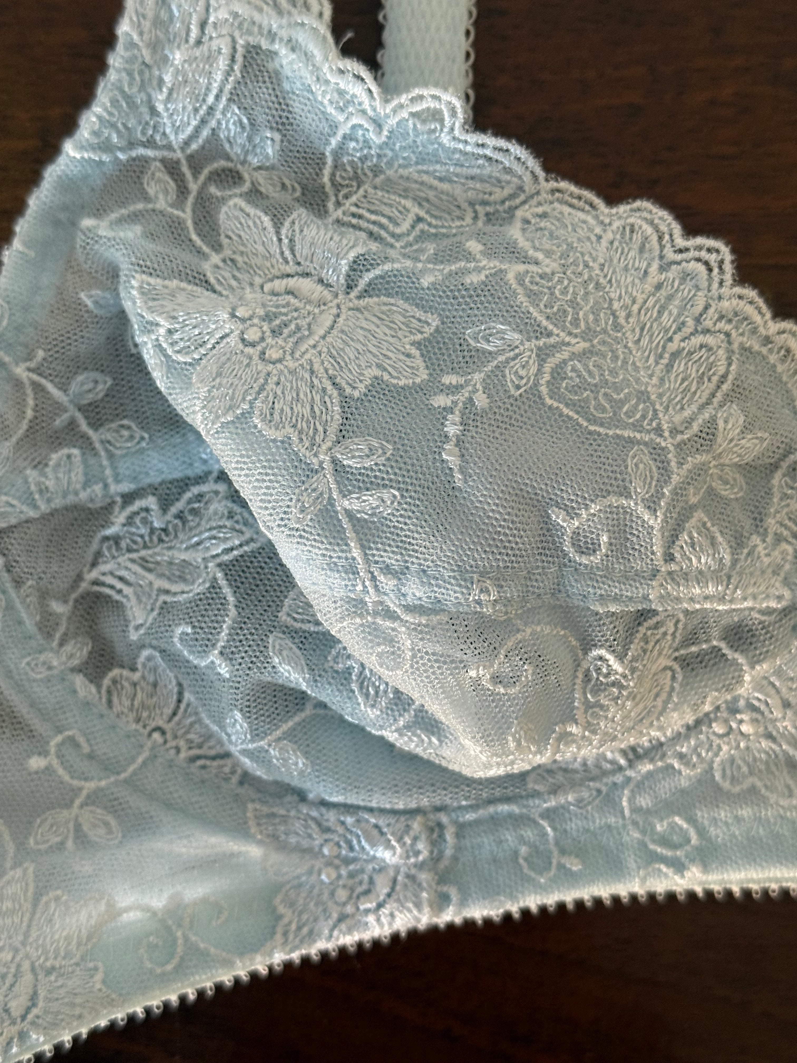 Delicate vintage Christian Dior bra in light blue lace with floral embroidery.
