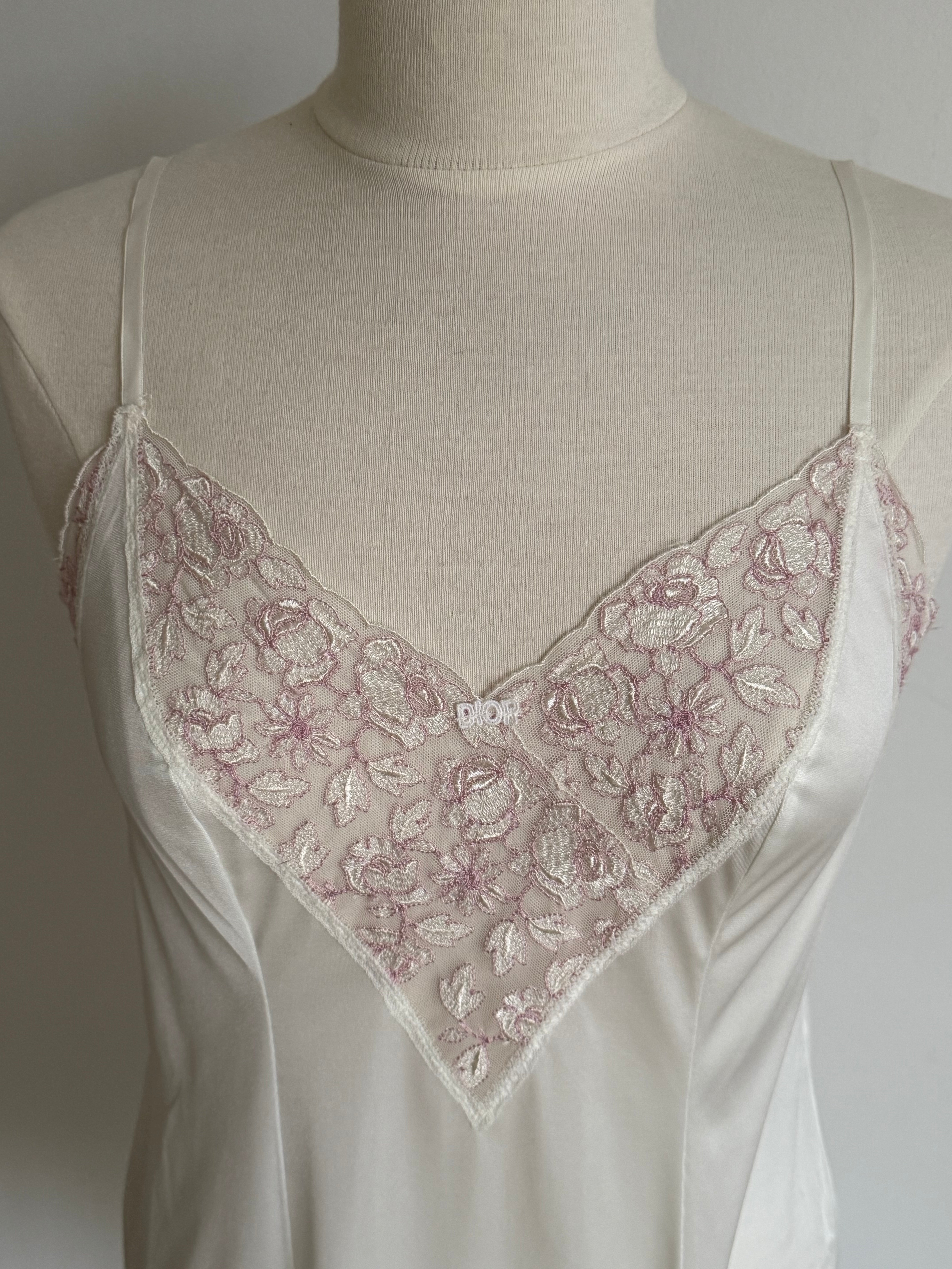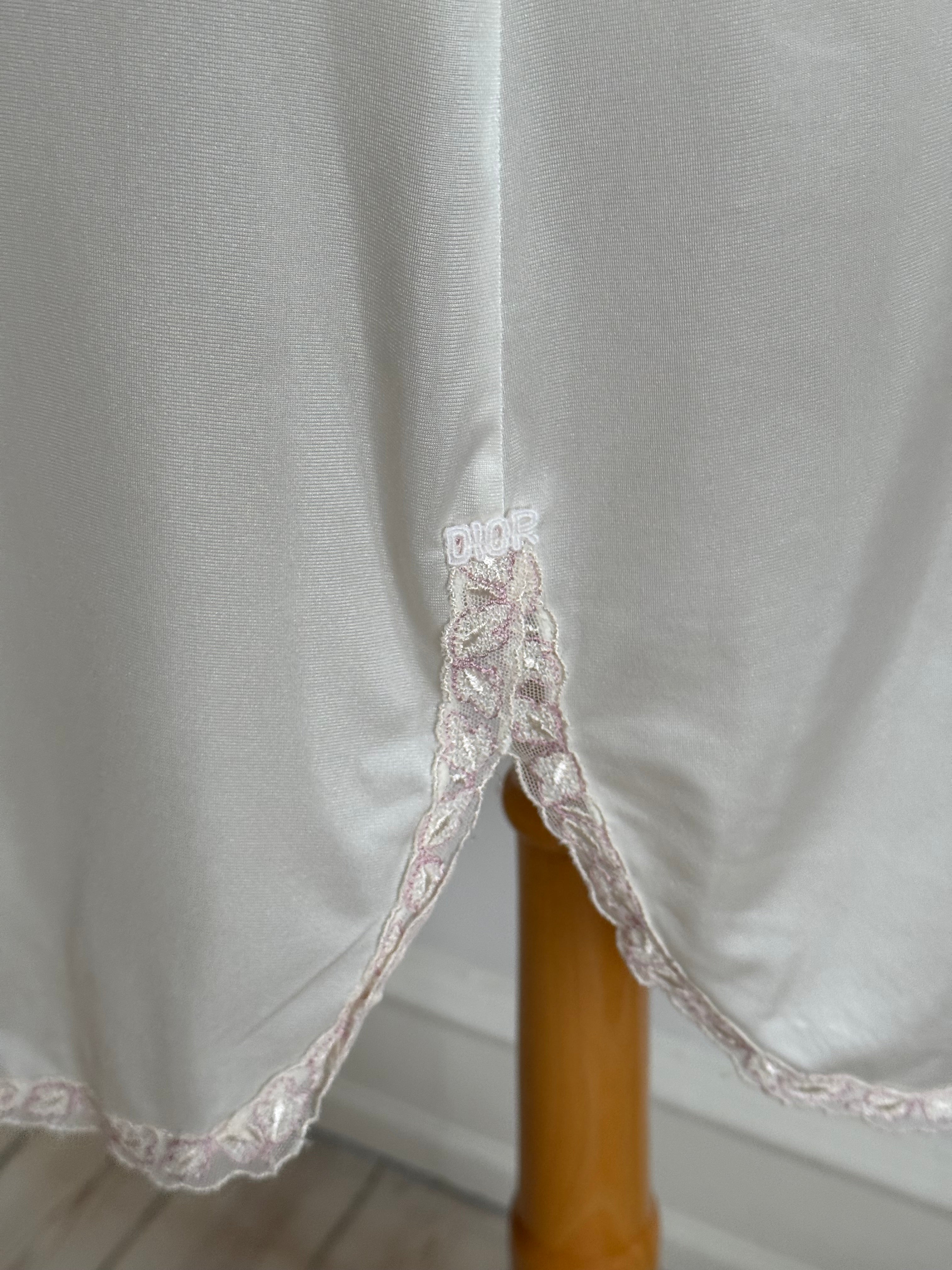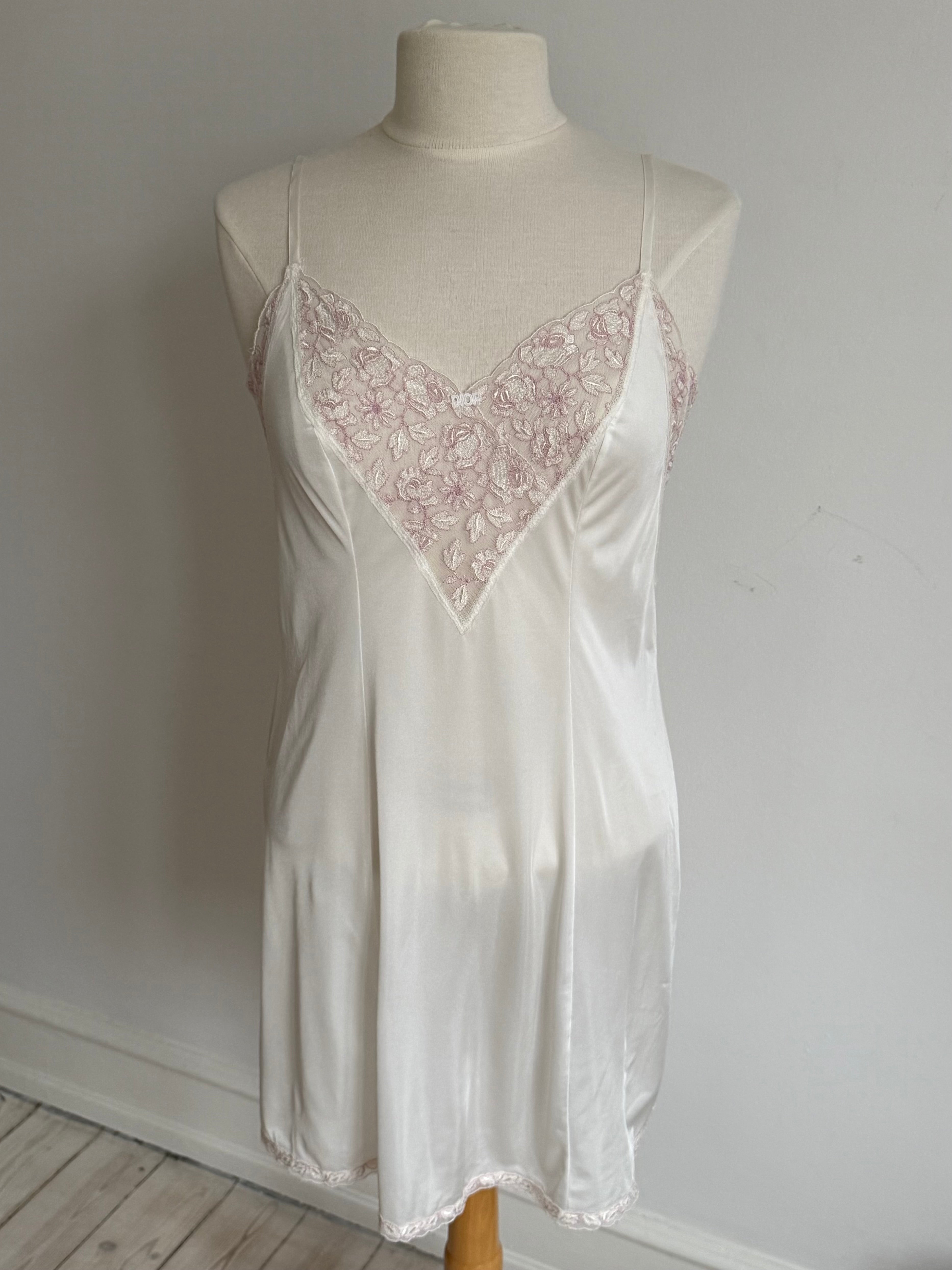 Vintage Christian Dior white lingerie dress with thin adjustable straps and beautiful pink lace detailing.