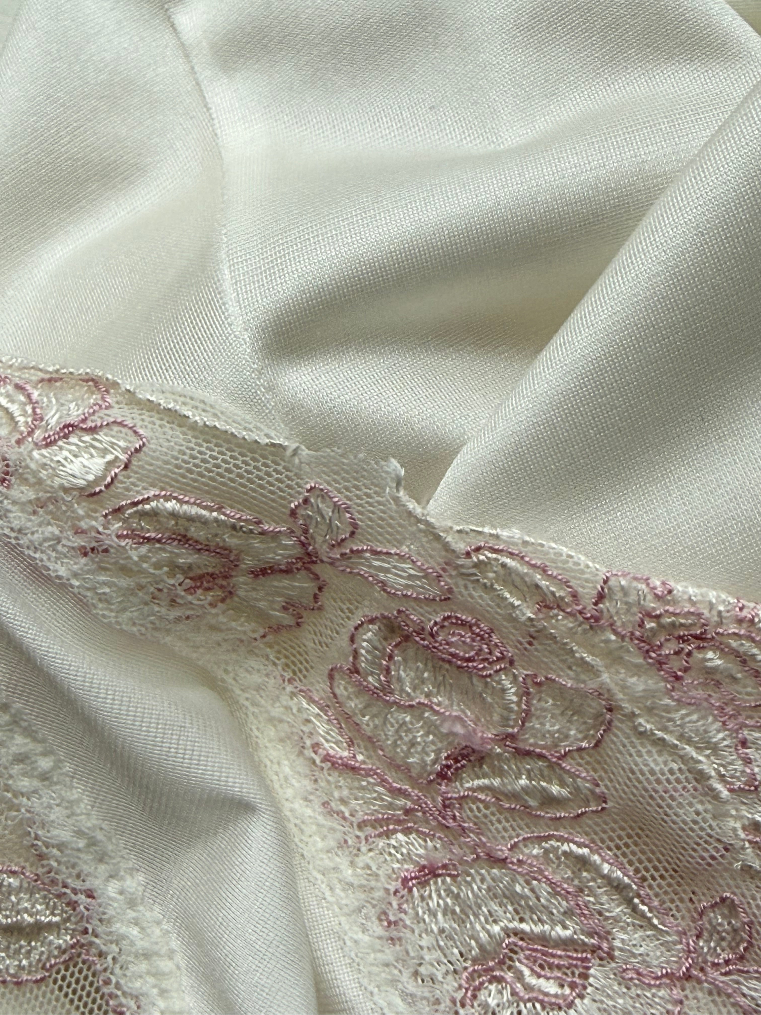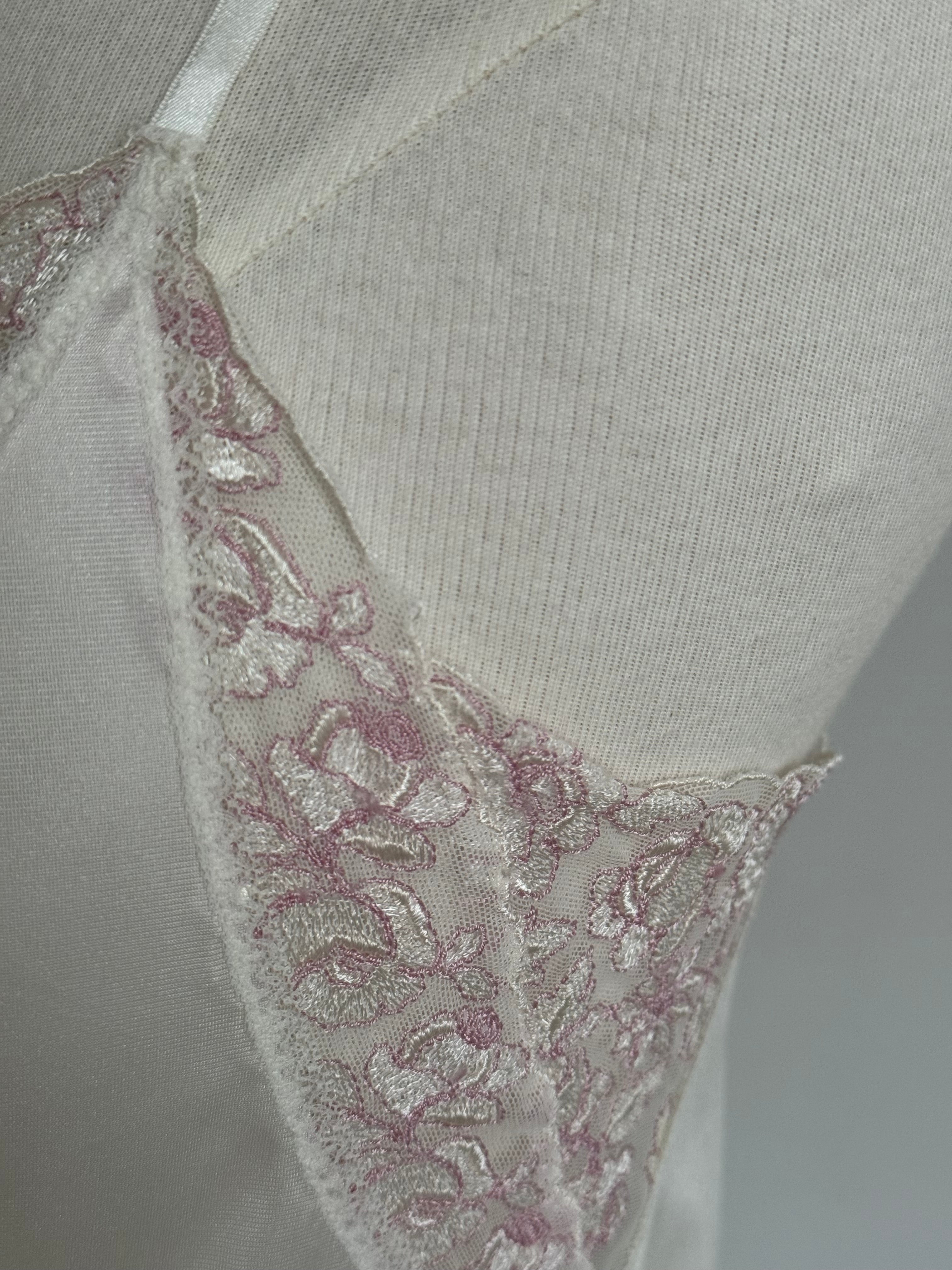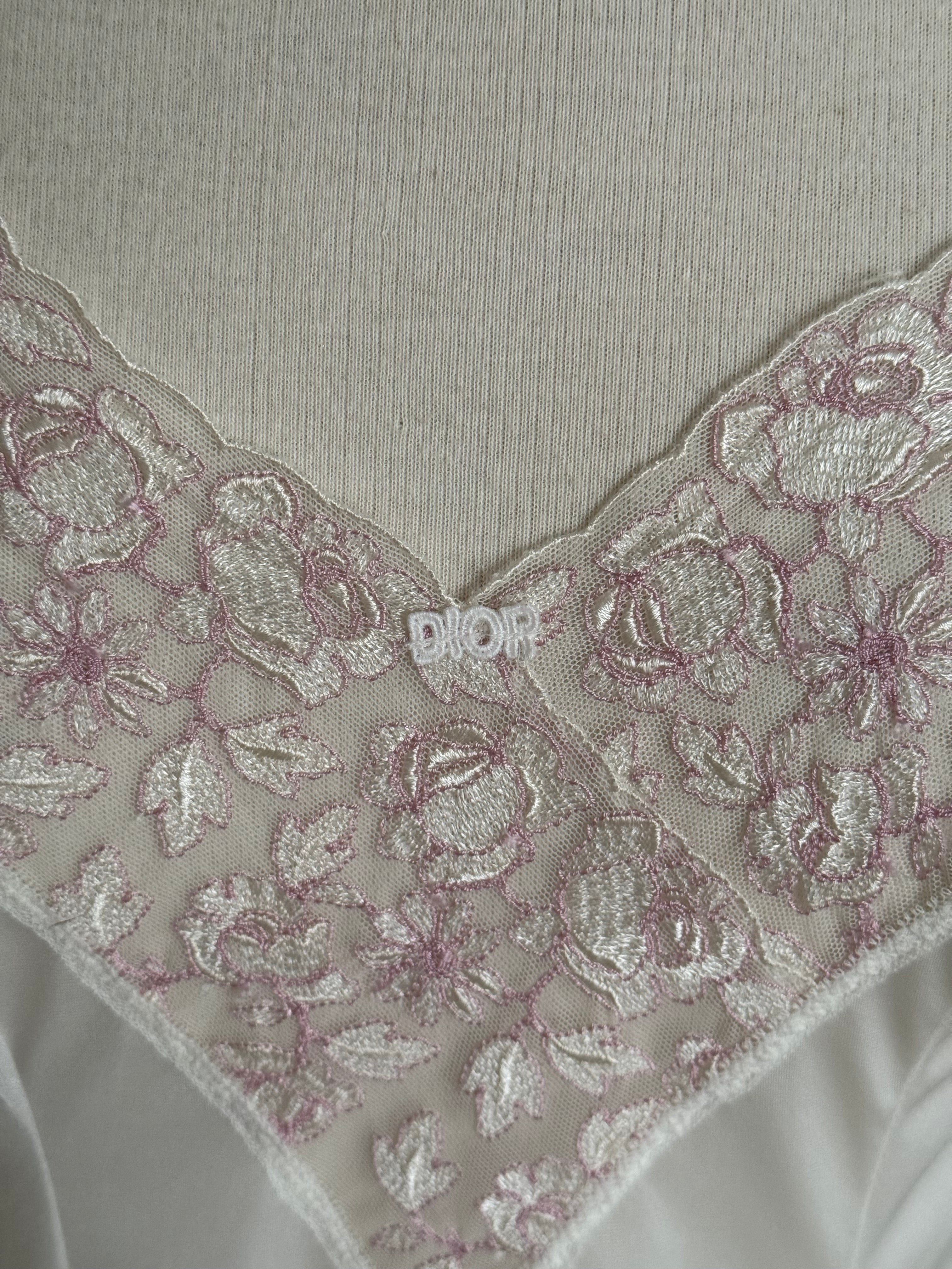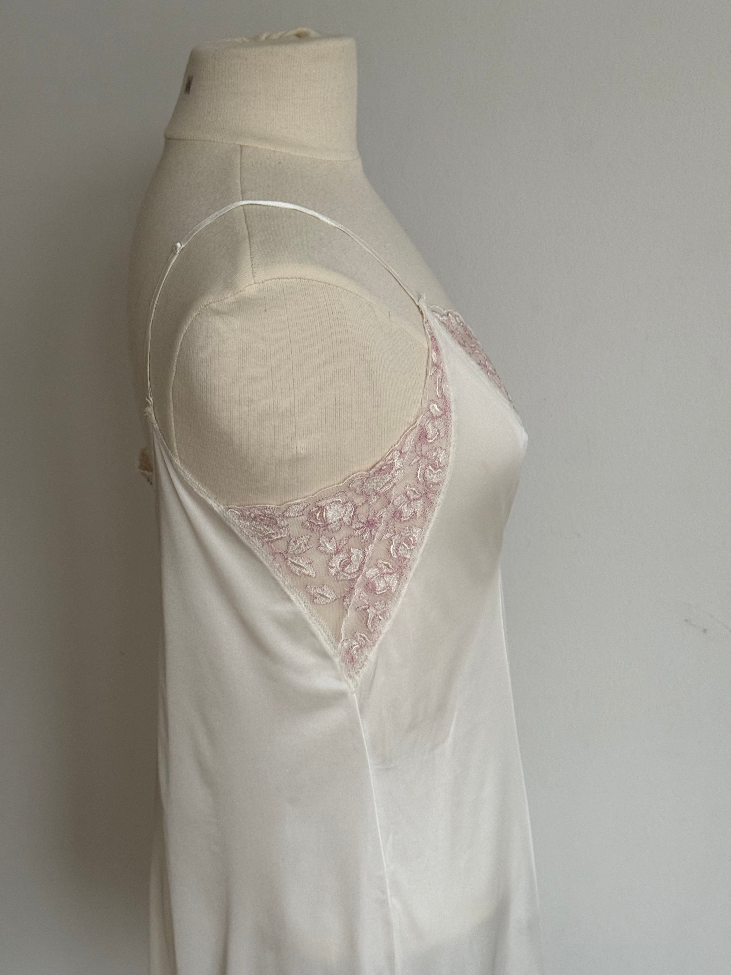 Vintage Christian Dior white lingerie dress with thin adjustable straps and beautiful pink lace detailing.