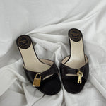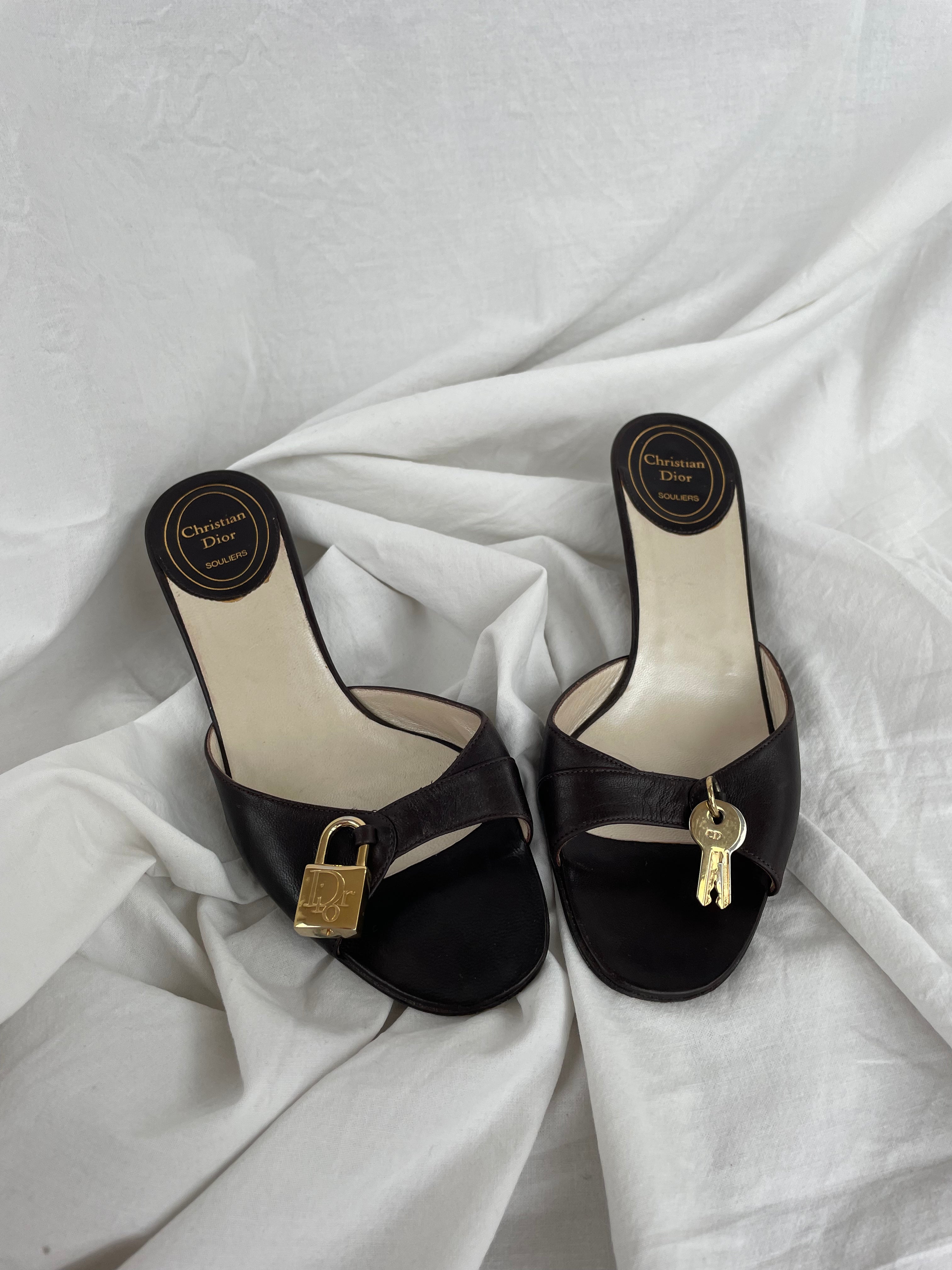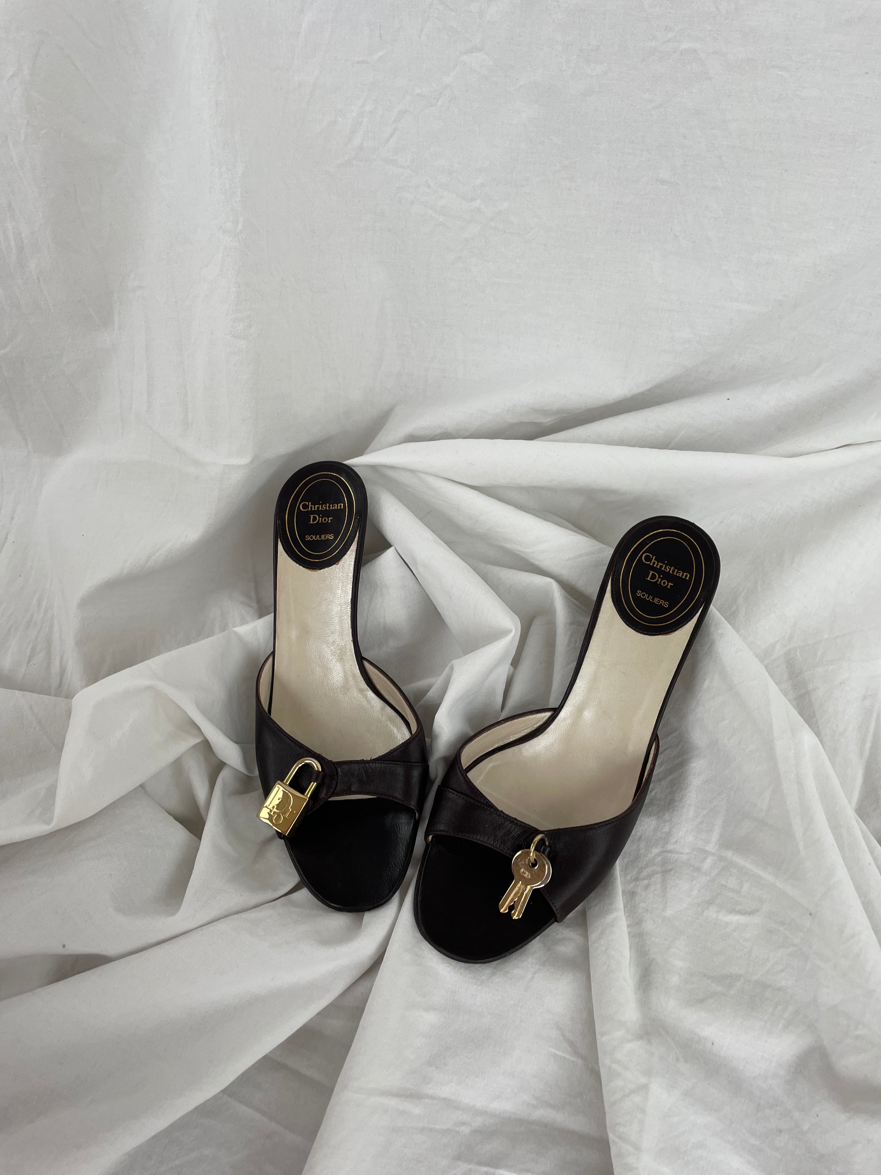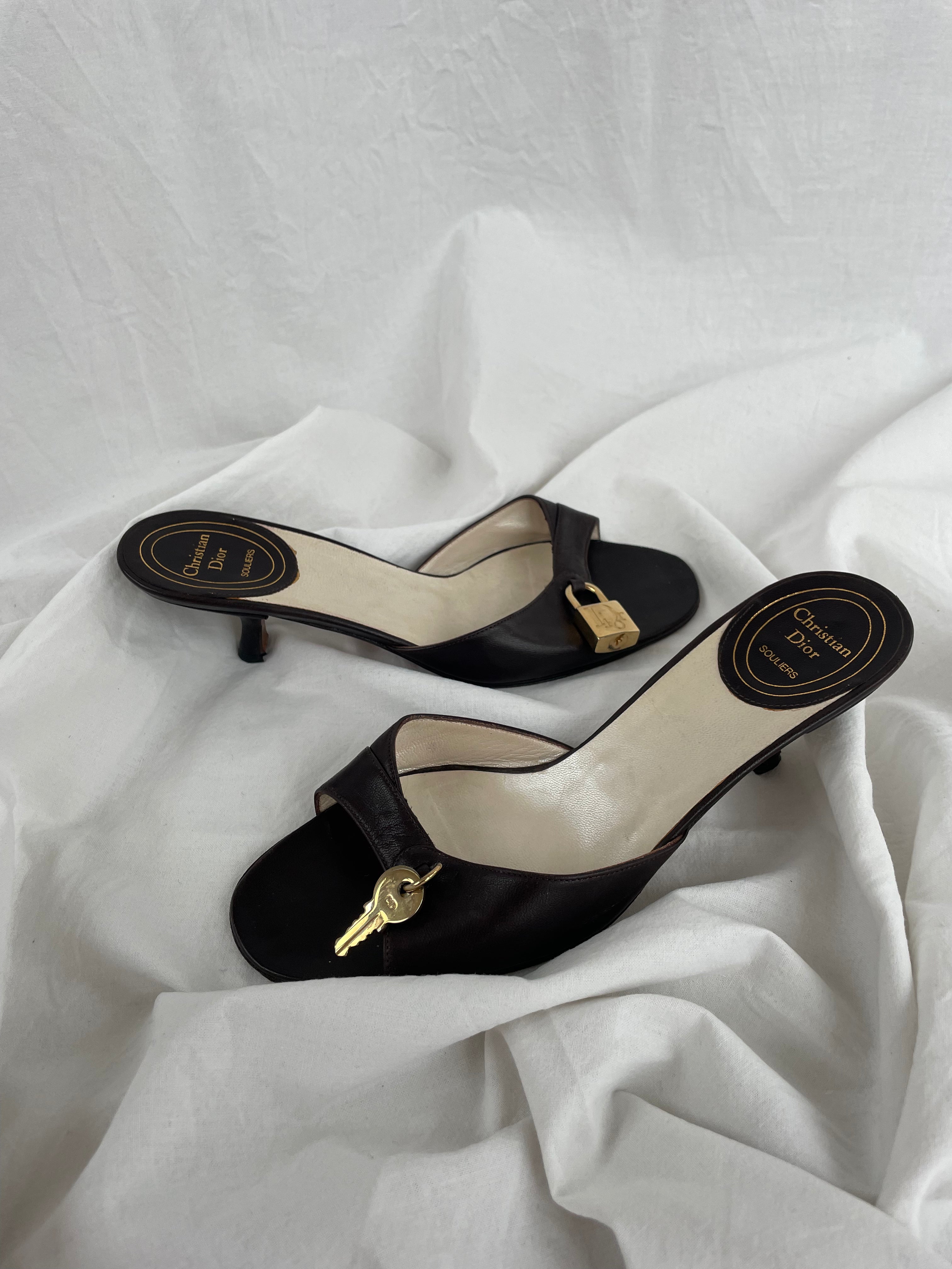 Christian Dior Lock & Key kitten heels in a good condition. These leather open-toe mules feature a cute lock and key charm.