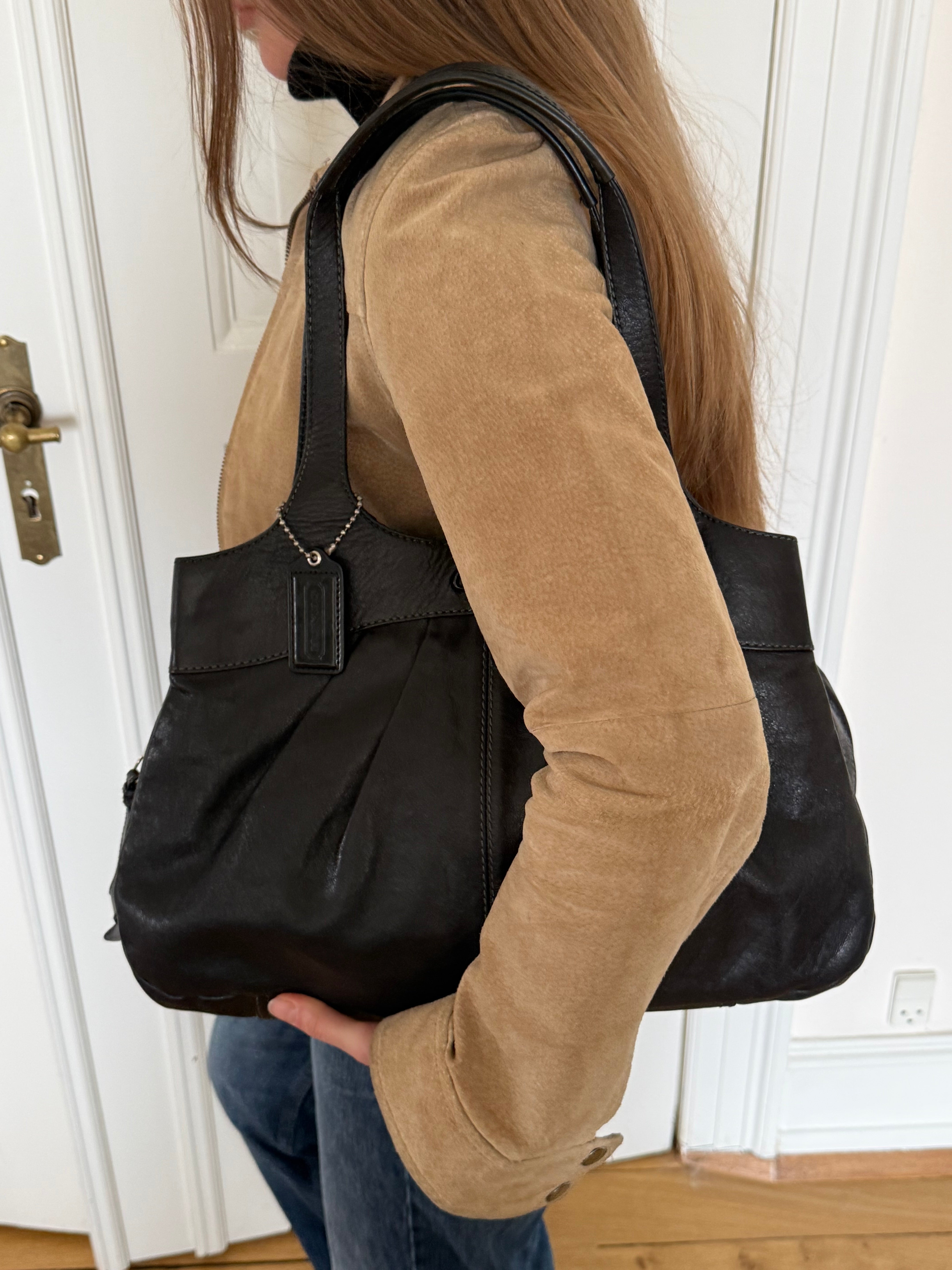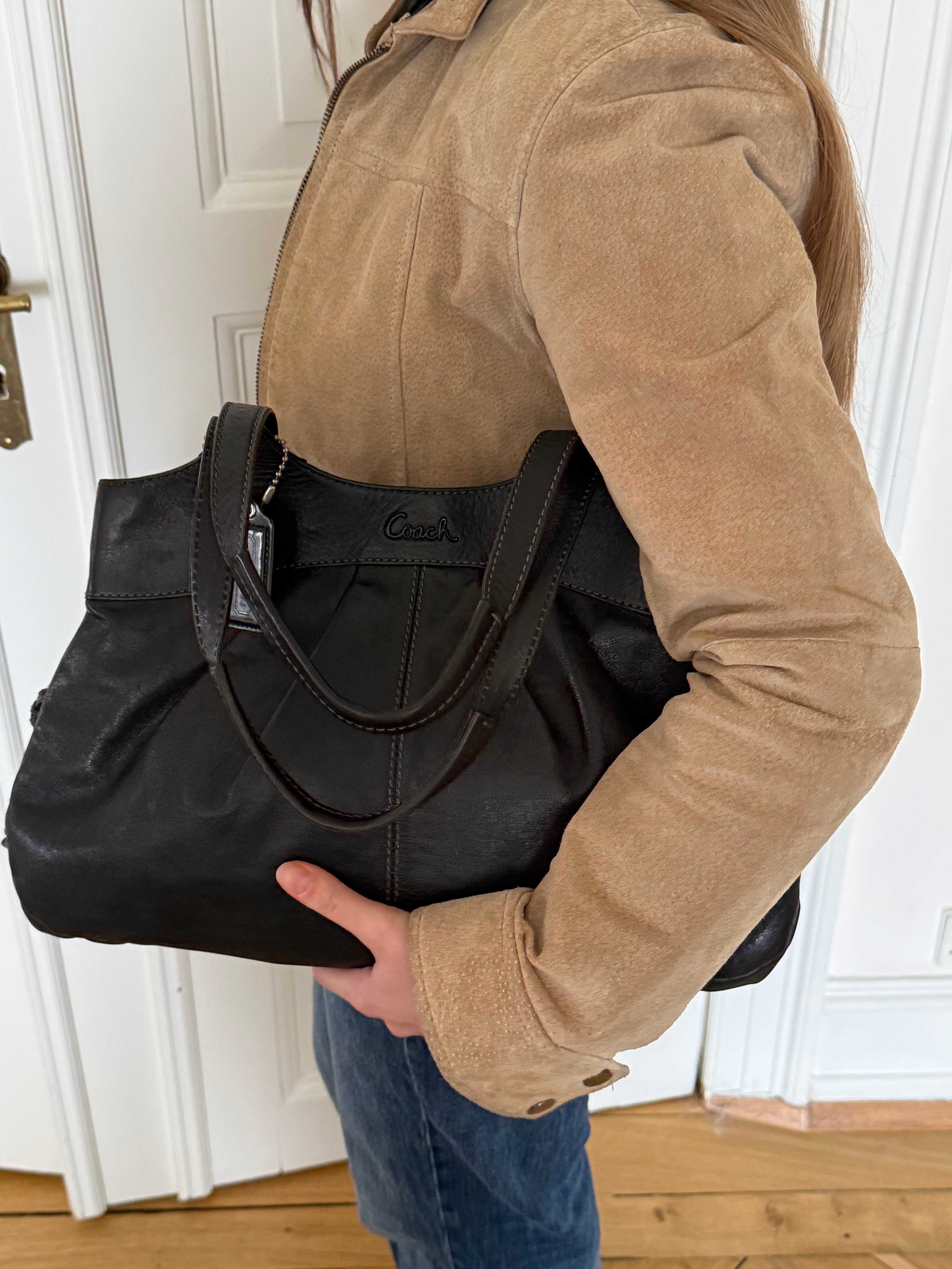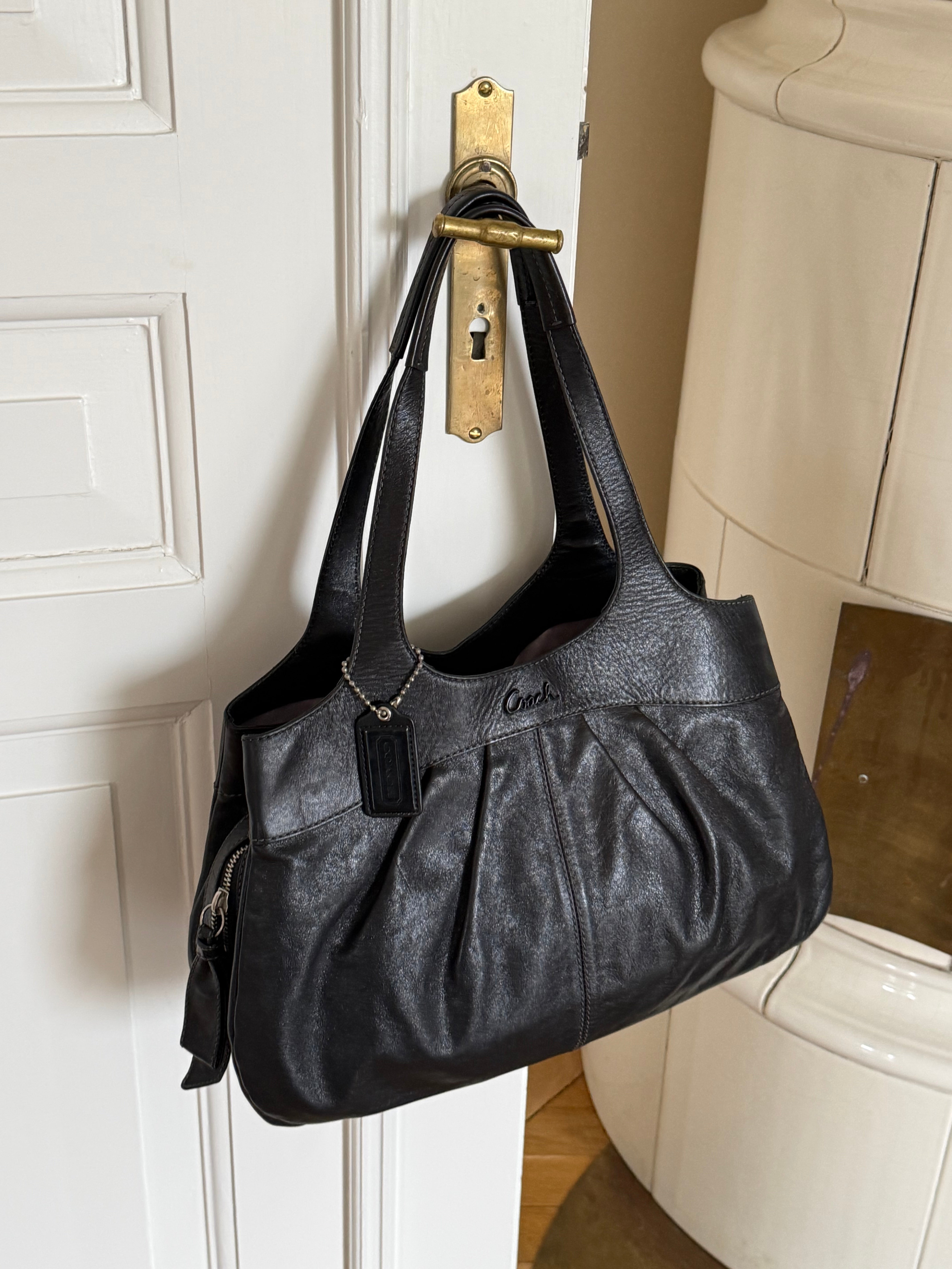 Vintage Coach shoulder bag in black leather with double top handles. Spacious design with three compartments, including a zip middle compartment.