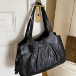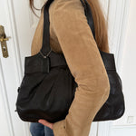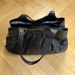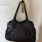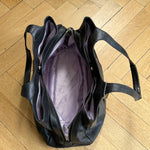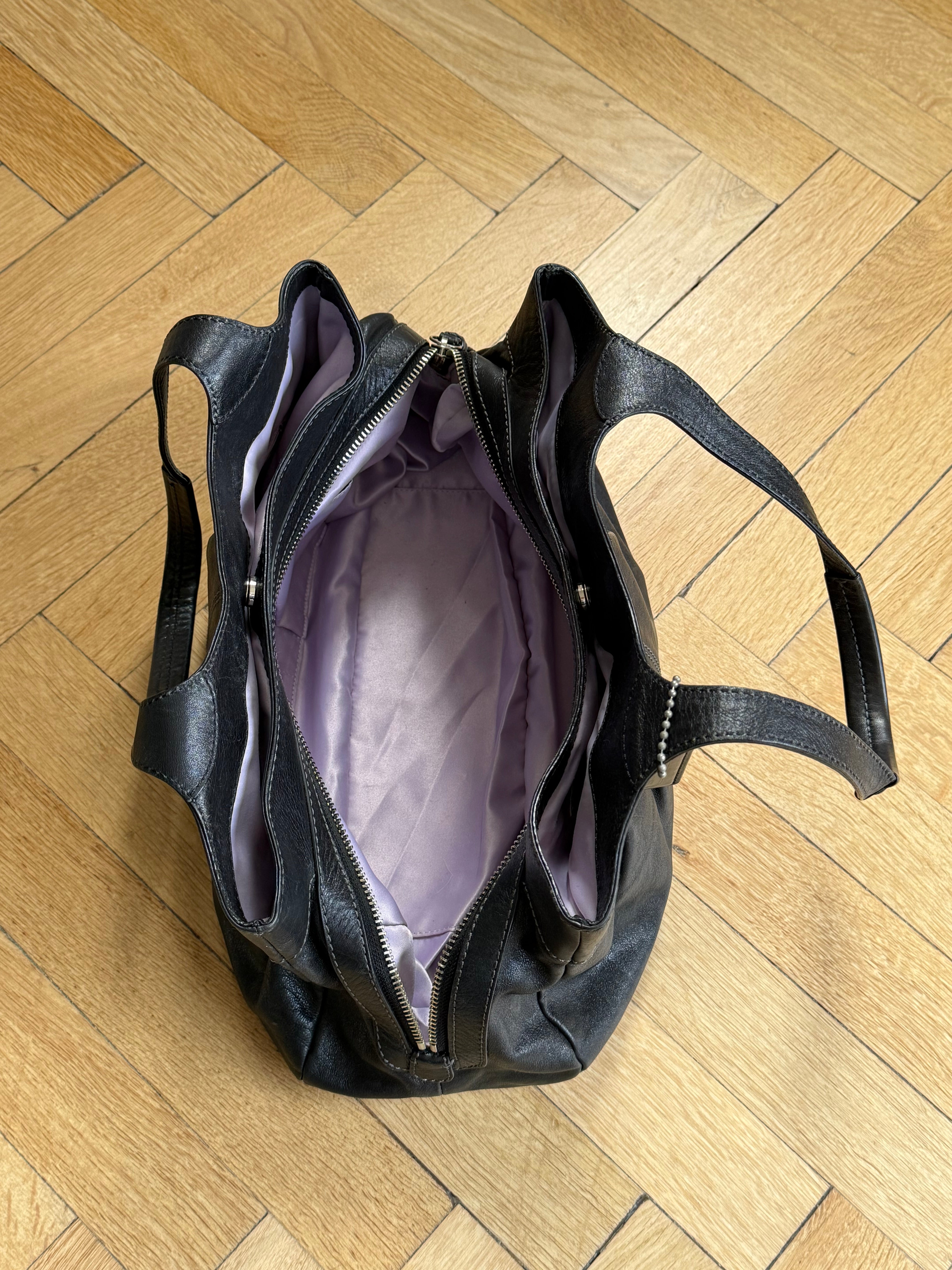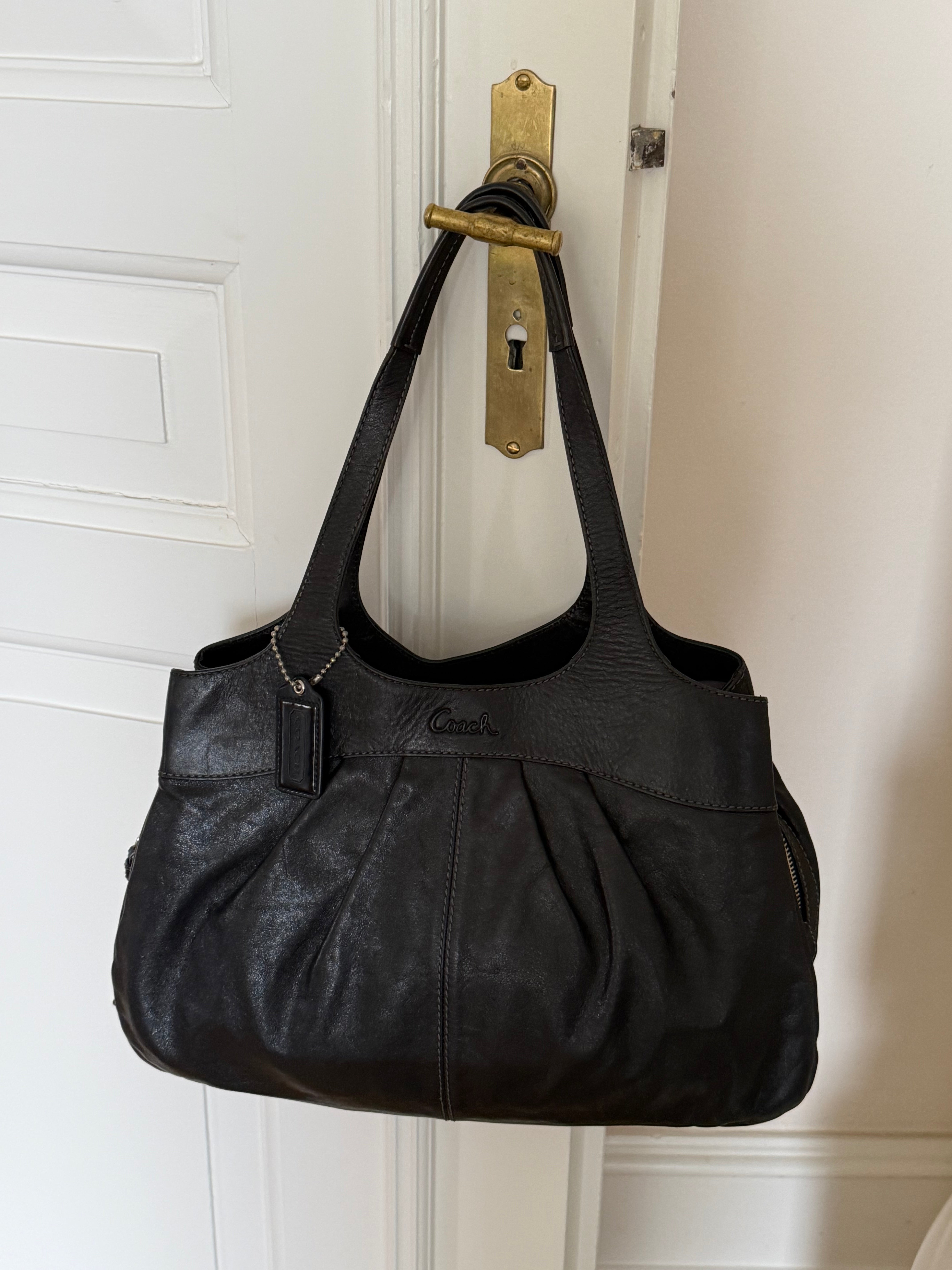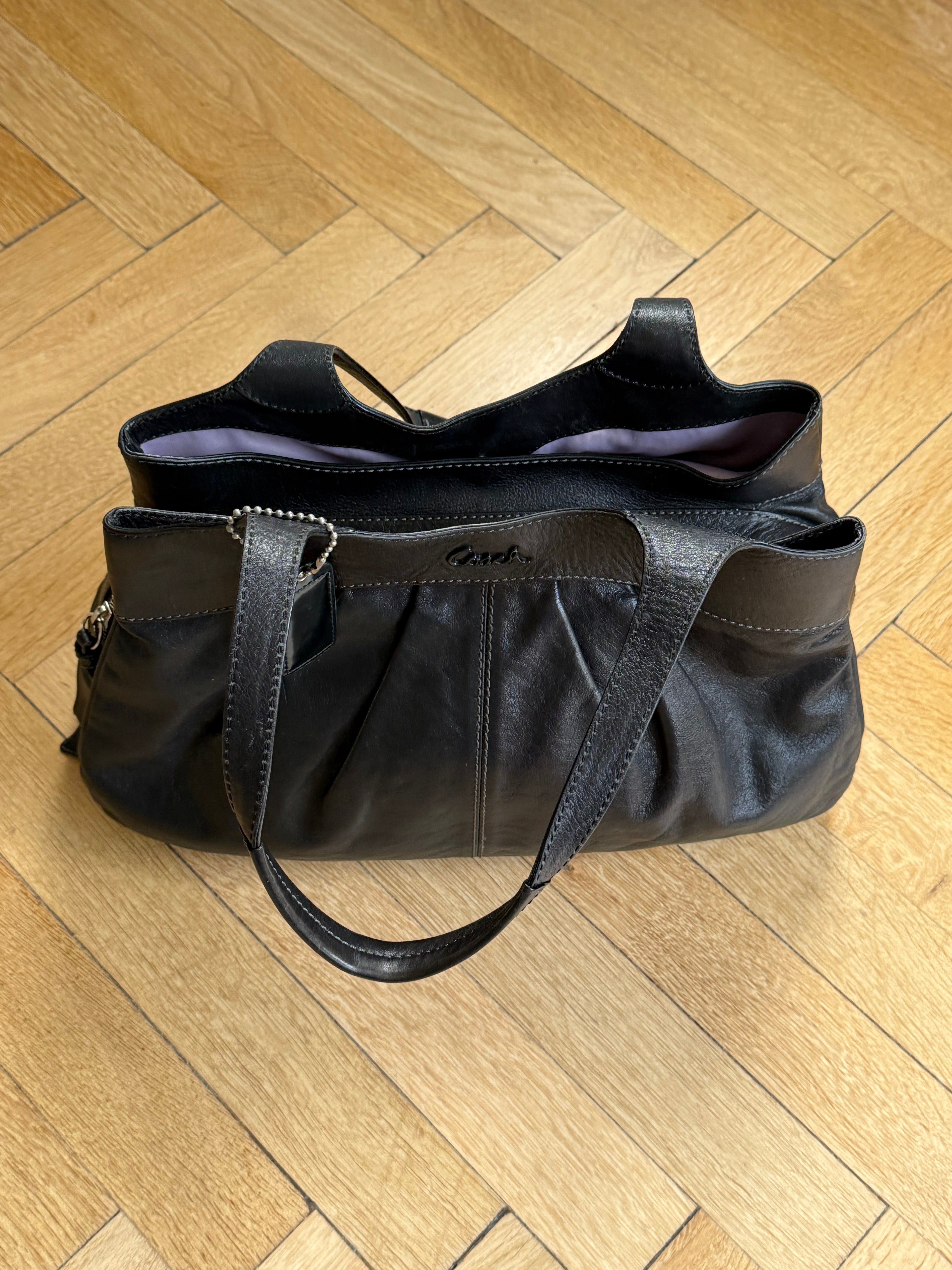 Vintage Coach shoulder bag in black leather with double top handles. Spacious design with three compartments, including a zip middle compartment.