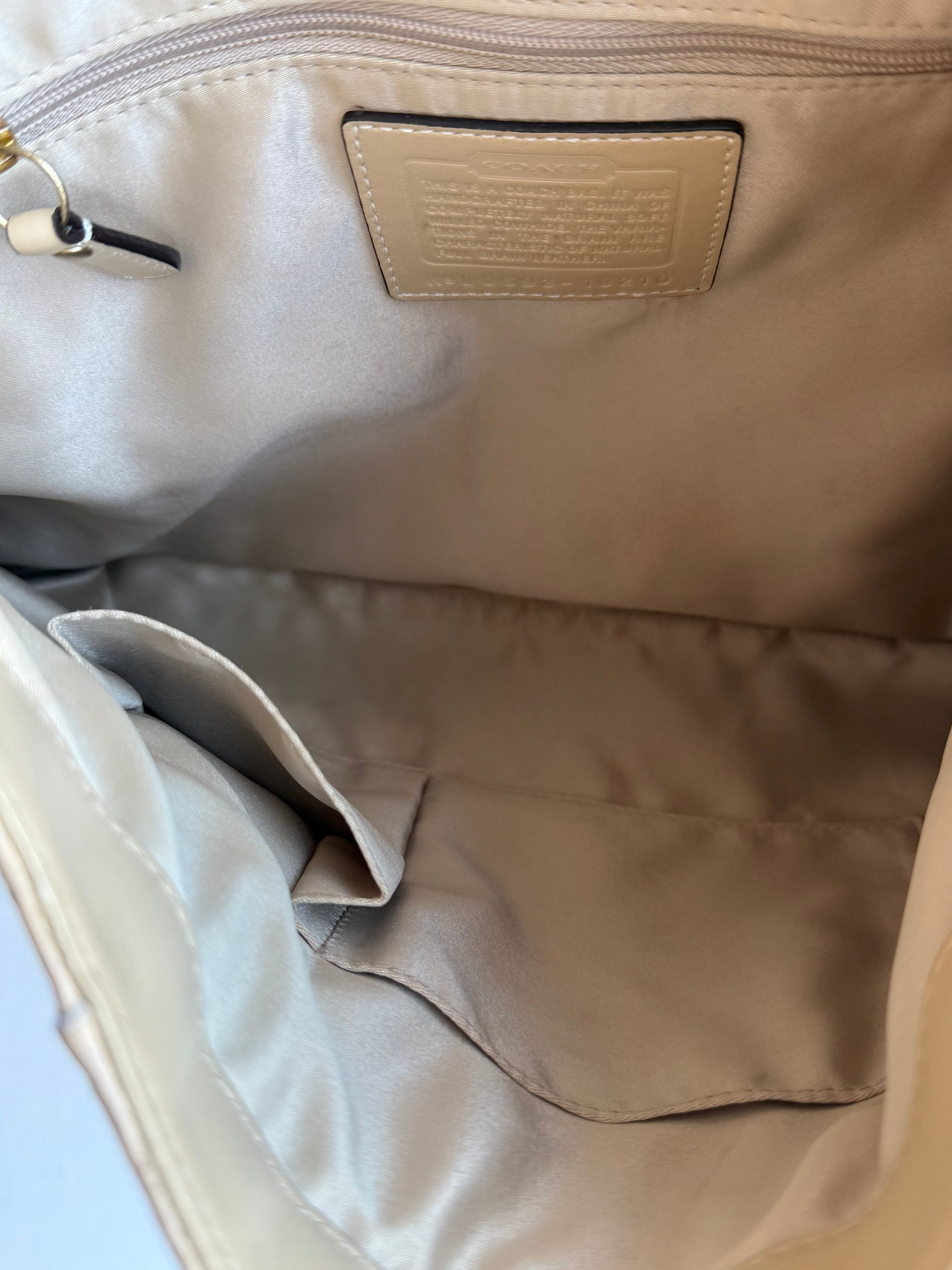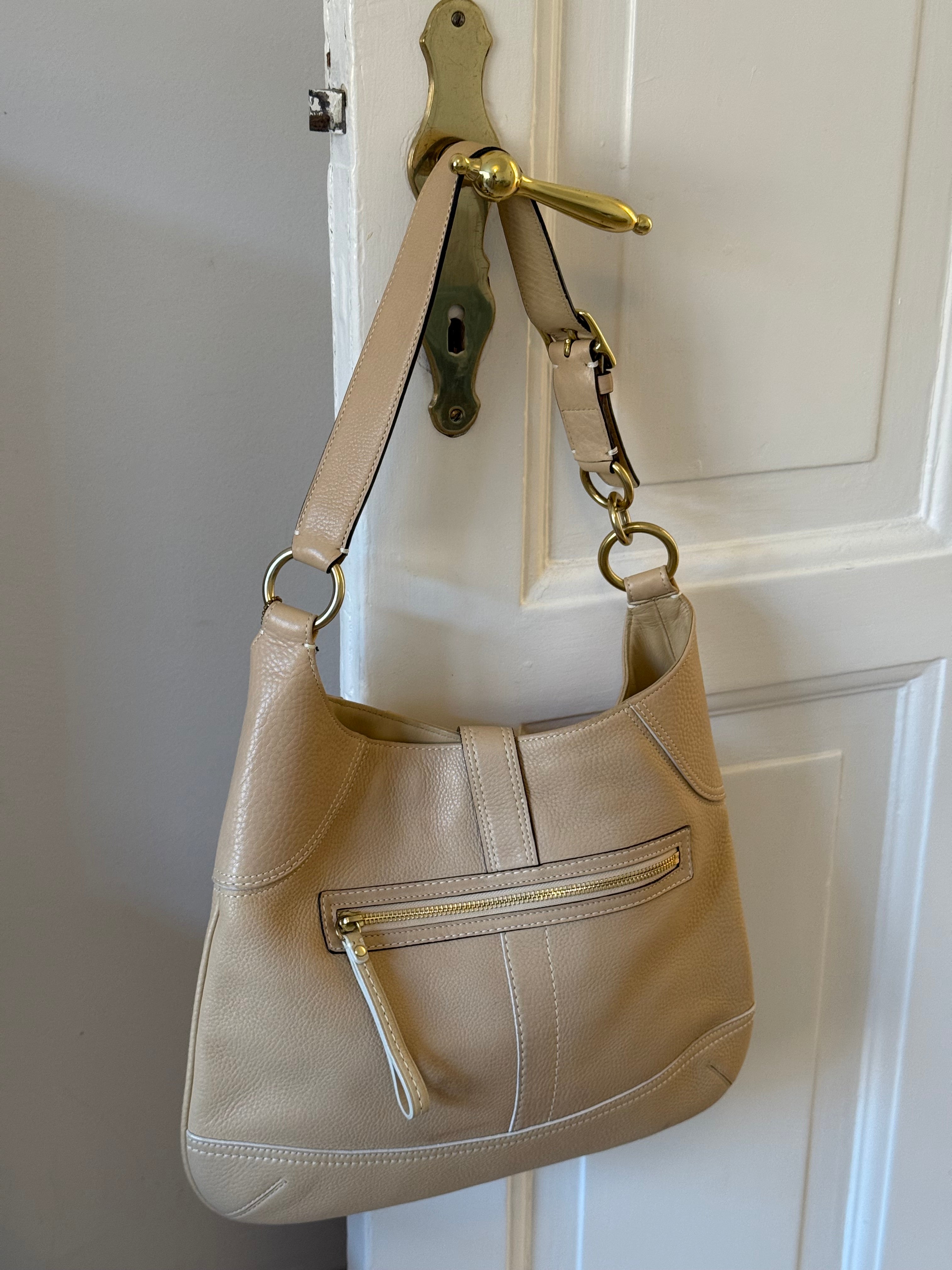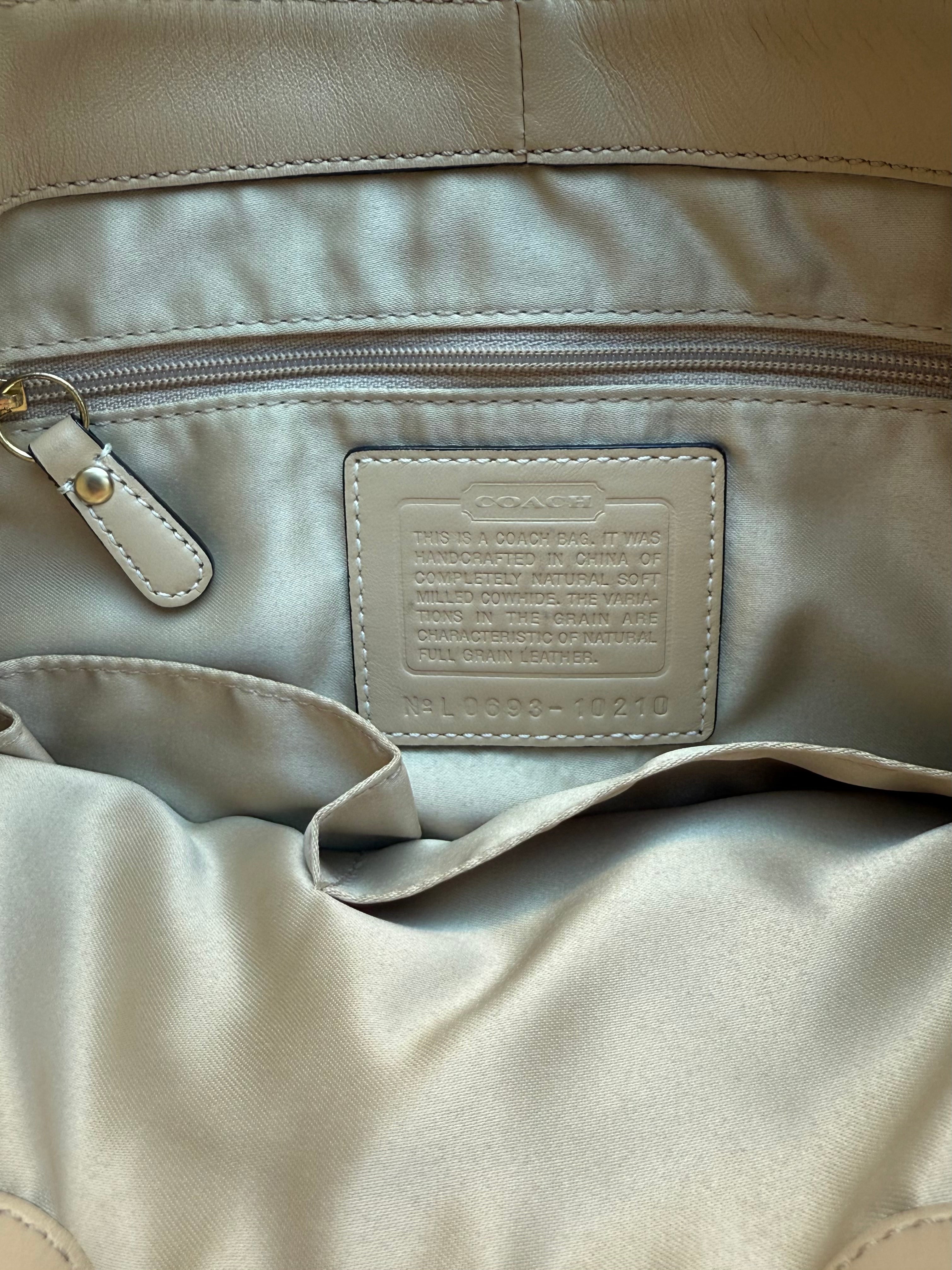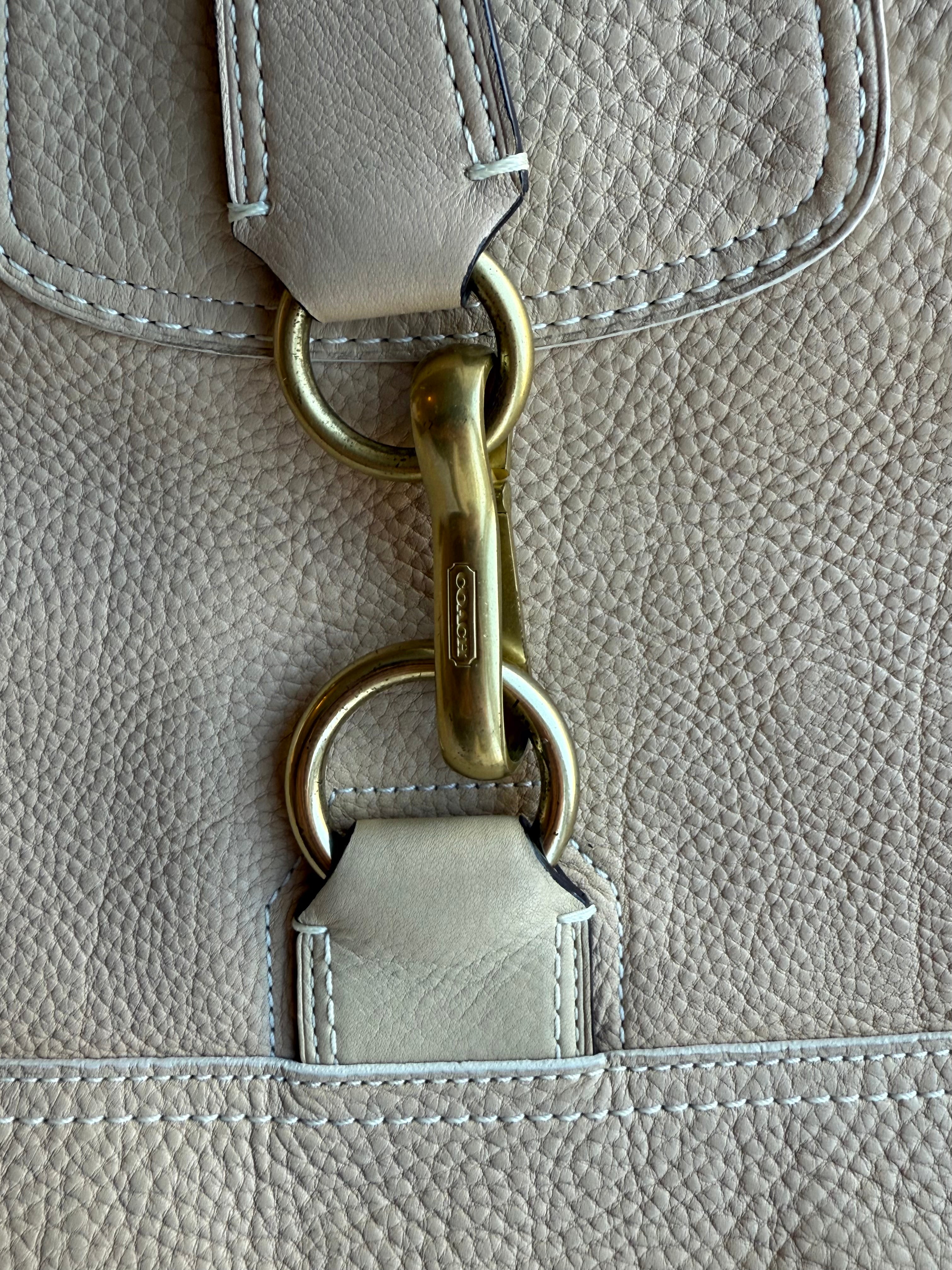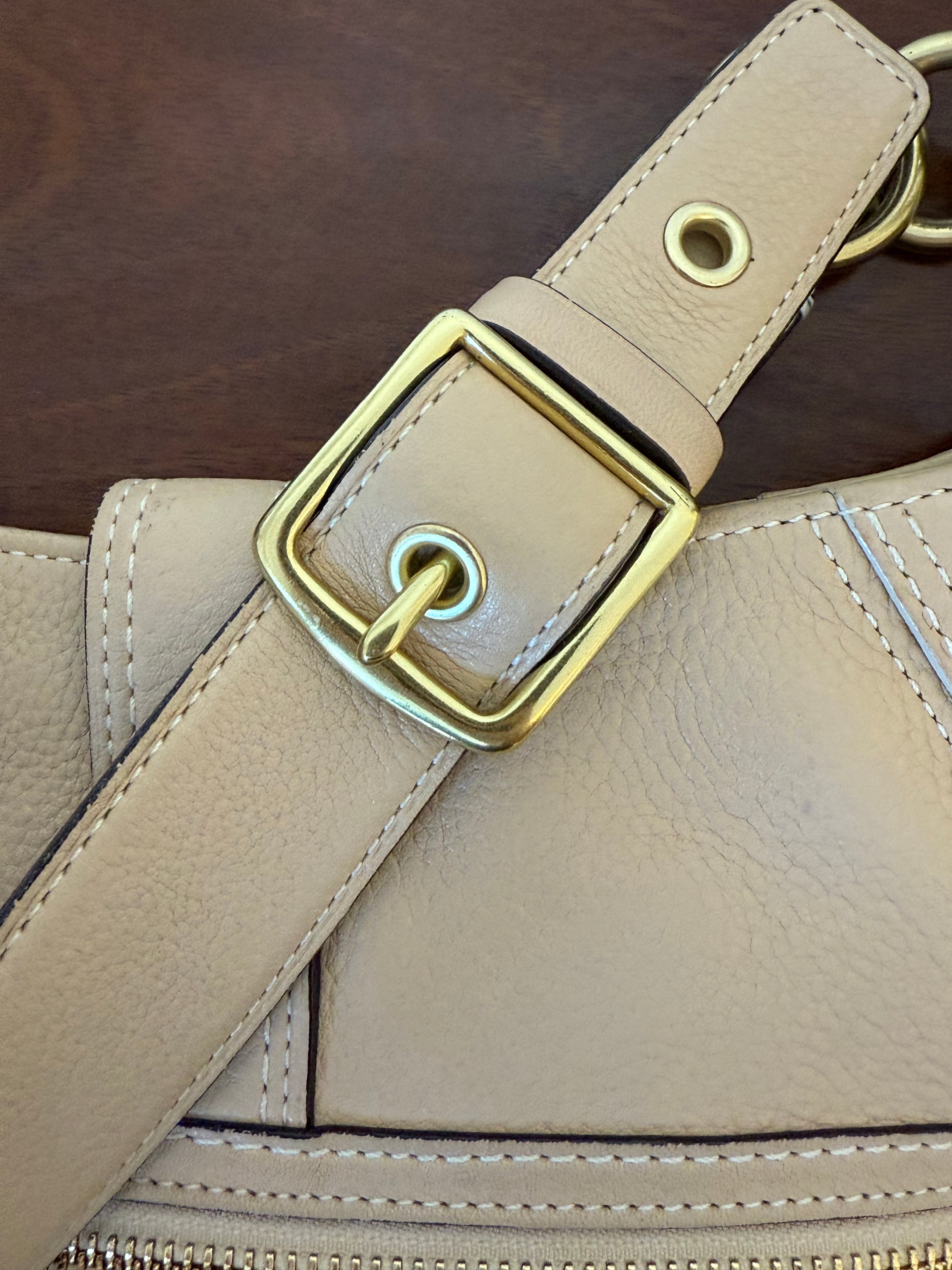 Coach Soho bag in beige leather with gold-colored hardware and beautiful beige interior.