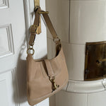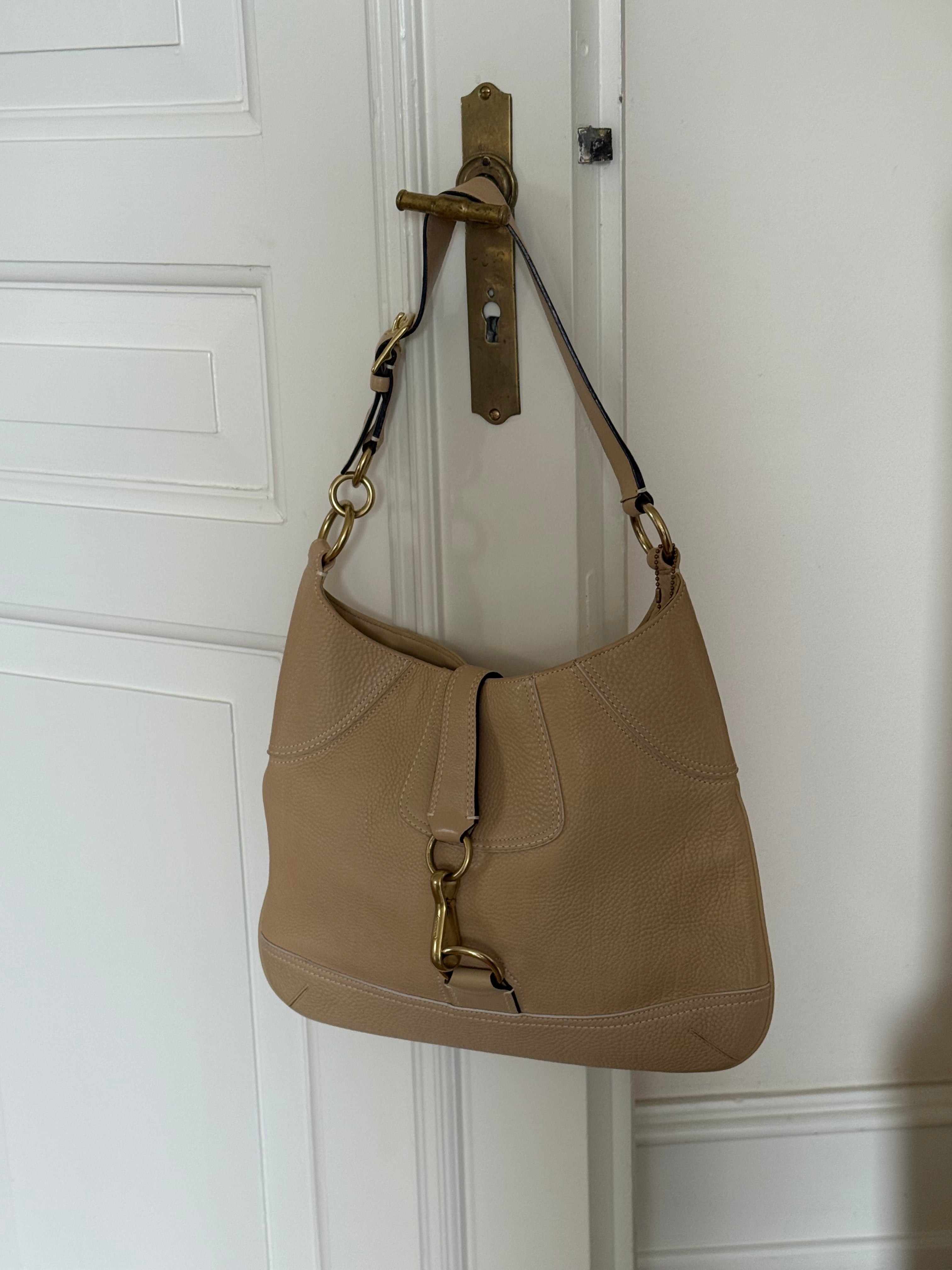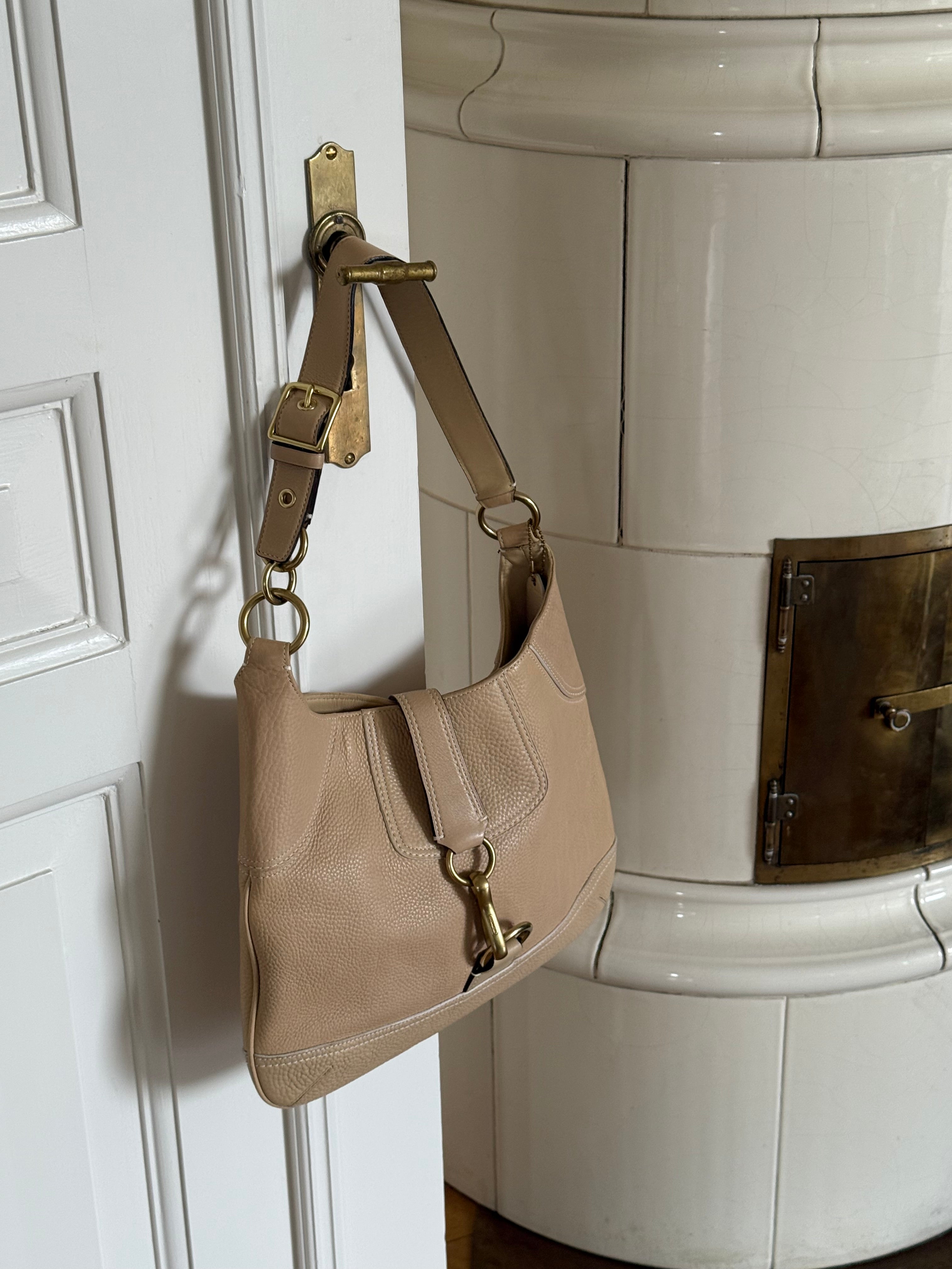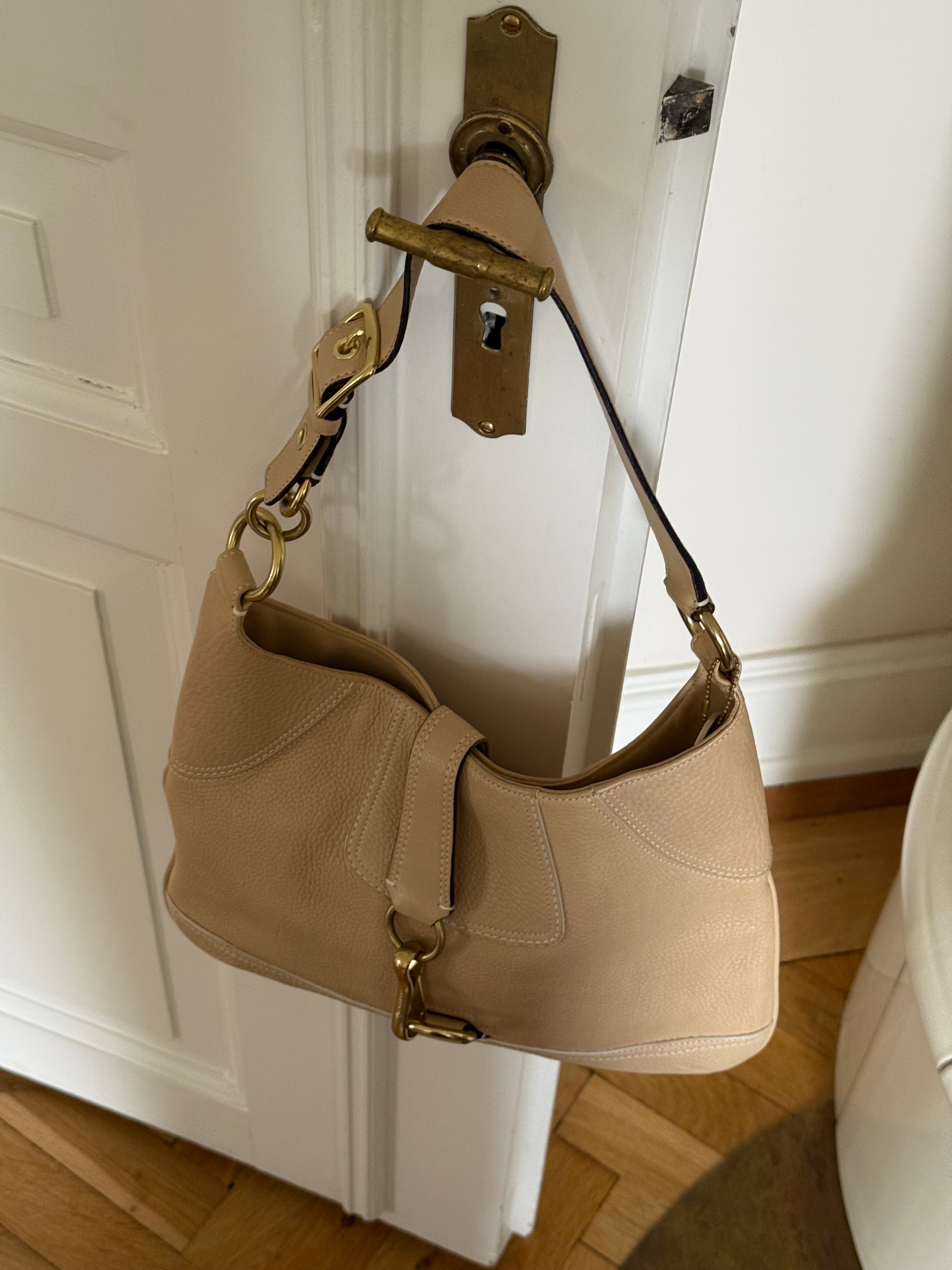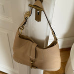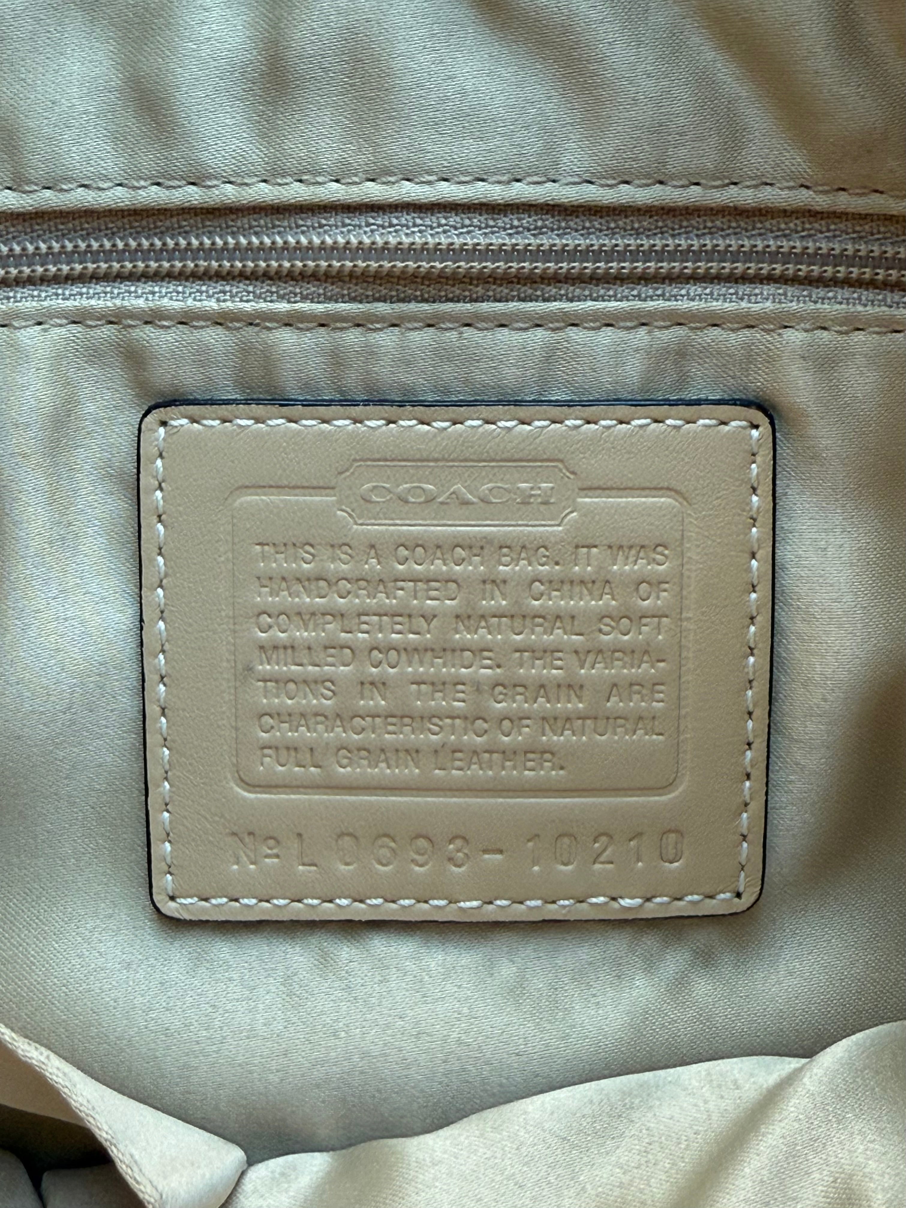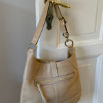 Coach Soho bag in beige leather with gold-colored hardware and beautiful beige interior.