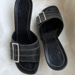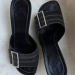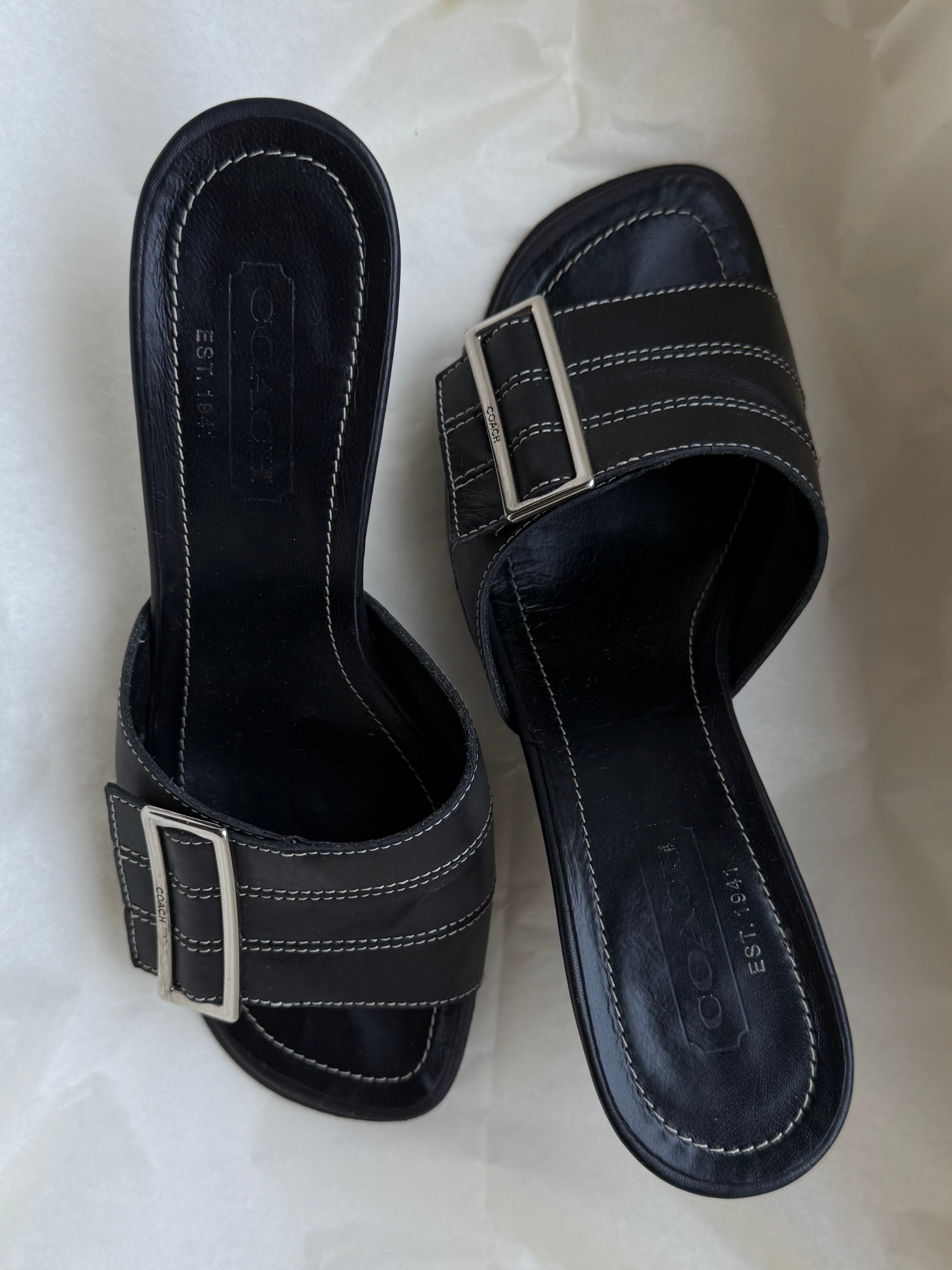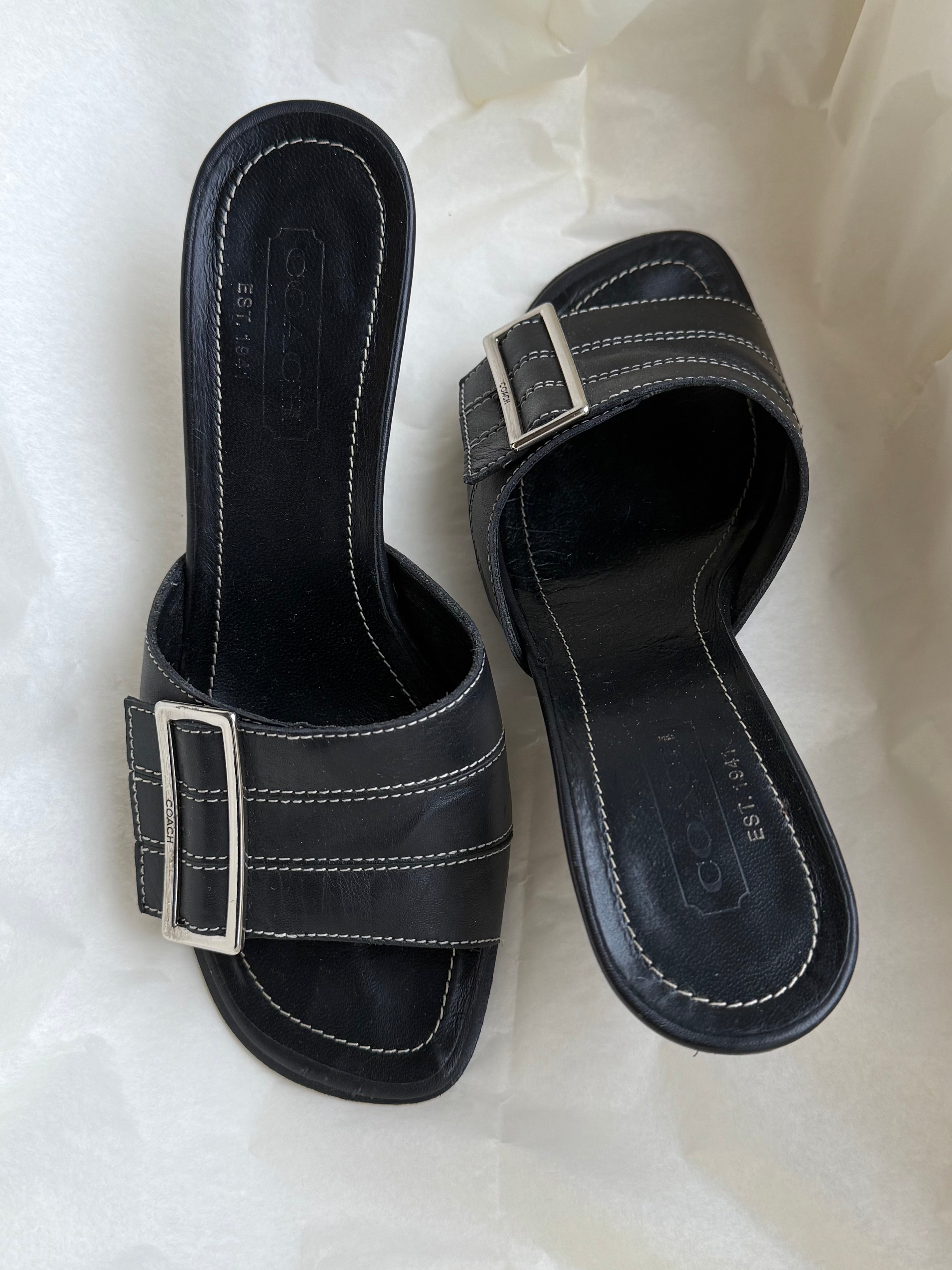 Vintage Coach black leather mules with silver-tone buckle detail.