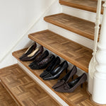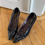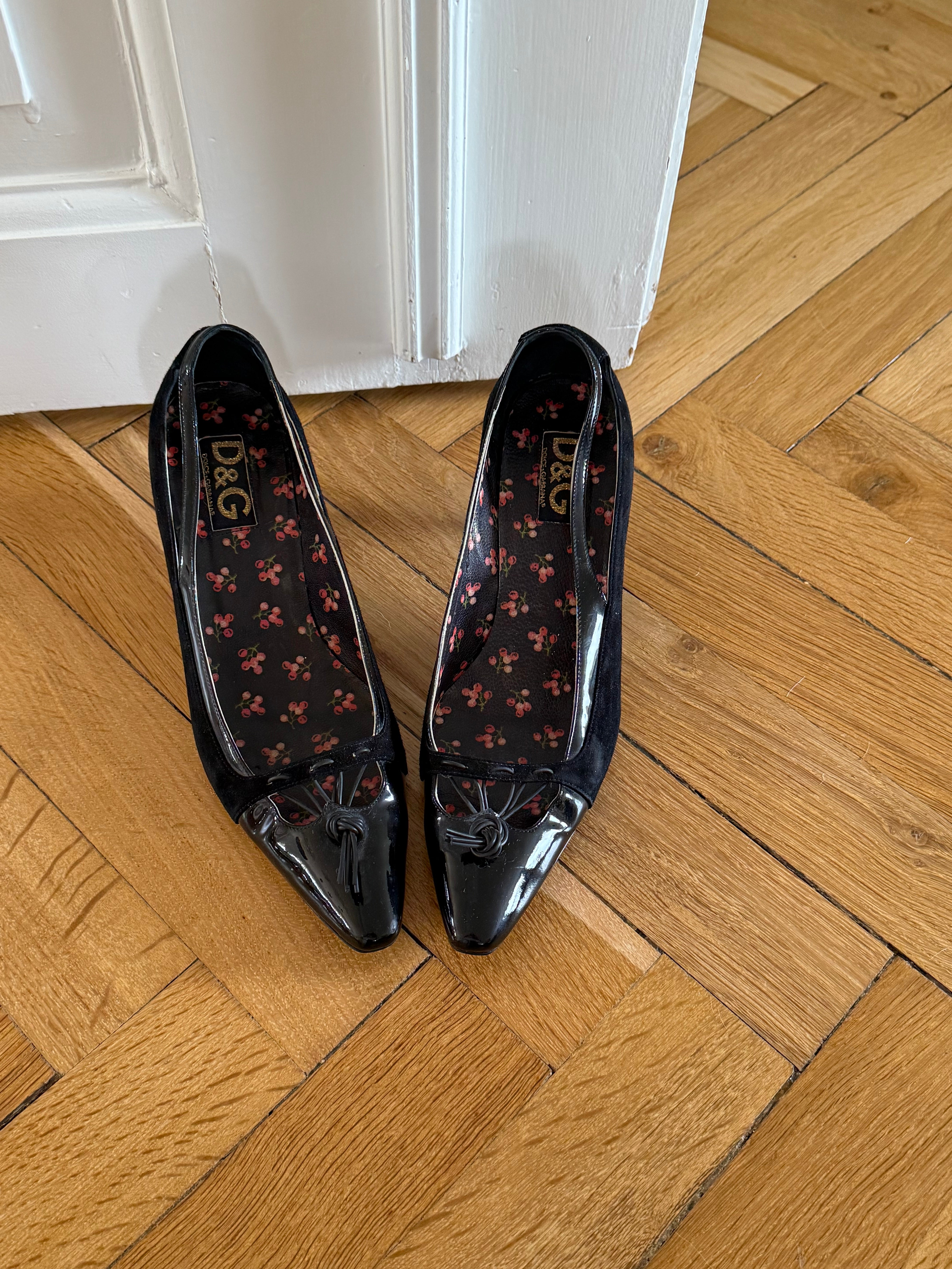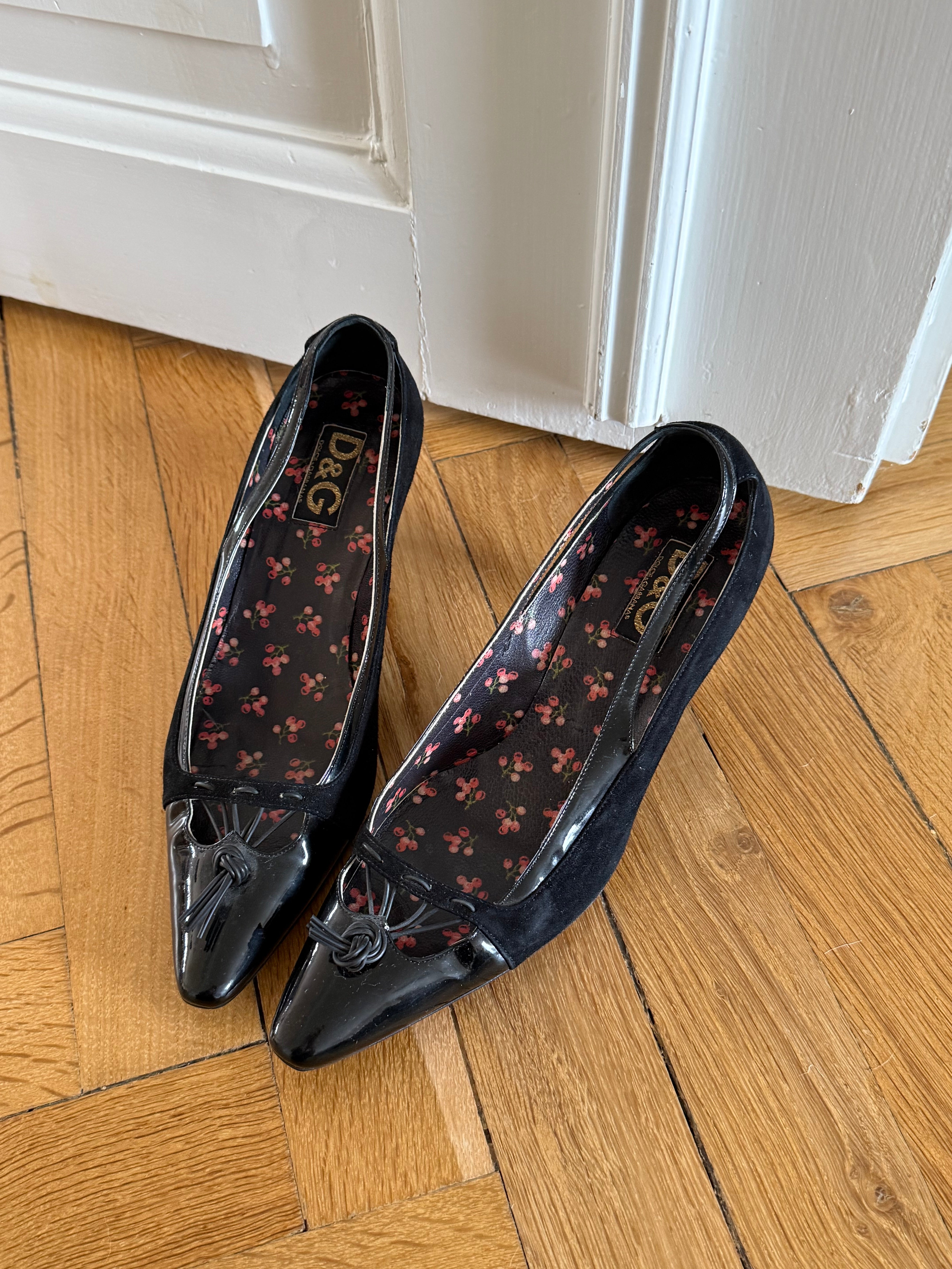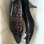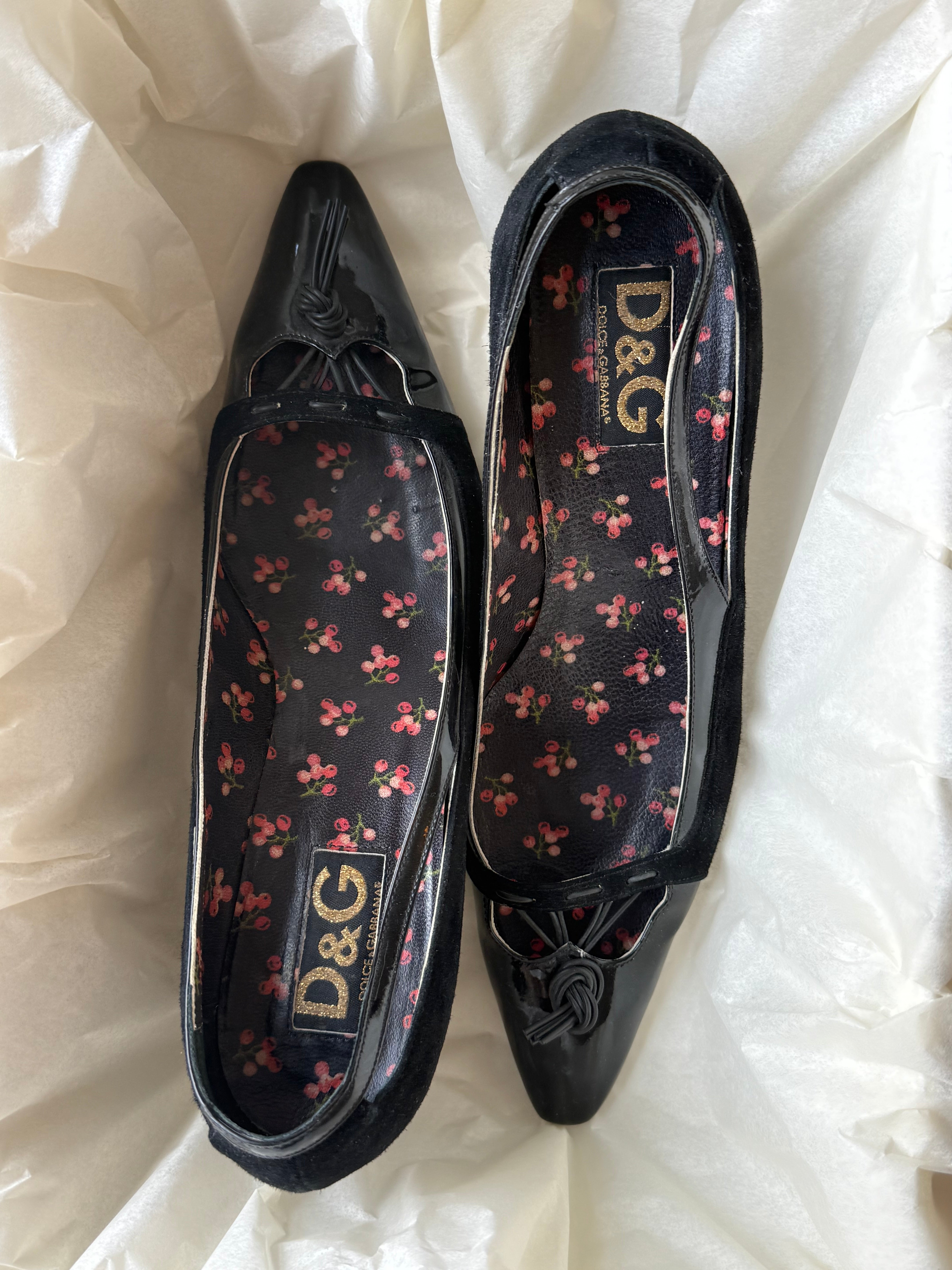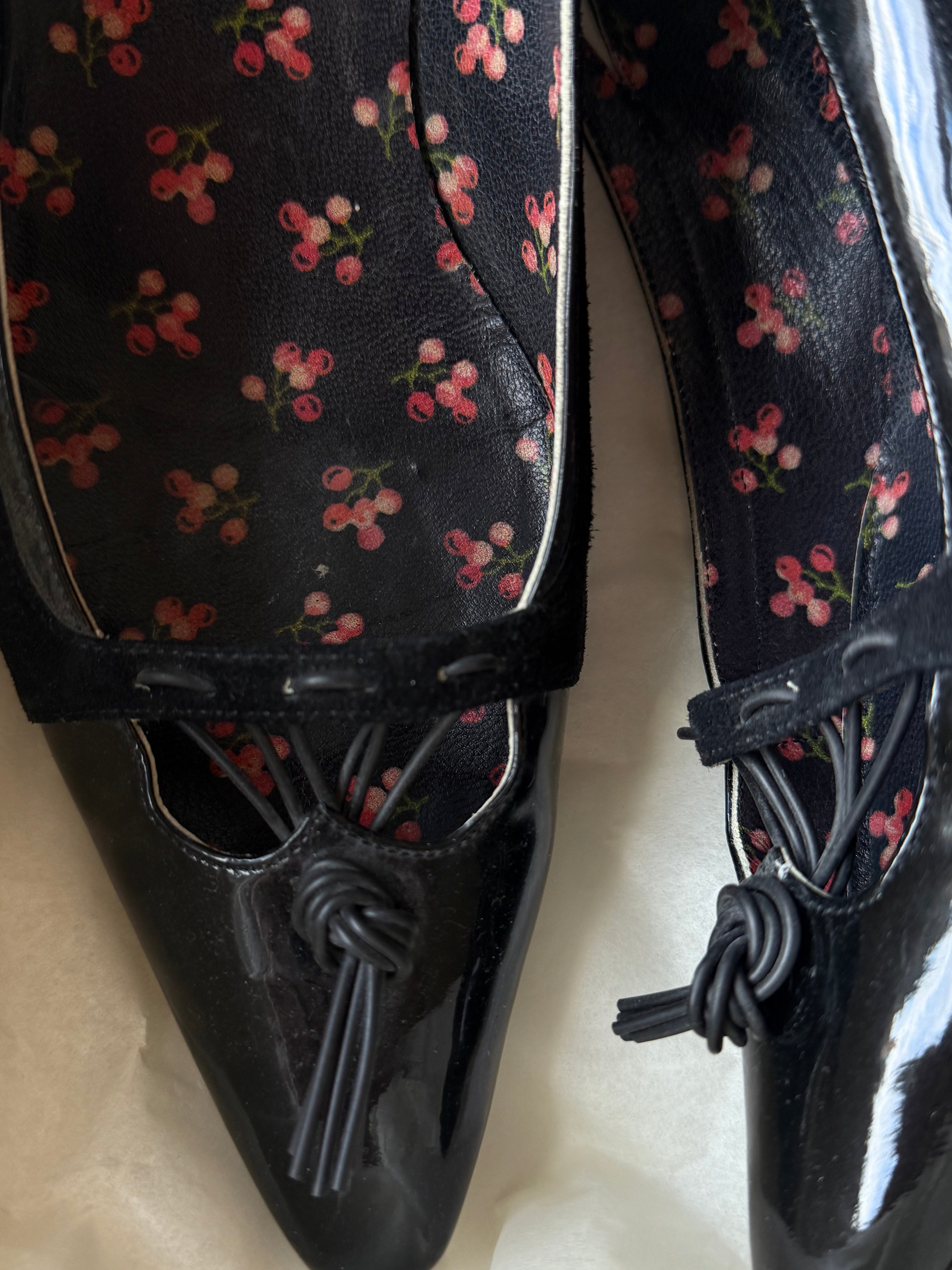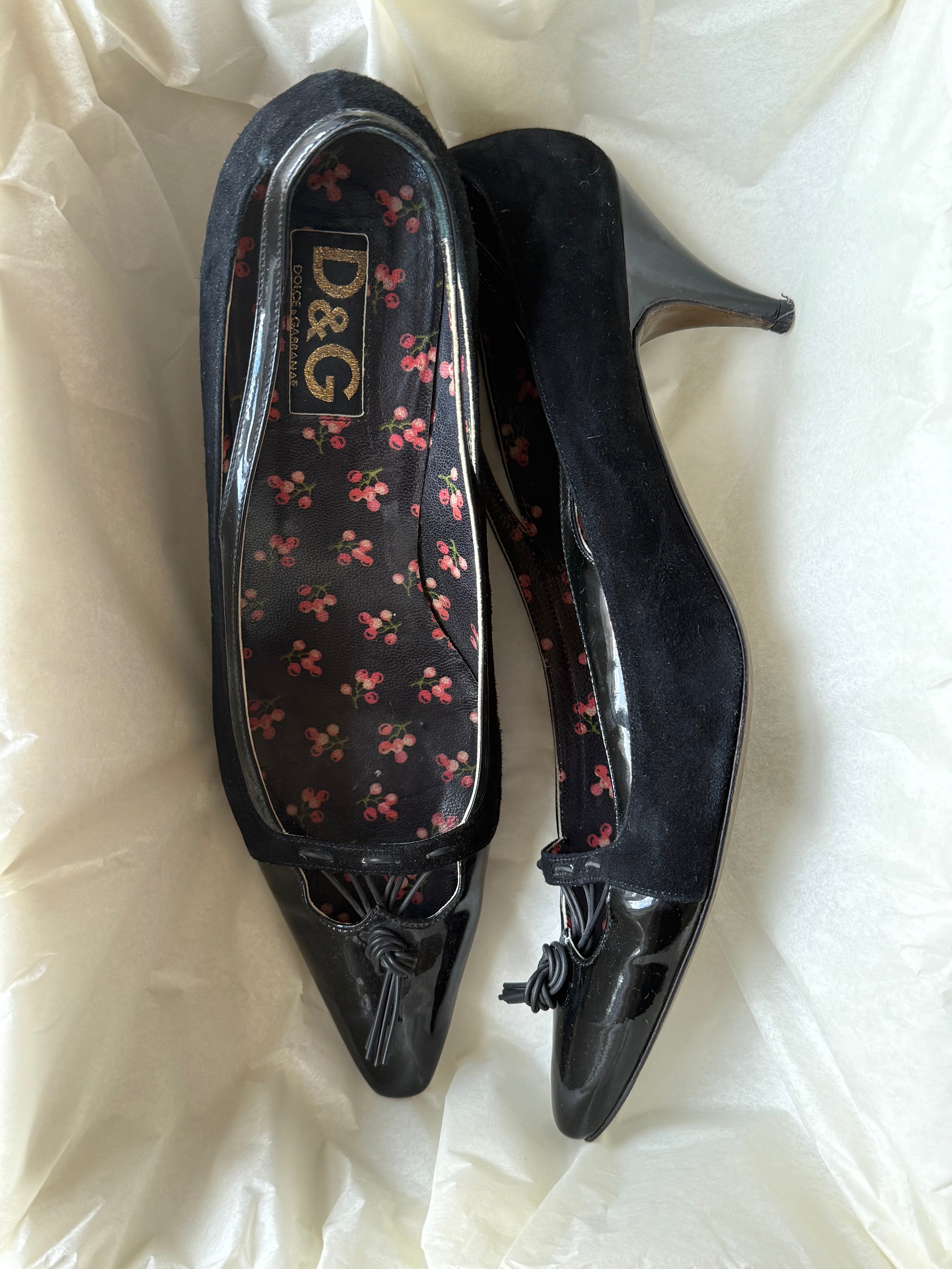 Vintage Dolce & Gabbana black patent leather and suede heels featuring a cute cherry pattern on the inner sole.