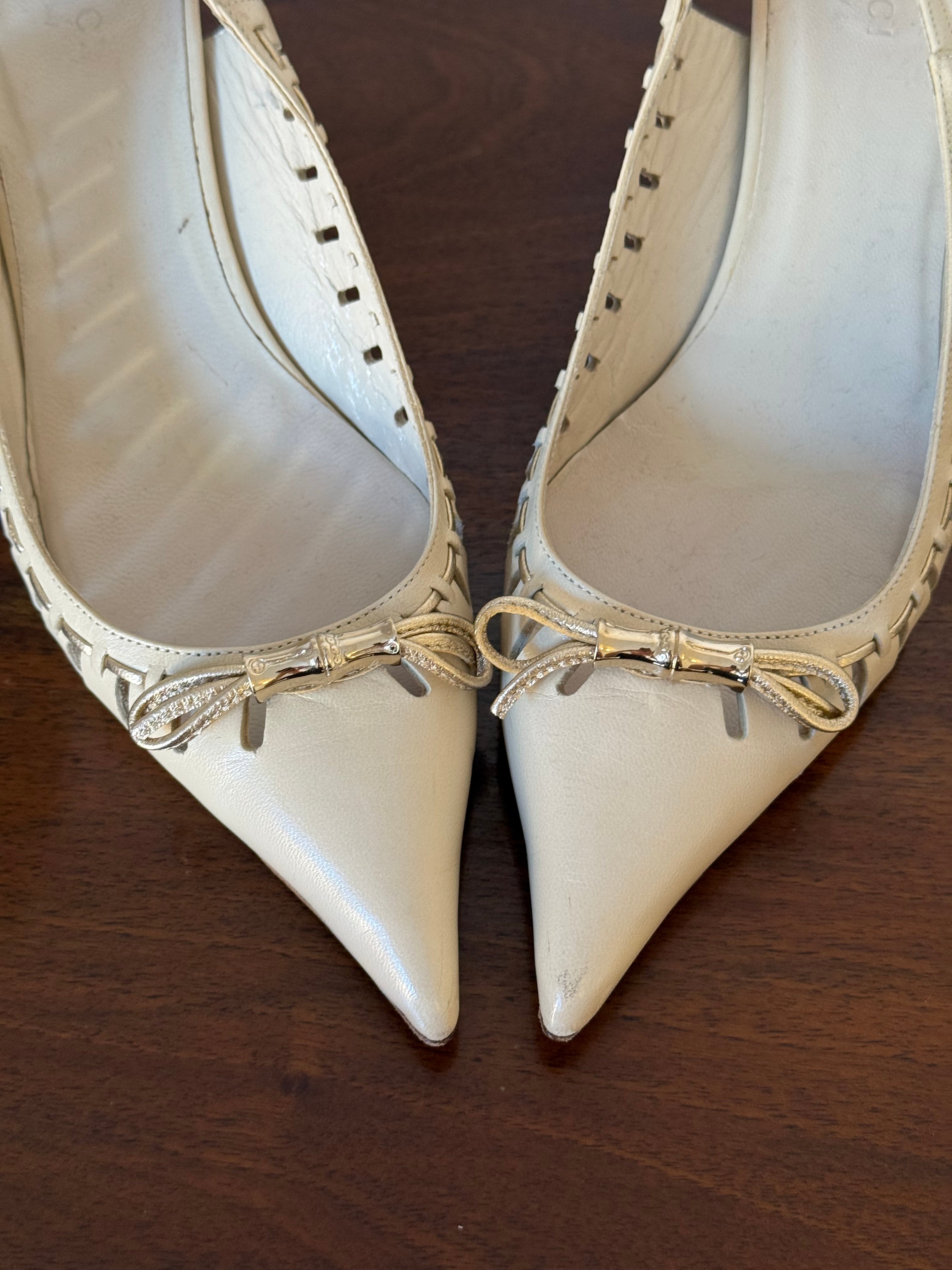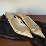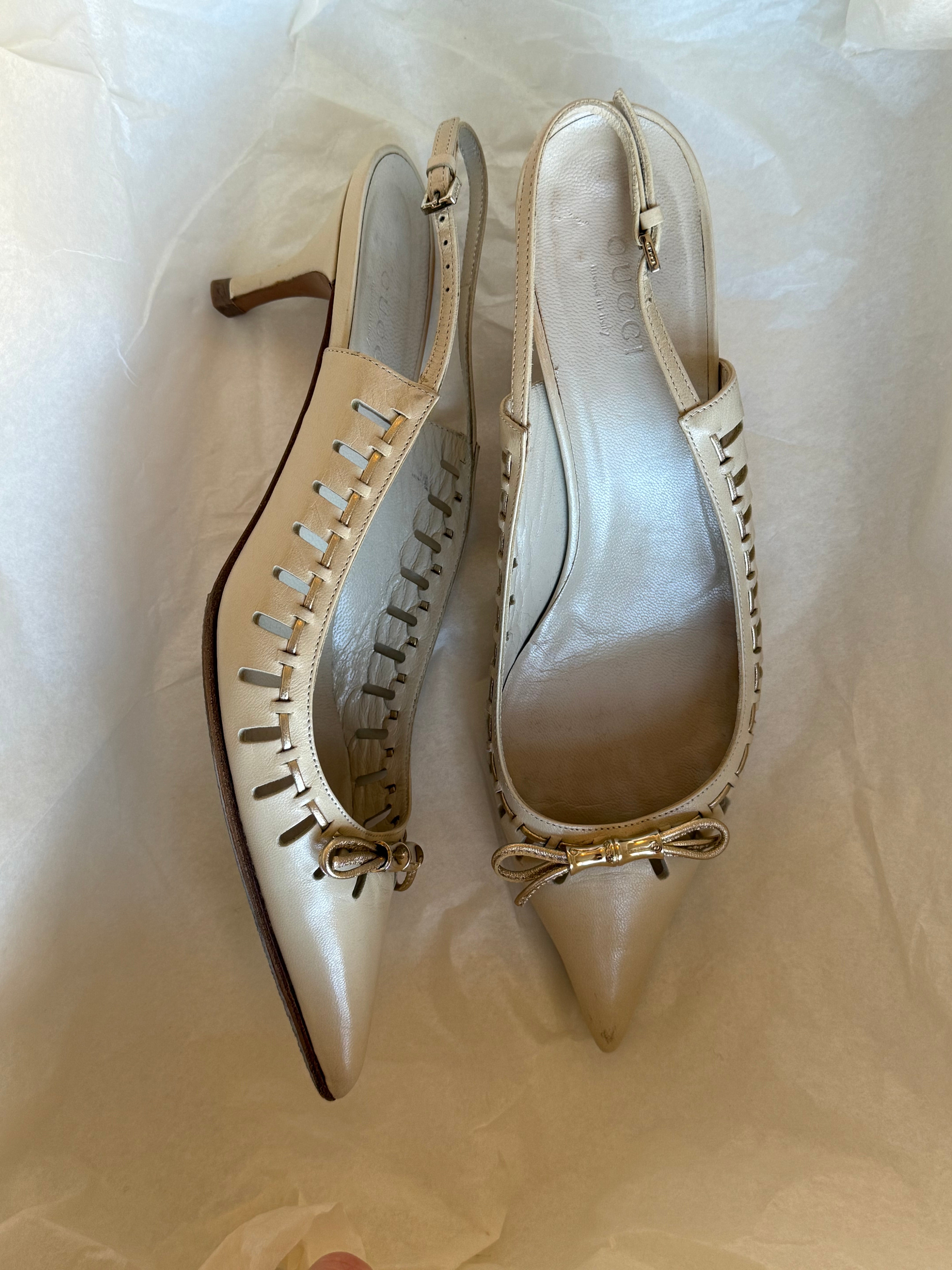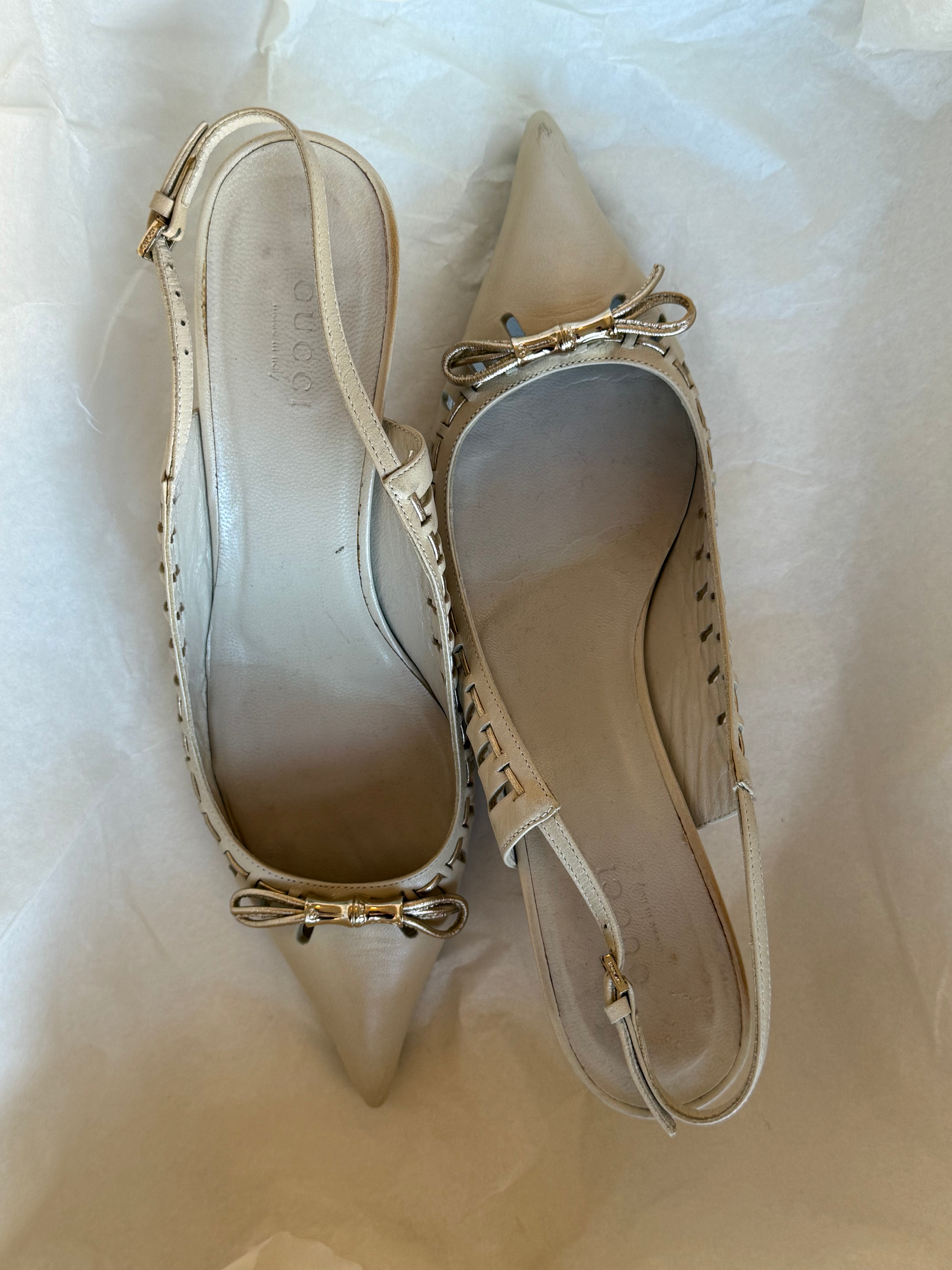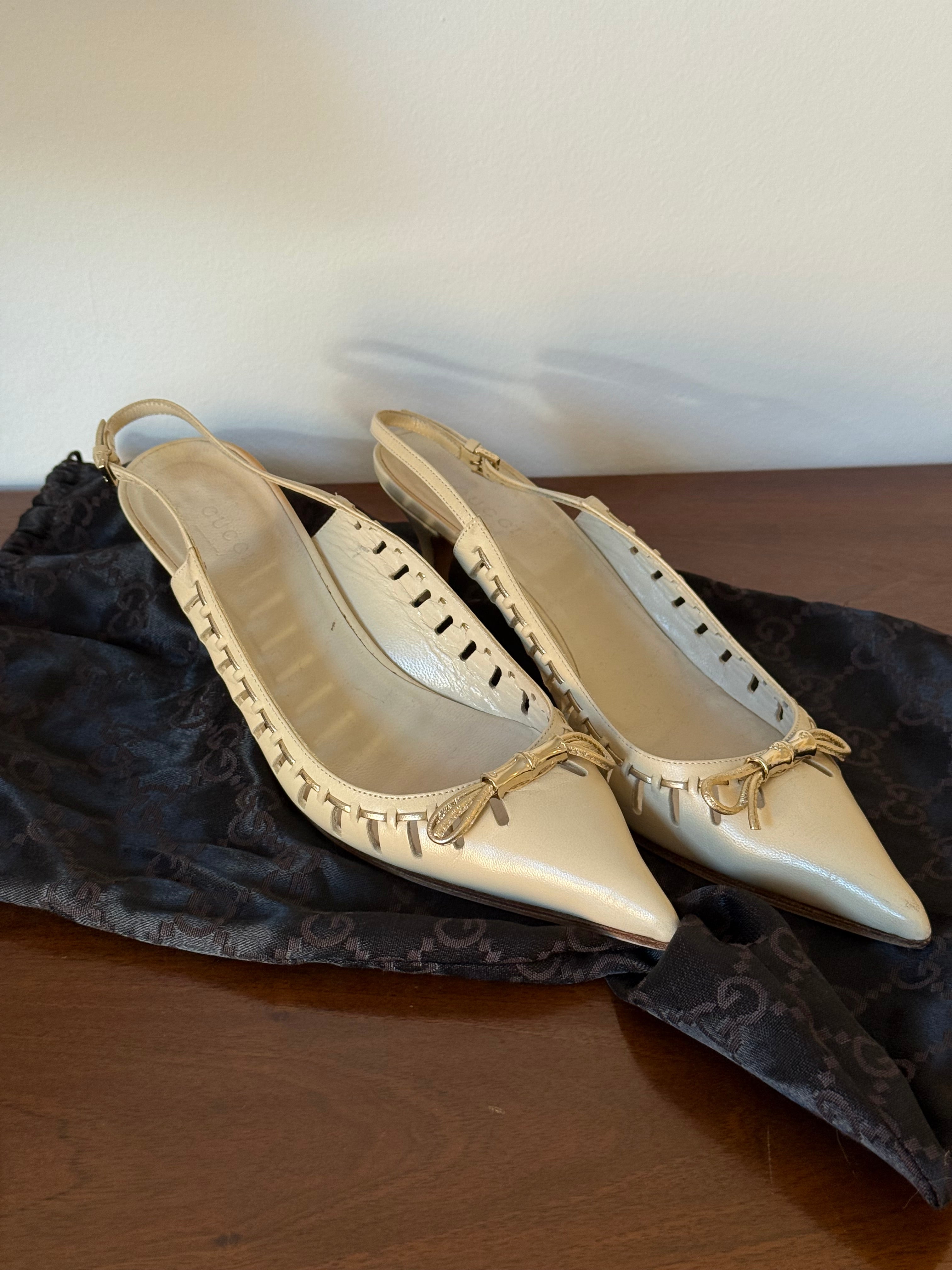 Stunning vintage Gucci pointed-toe kitten heels featuring a gold bow and an adjustable slingback strap.