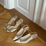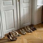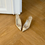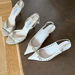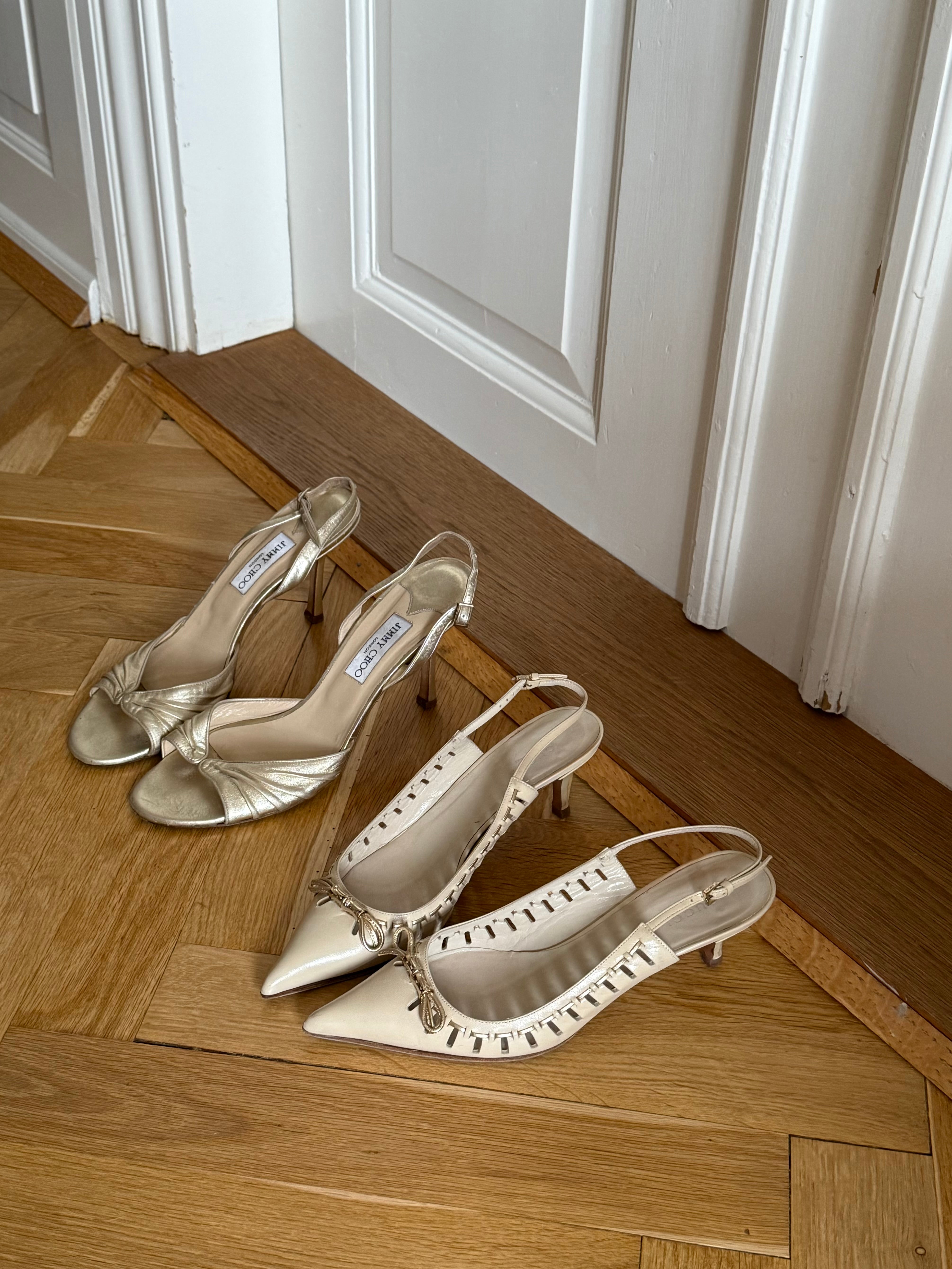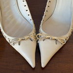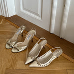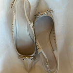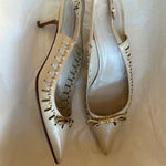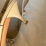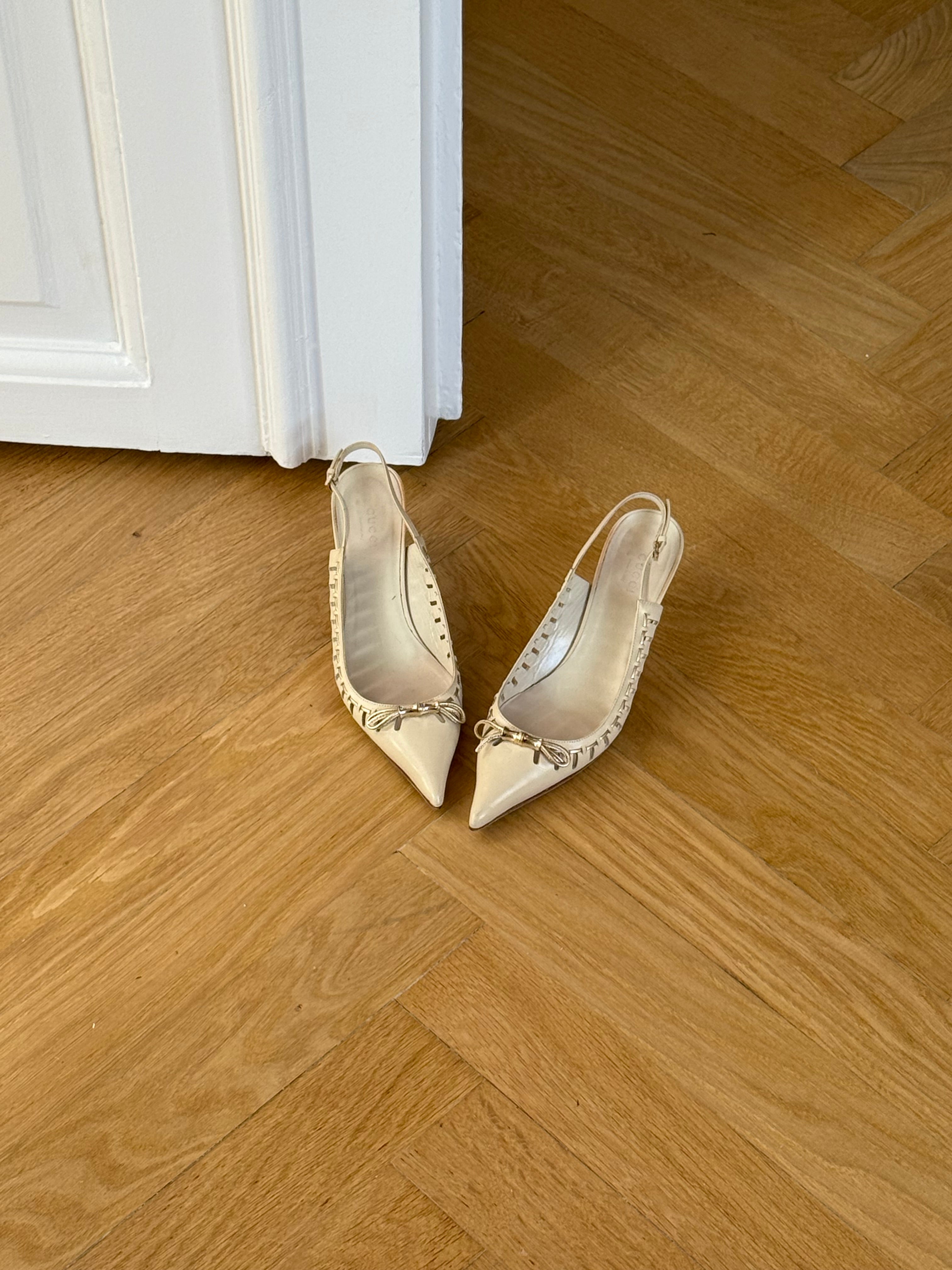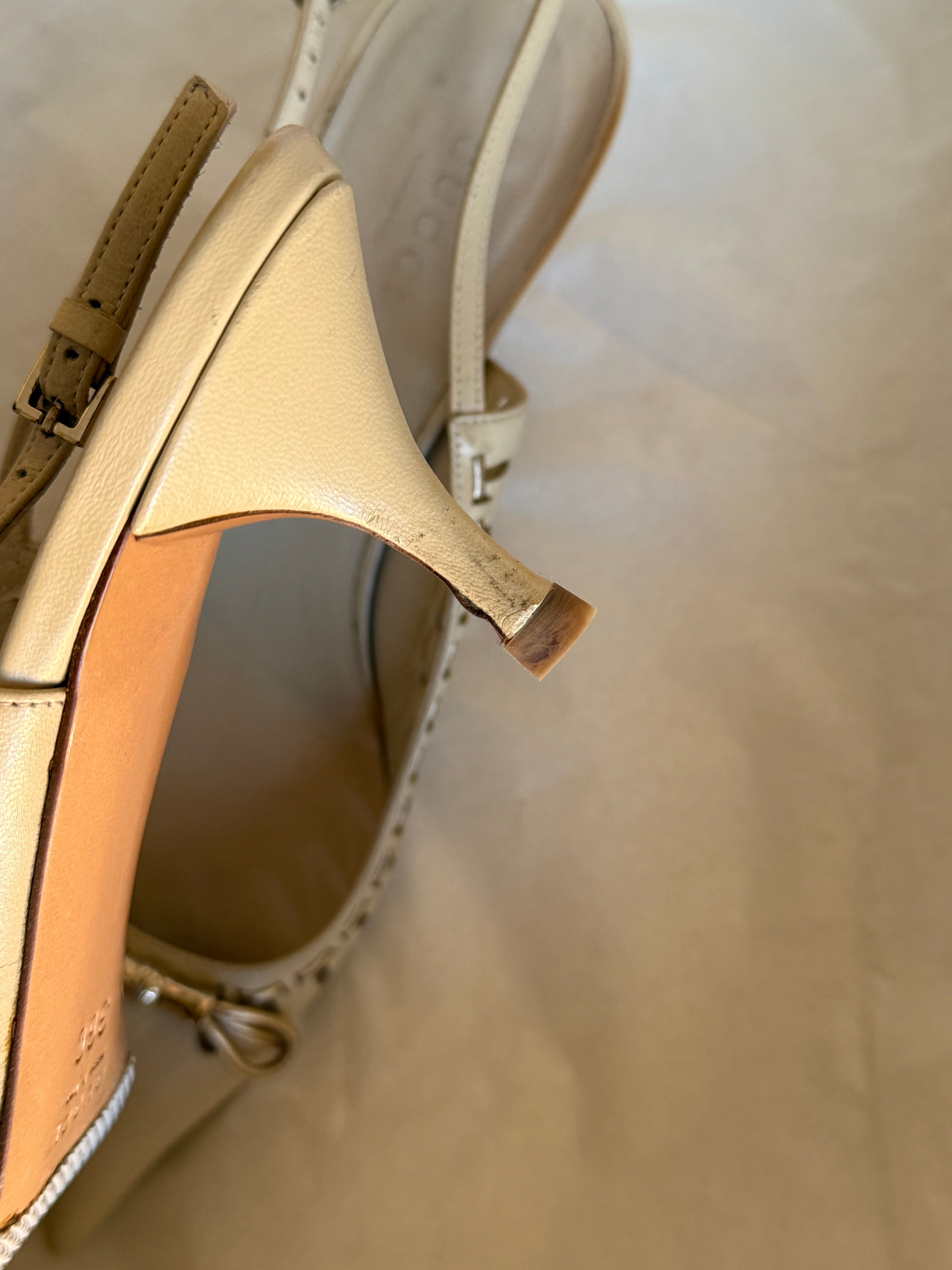 Stunning vintage Gucci pointed-toe kitten heels featuring a gold bow and an adjustable slingback strap.