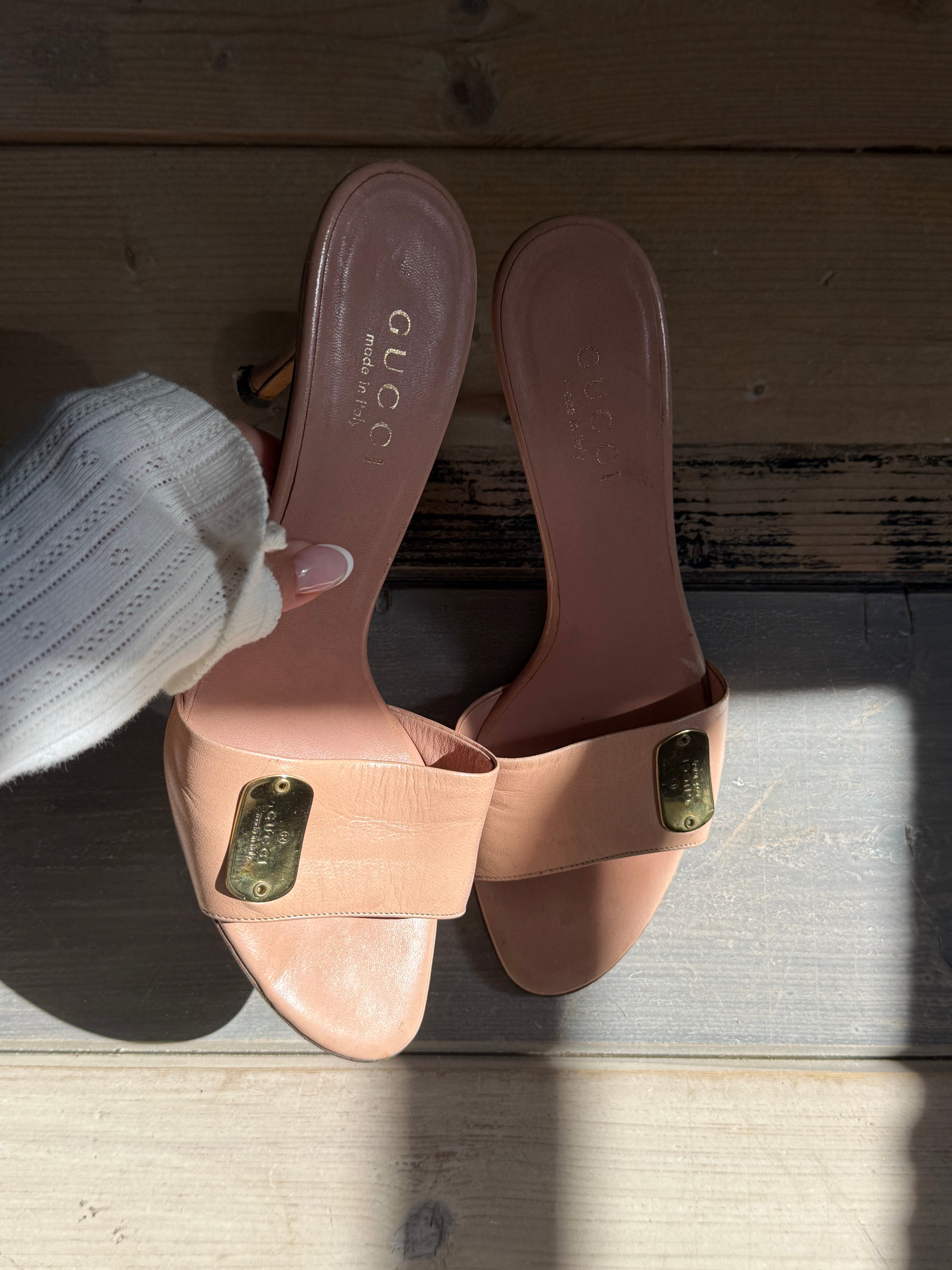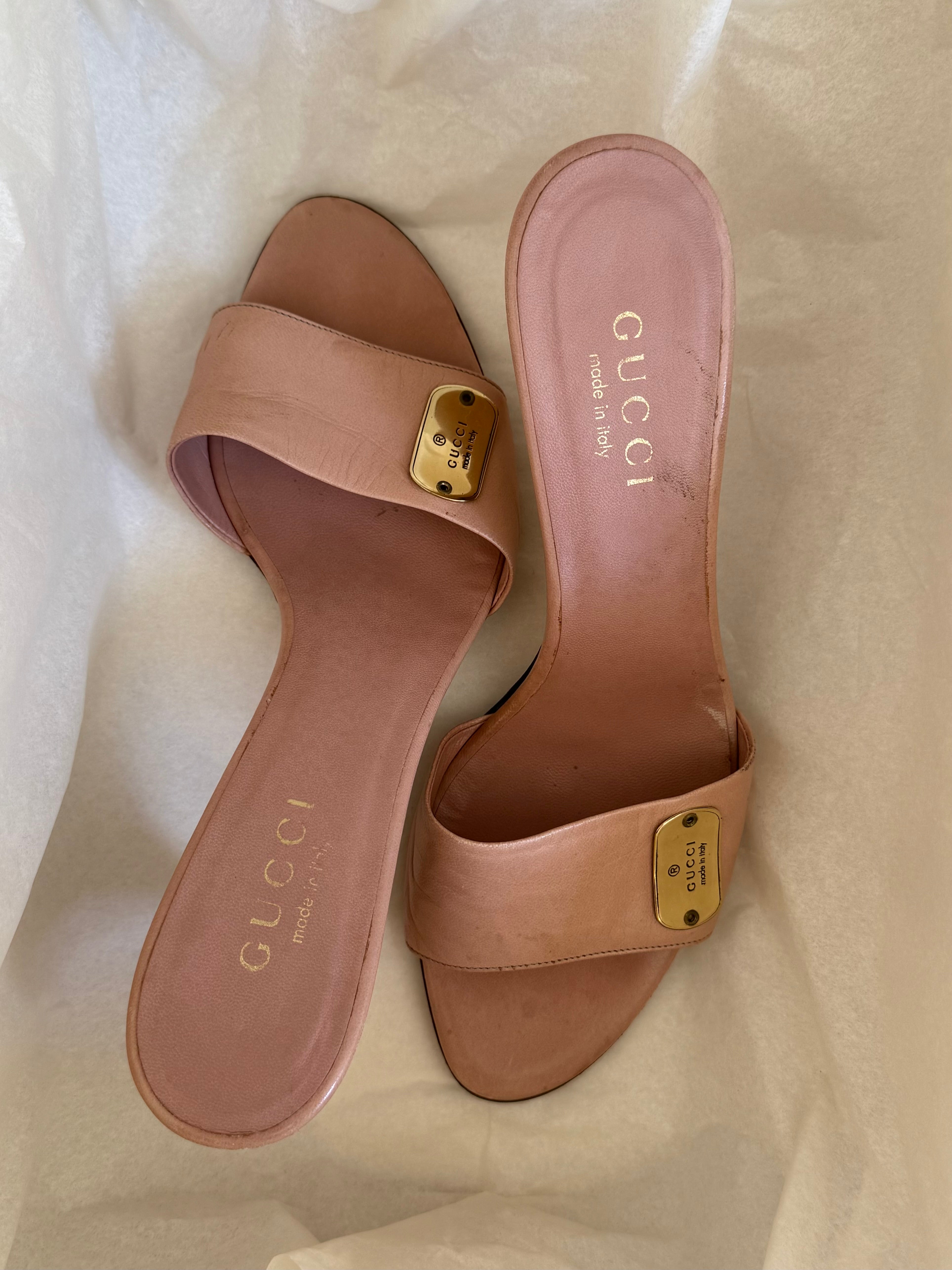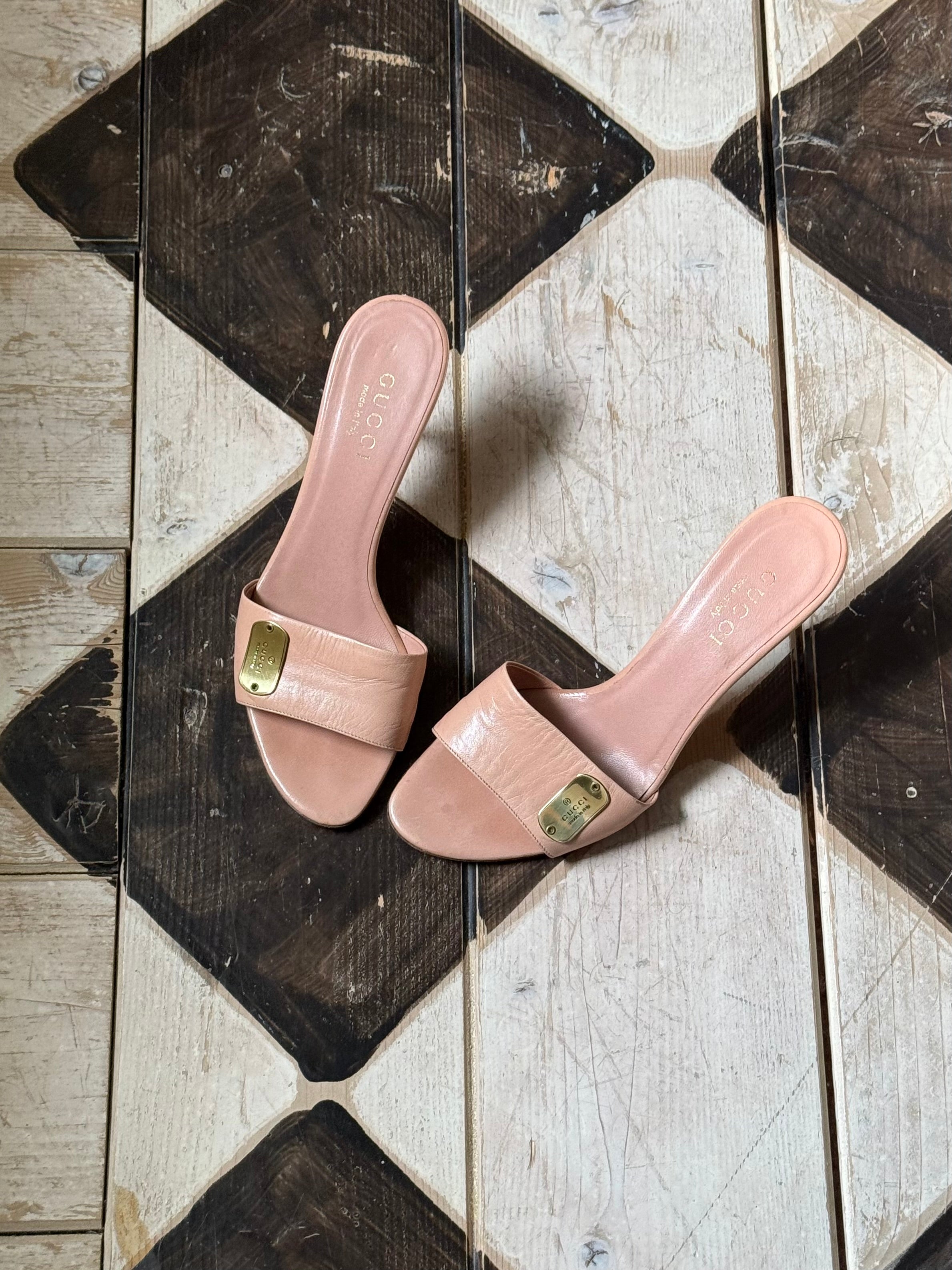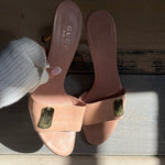 Pink Beige open-toe leather mules in beige/pink by Gucci from early 2000s.