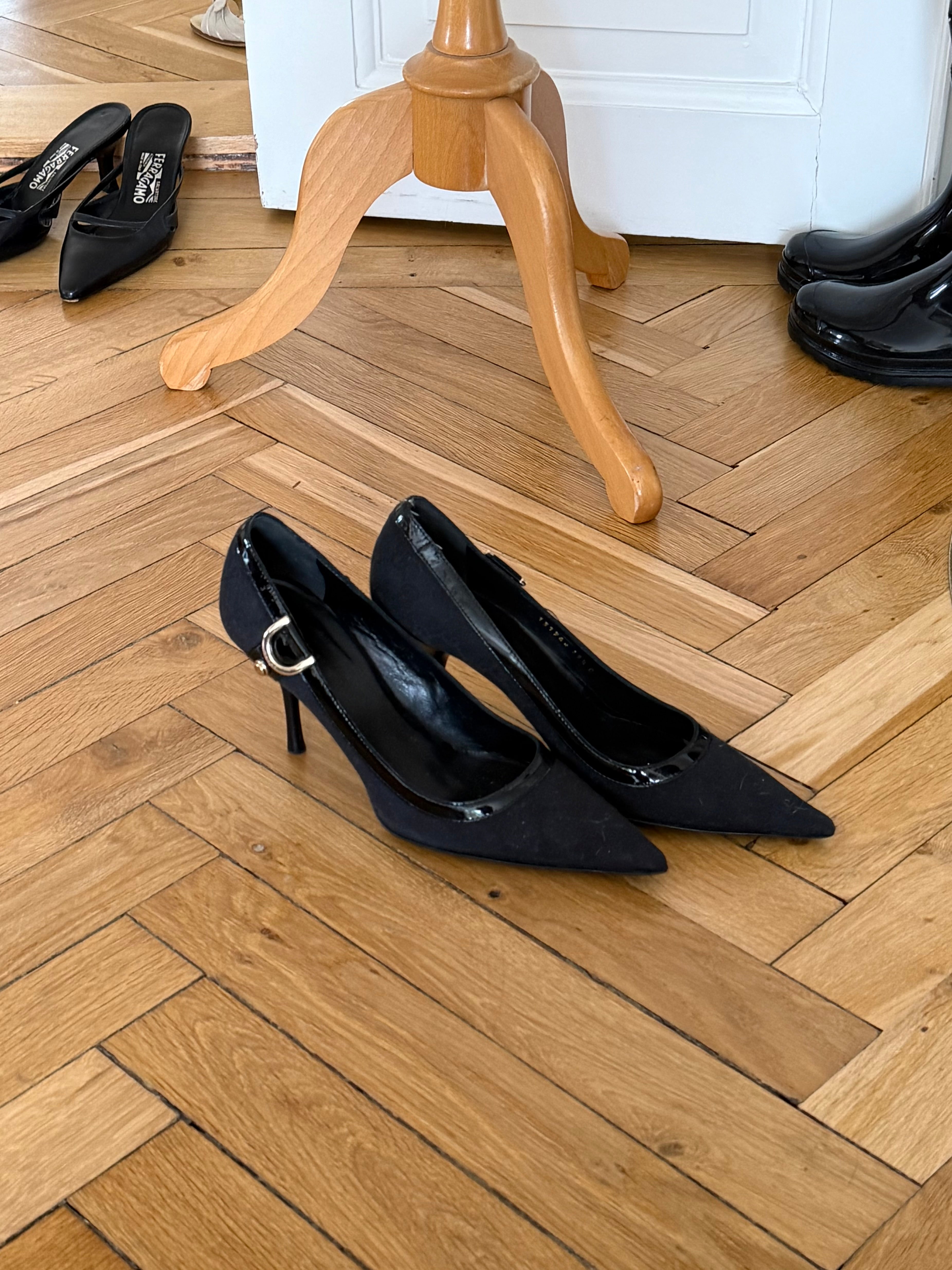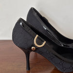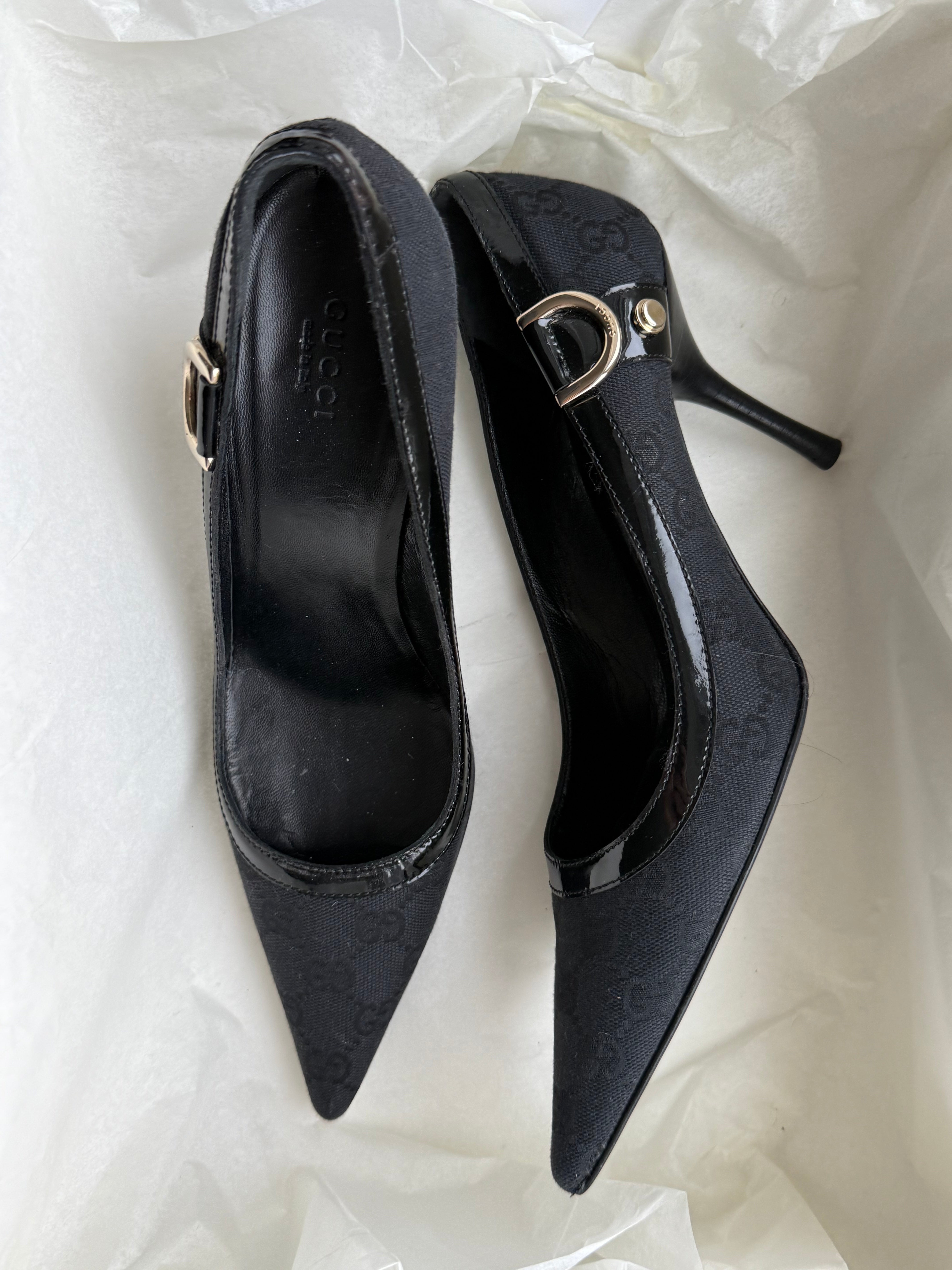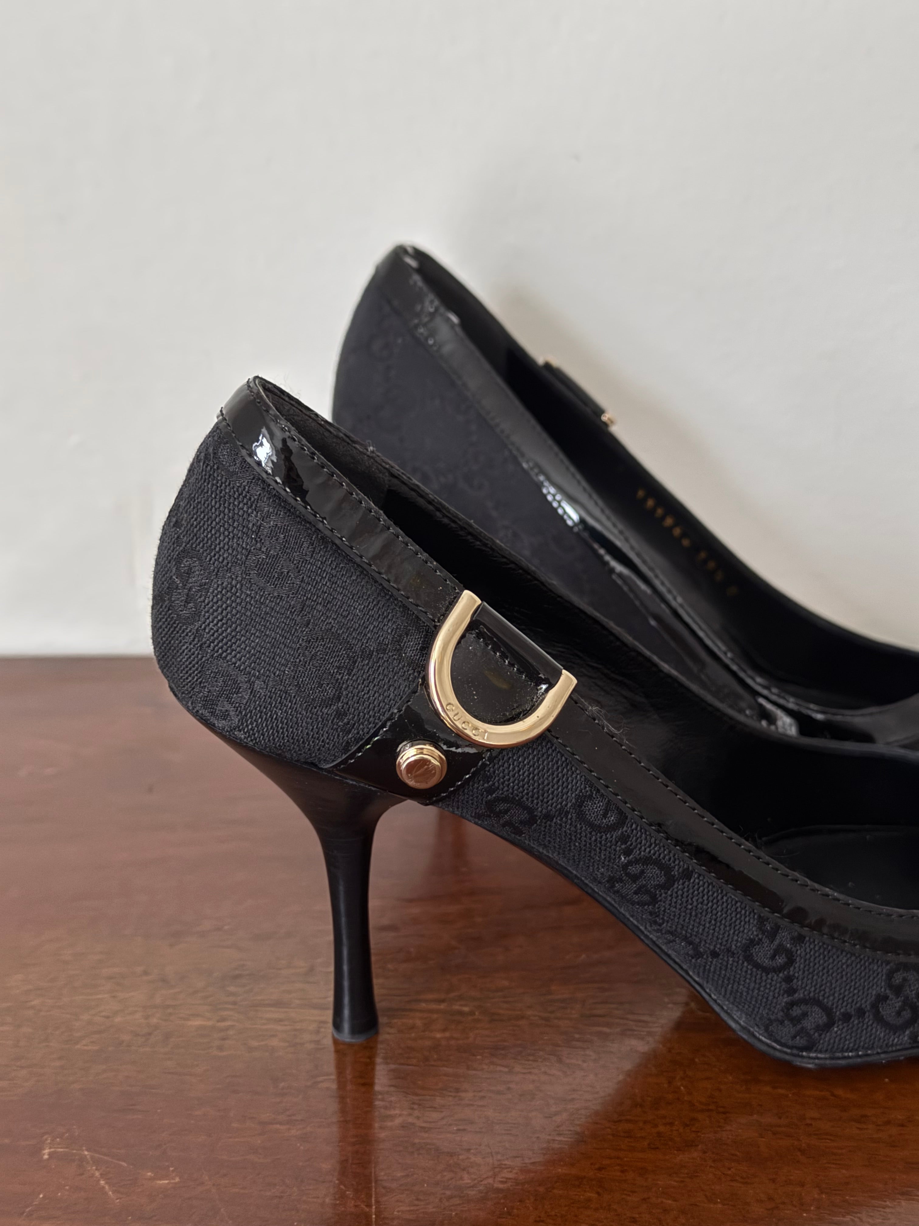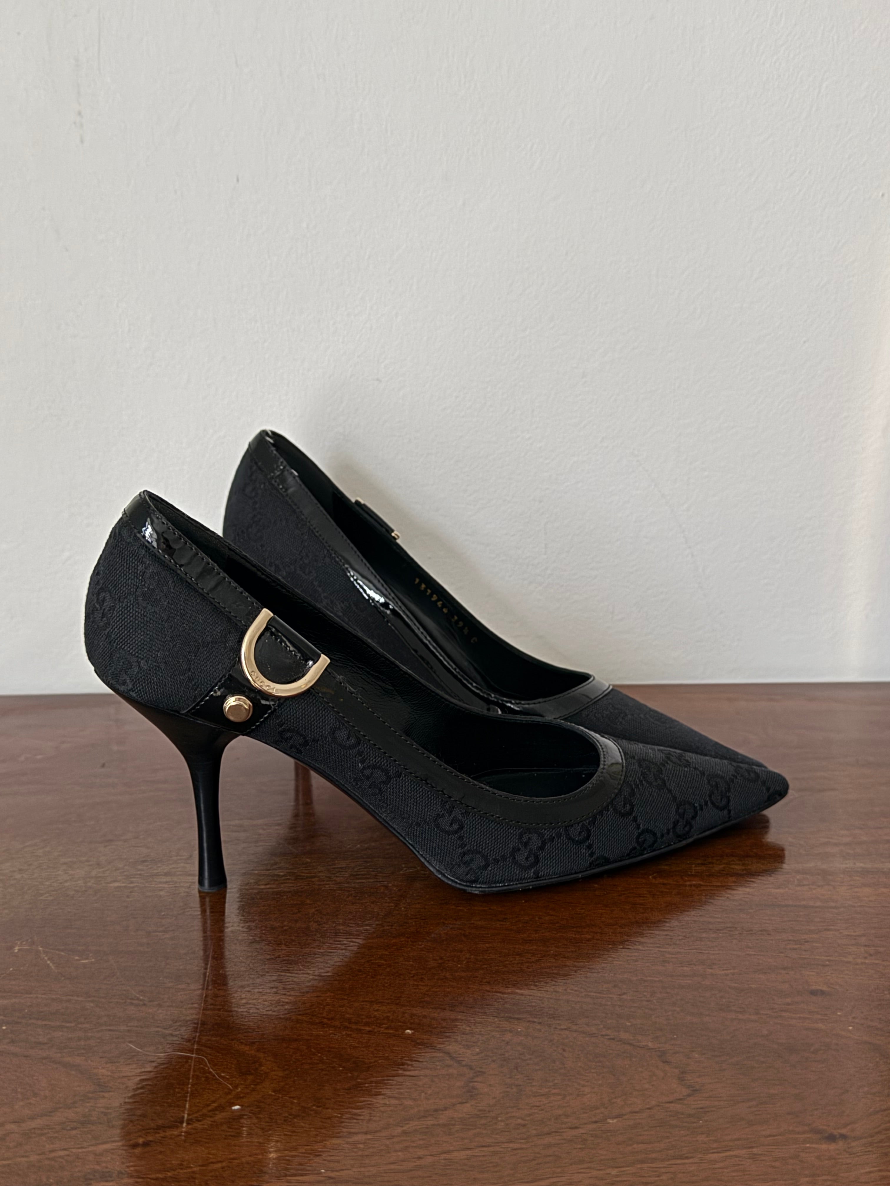 Vintage Gucci 'Abbey' pumps in black leather with pointed toe and logo hardware detail.