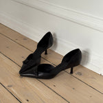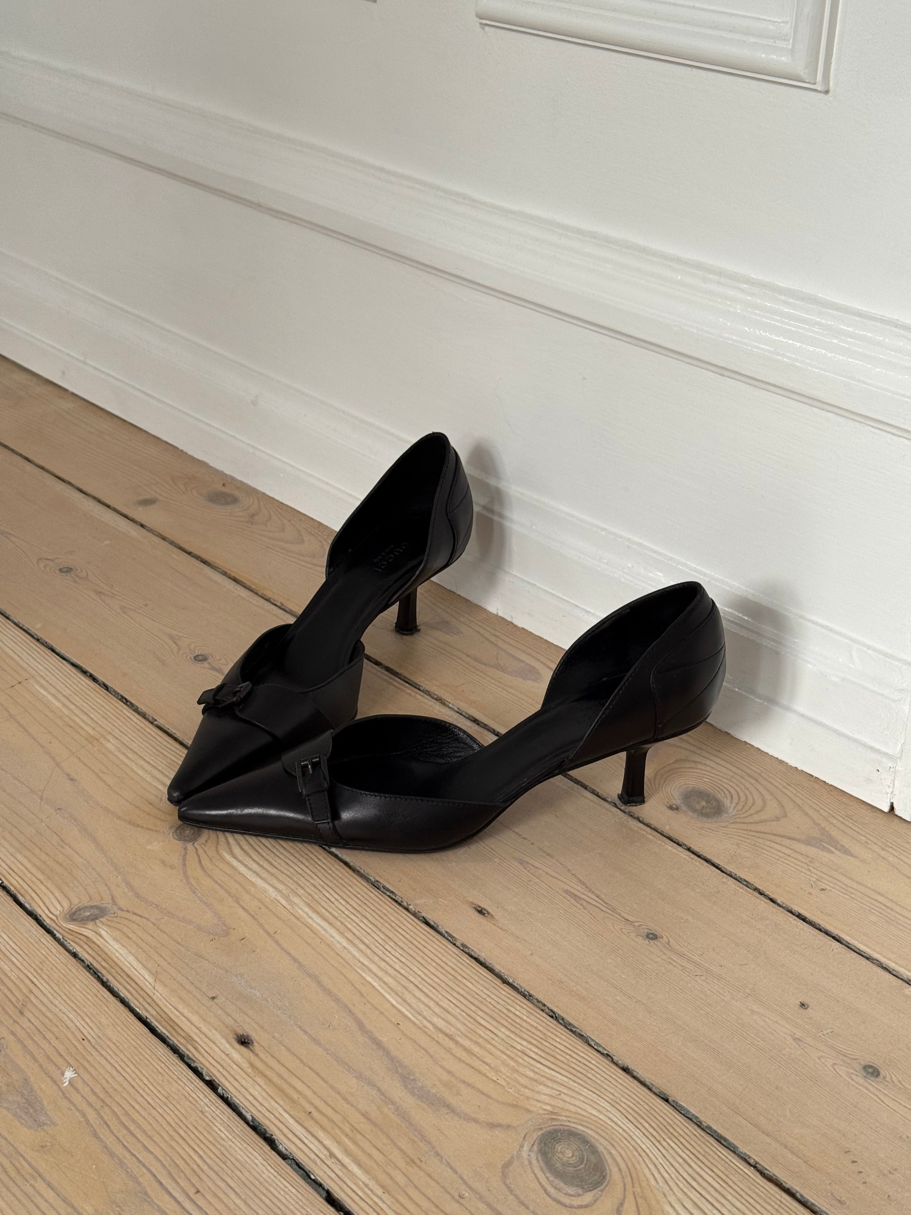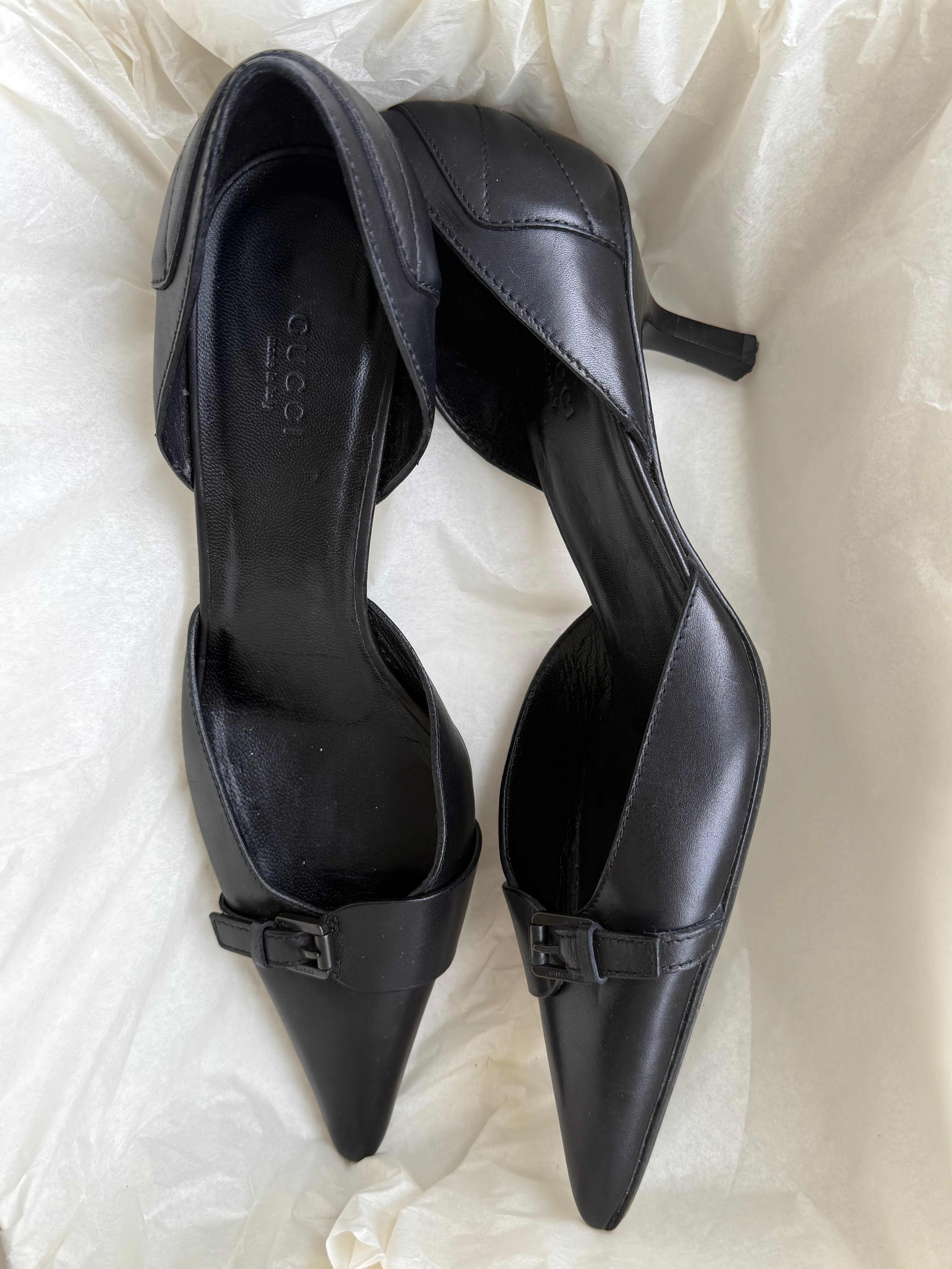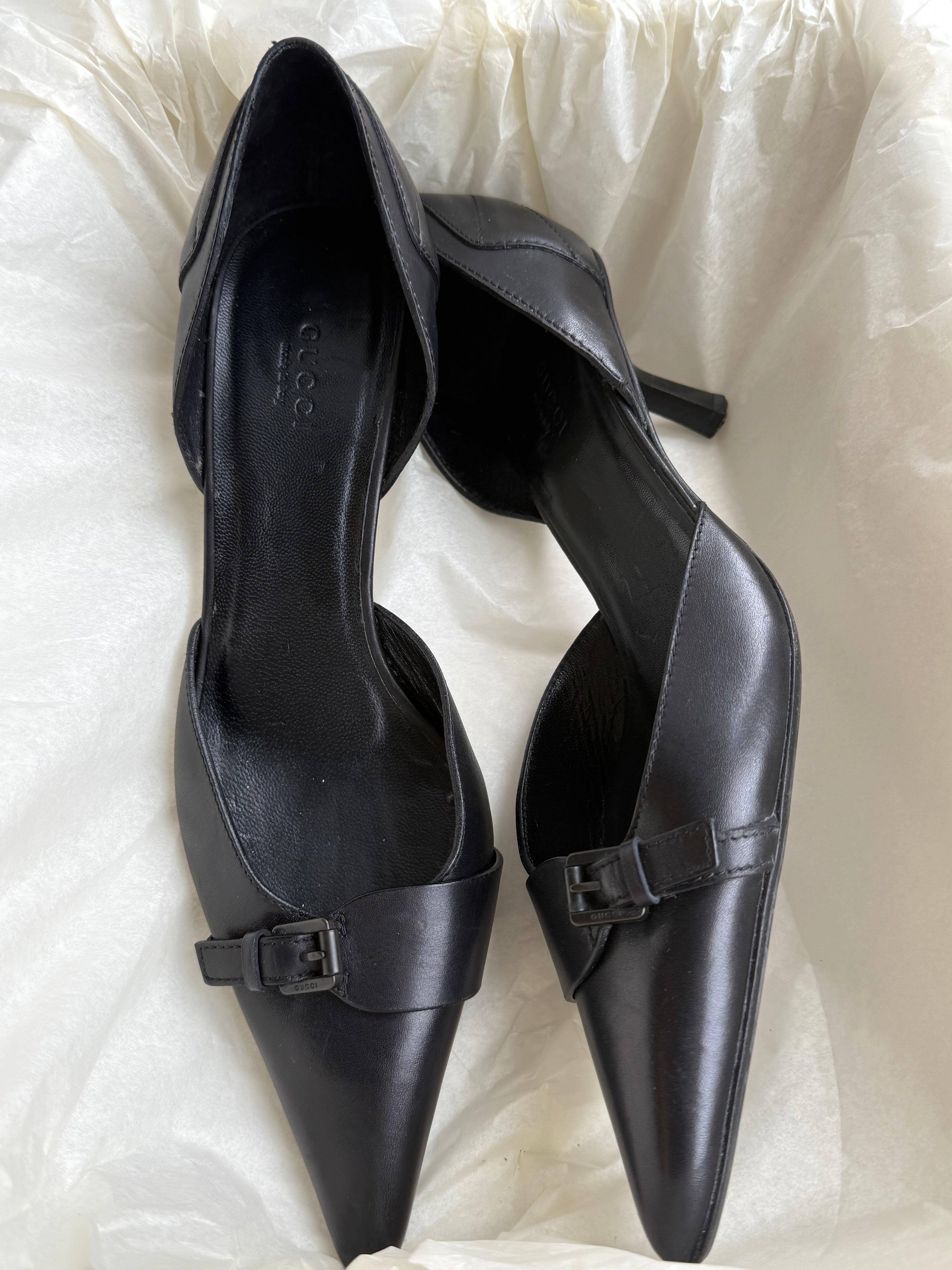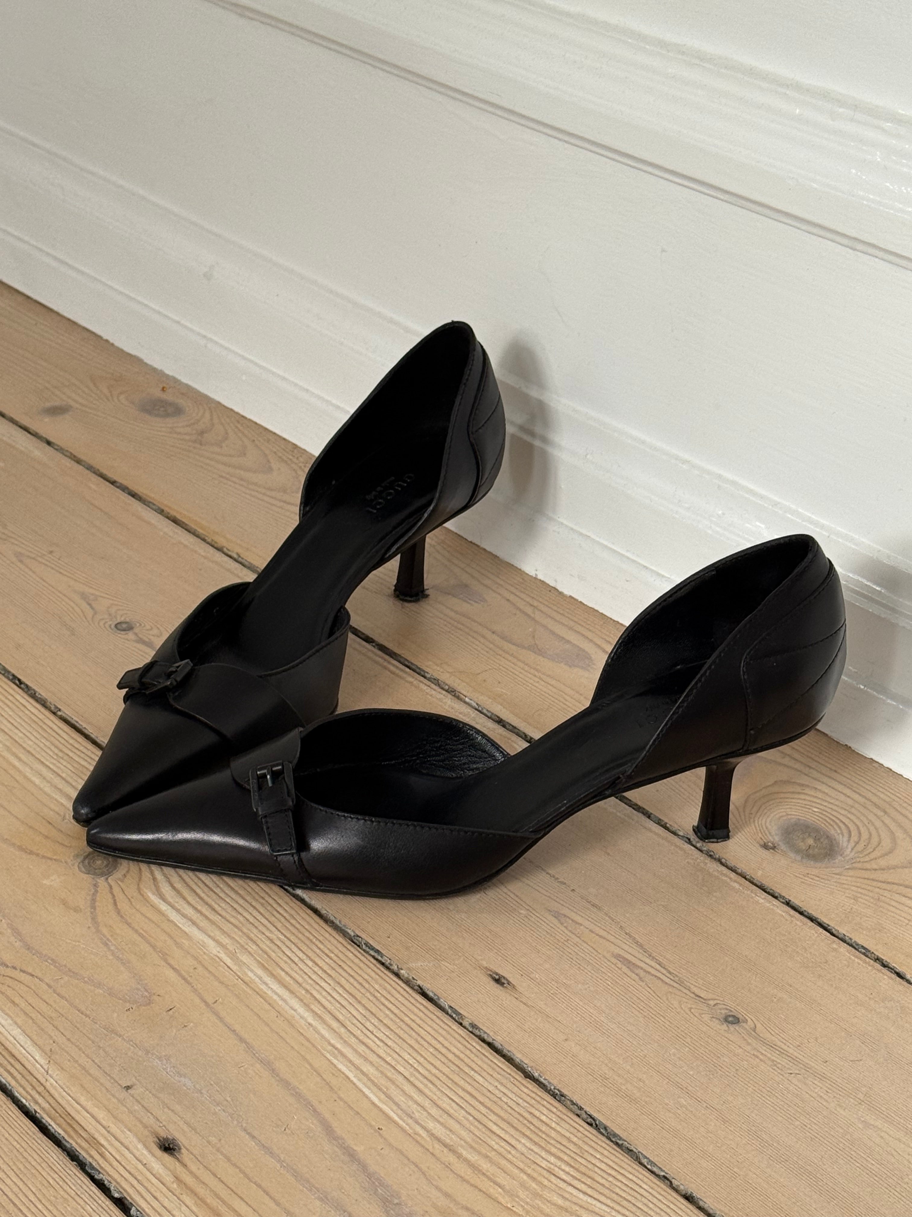 Tom Ford for Gucci vintage black pointed-toe heels in leather with a low kitten heel and front buckle detail.