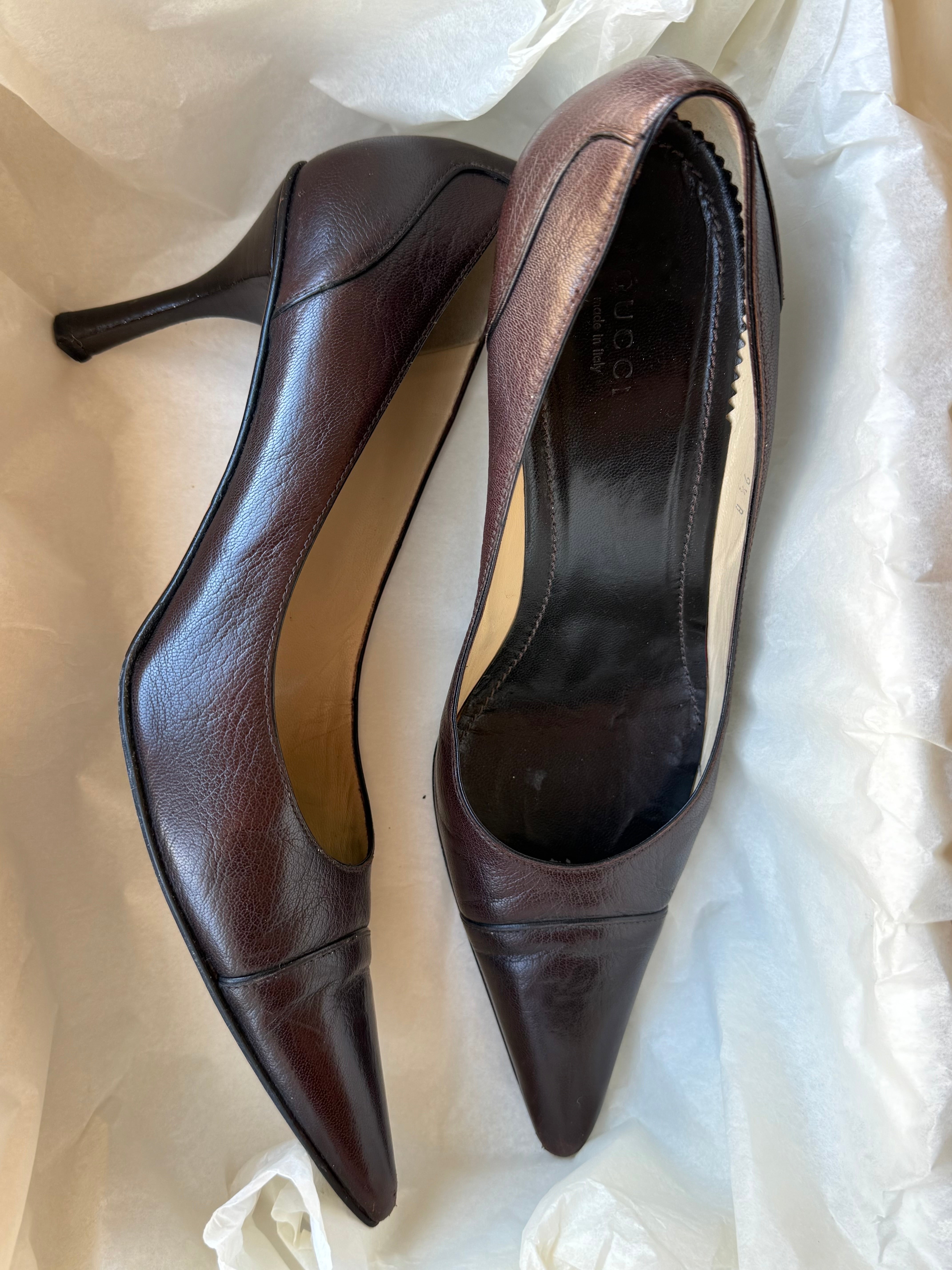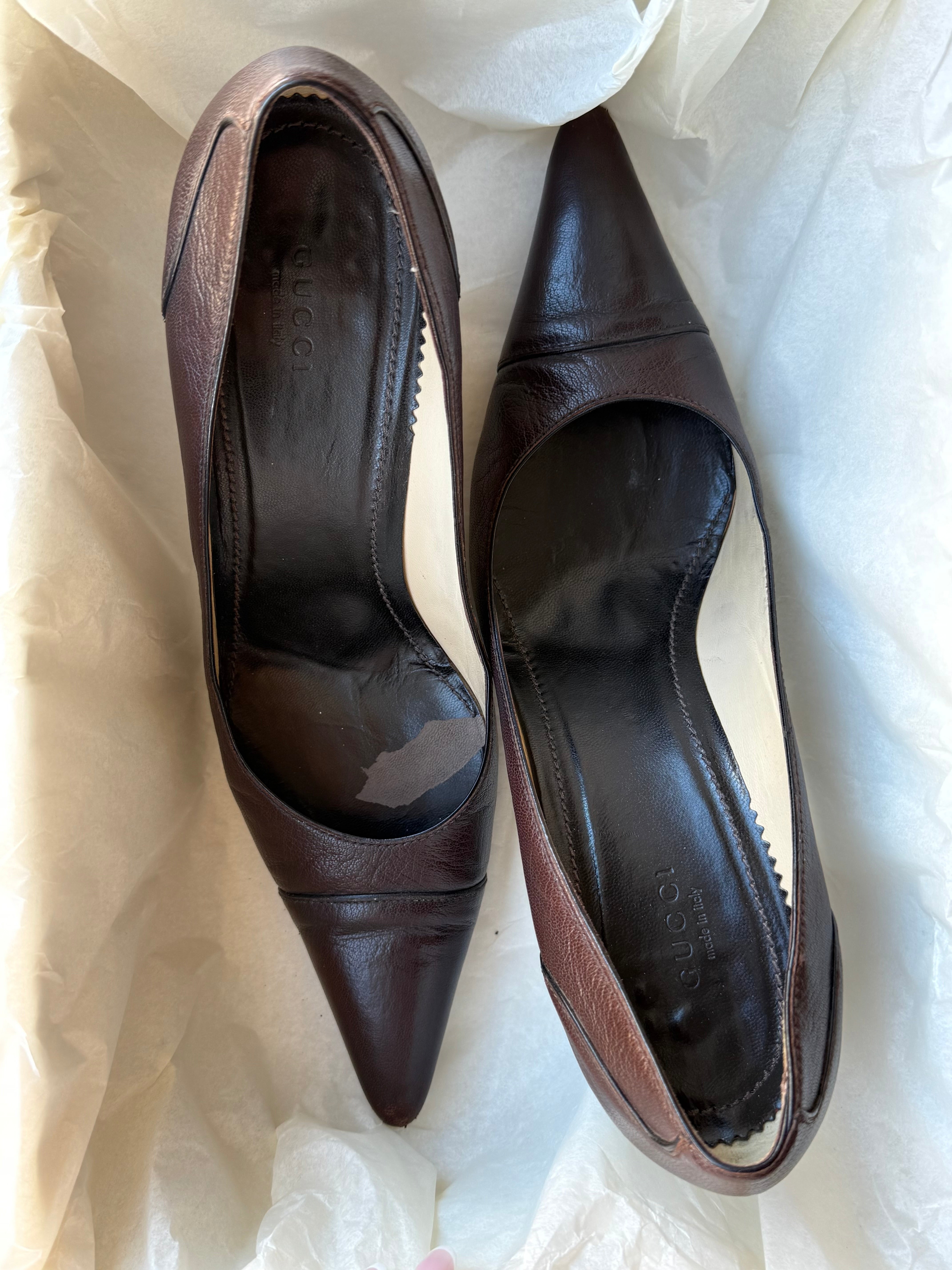 Classic Gucci leather pumps in a beautiful brown color. Comes with all original packaging.