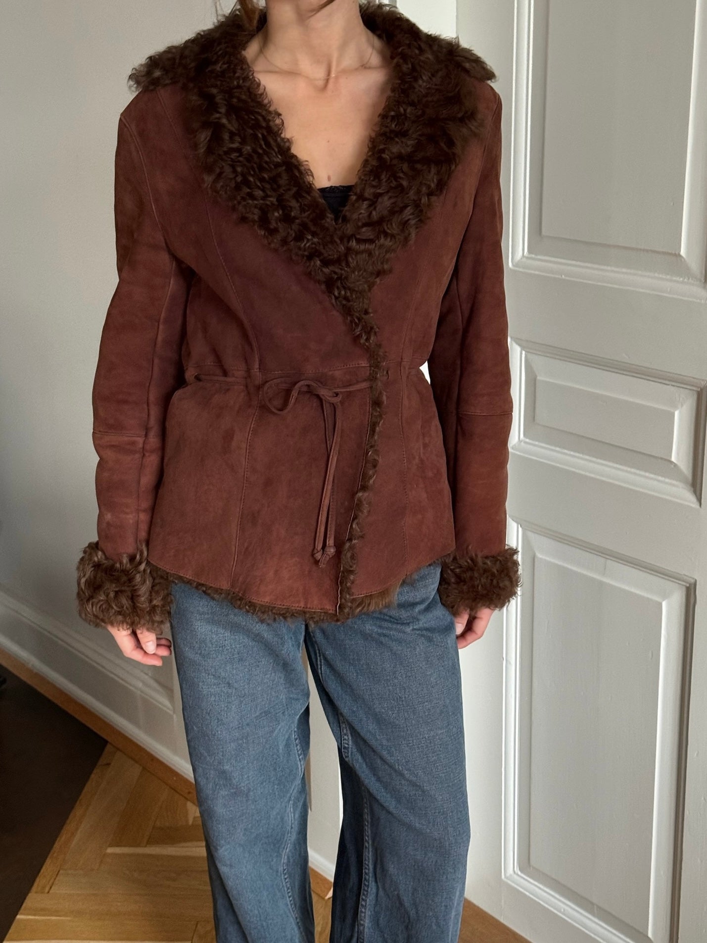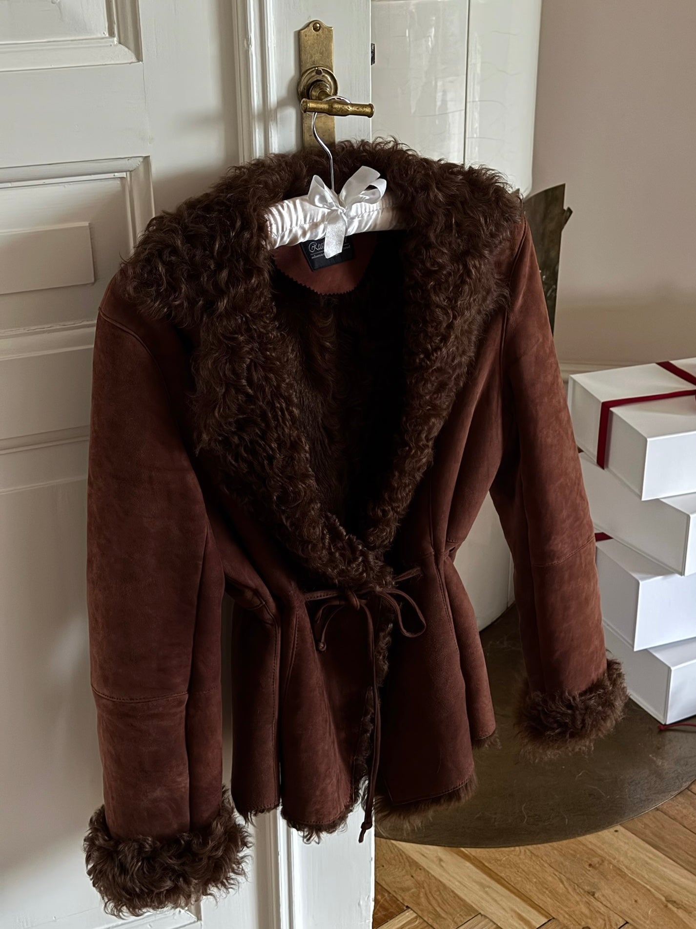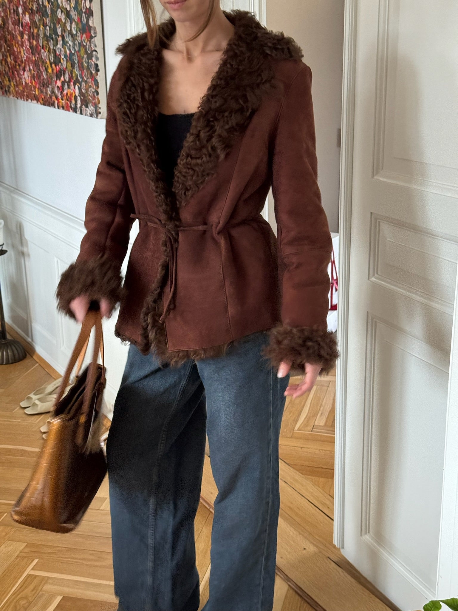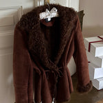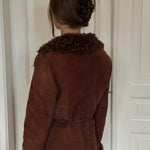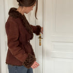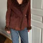 Stunning vintage brown suede jacket featuring soft fur lining, a wide fur collar, and matching fur cuffs. Designed with a fitted waist and tie closure for a flattering silhouette.