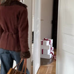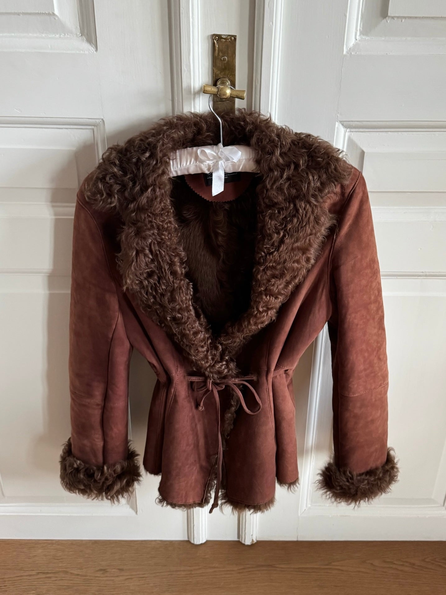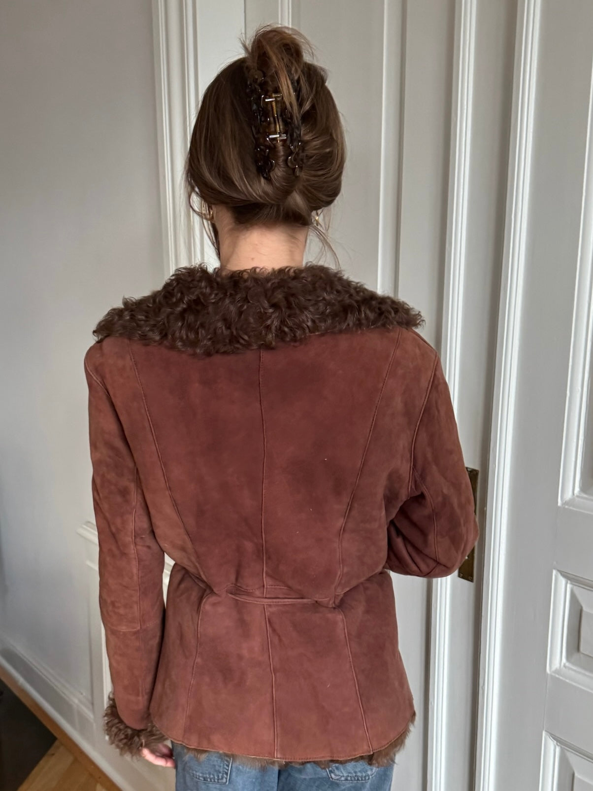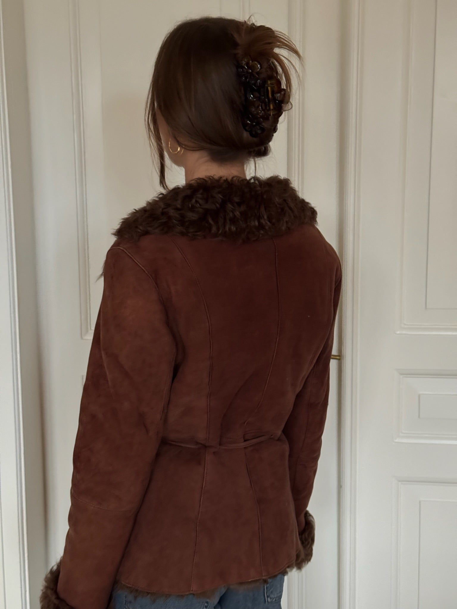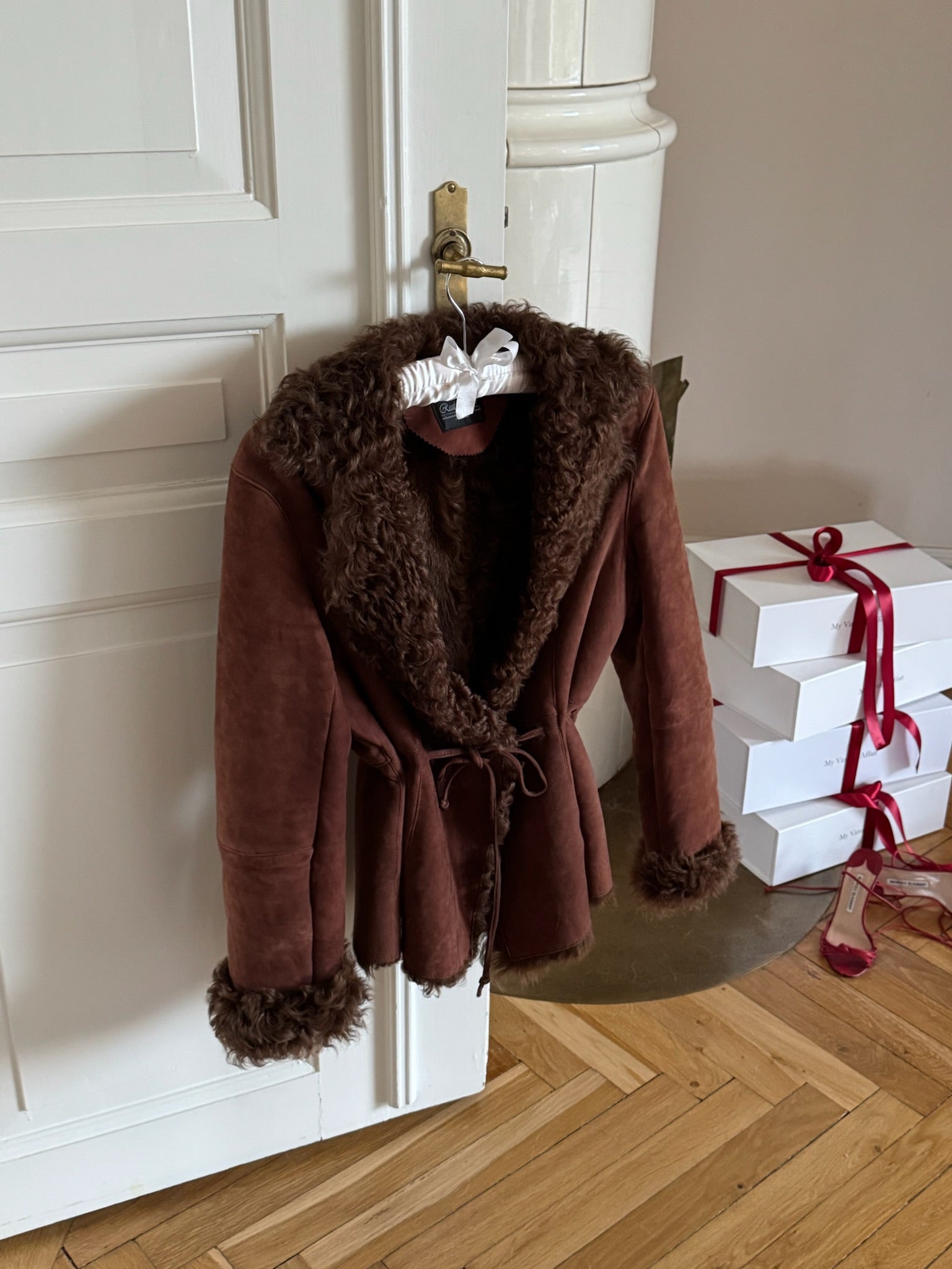 Stunning vintage brown suede jacket featuring soft fur lining, a wide fur collar, and matching fur cuffs. Designed with a fitted waist and tie closure for a flattering silhouette.