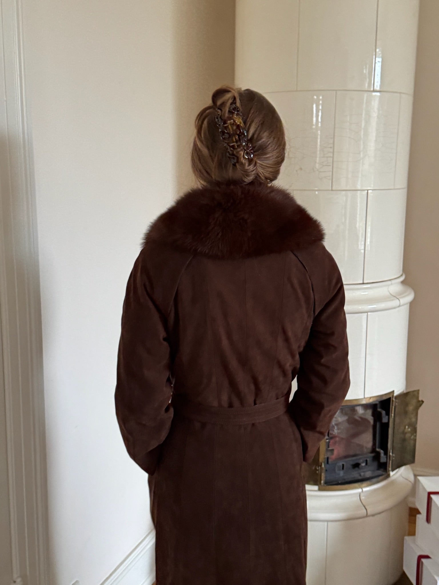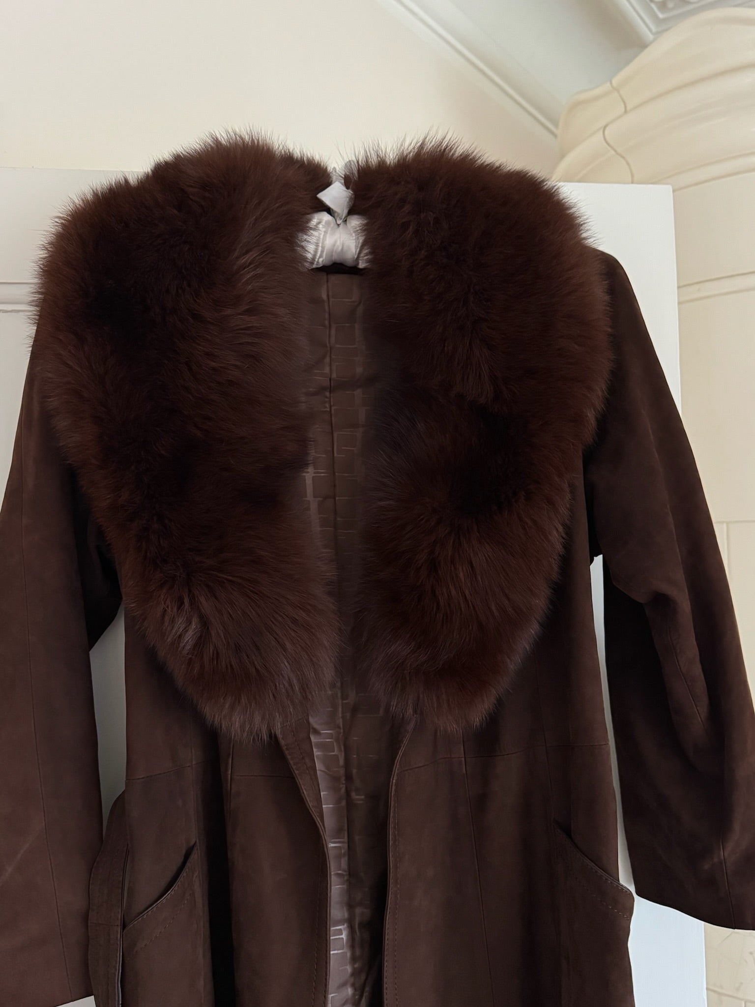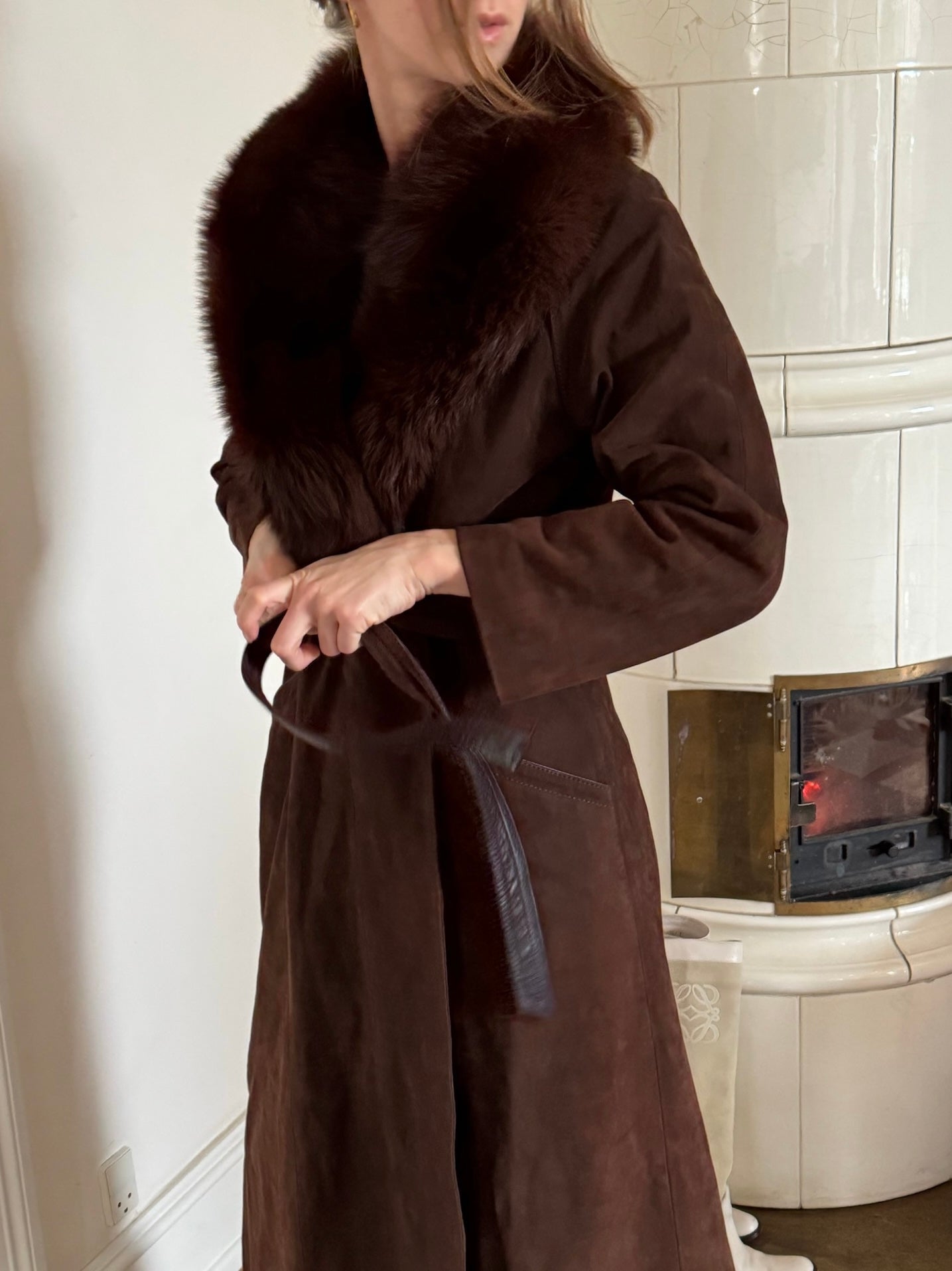 Beautiful vintage chocolate brown suede coat with a wide fur collar. It has a tie belt at the waist and a long, clean silhouette. The inside has a satin lining.