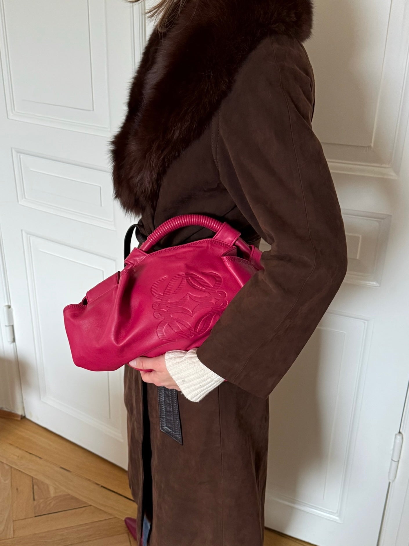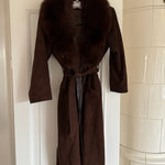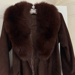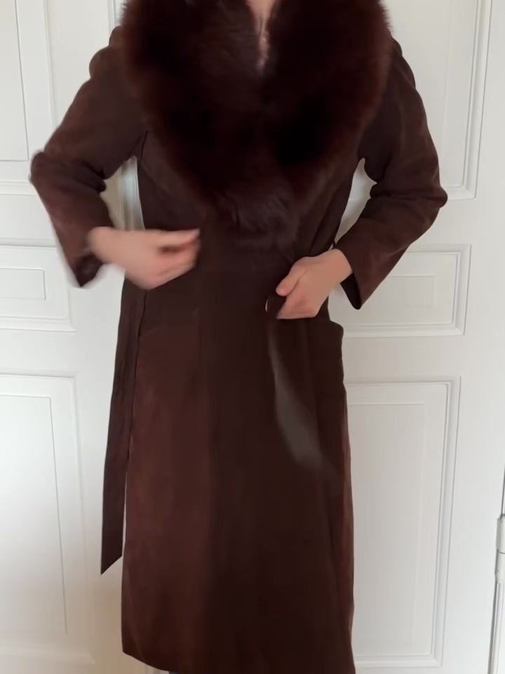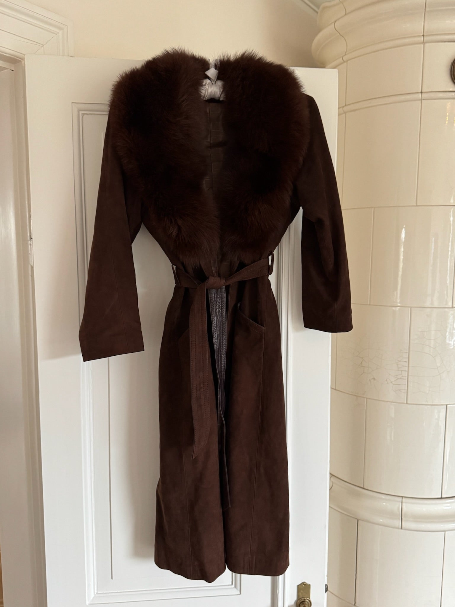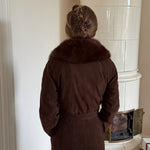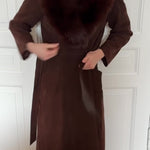 Beautiful vintage chocolate brown suede coat with a wide fur collar. It has a tie belt at the waist and a long, clean silhouette. The inside has a satin lining.