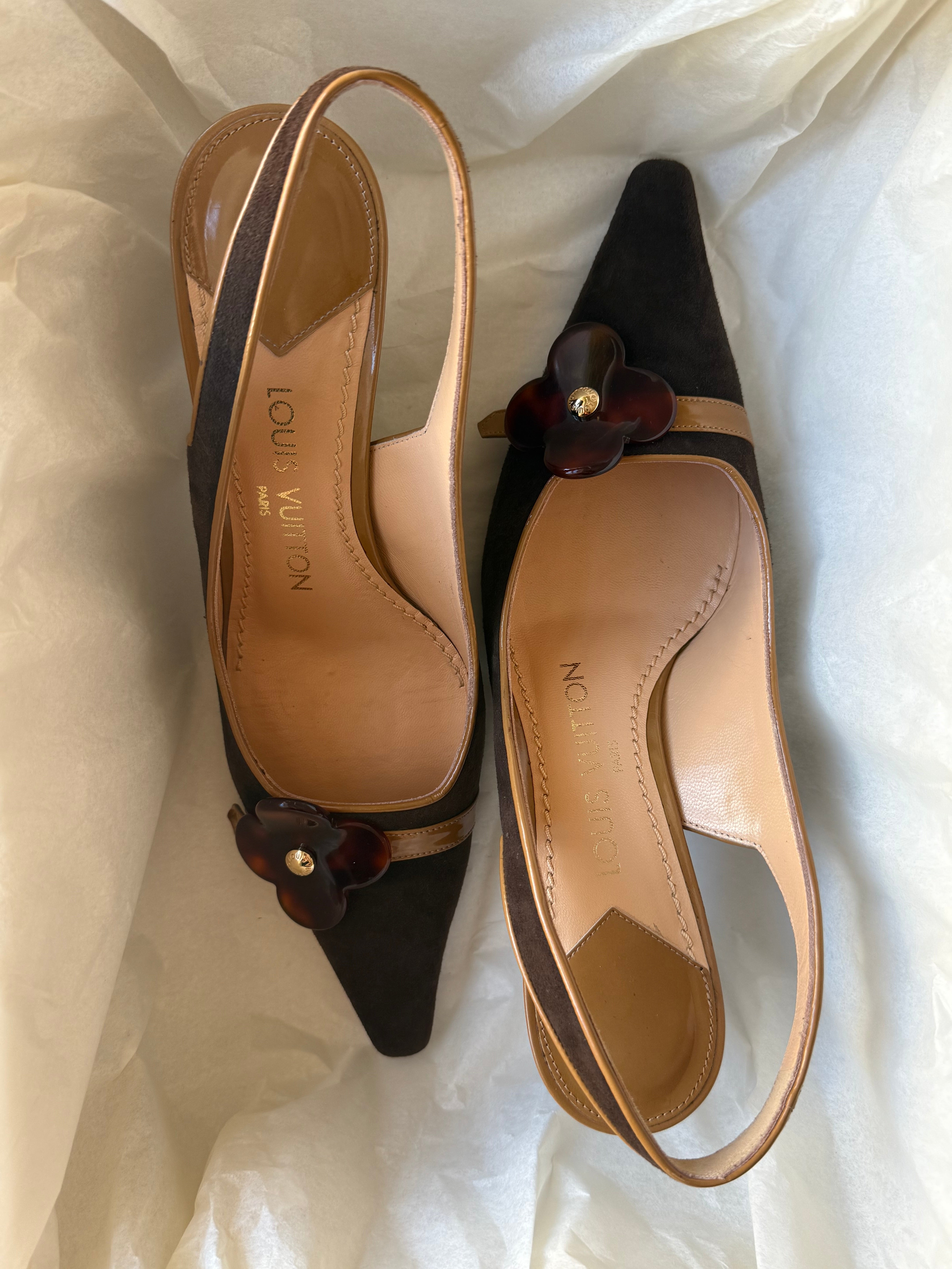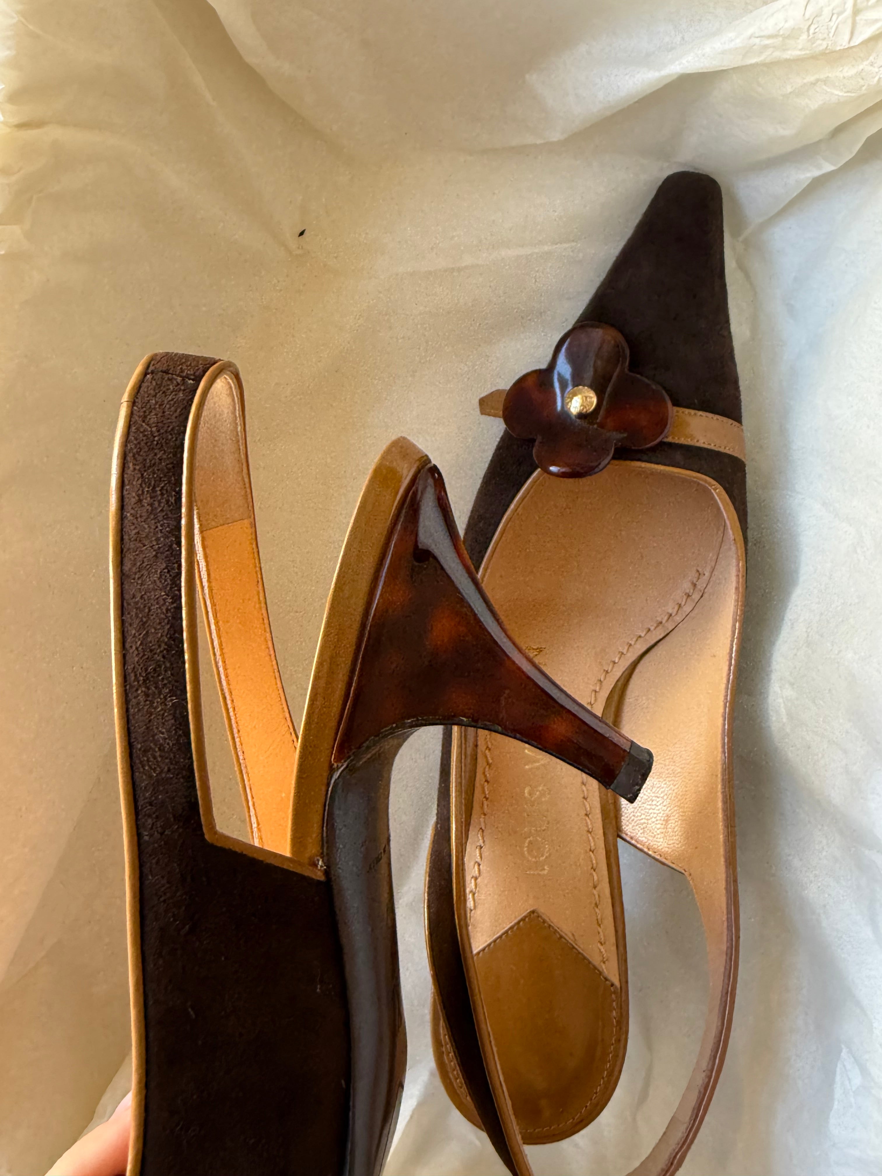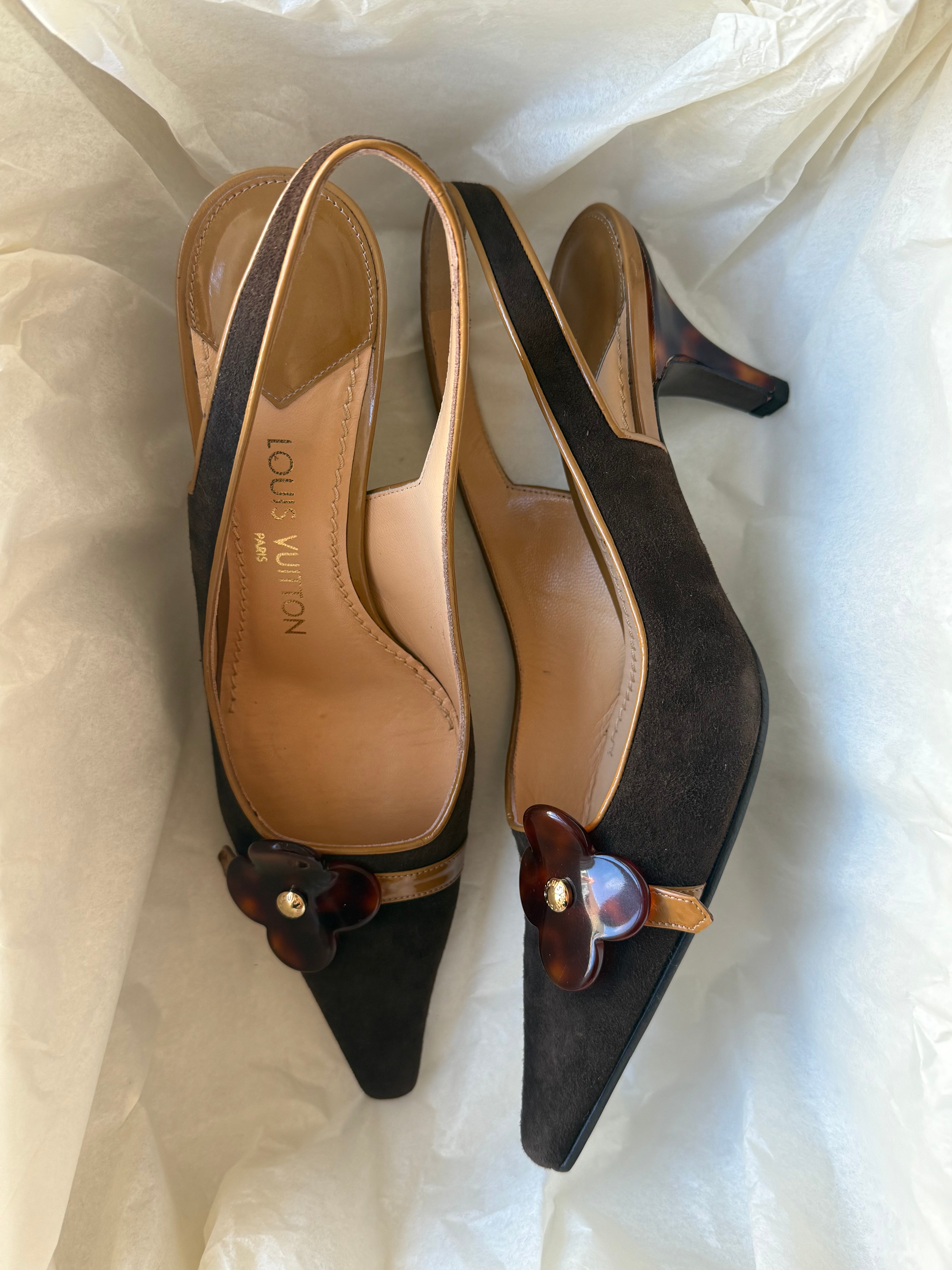 Vintage Louis Vuitton Brown suede slingbacks witch flower detail on the front. The slingbacks feature a glossy tortoiseshell-patterned heel. They come with all original packaging.