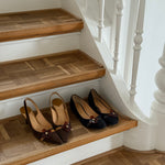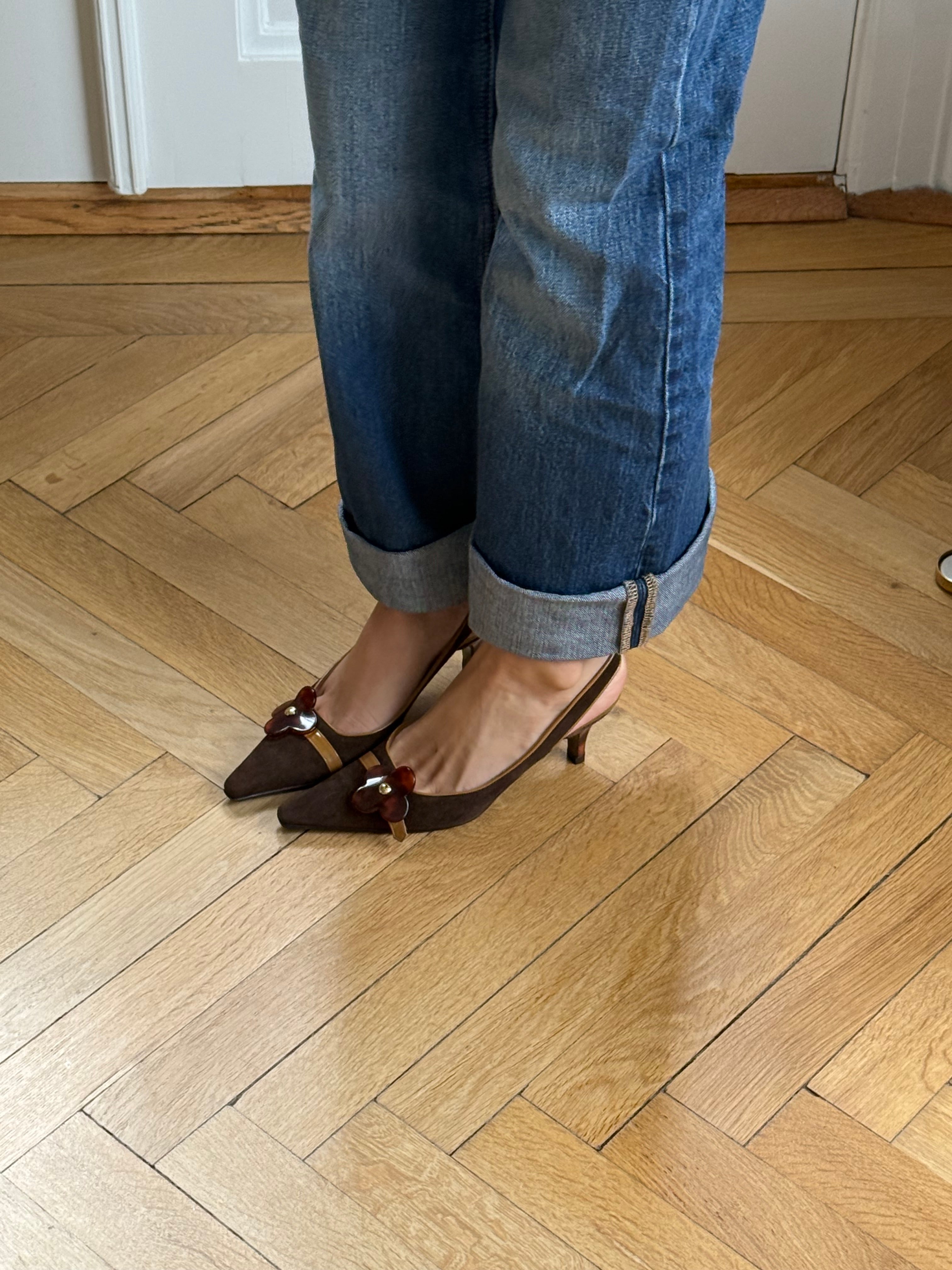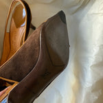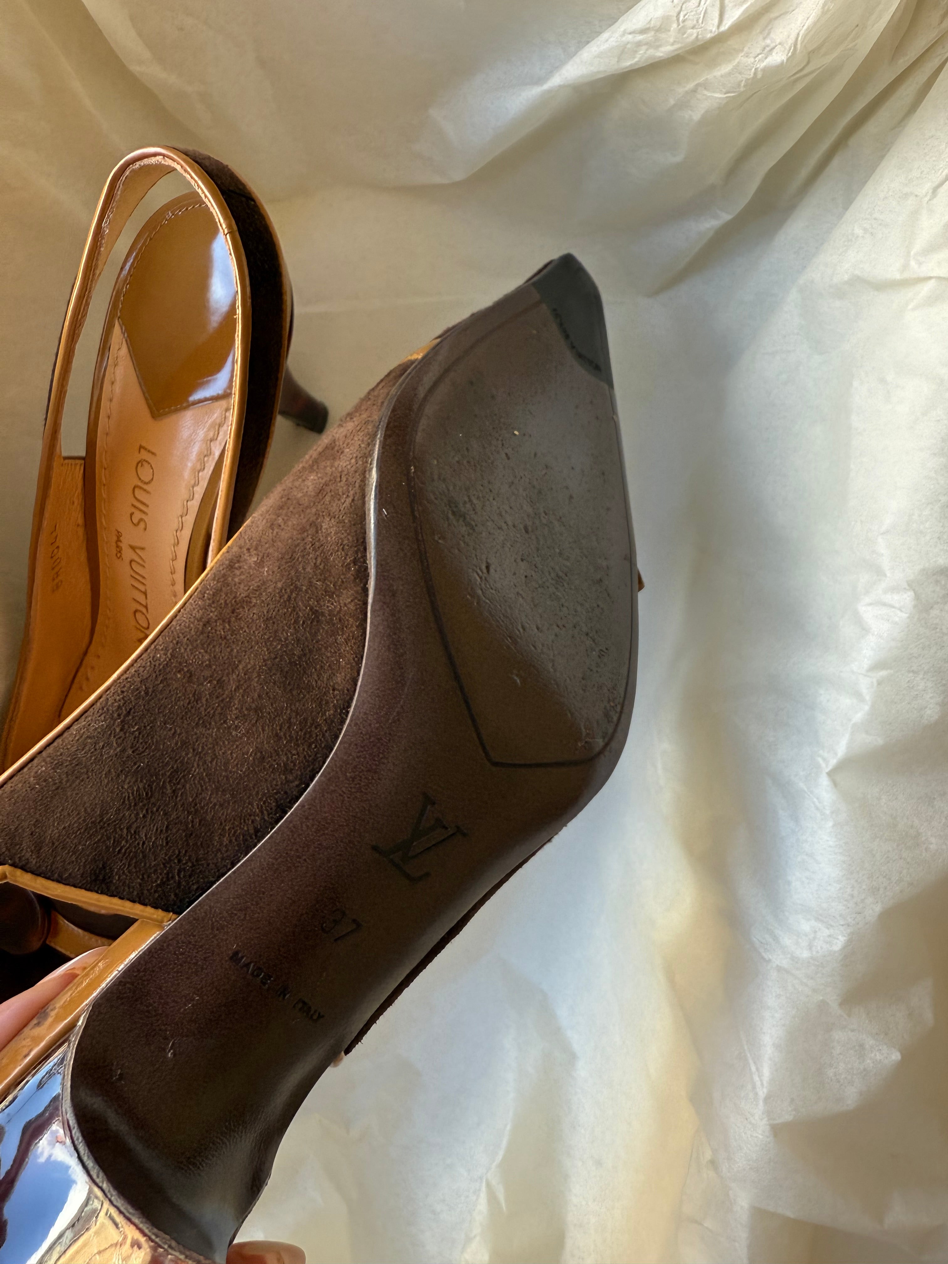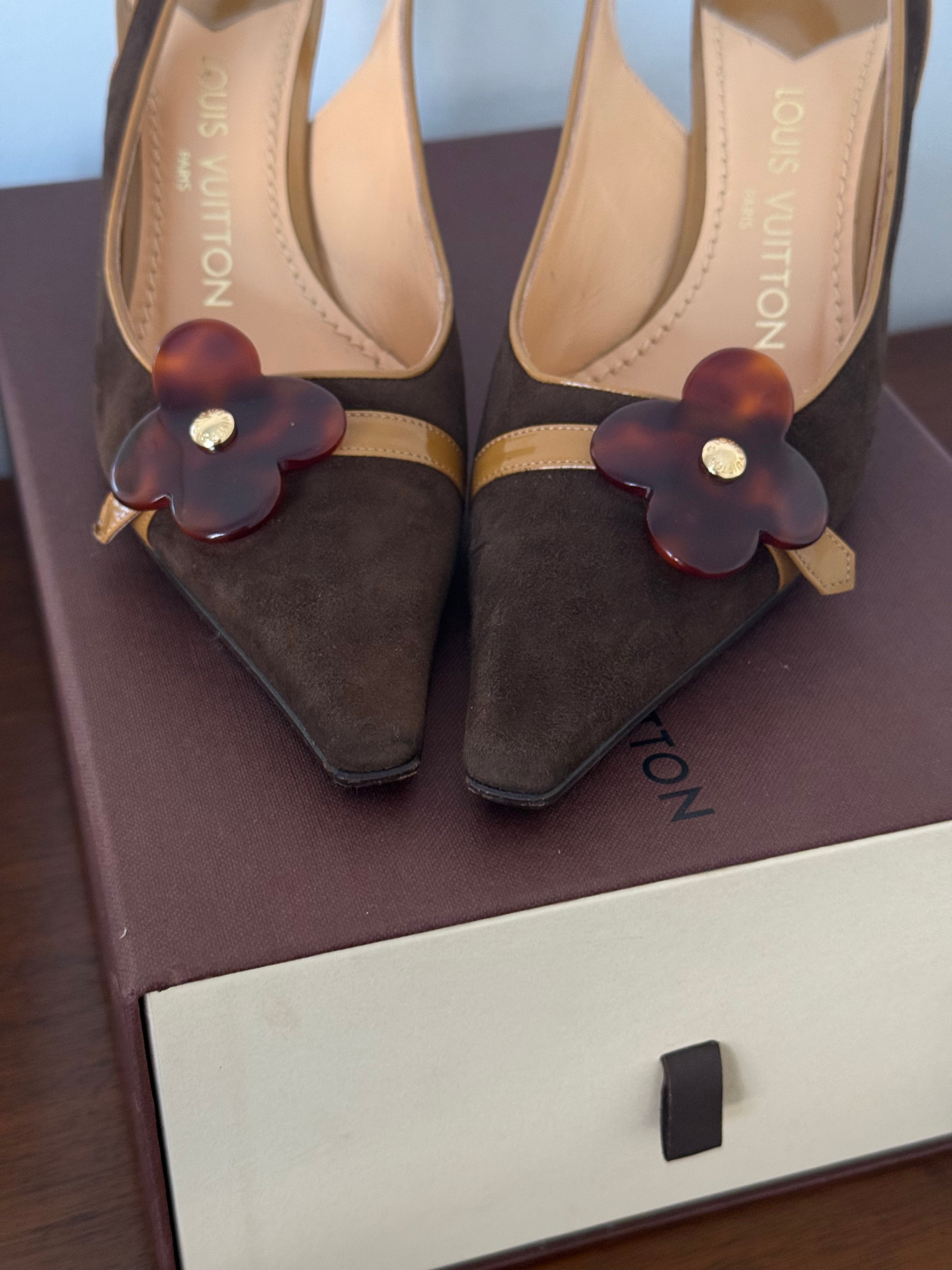 Vintage Louis Vuitton Brown suede slingbacks witch flower detail on the front. The slingbacks feature a glossy tortoiseshell-patterned heel. They come with all original packaging.