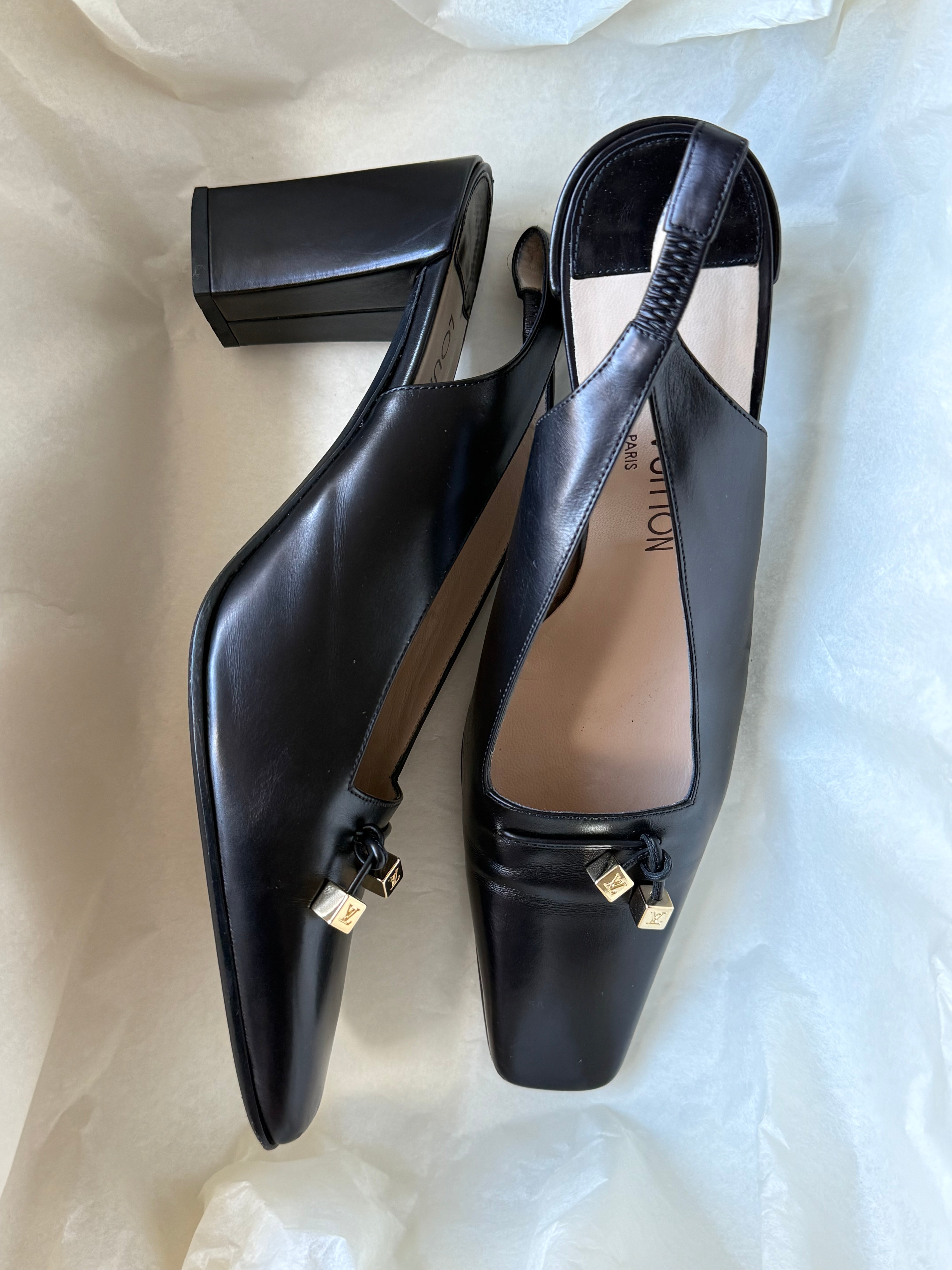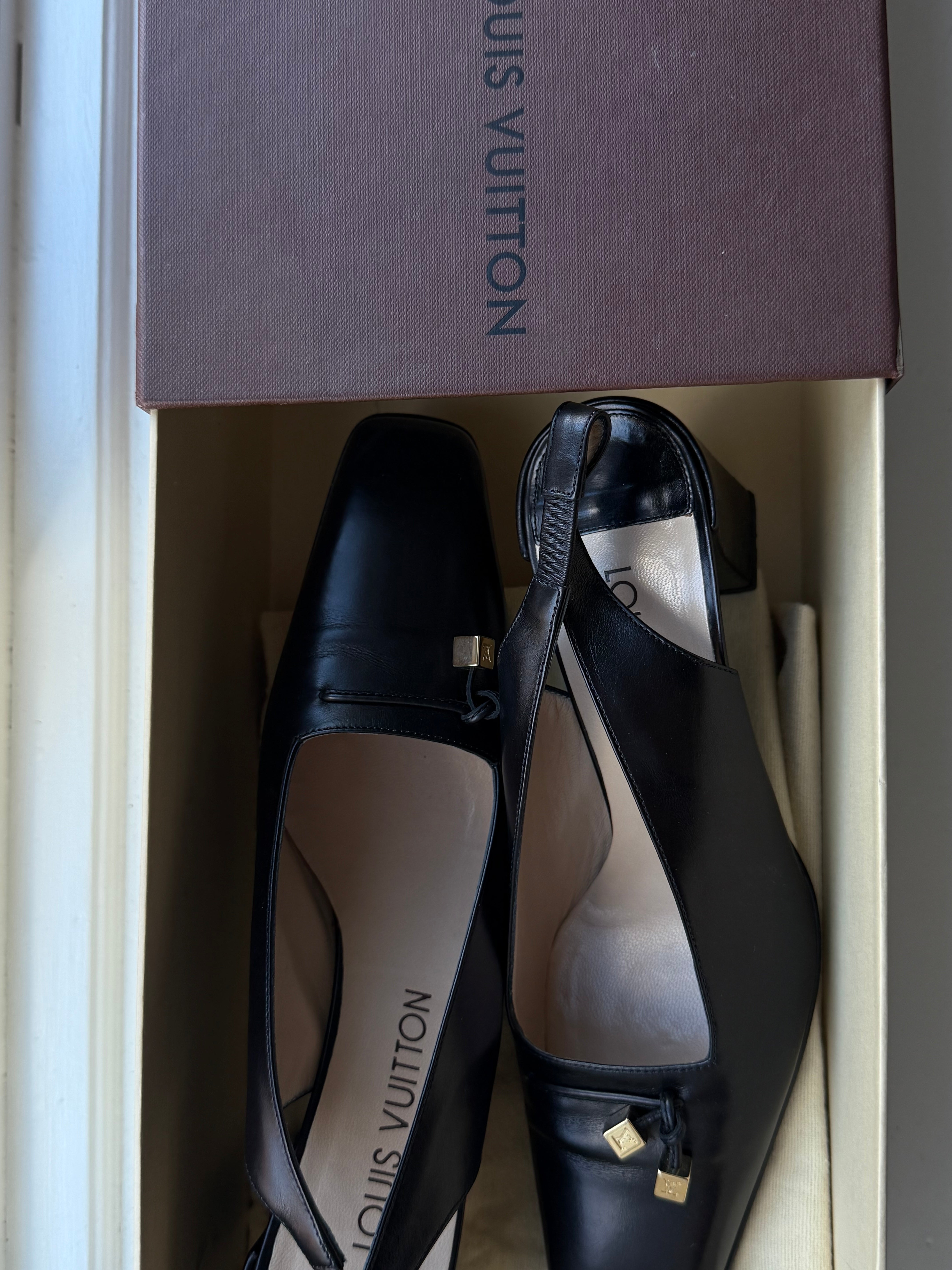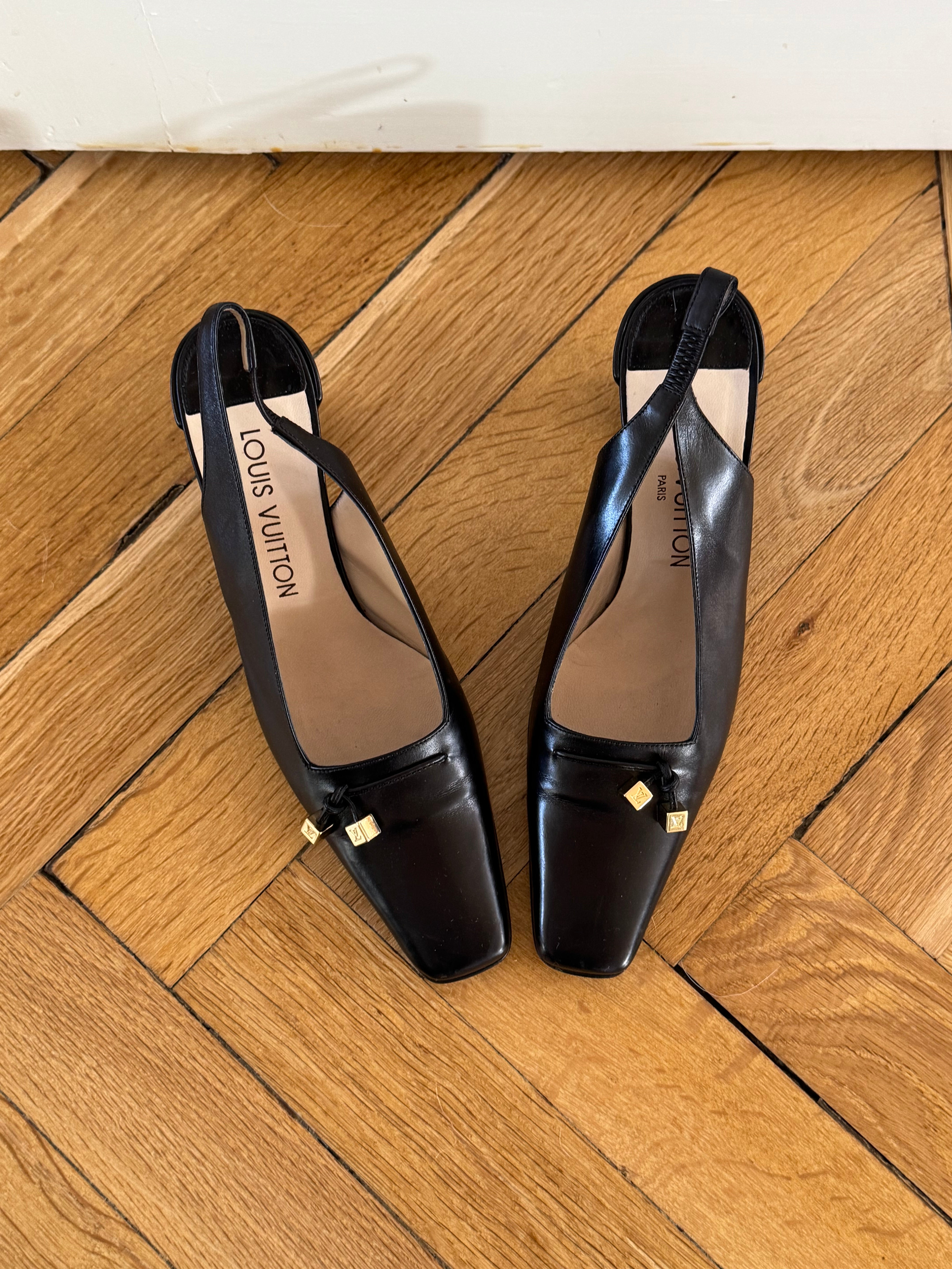 Vintage Louis Vuitton slingbacks heels in black leather with gold LV cubes.