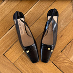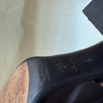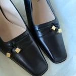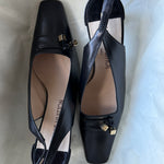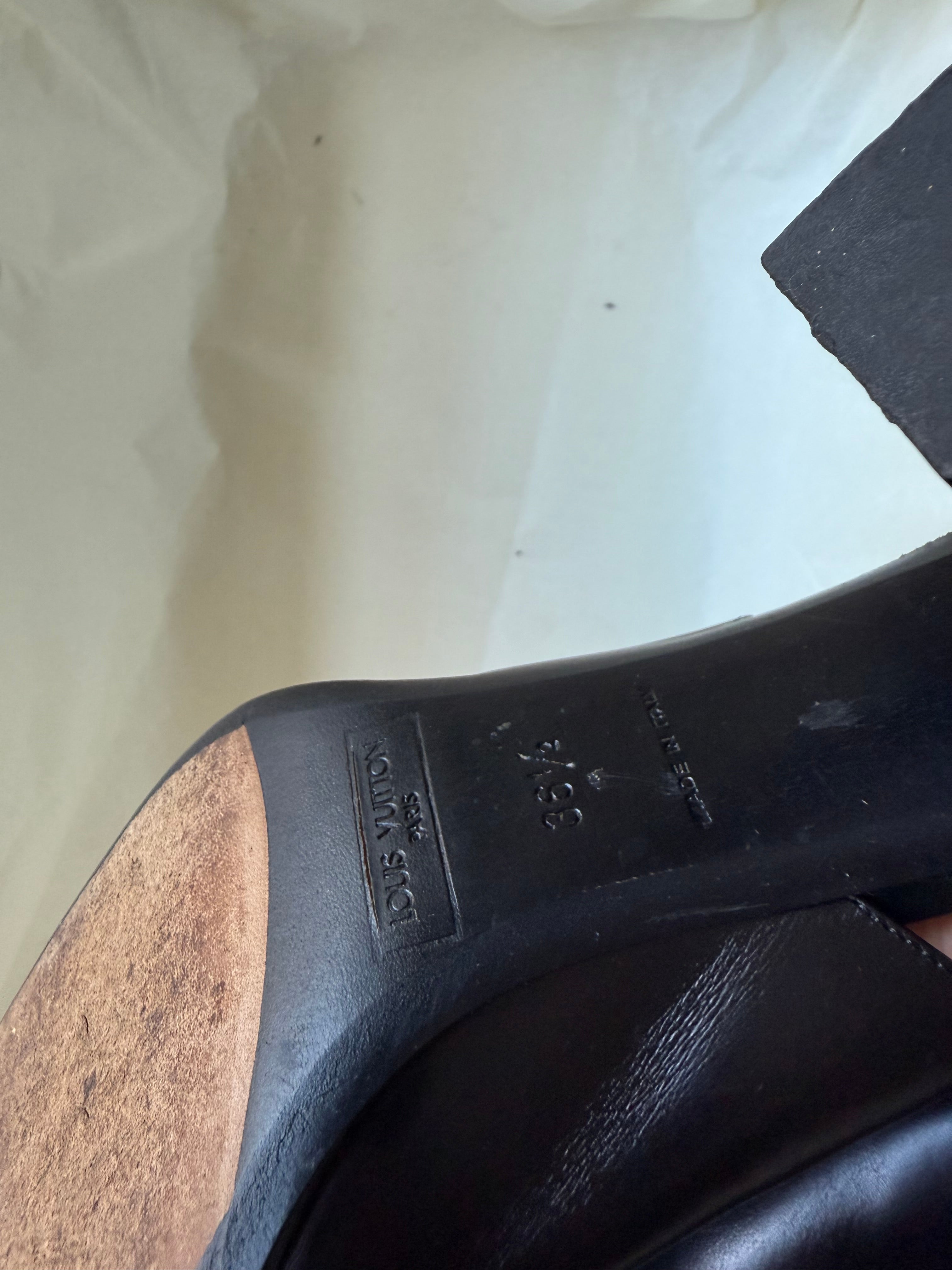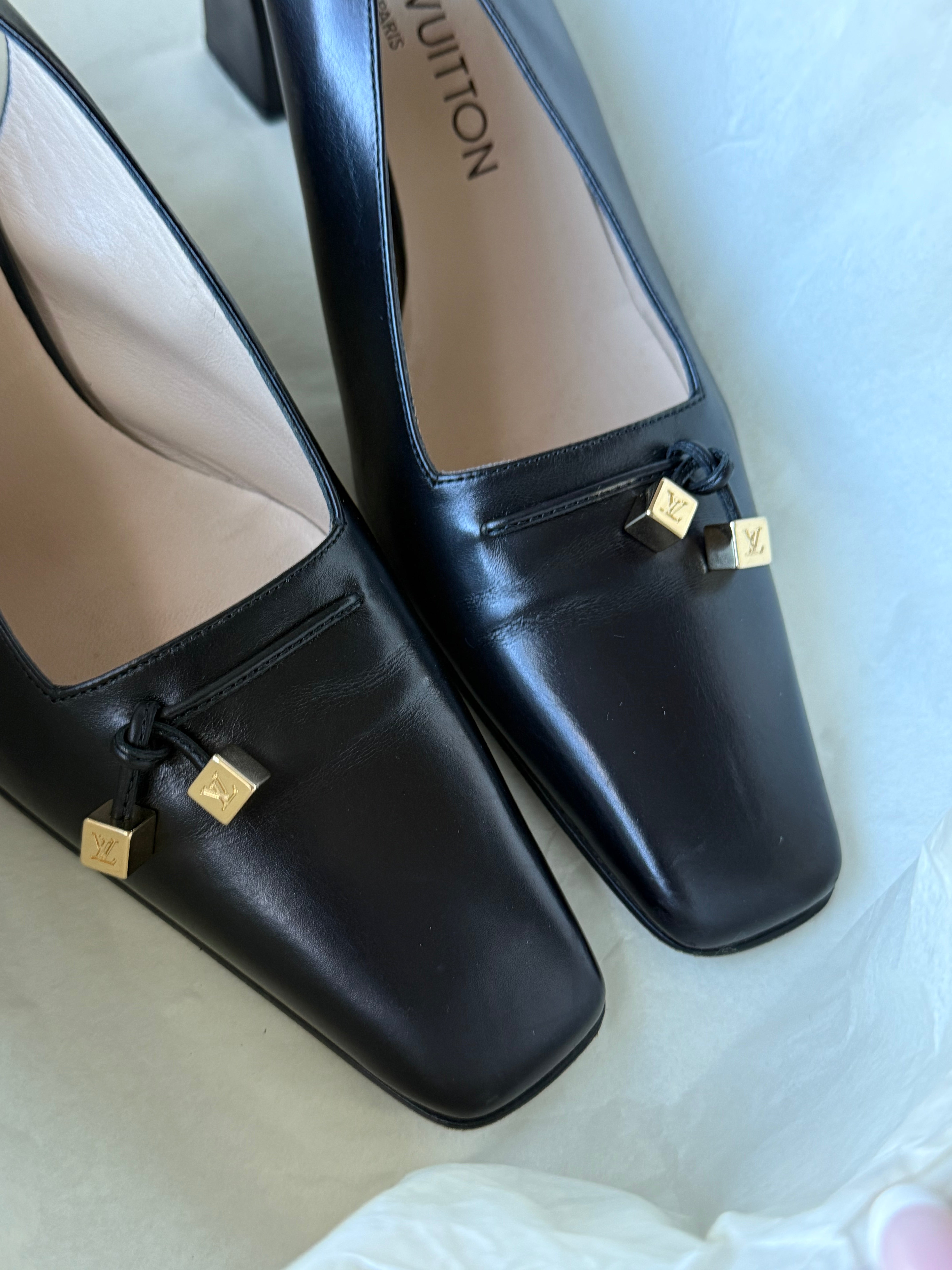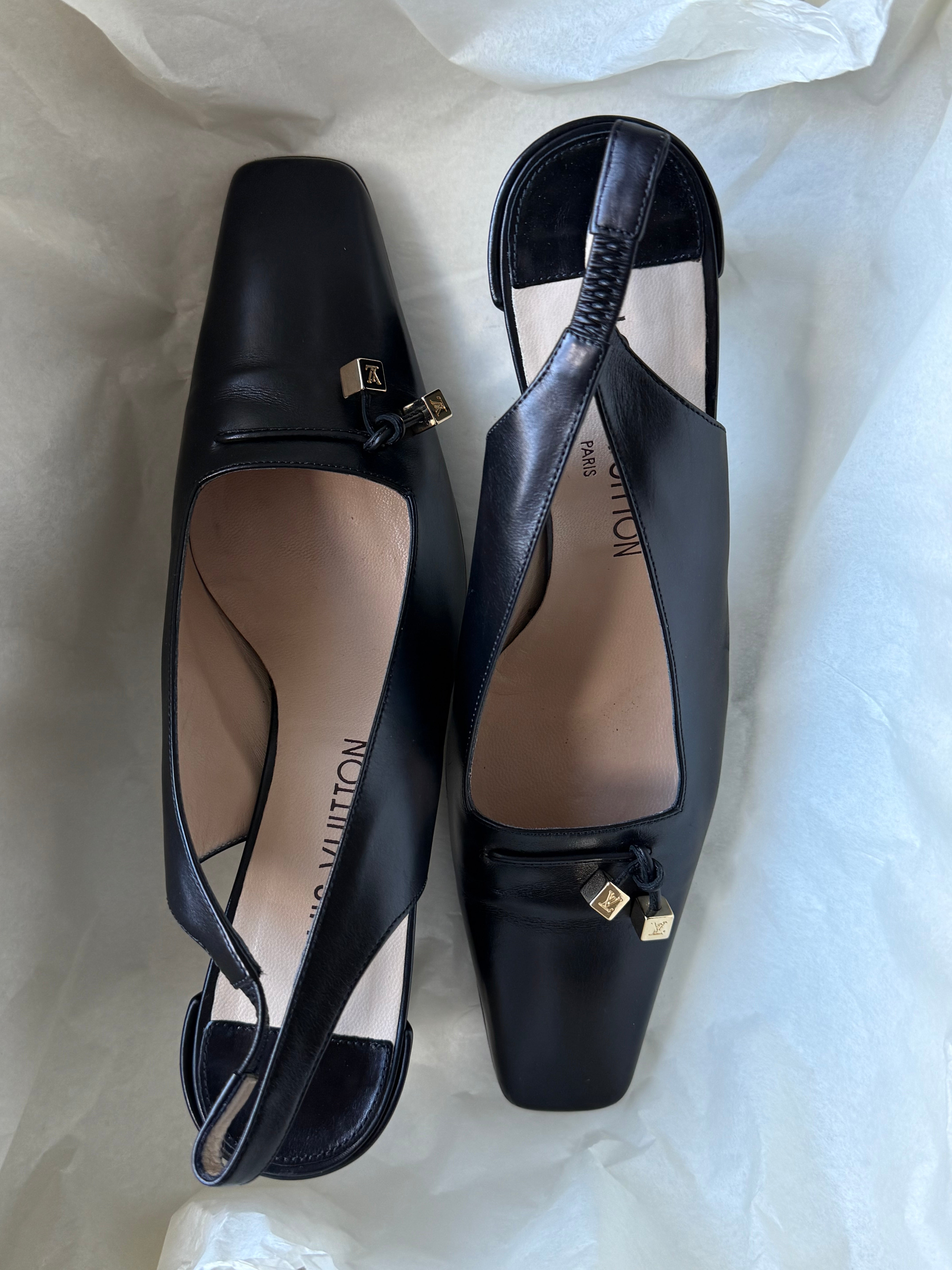 Vintage Louis Vuitton slingbacks heels in black leather with gold LV cubes.