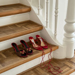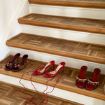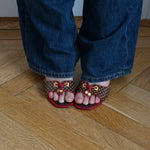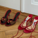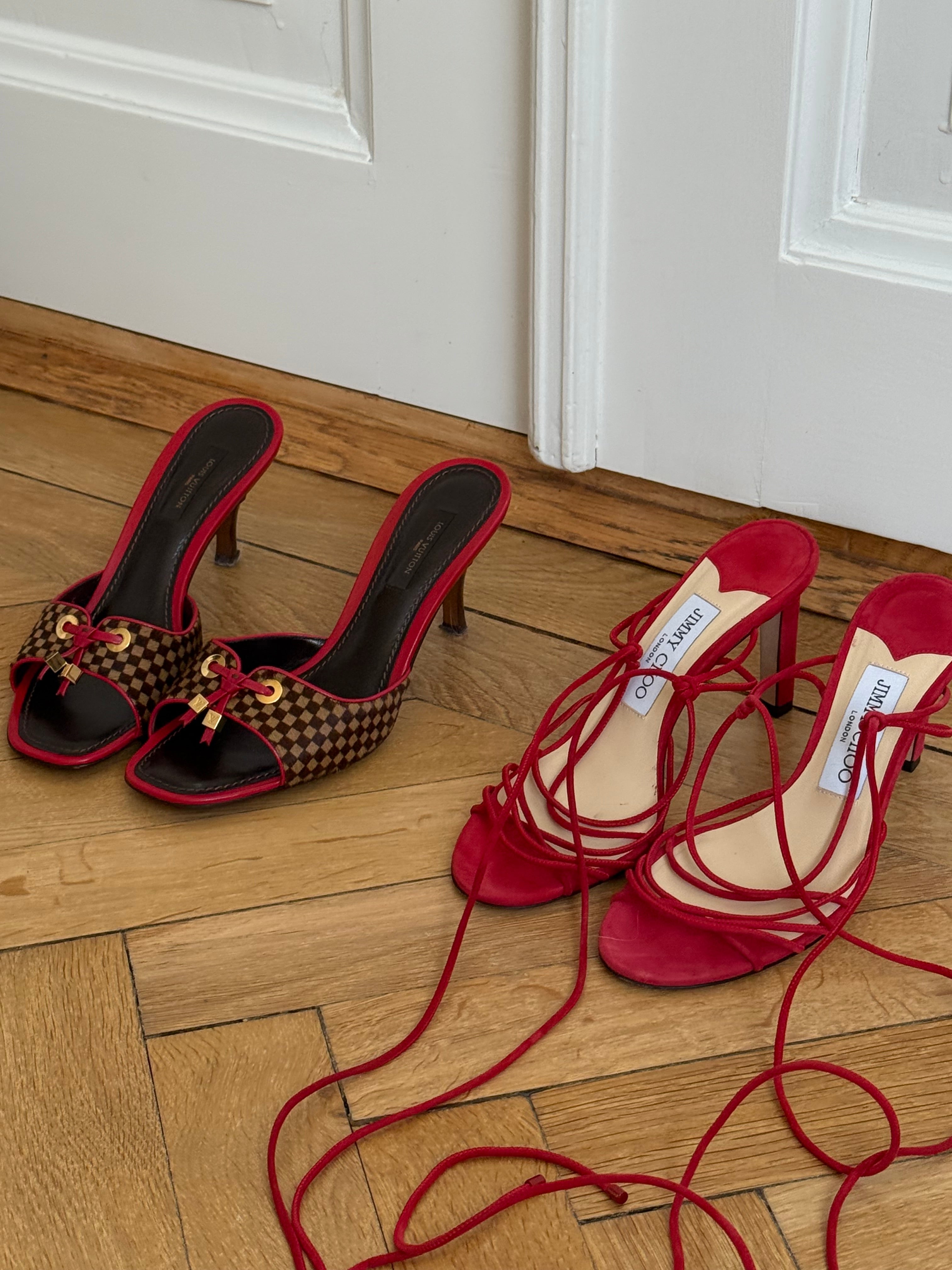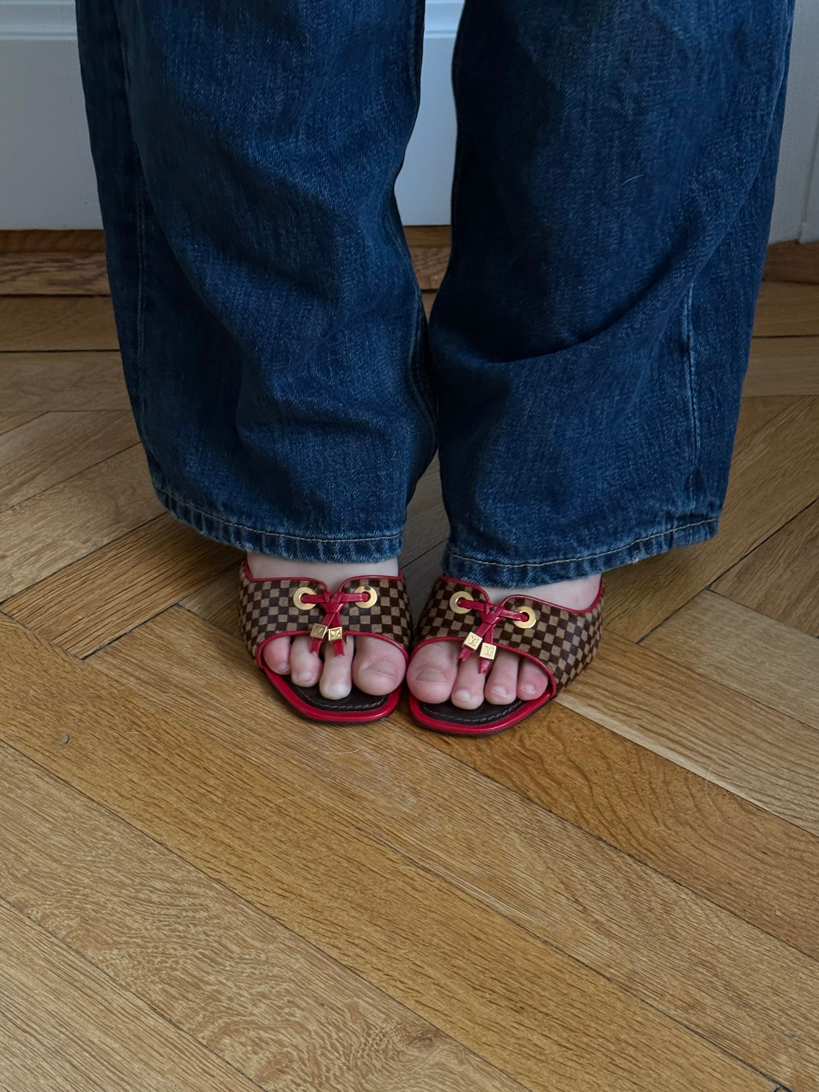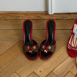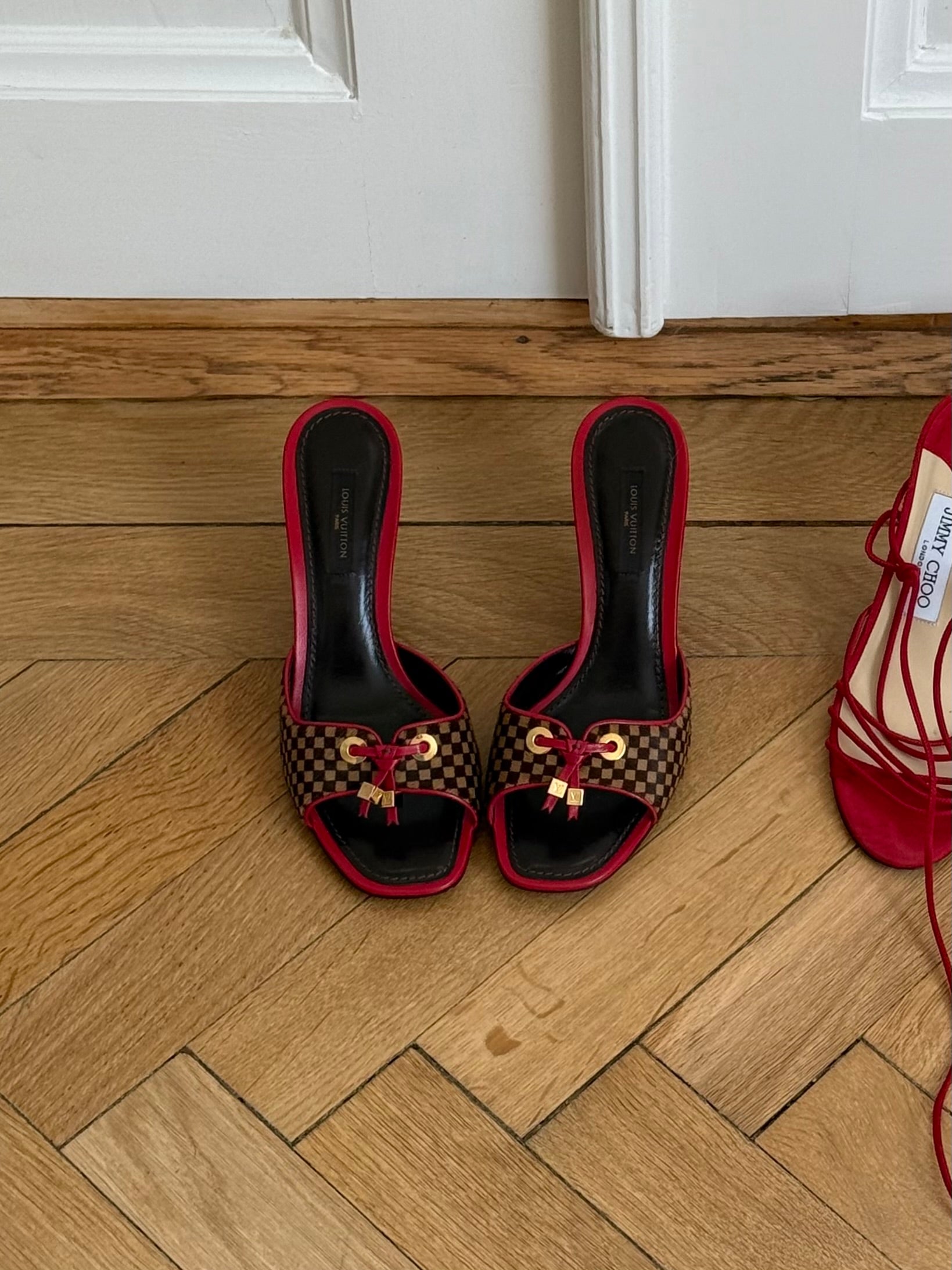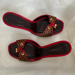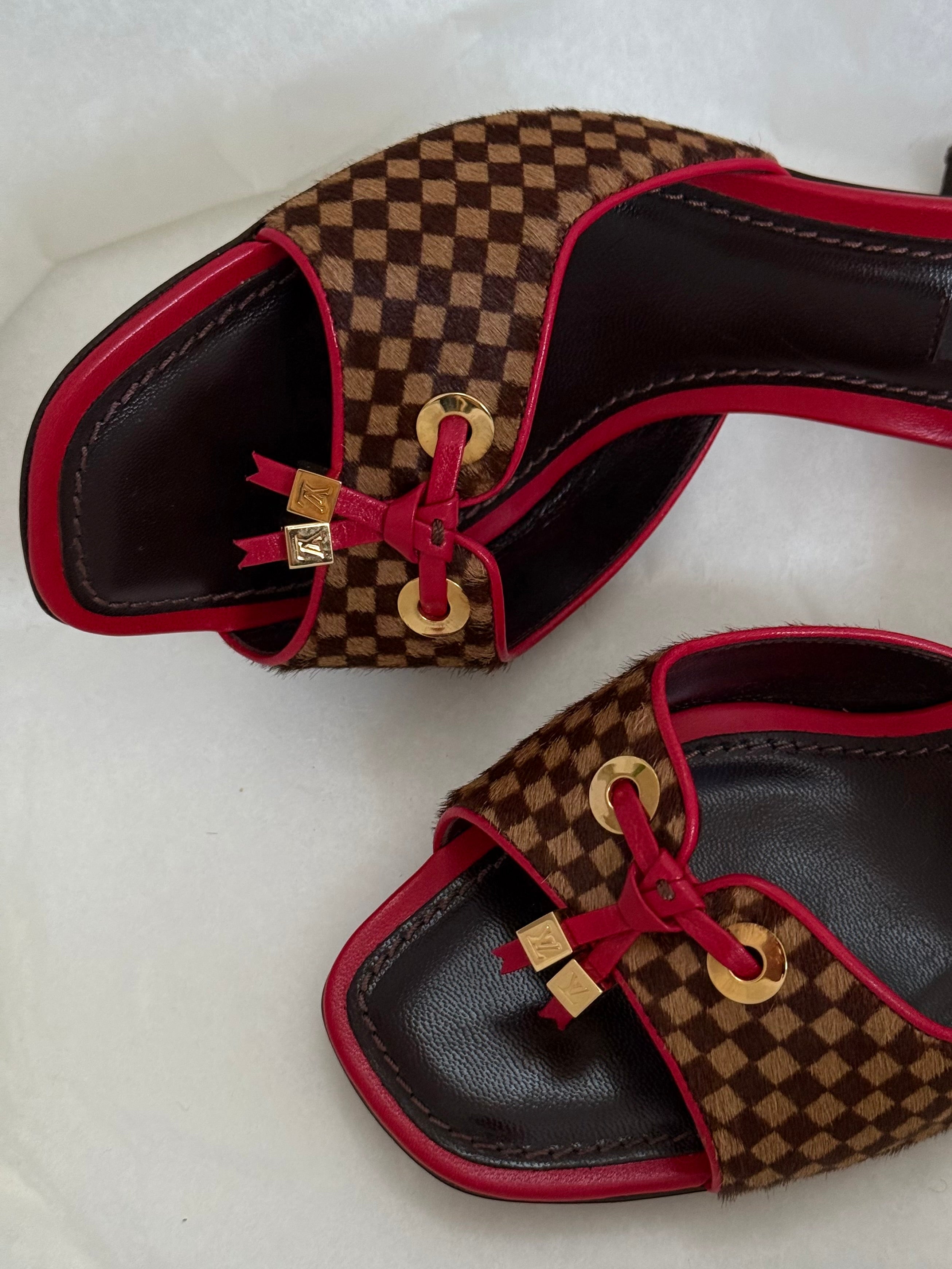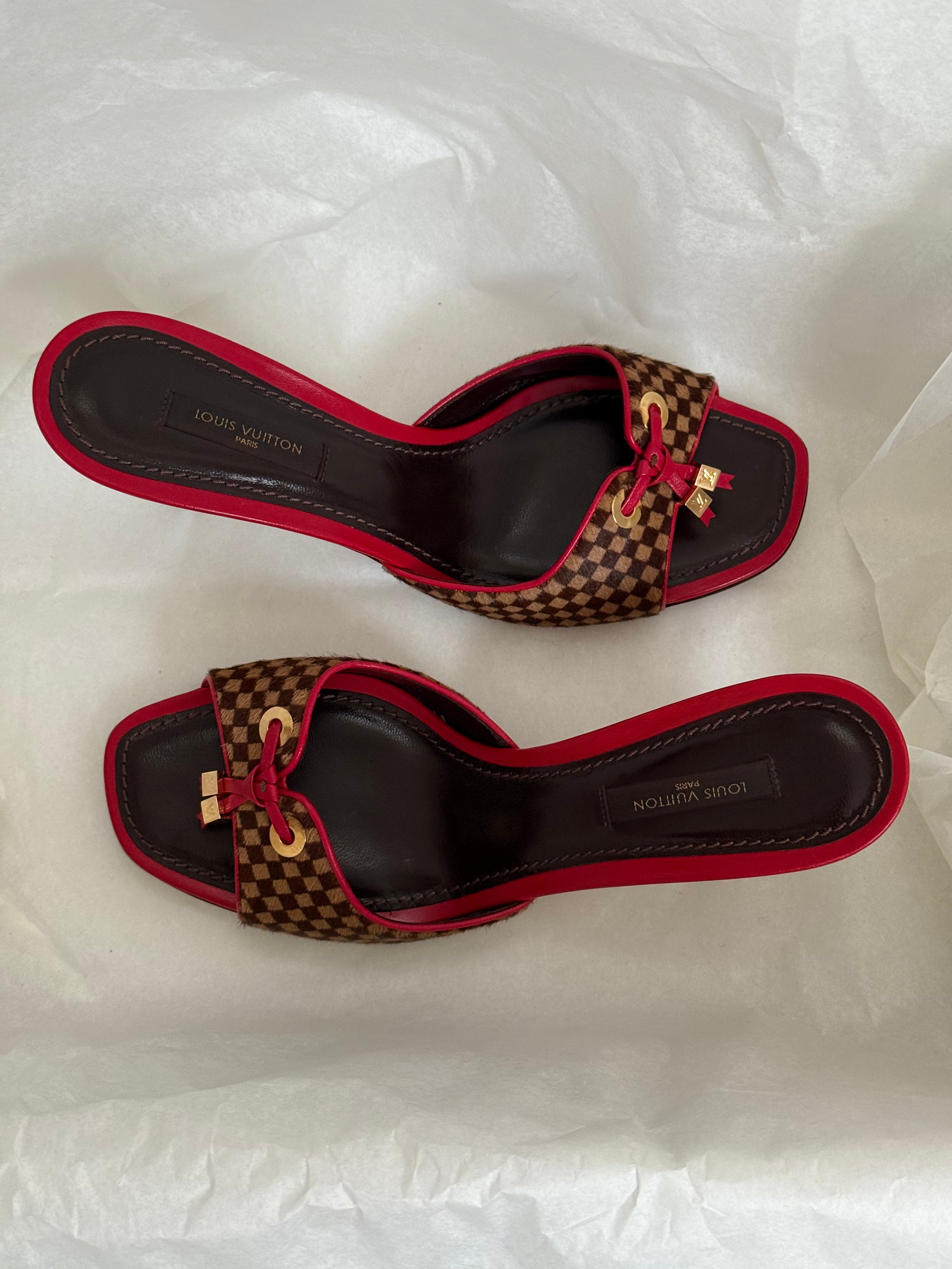 Vintage Louis Vuitton mules featuring iconic Damier canvas in ponyhair, red leather trim, and gold-tone hardware detailing. They come with the original shoe box and dustbags.