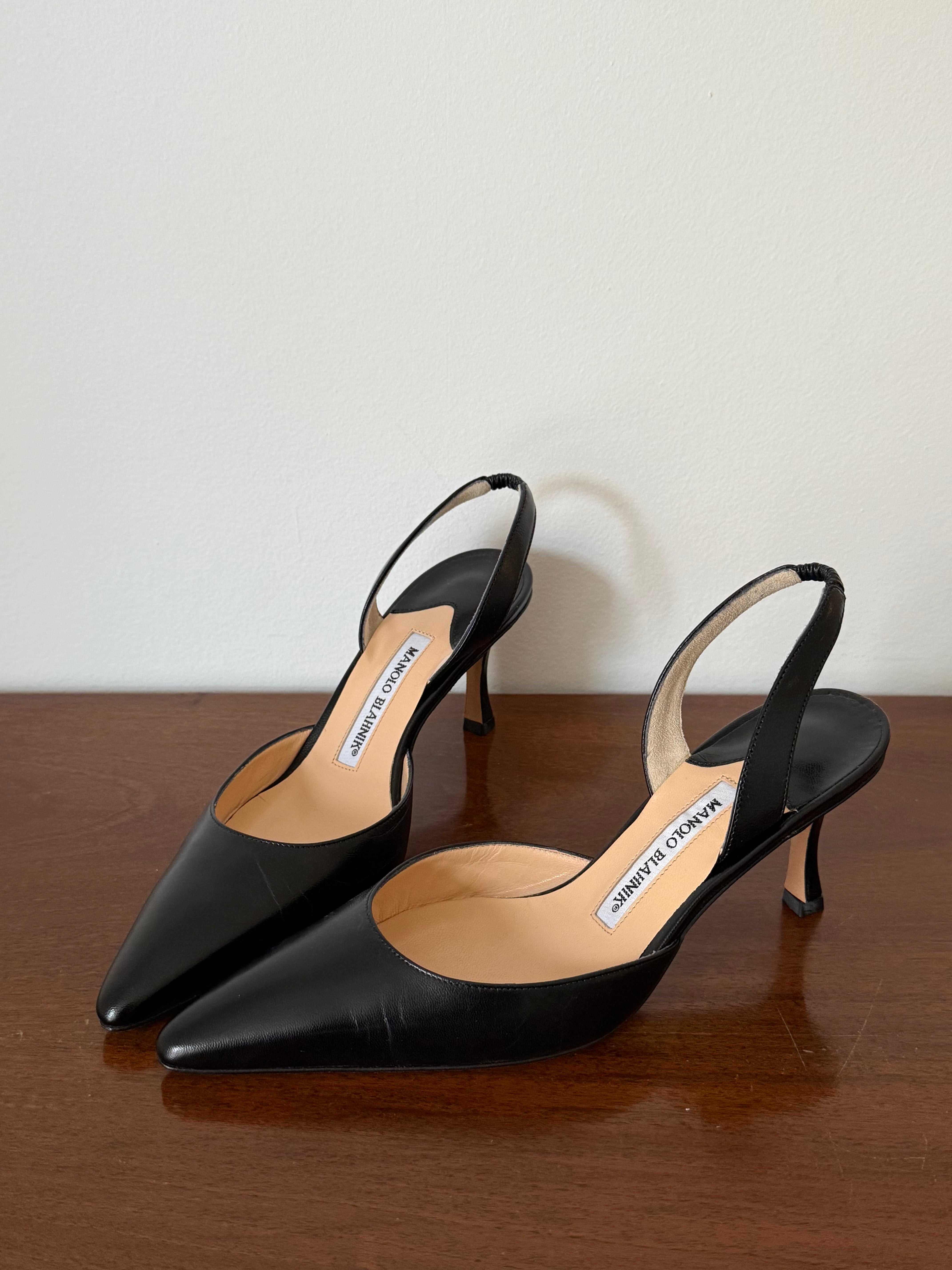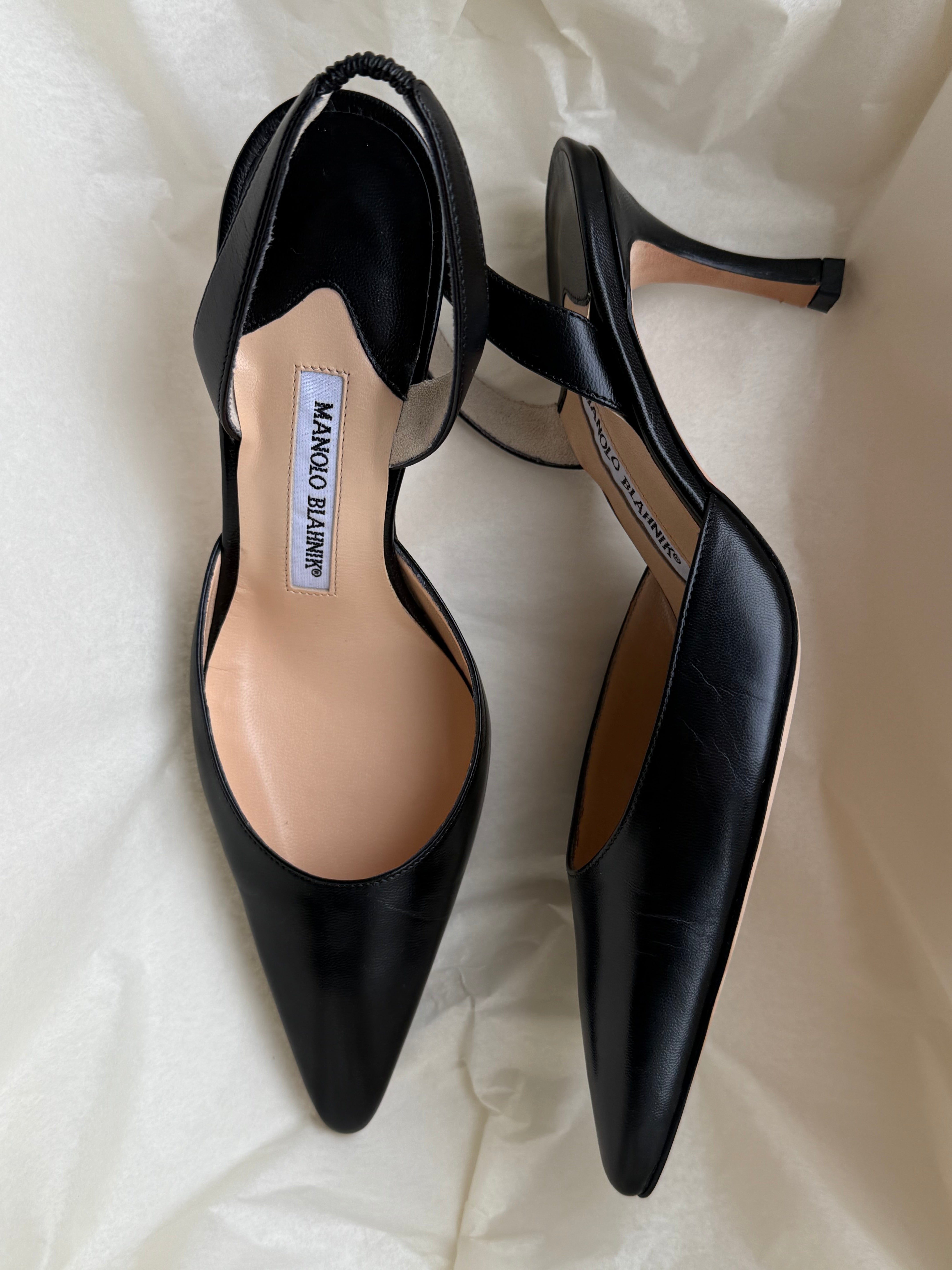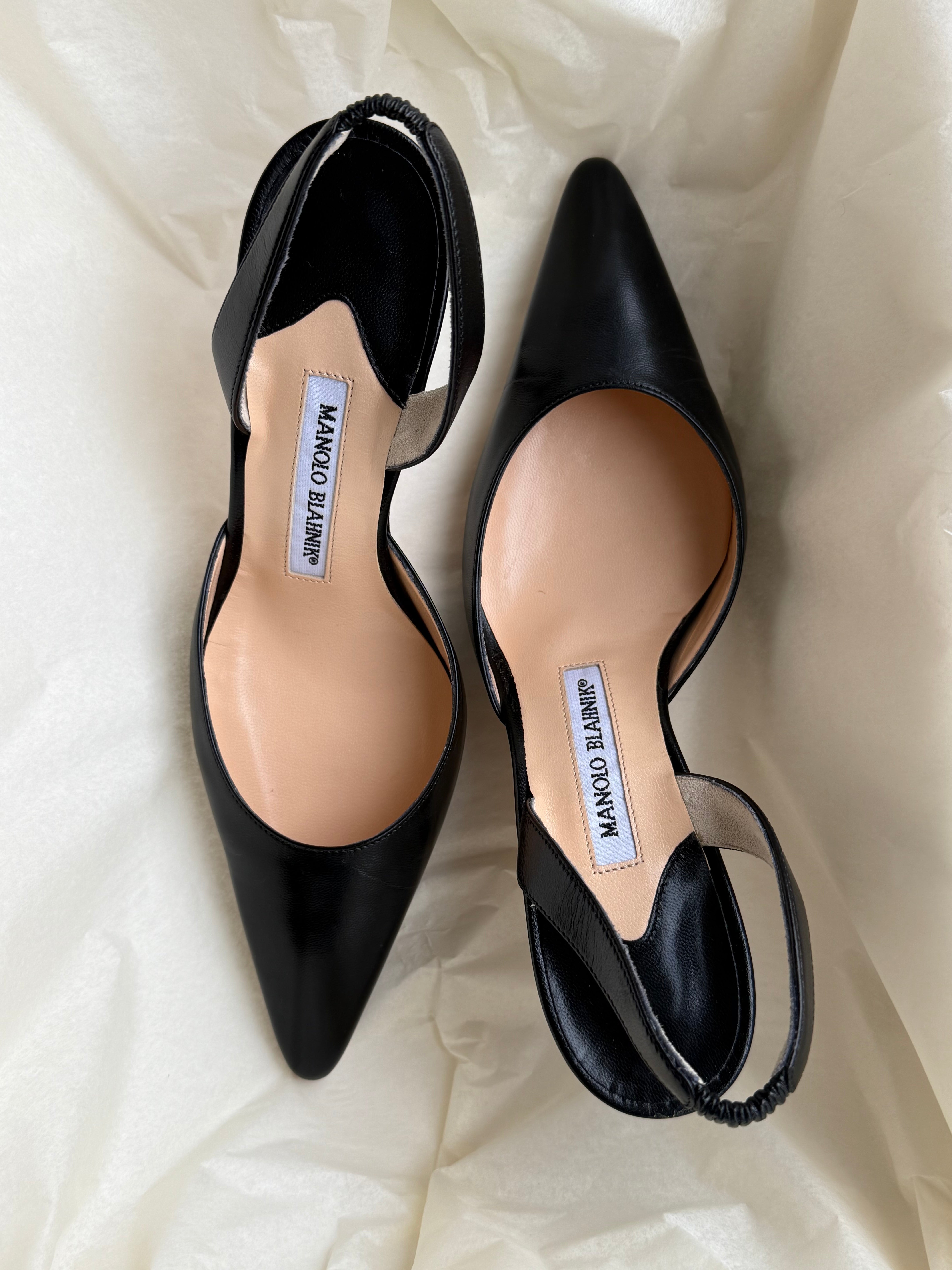 Iconic Manolo Blahnik ‘Carolyne’ pointed toe slingbacks in black leather. Comes with original box & dustbag.