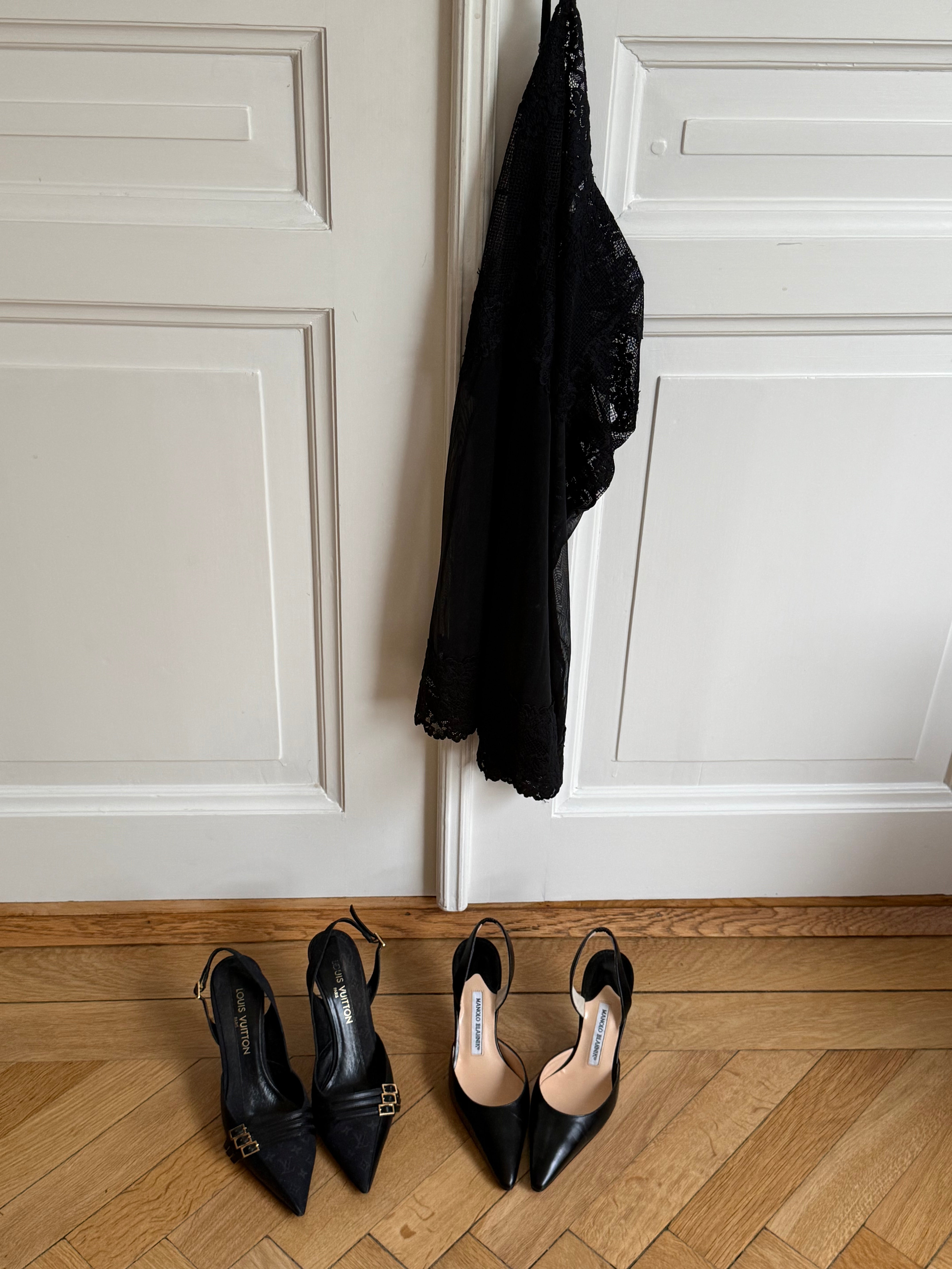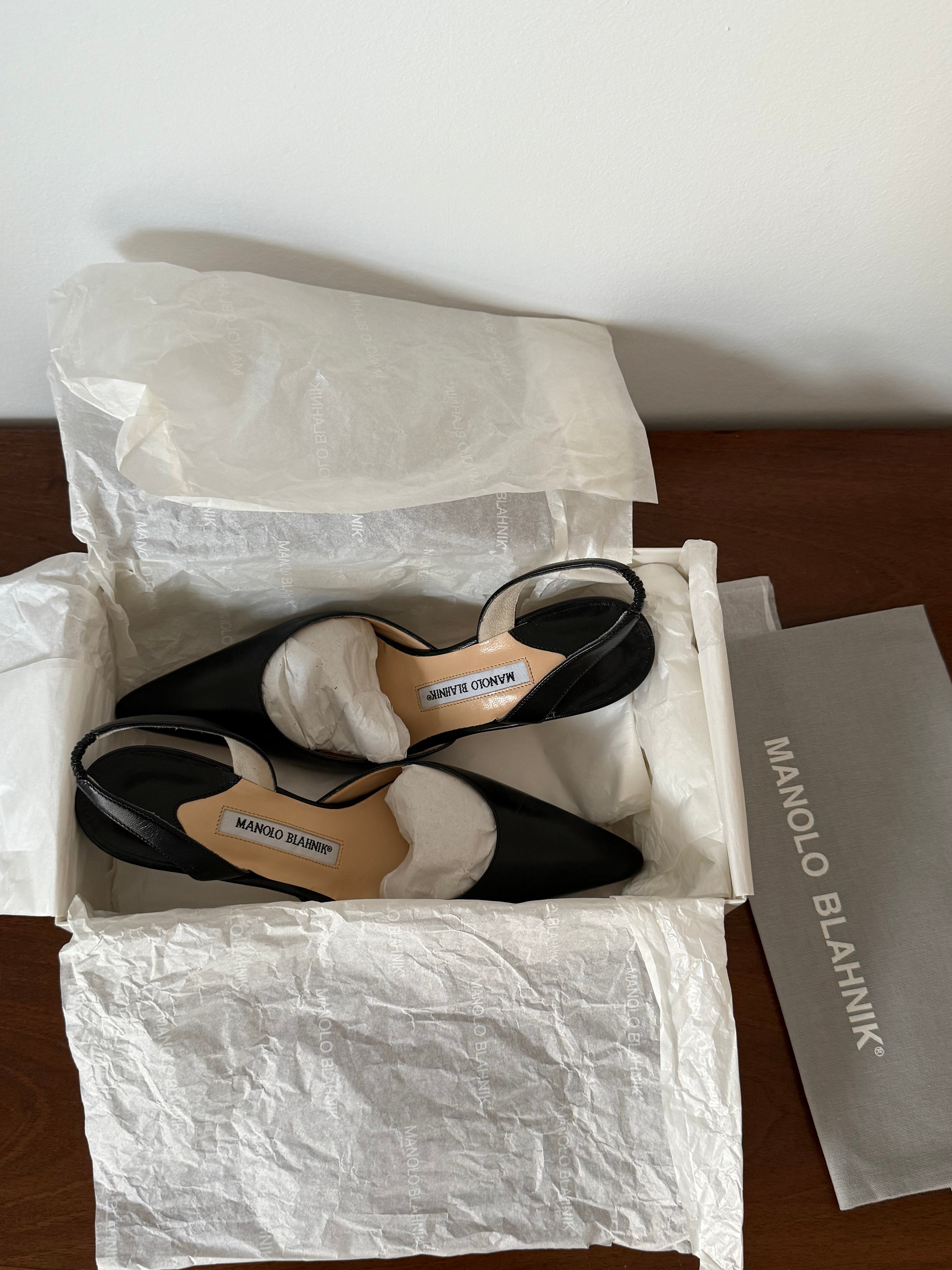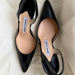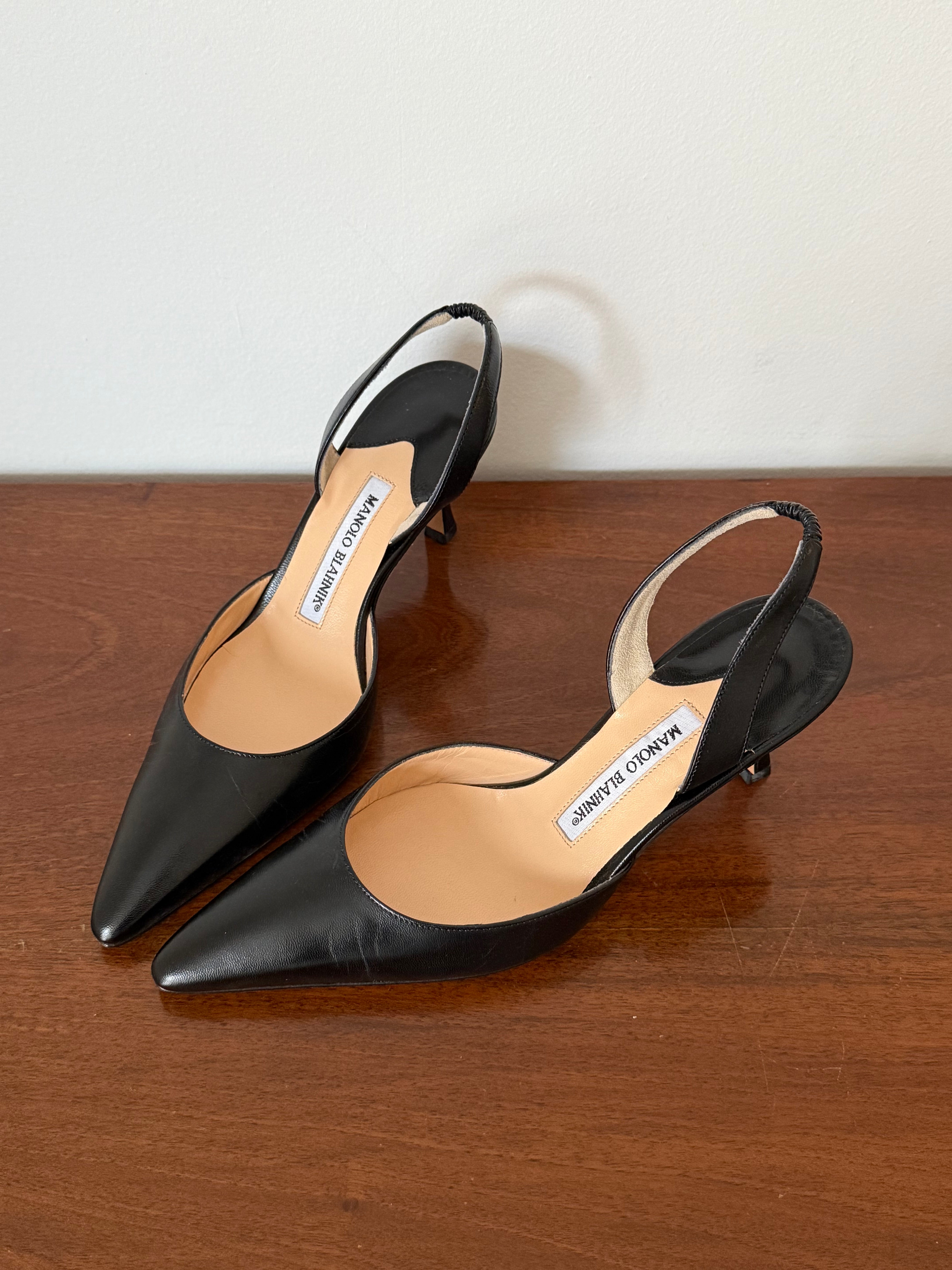 Iconic Manolo Blahnik ‘Carolyne’ pointed toe slingbacks in black leather. Comes with original box & dustbag.