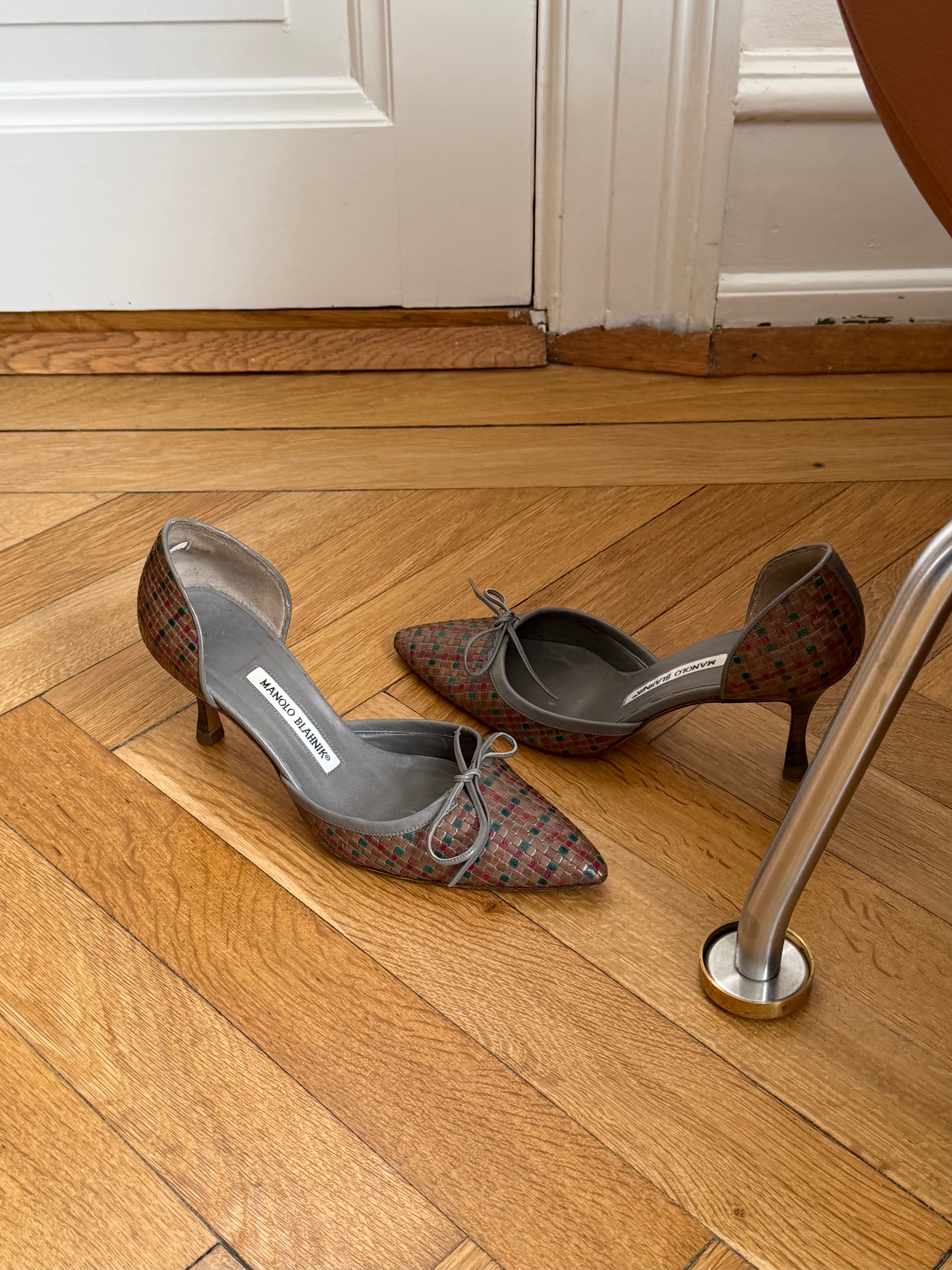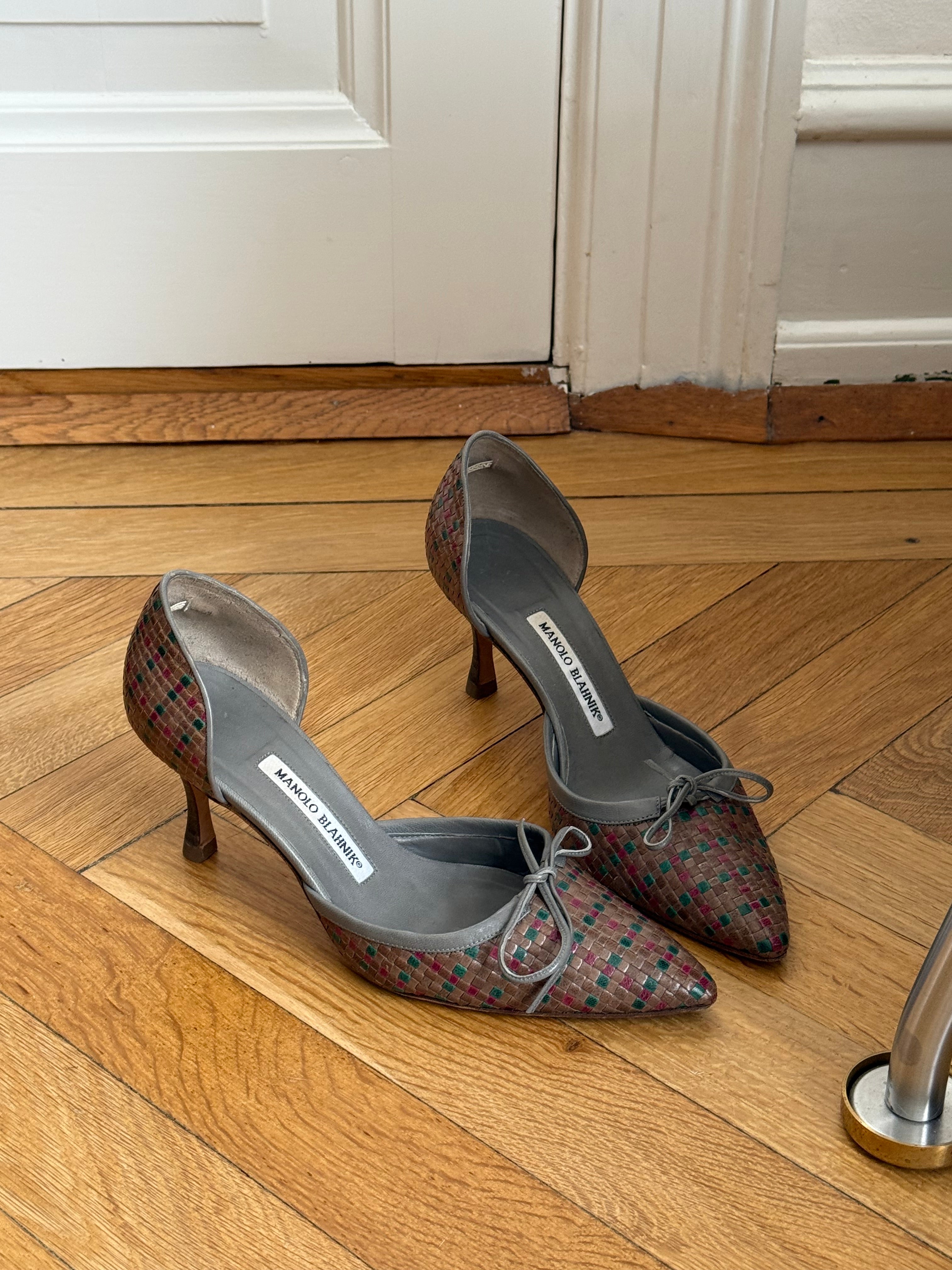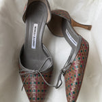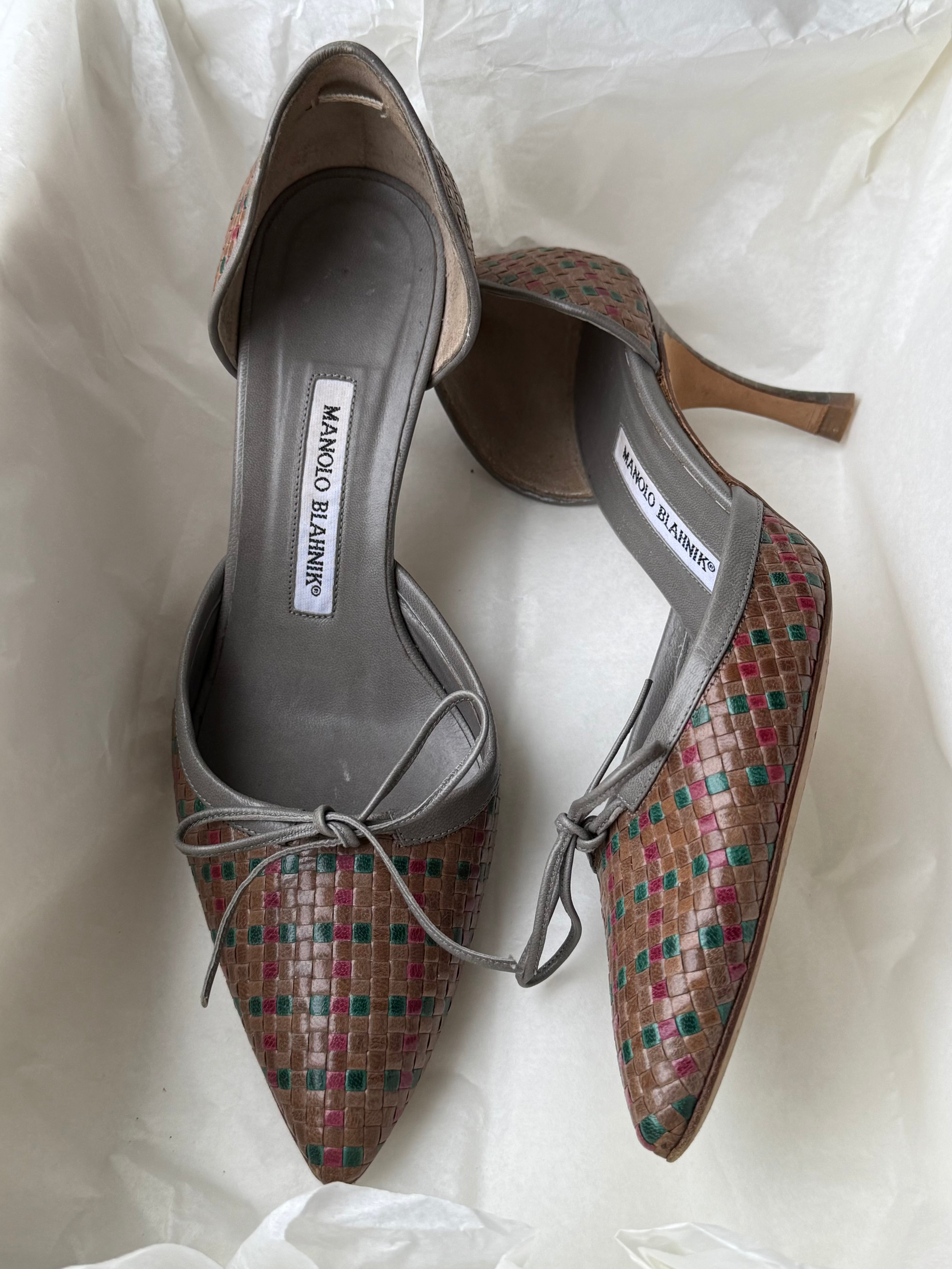 Vintage Manolo Blahnik heels with a pointed toe, woven multicolor fabric, leather trim, and cute bow detail.