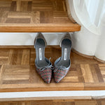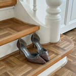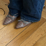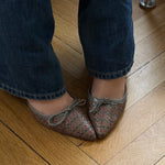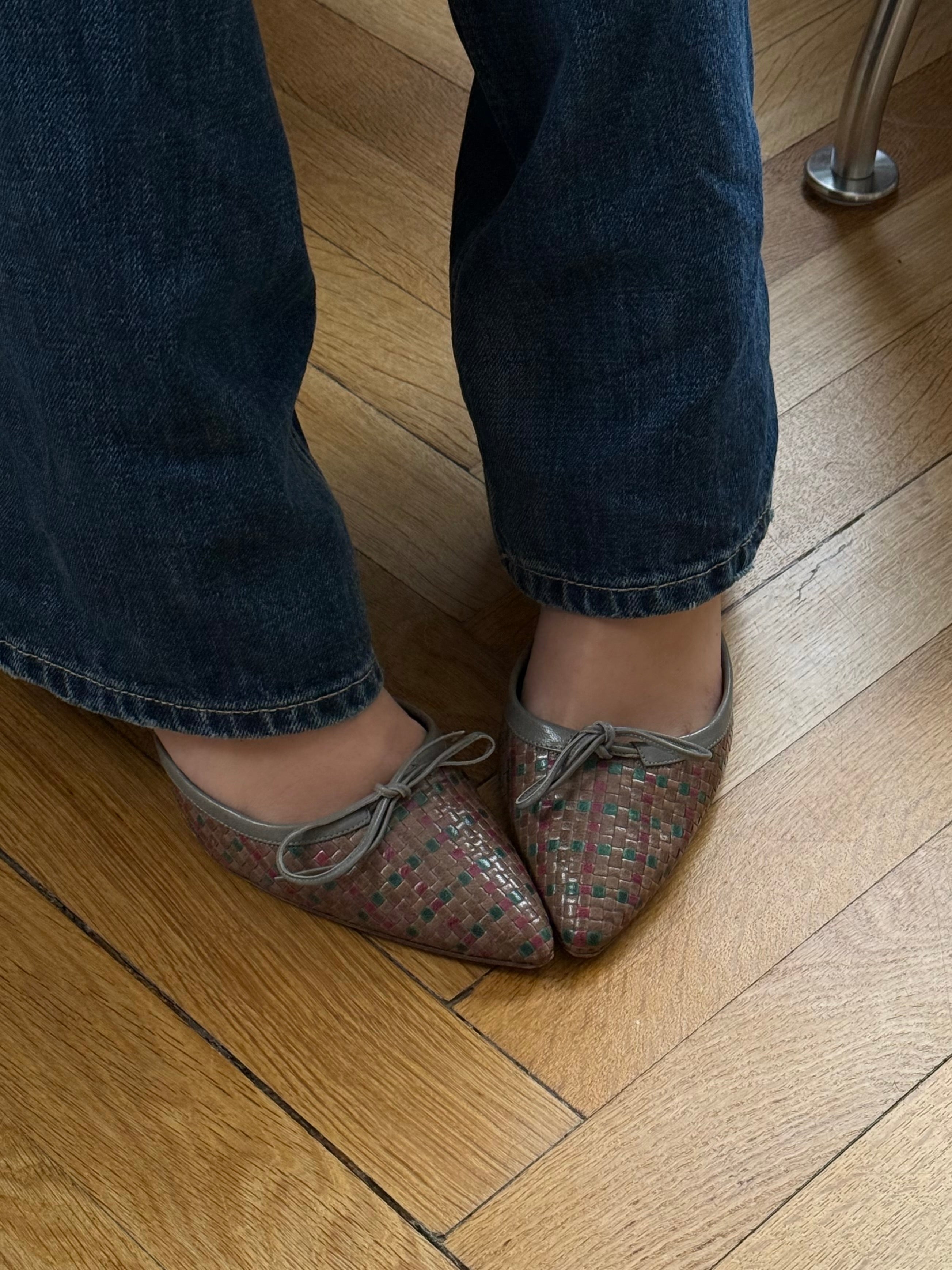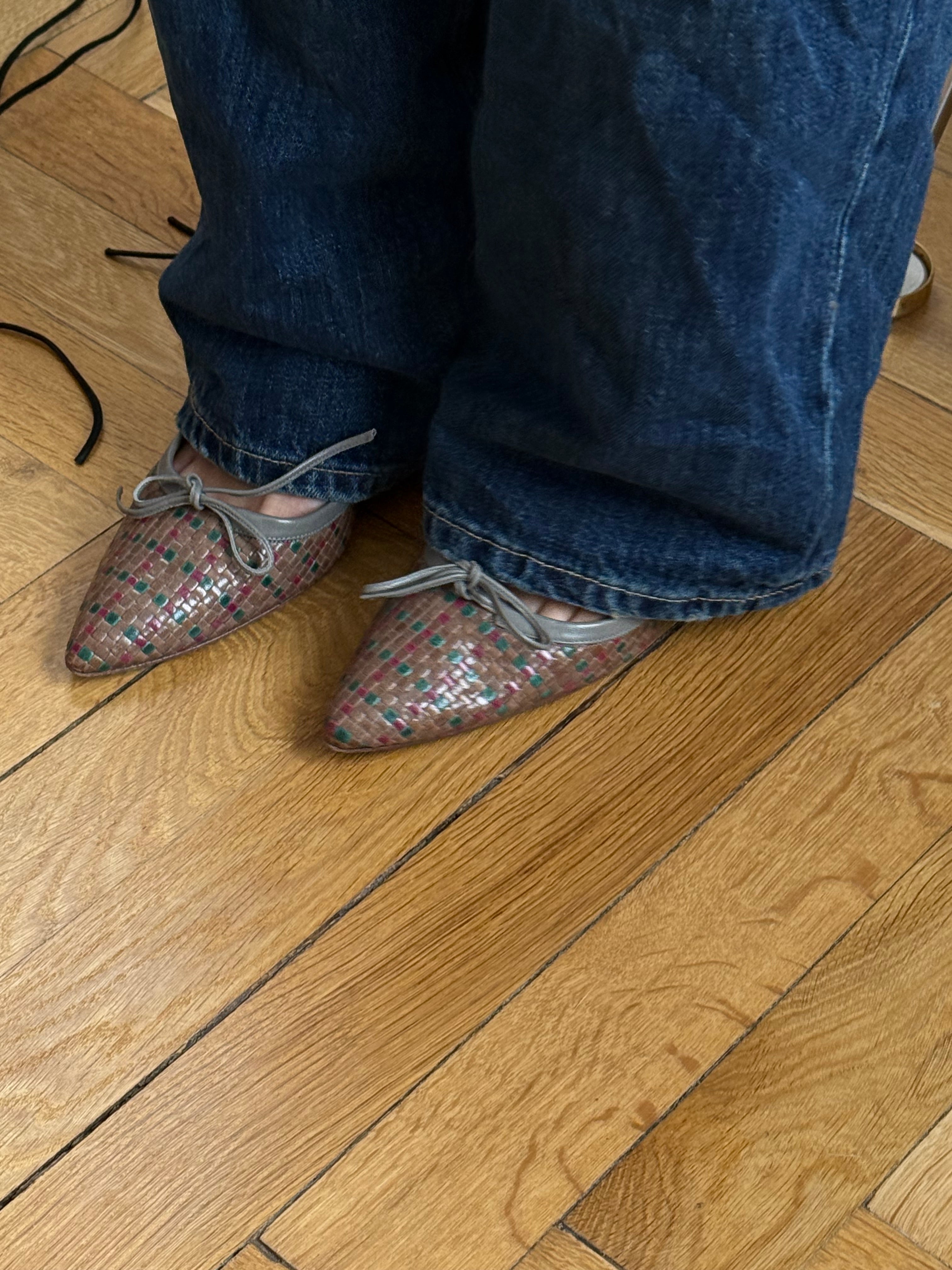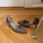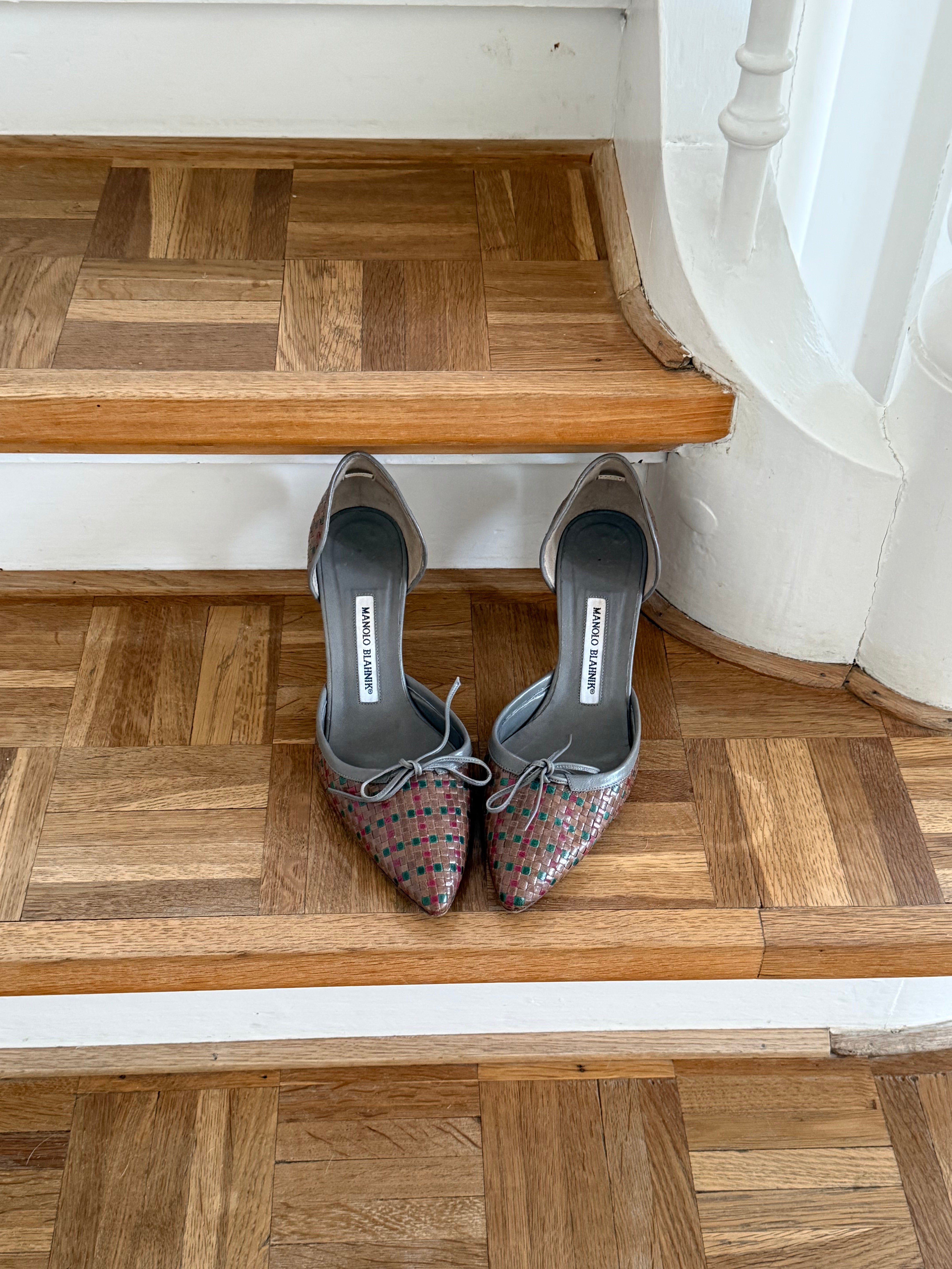Vintage Manolo Blahnik heels with a pointed toe, woven multicolor fabric, leather trim, and cute bow detail.
