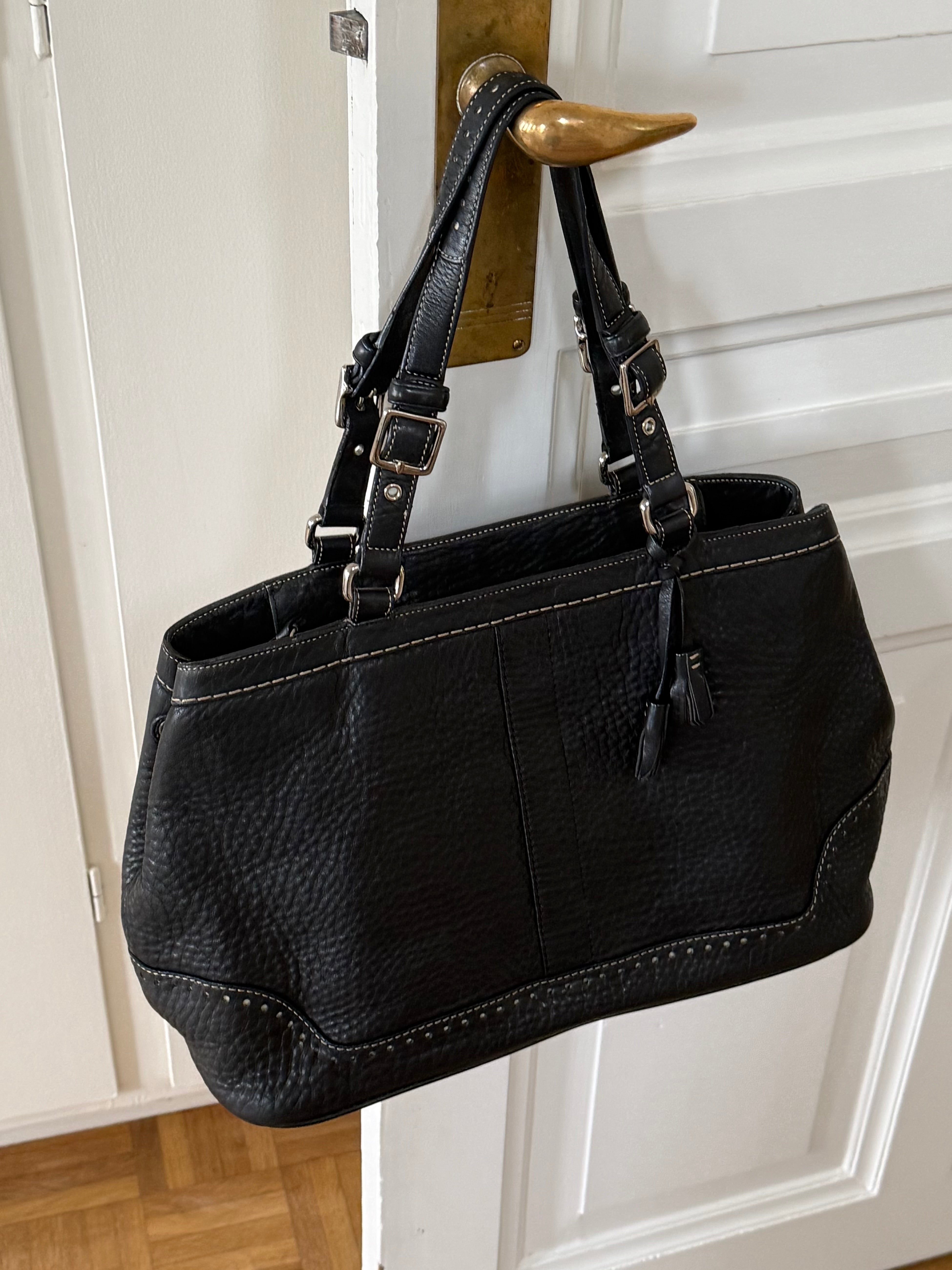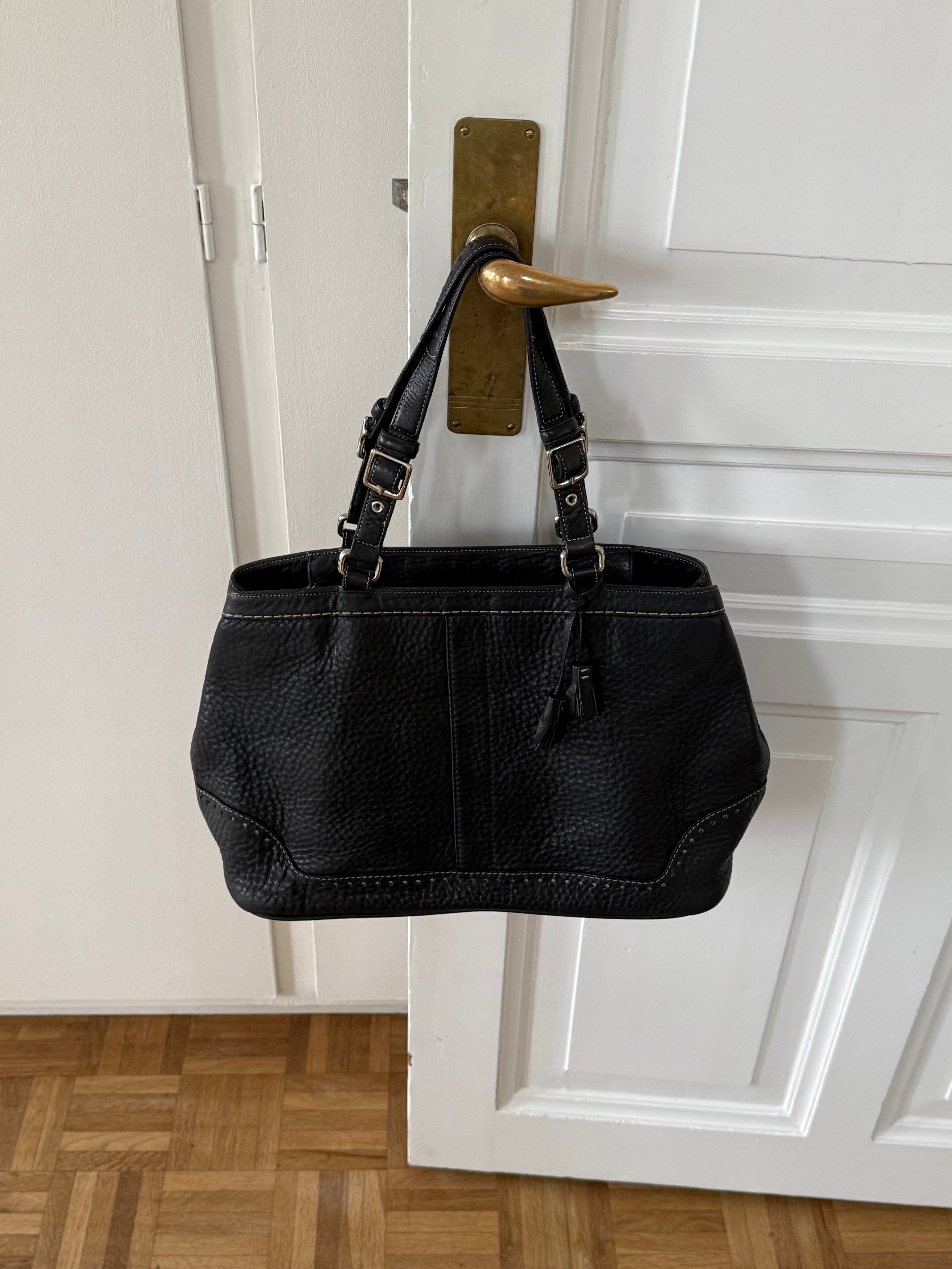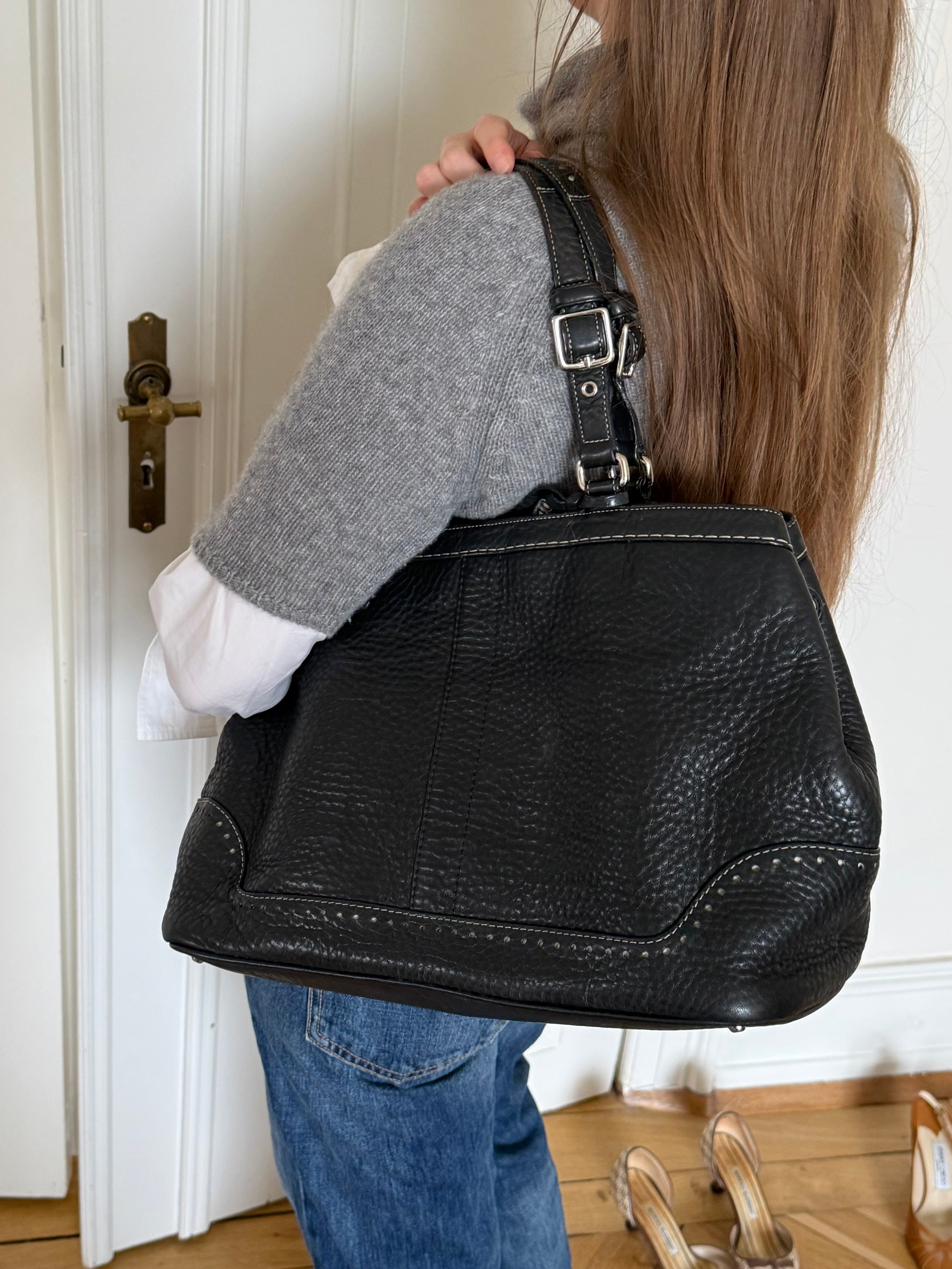 Vintage Coach shoulder bag in black pebbled leather with adjustable buckle shoulder straps. The bag is spacious and features beautiful stitching and details.