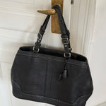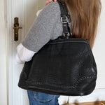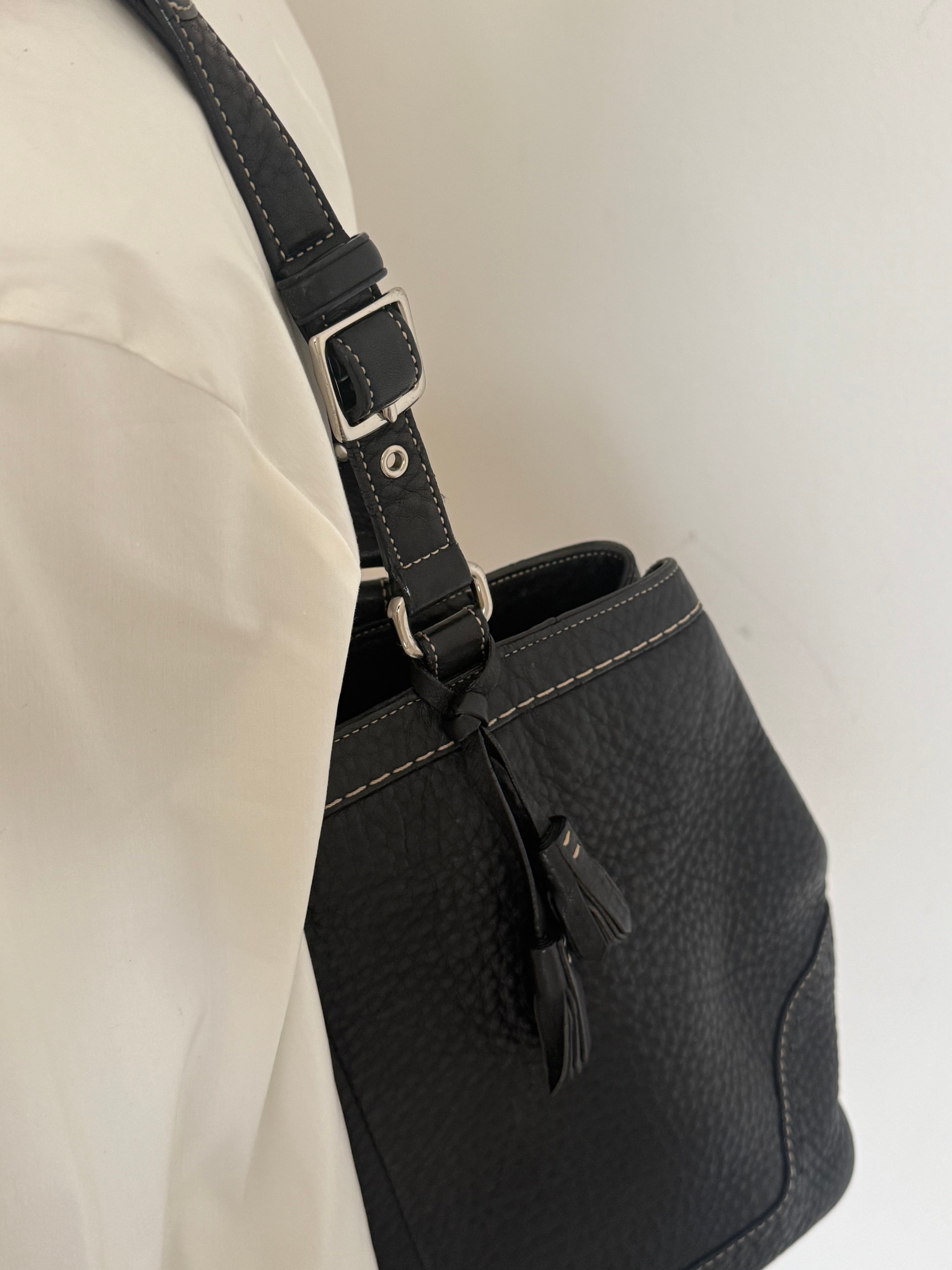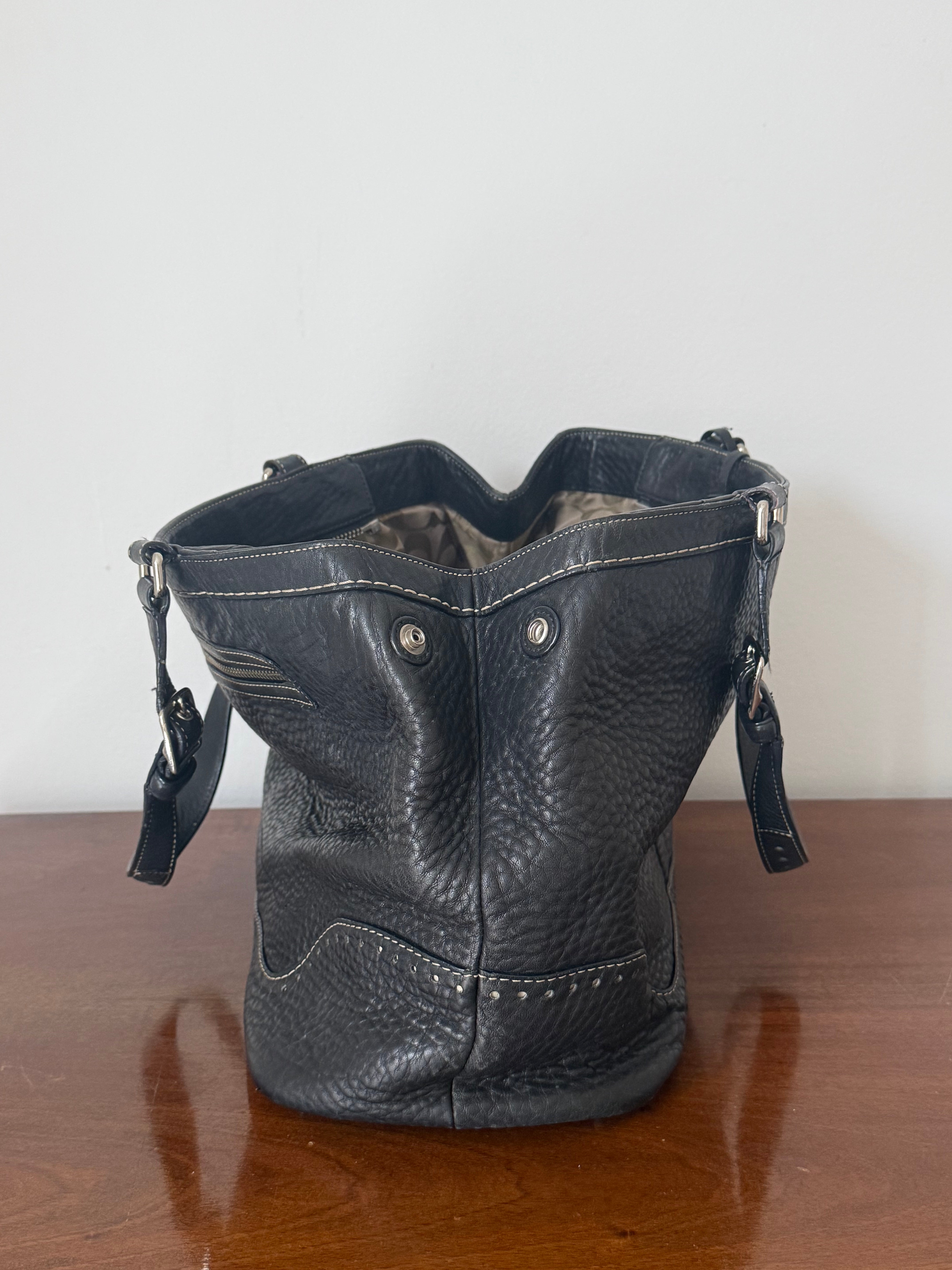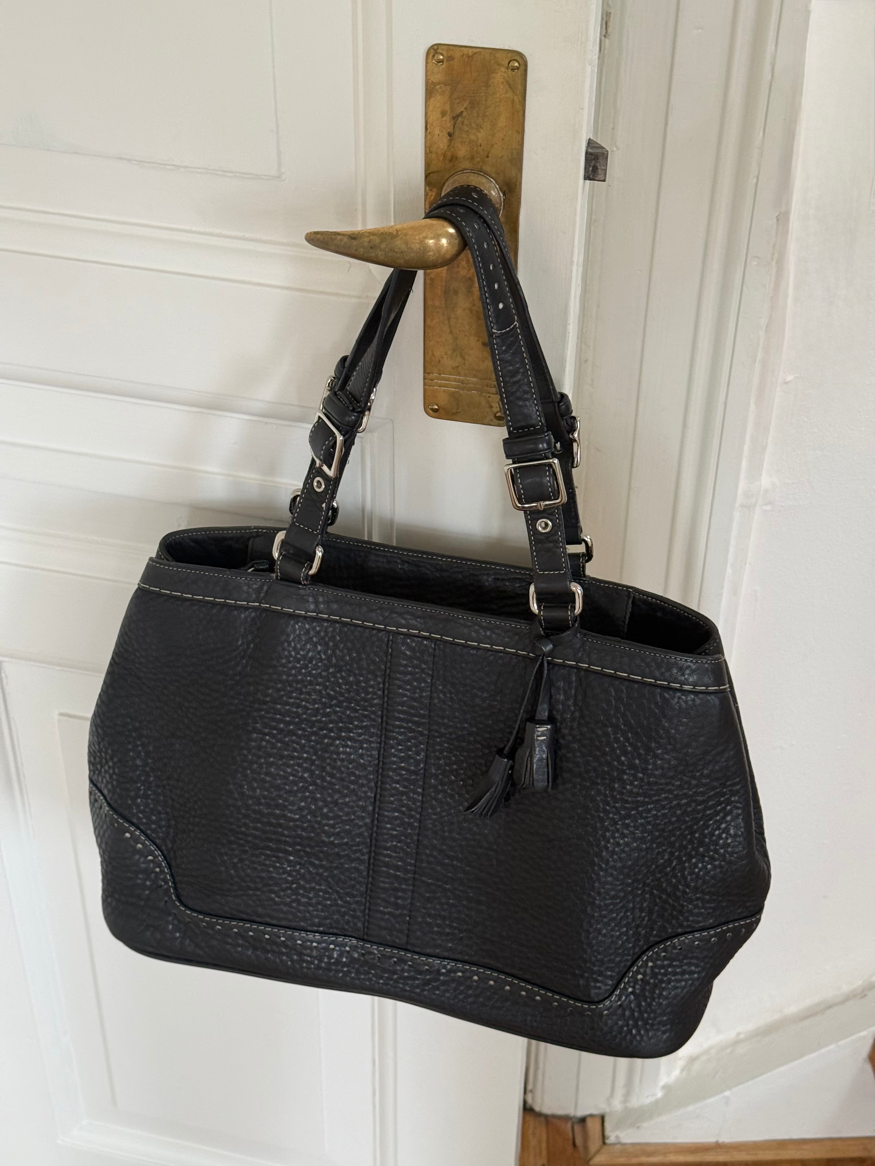 Vintage Coach shoulder bag in black pebbled leather with adjustable buckle shoulder straps. The bag is spacious and features beautiful stitching and details.