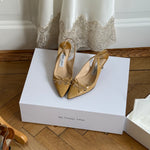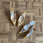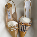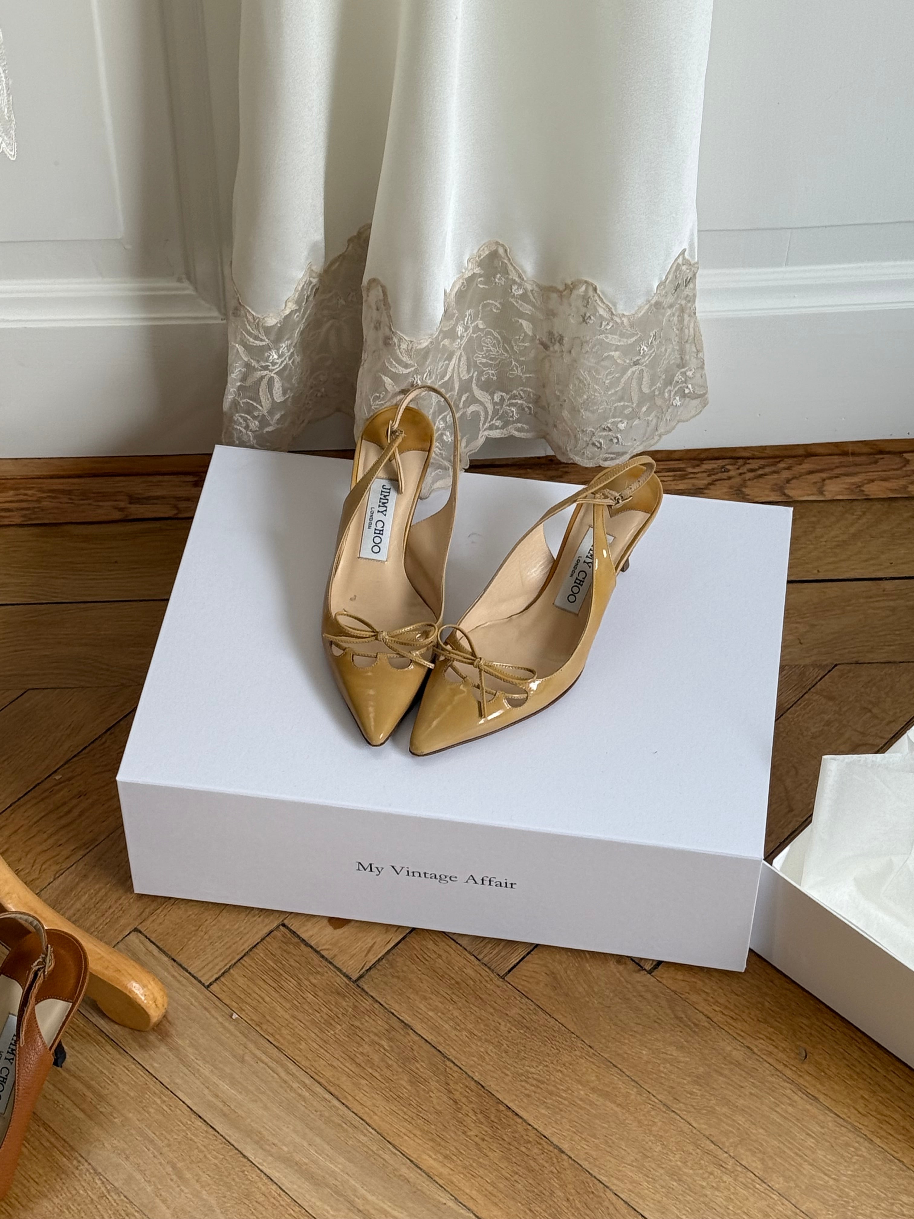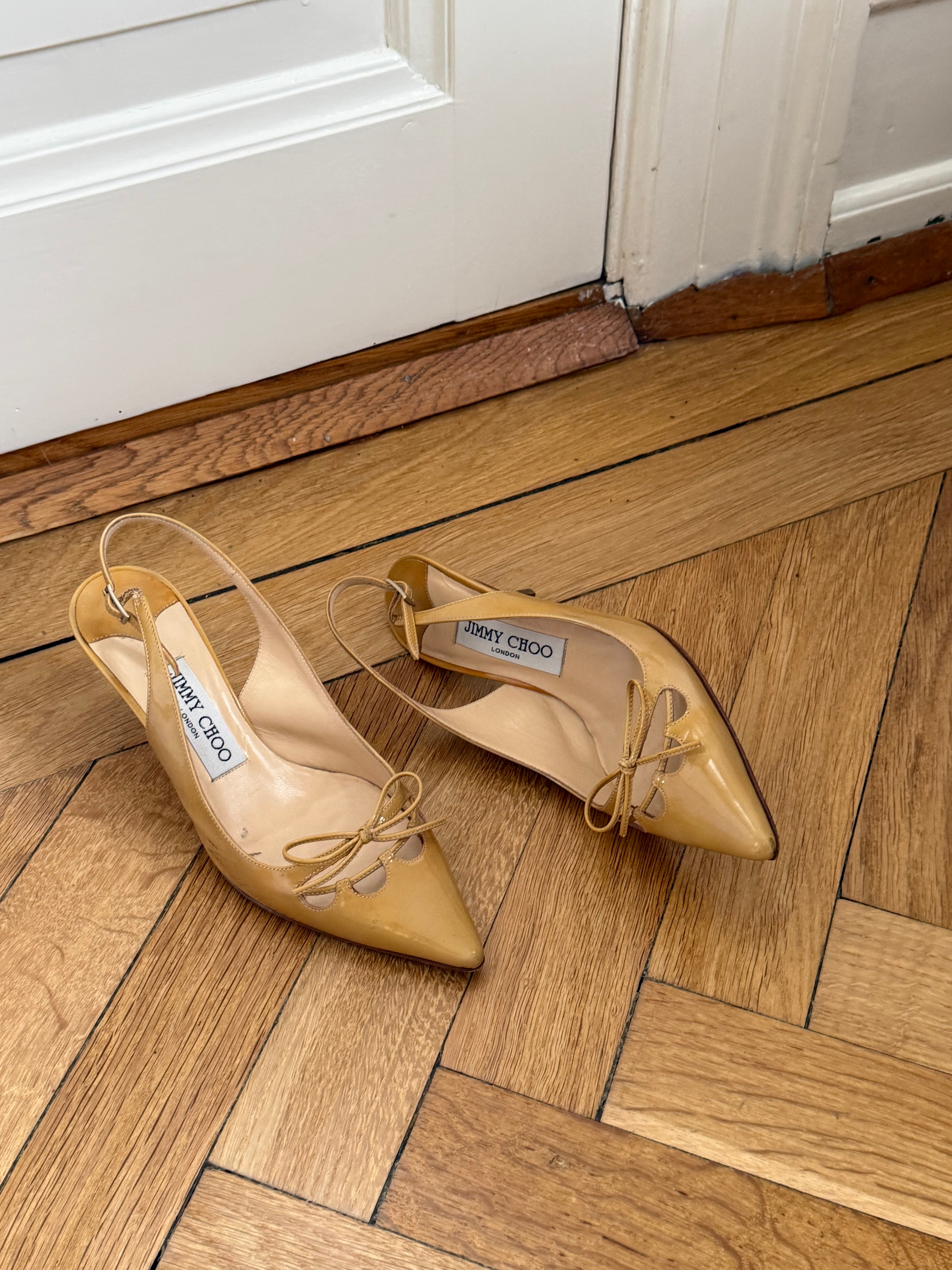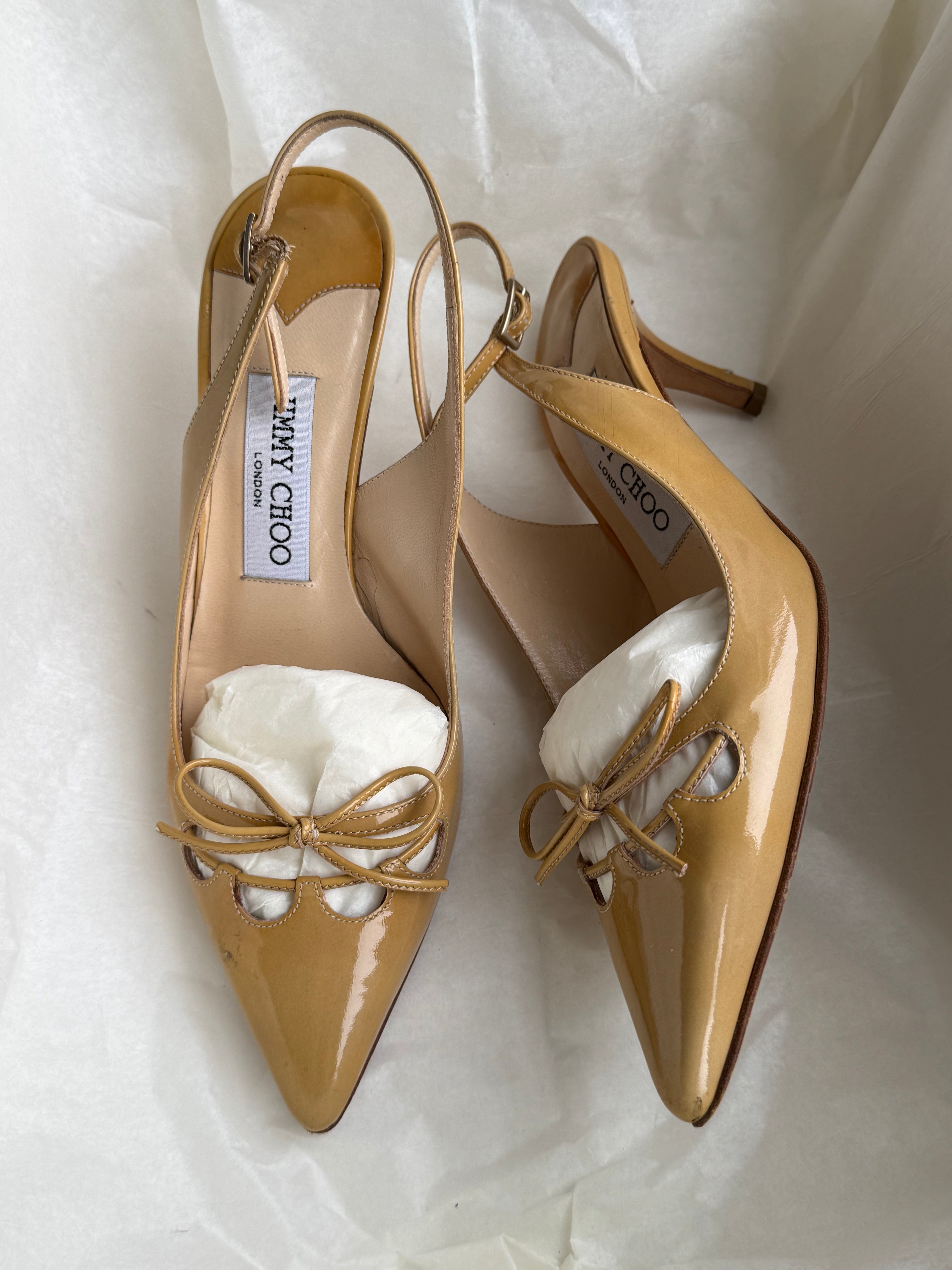 Vintage Jimmy Choo slingback heels in patent leather with cute bow detail.
