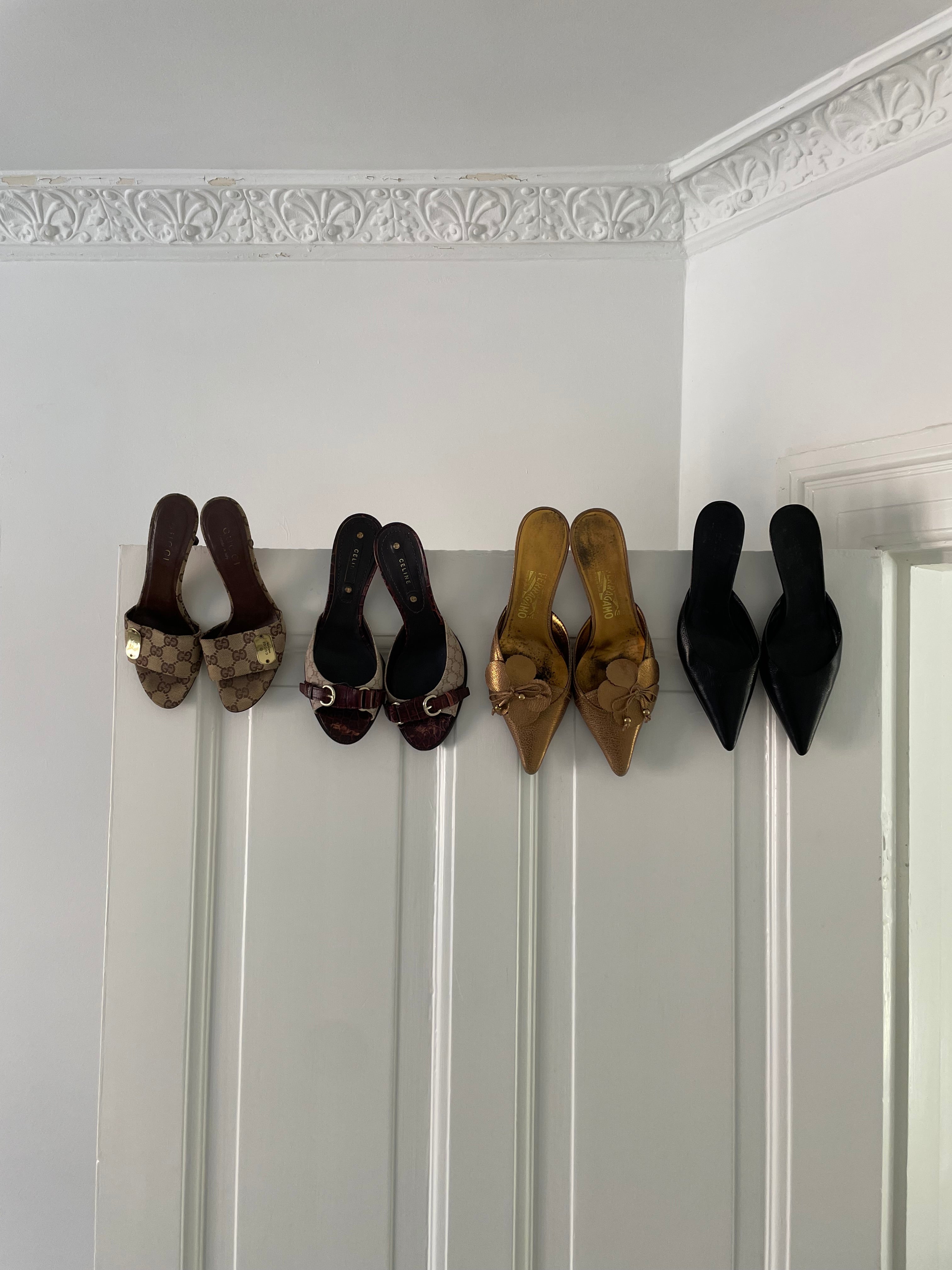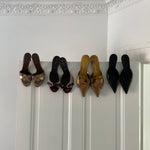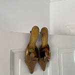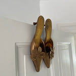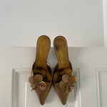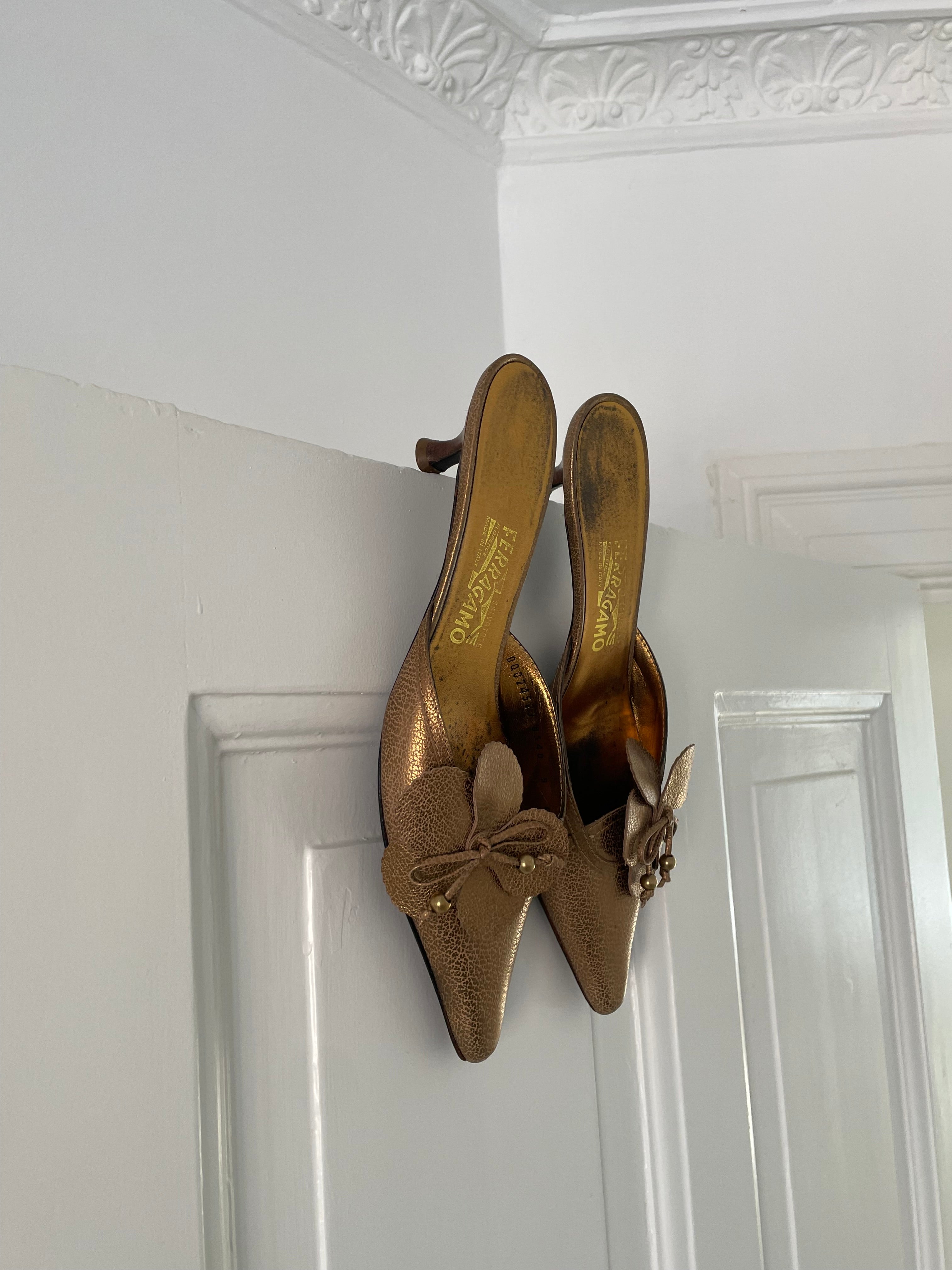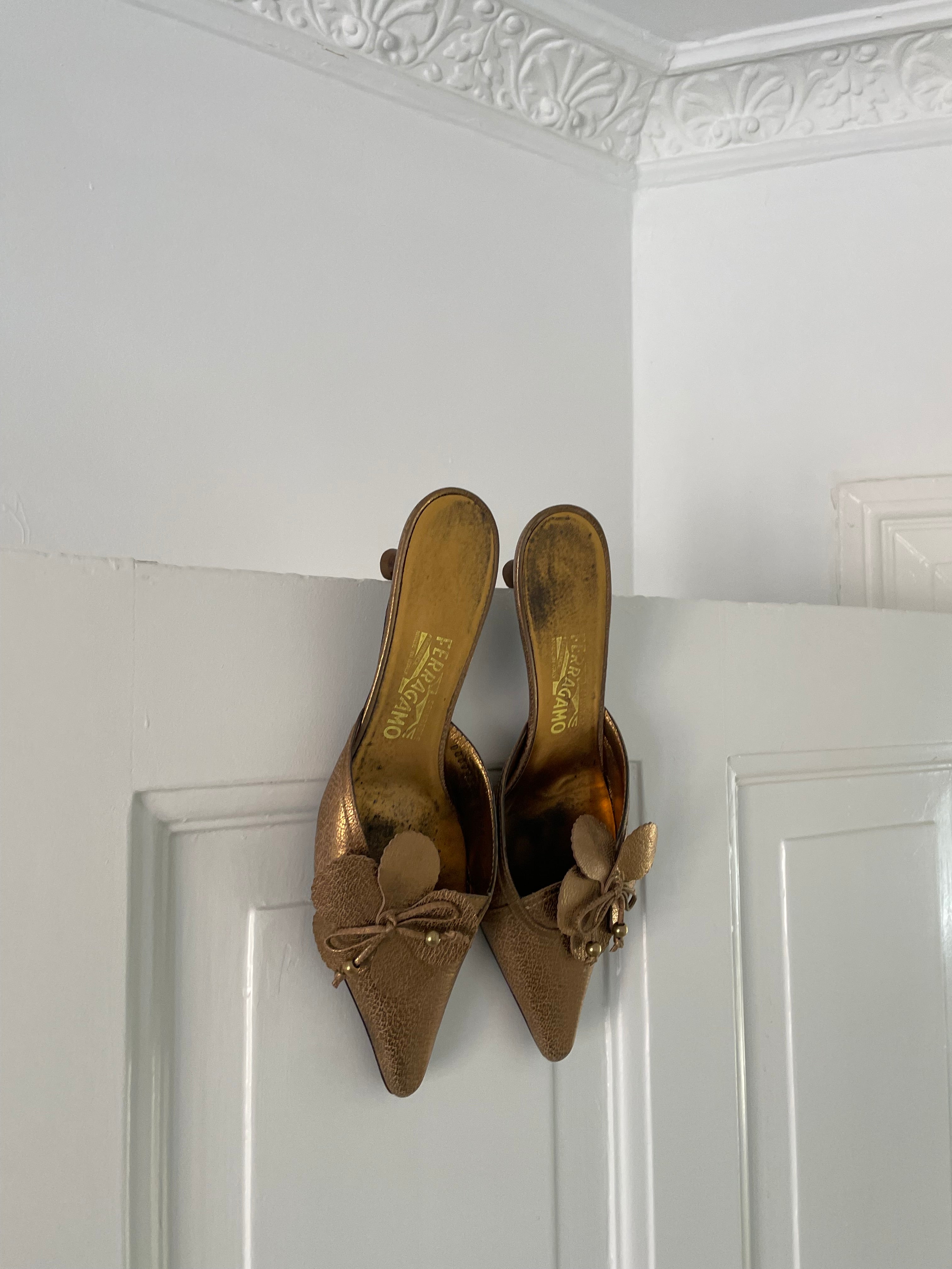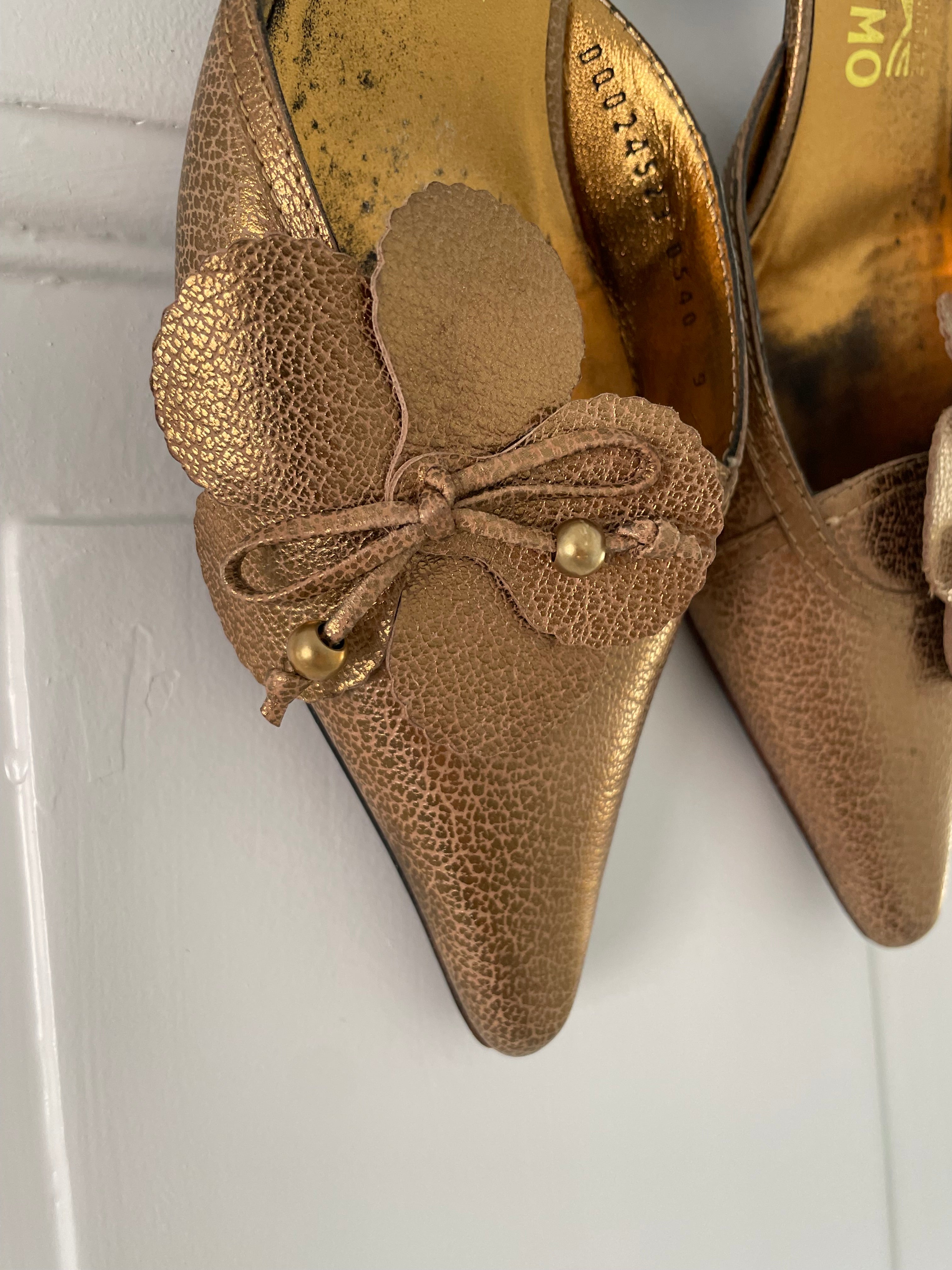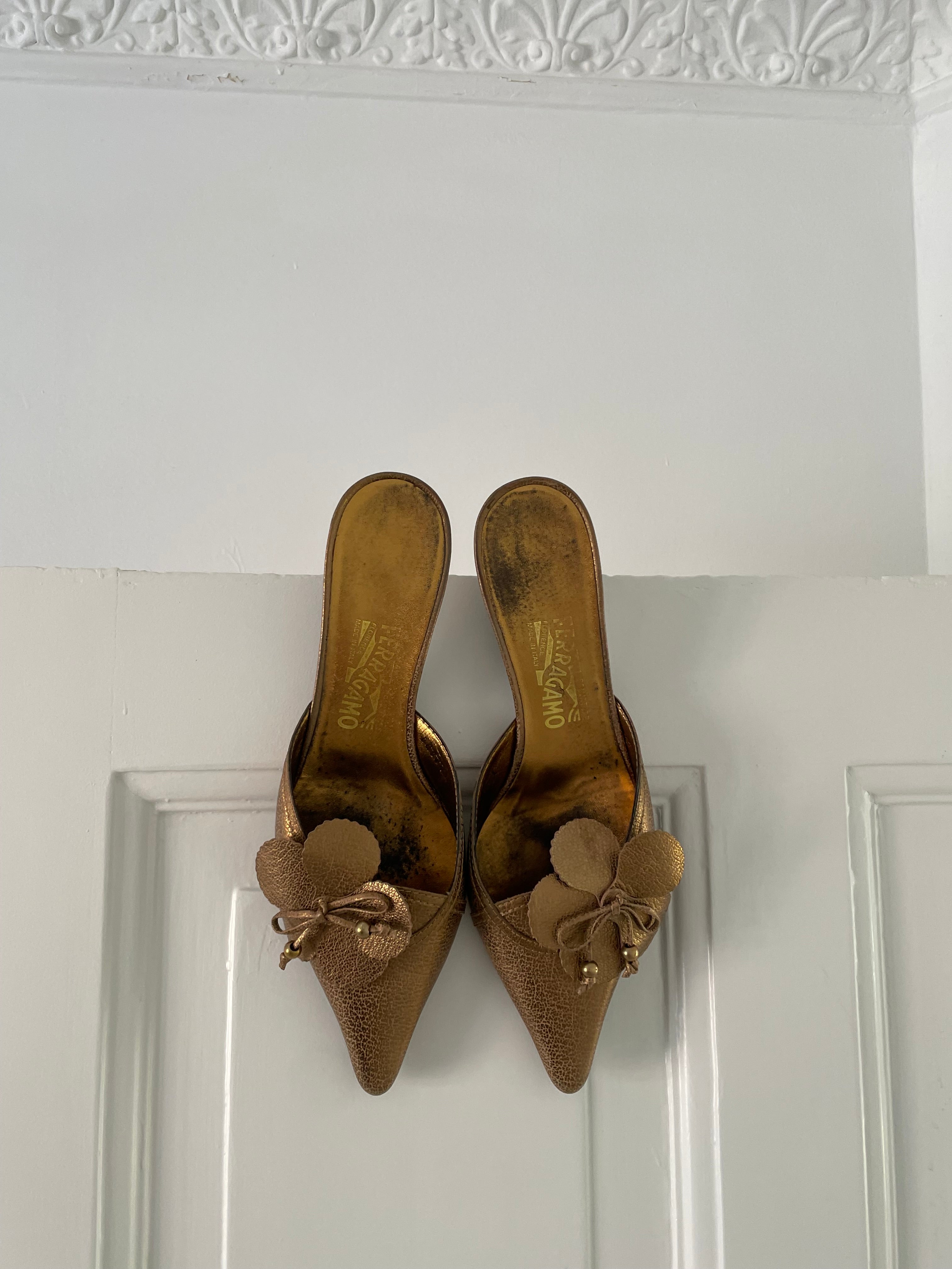 Vintage Salvatore Ferragamo bronze mules with textured leather, floral appliqués, gold-tone beads, and a sculpted wooden heel.