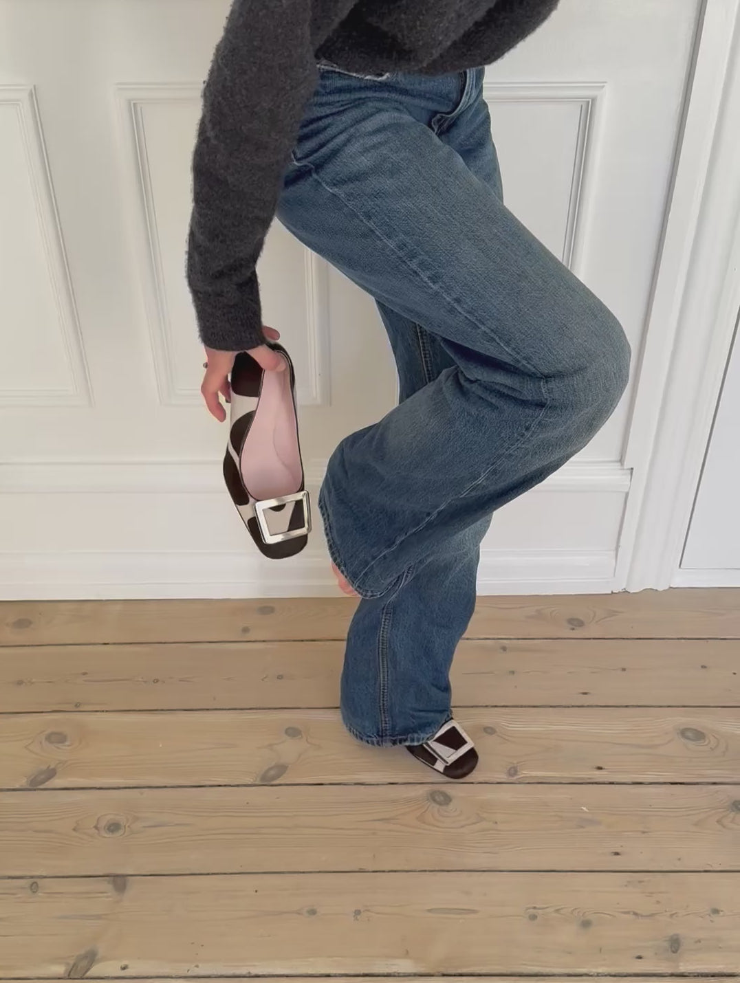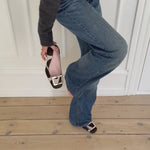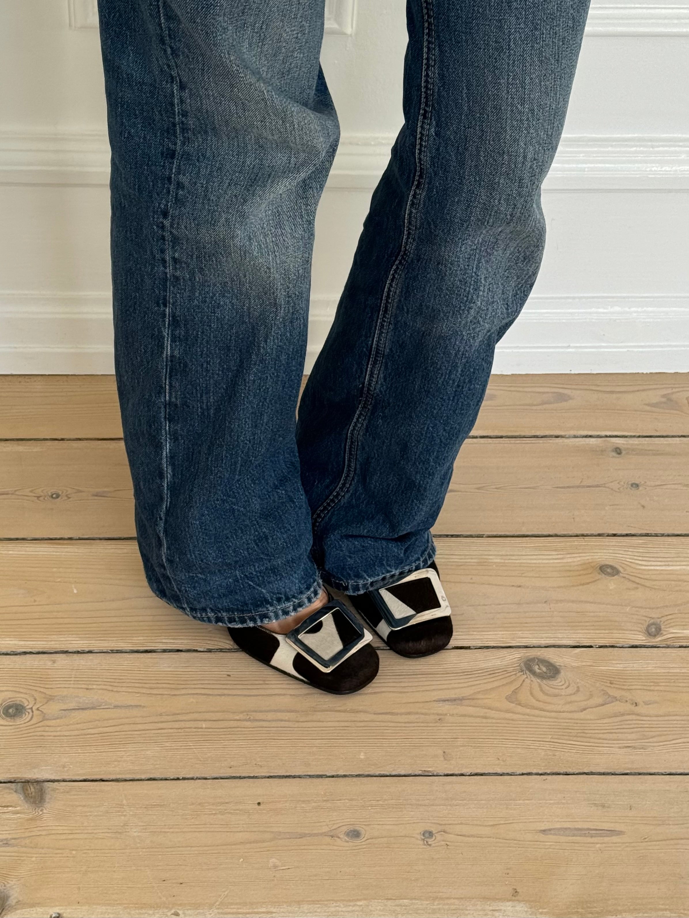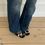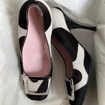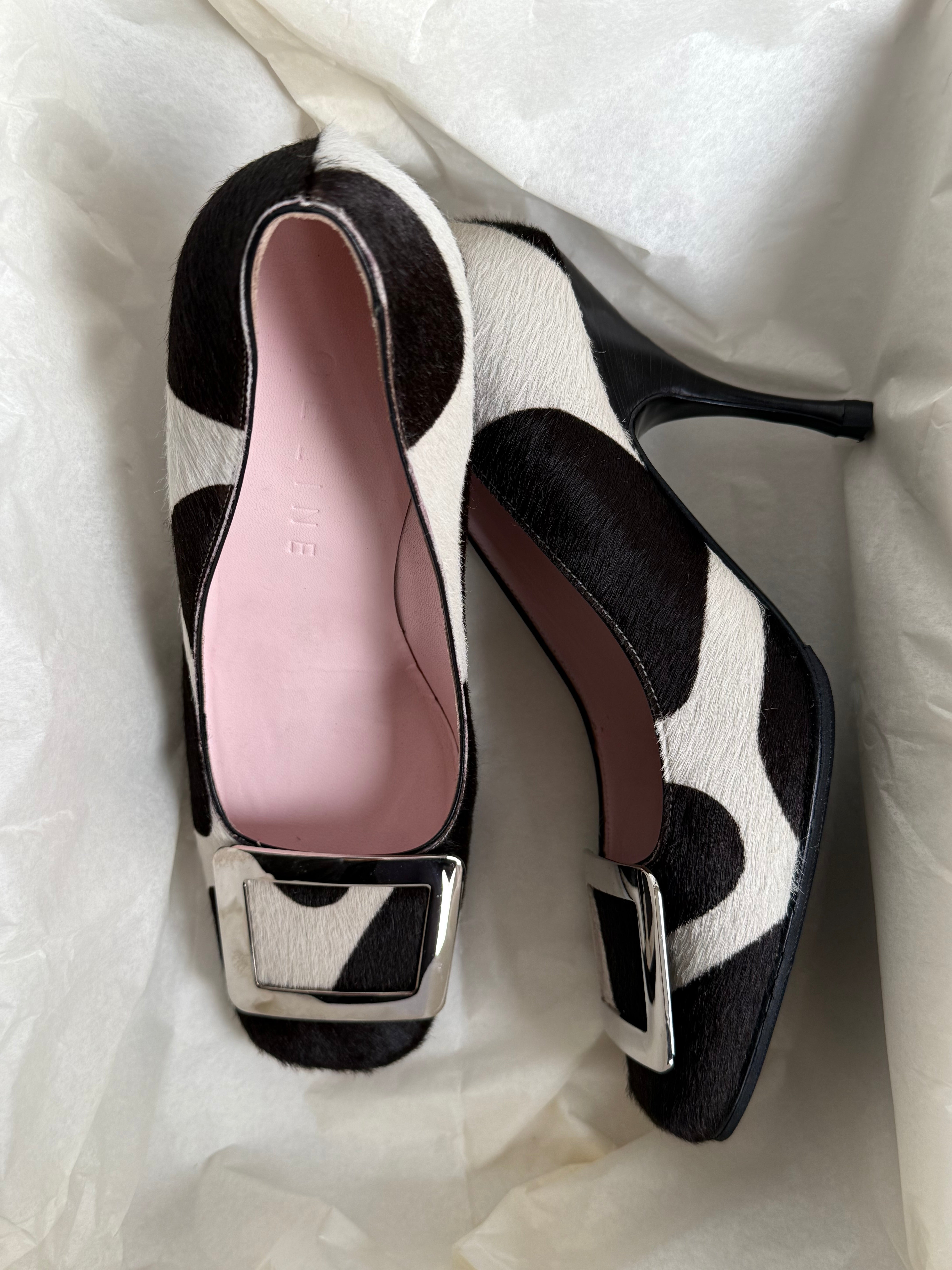 Rare vintage Celine square-toe pumps in dark brown and white pony hair, featuring a silver buckle and soft pink insoles.