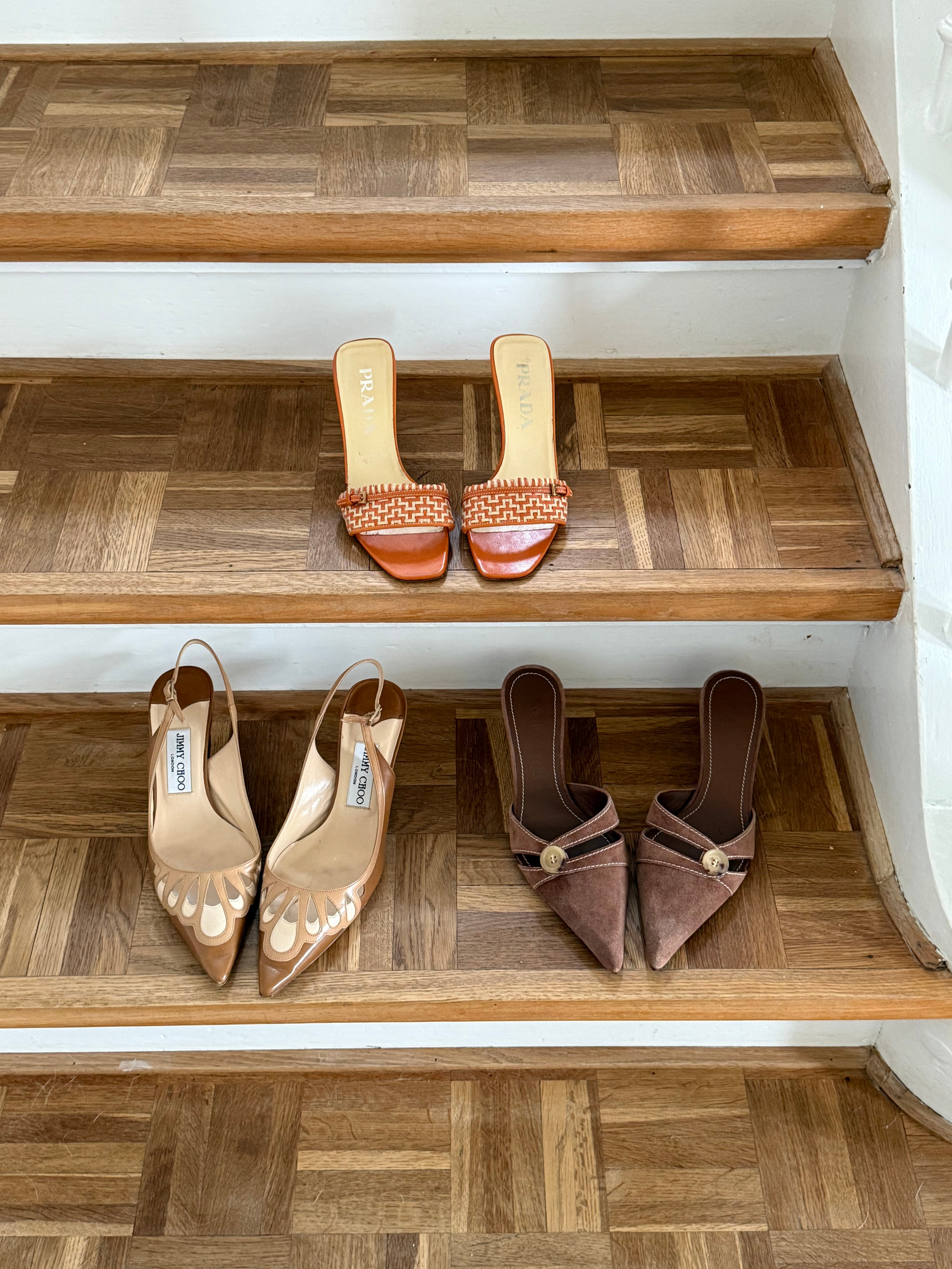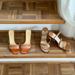 Vintage Prada kitten heels in a orange and cream color combination, featuring a buckle detail at the front.