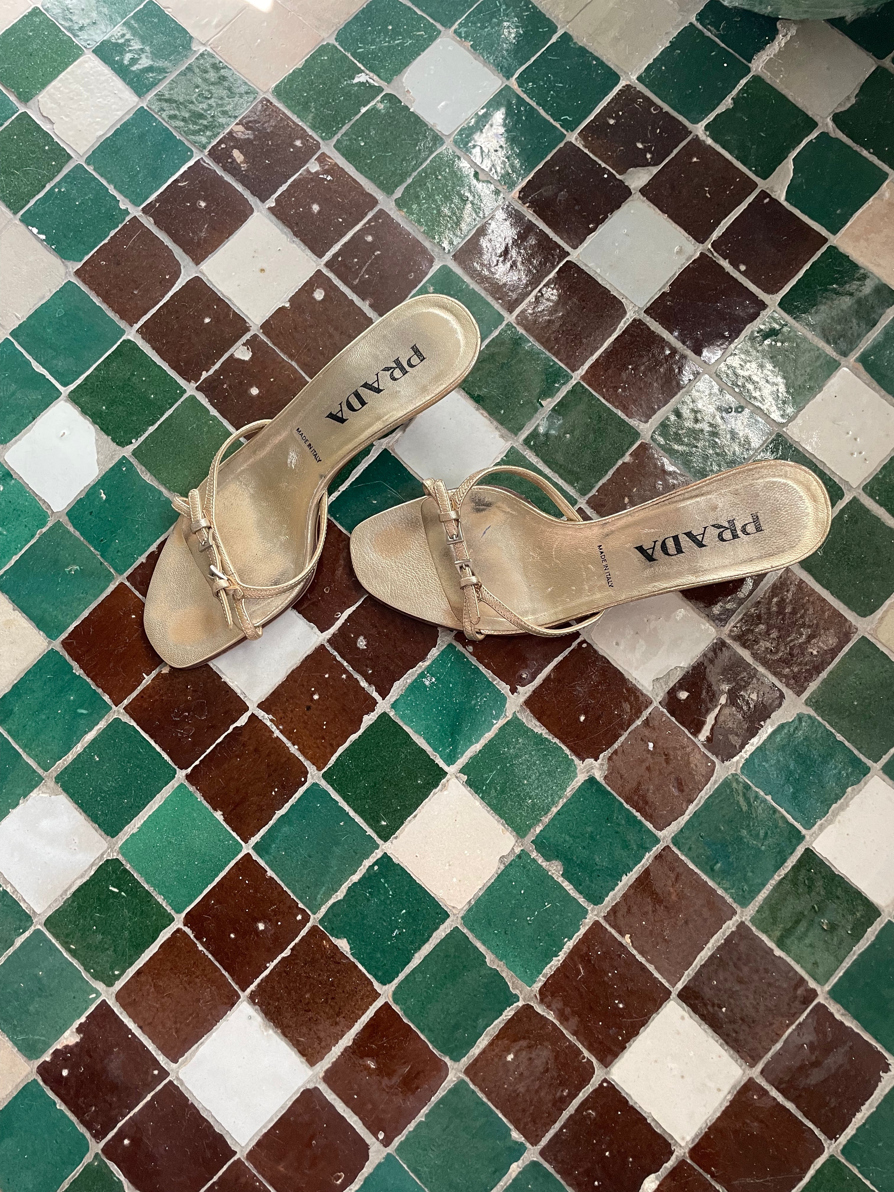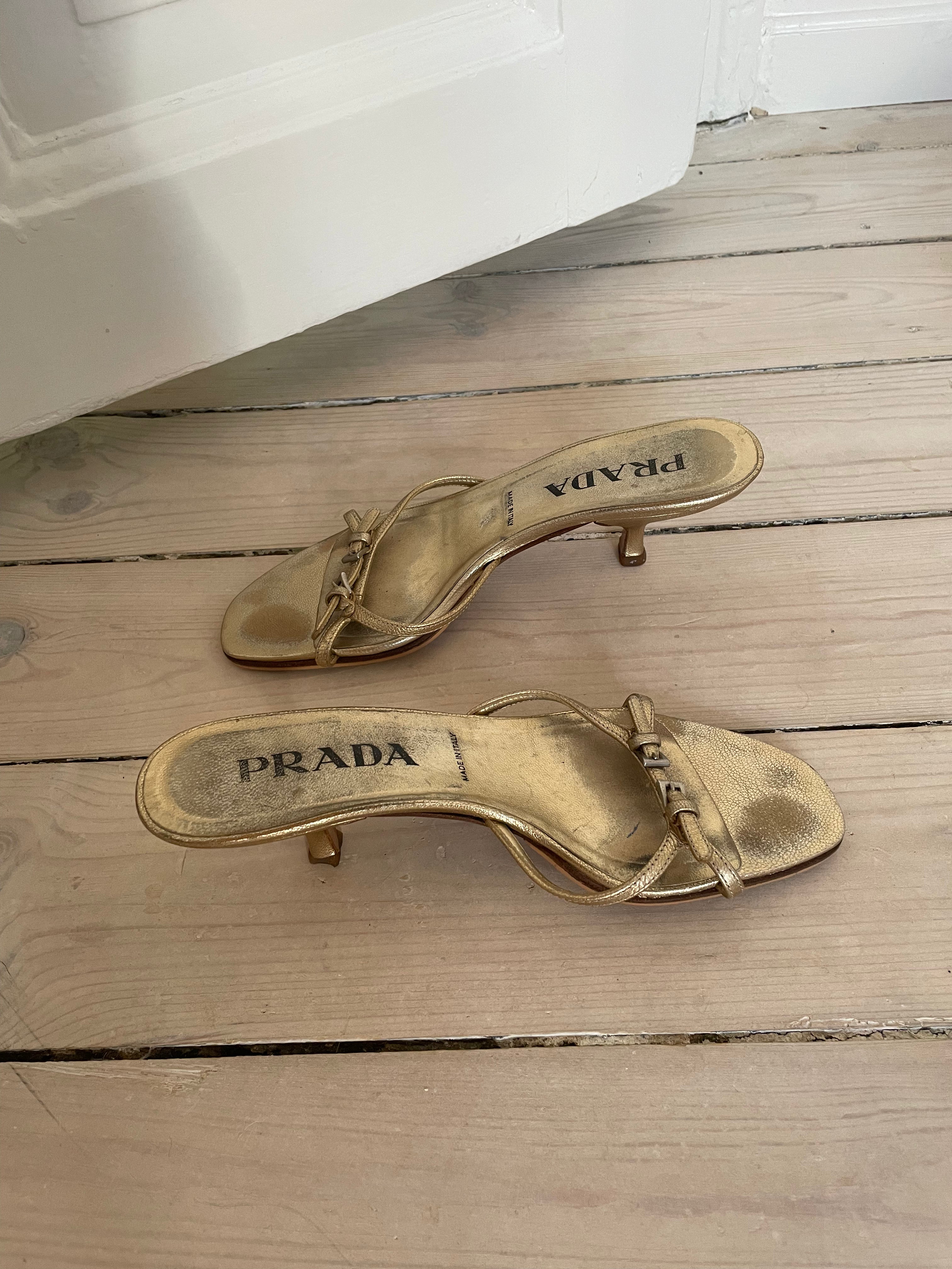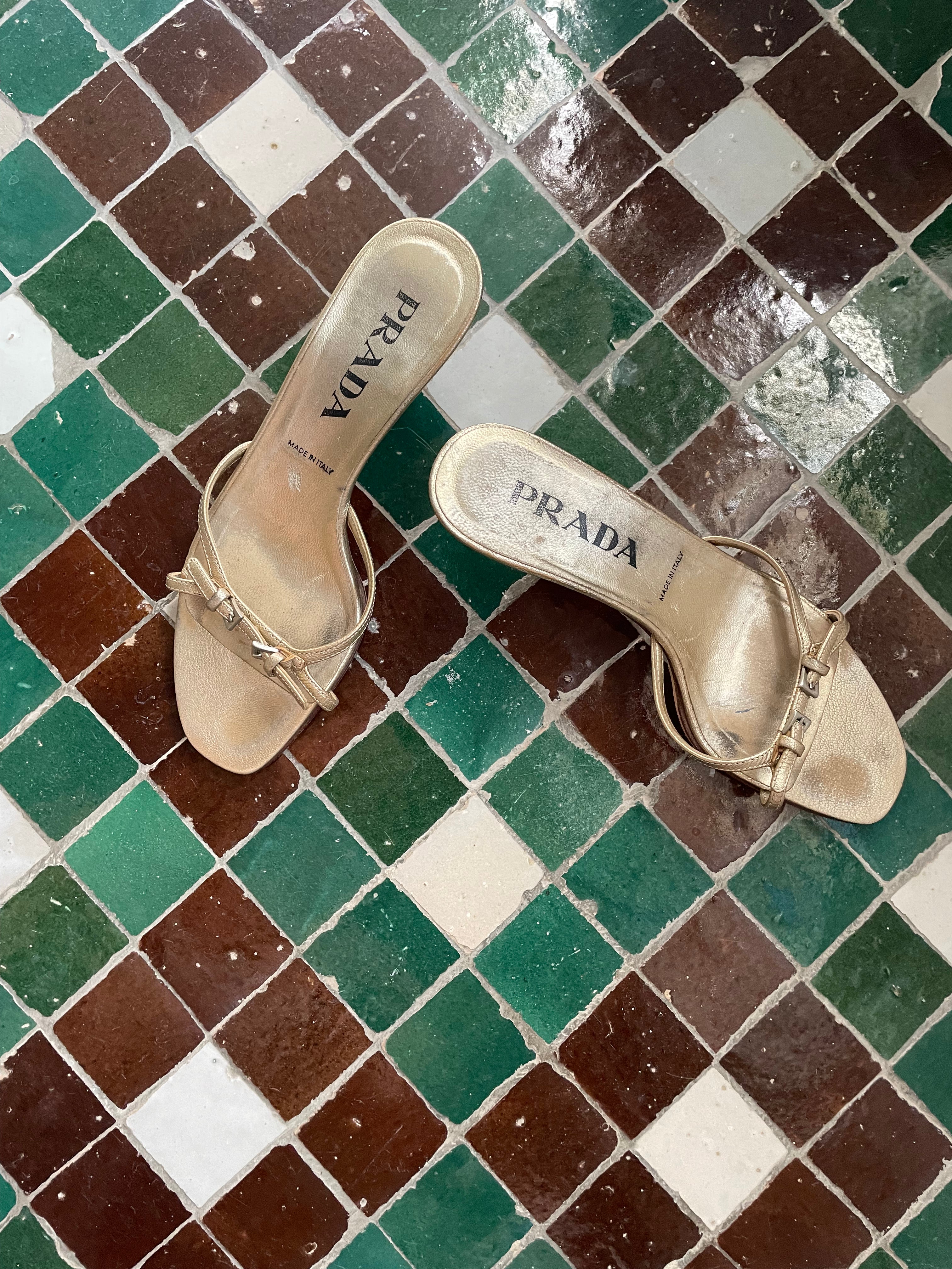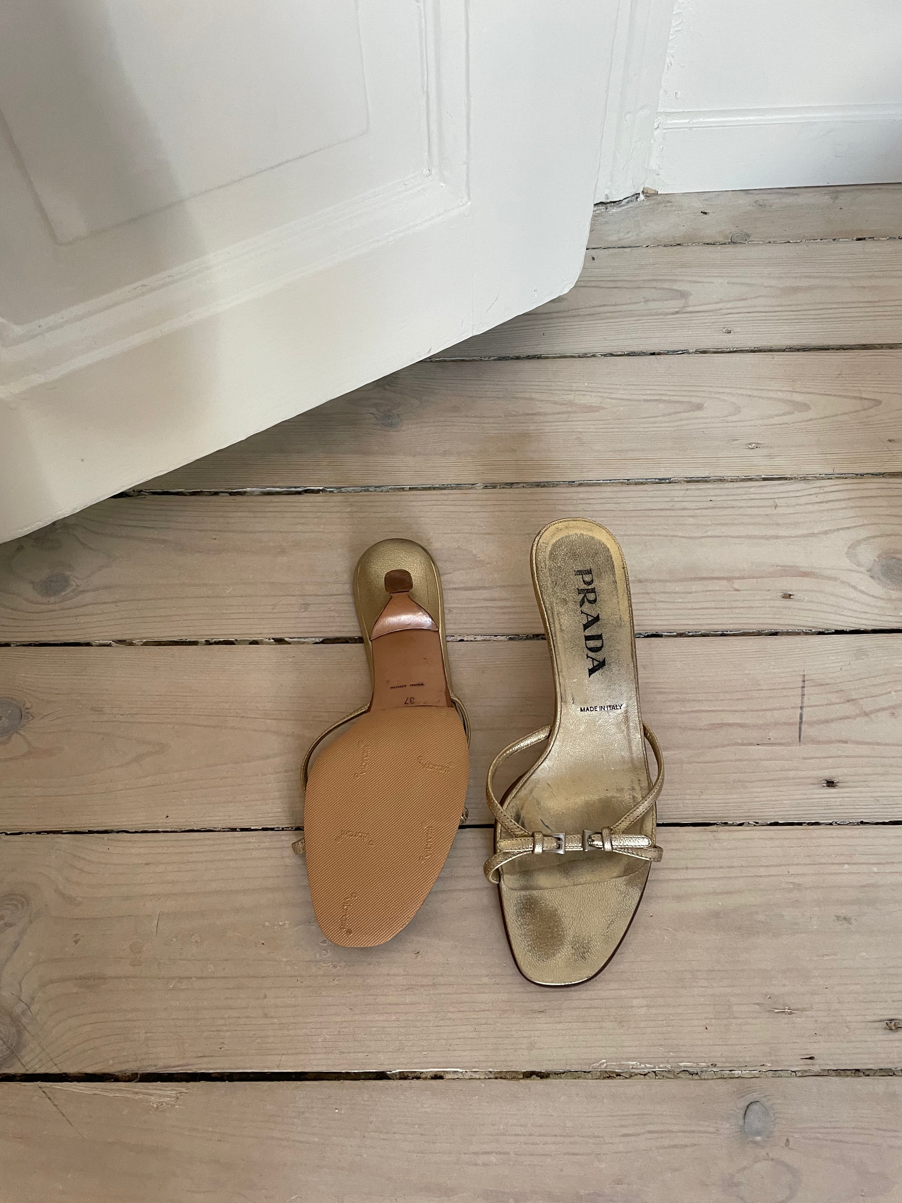 Prada leather sandals in gold. They show signs of wear and have been resoled but remain in great condition and are comfortable to wear.