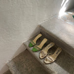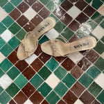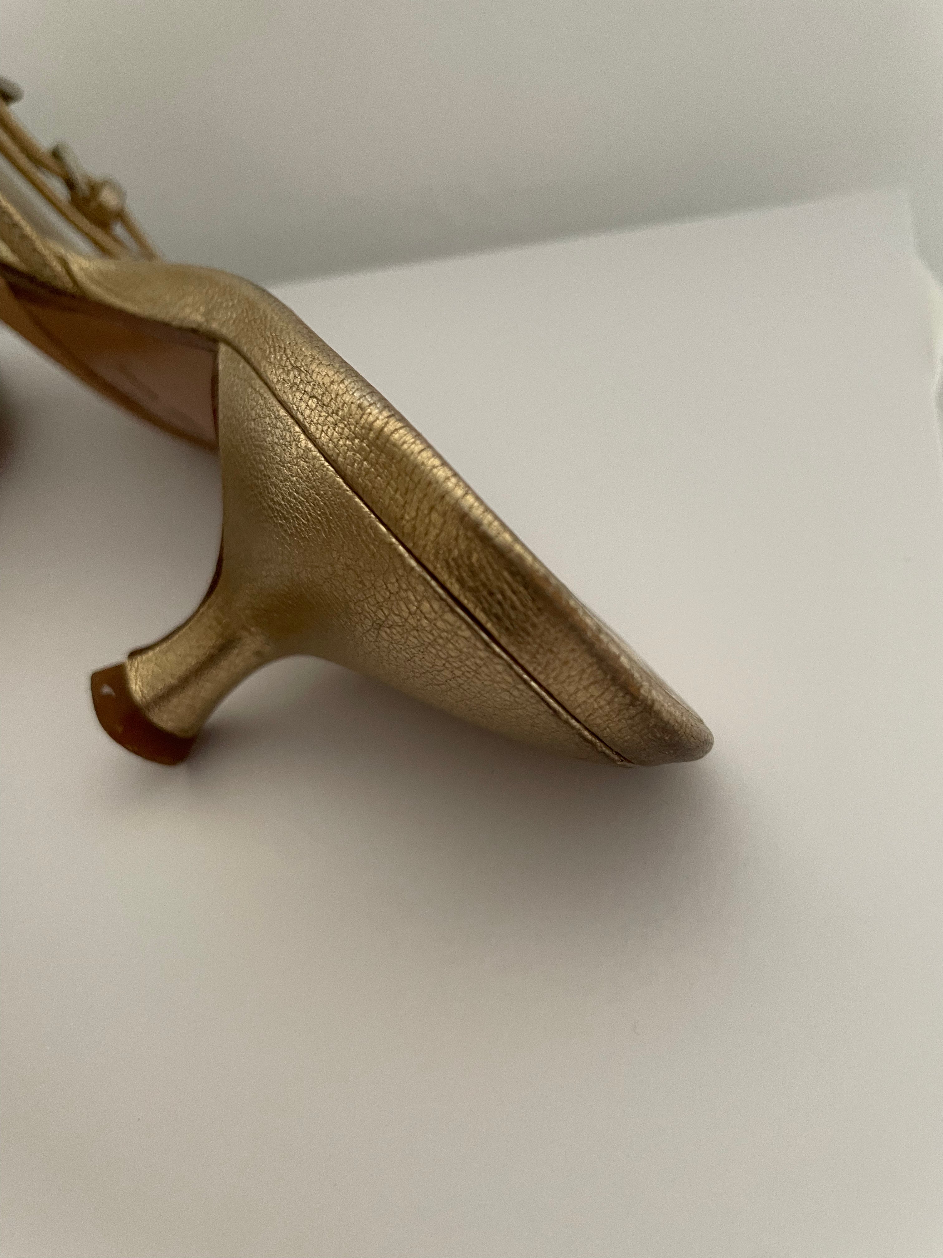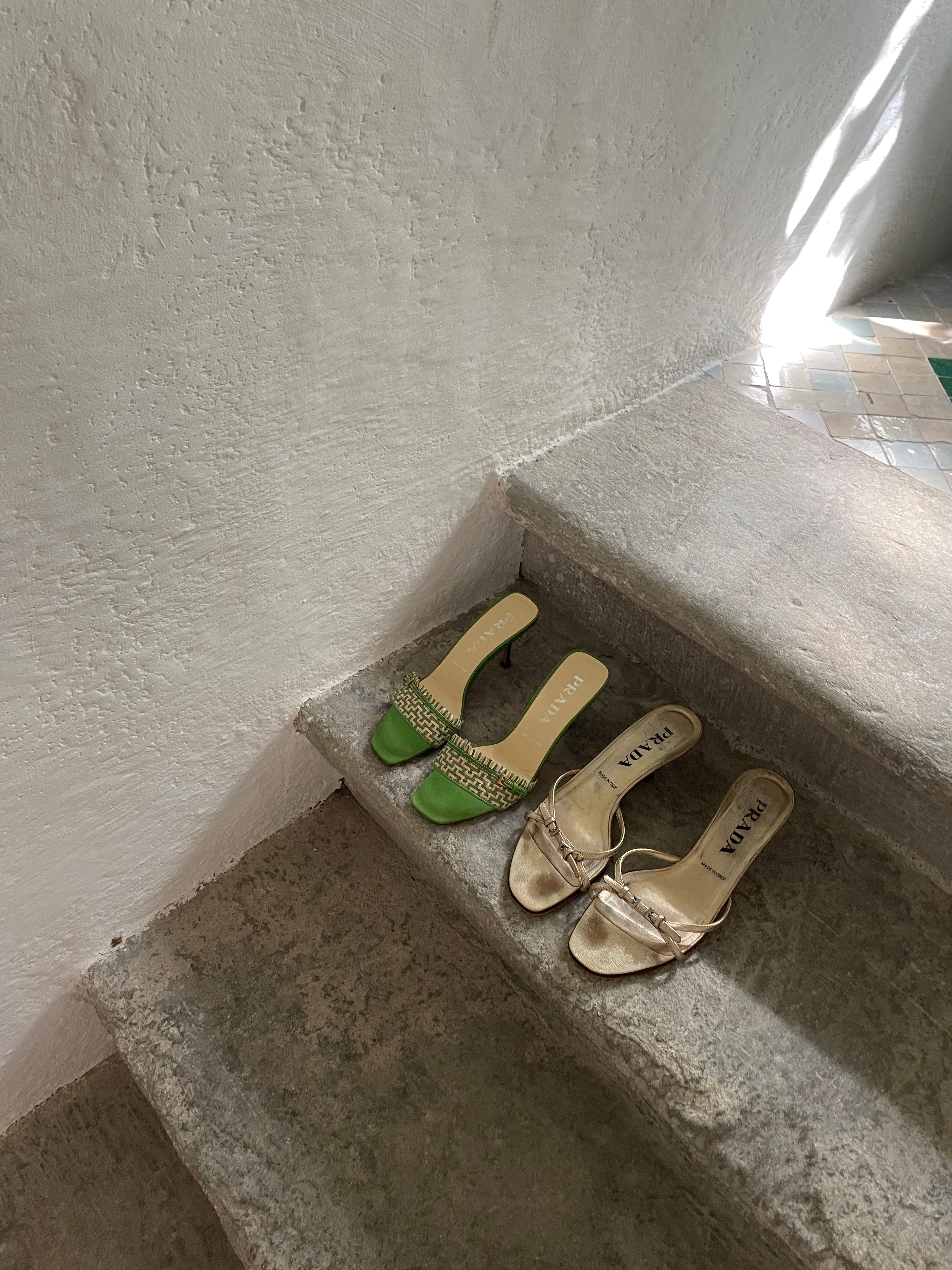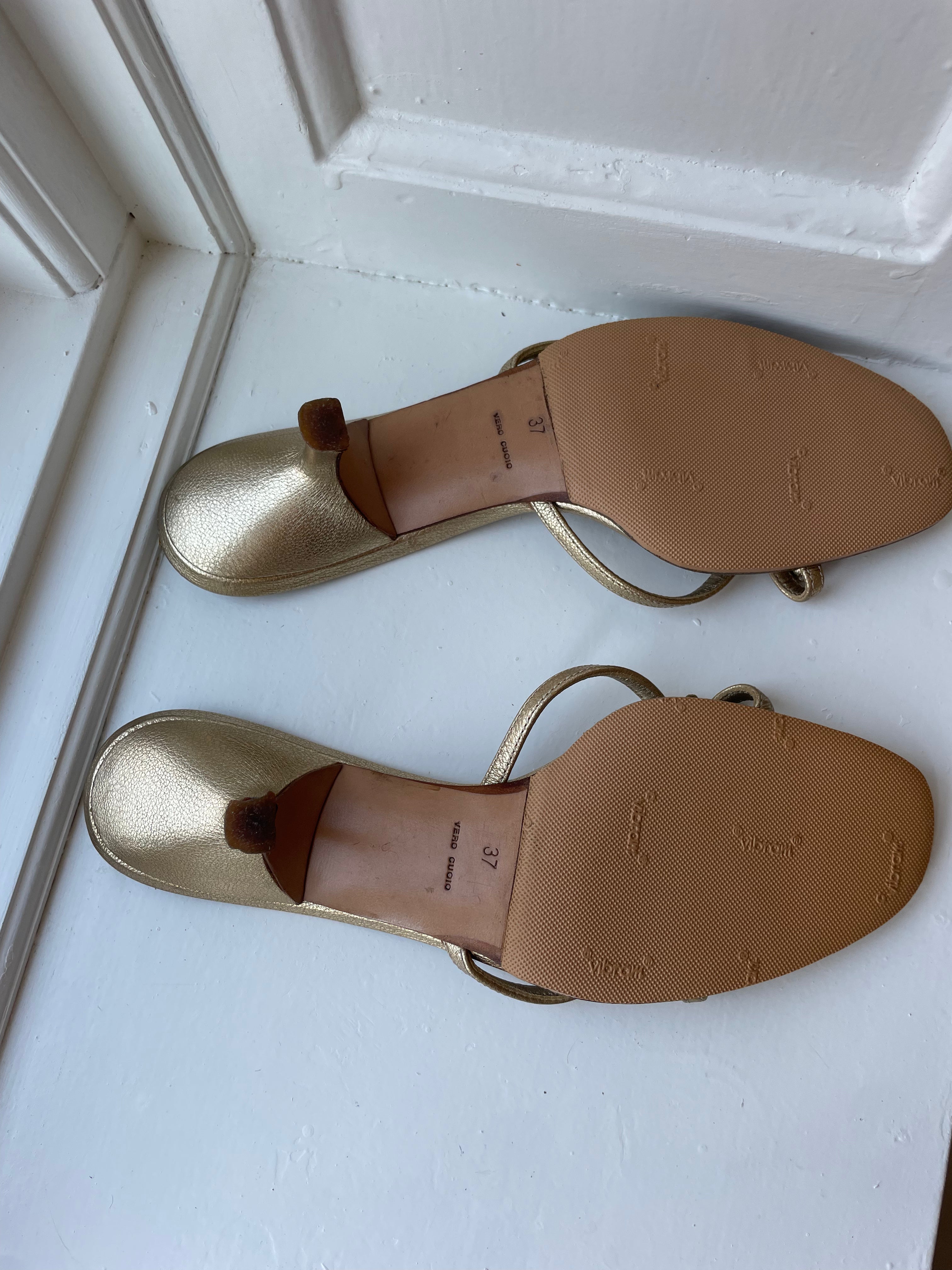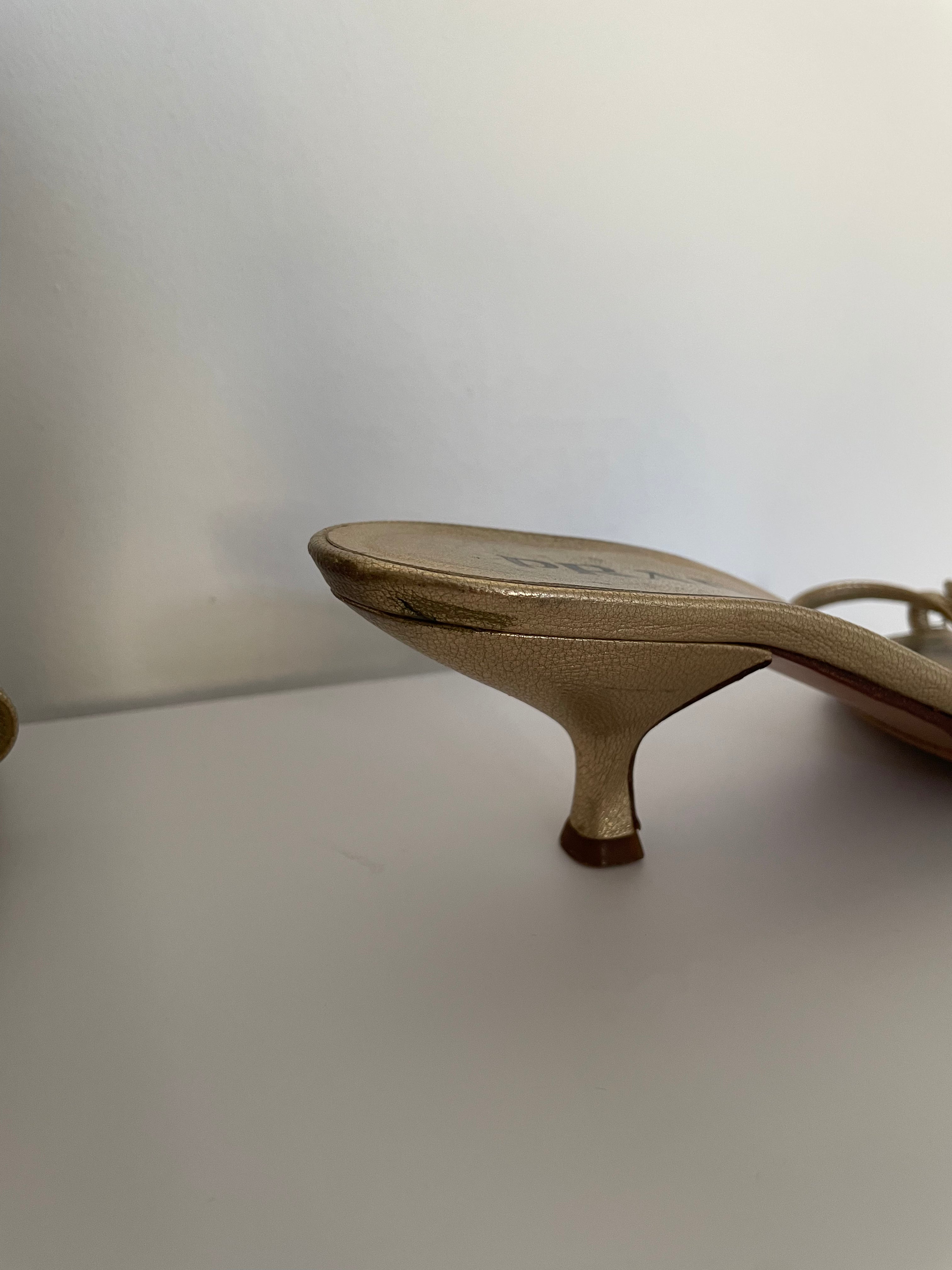 Prada leather sandals in gold. They show signs of wear and have been resoled but remain in great condition and are comfortable to wear.