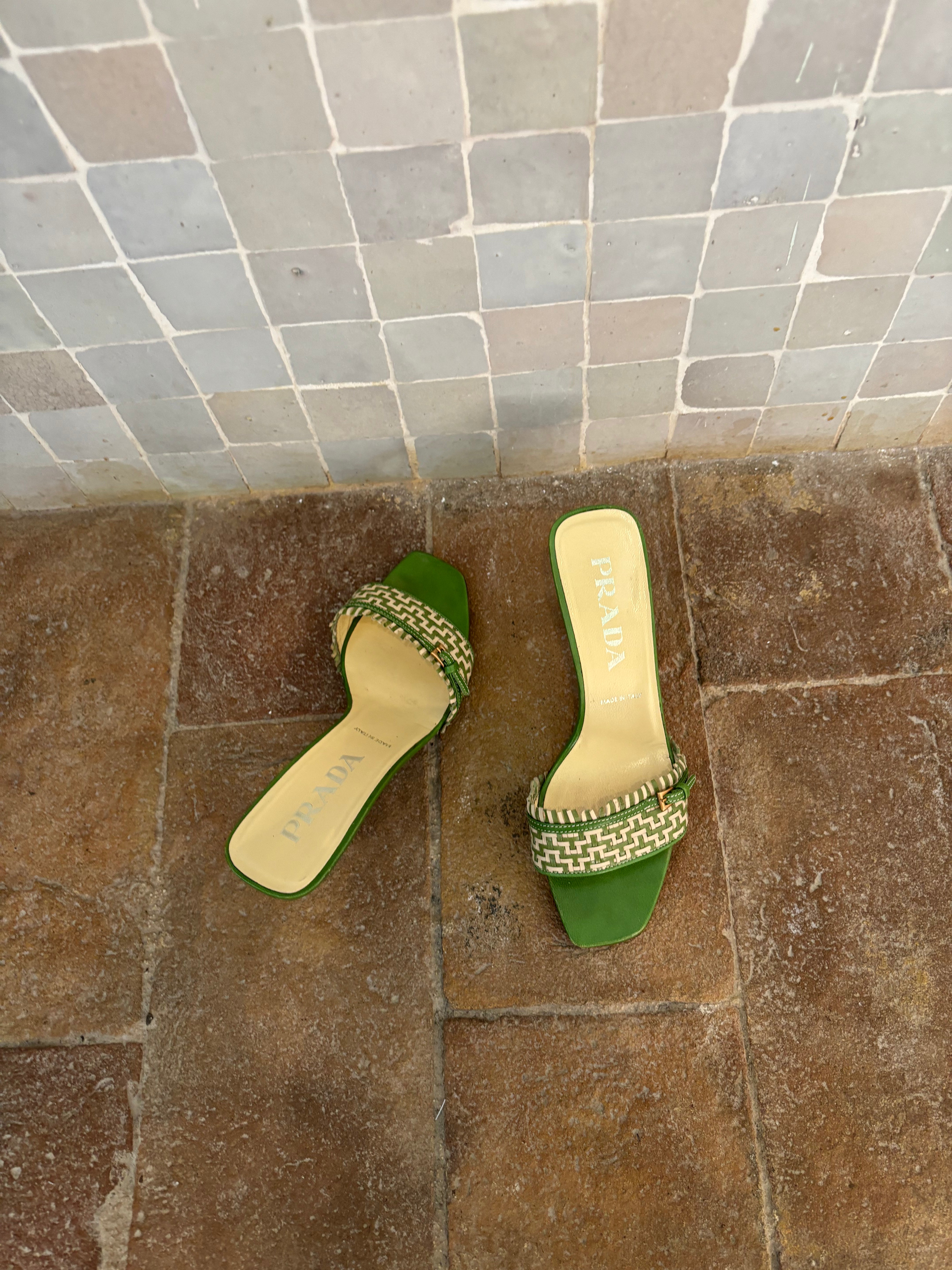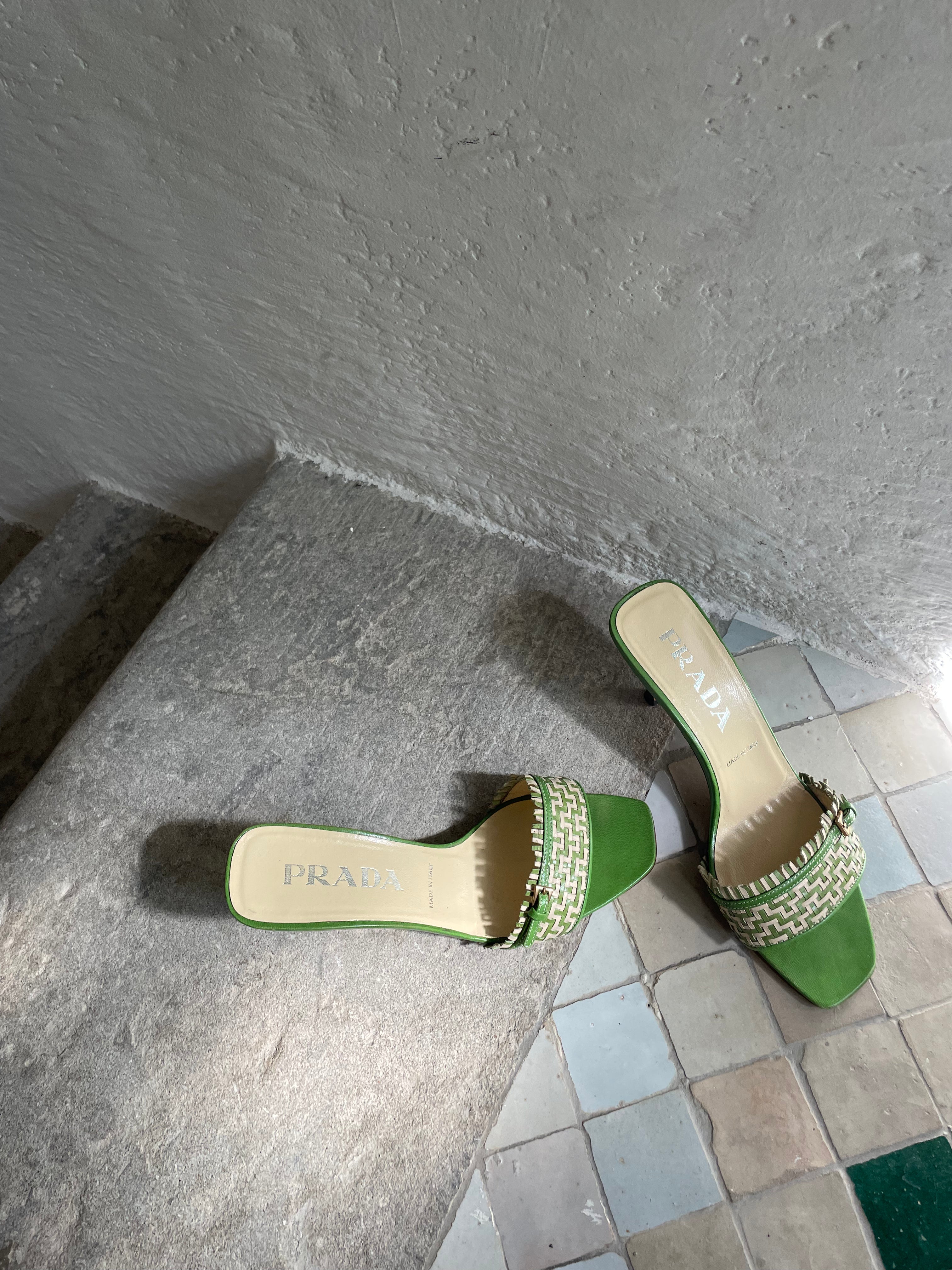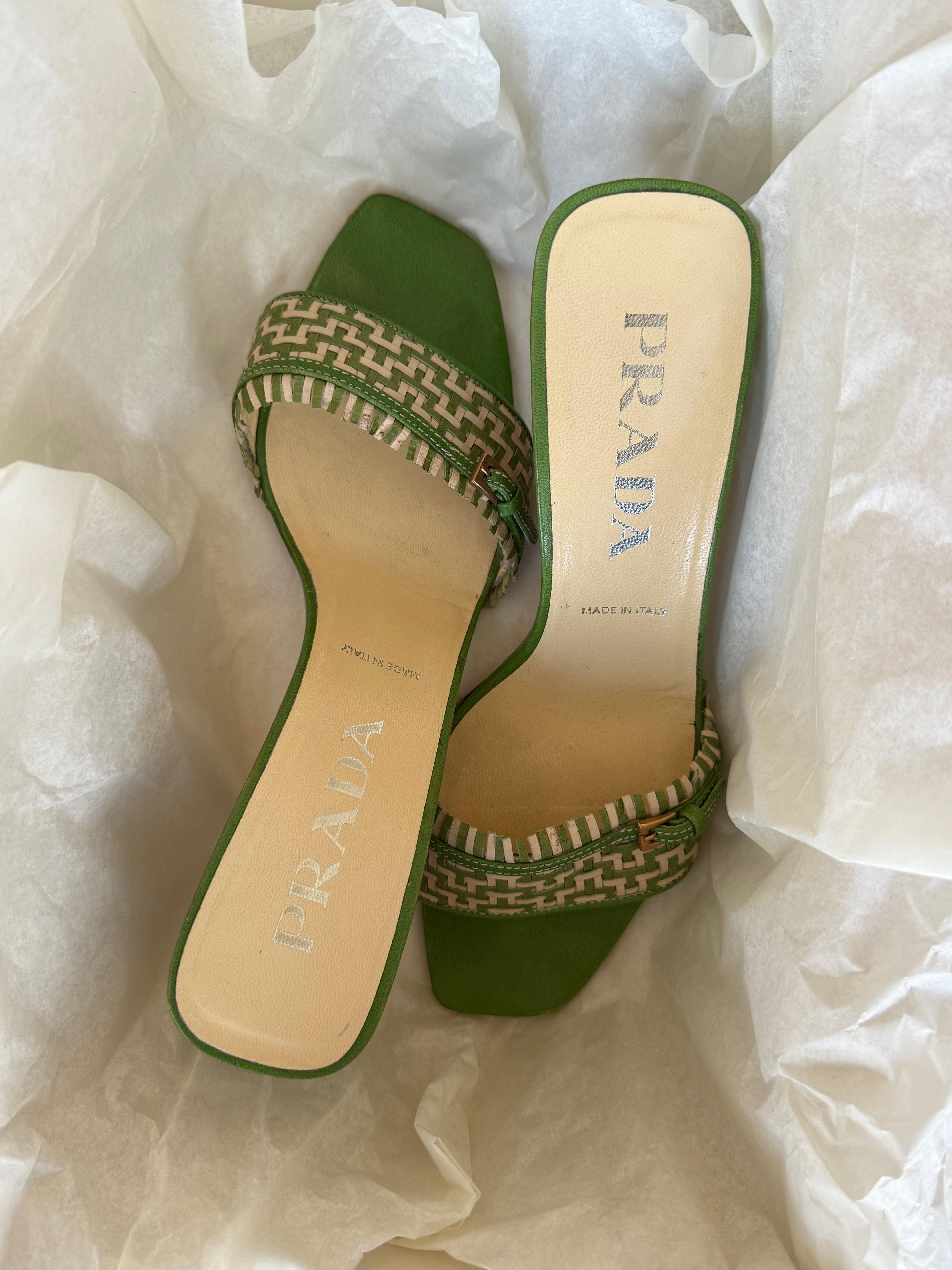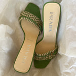 Stunning Prada kitten heels in a chic green and cream color combination, featuring a buckle detail at the front. They are in very good condition and nearly as new.