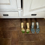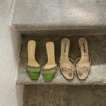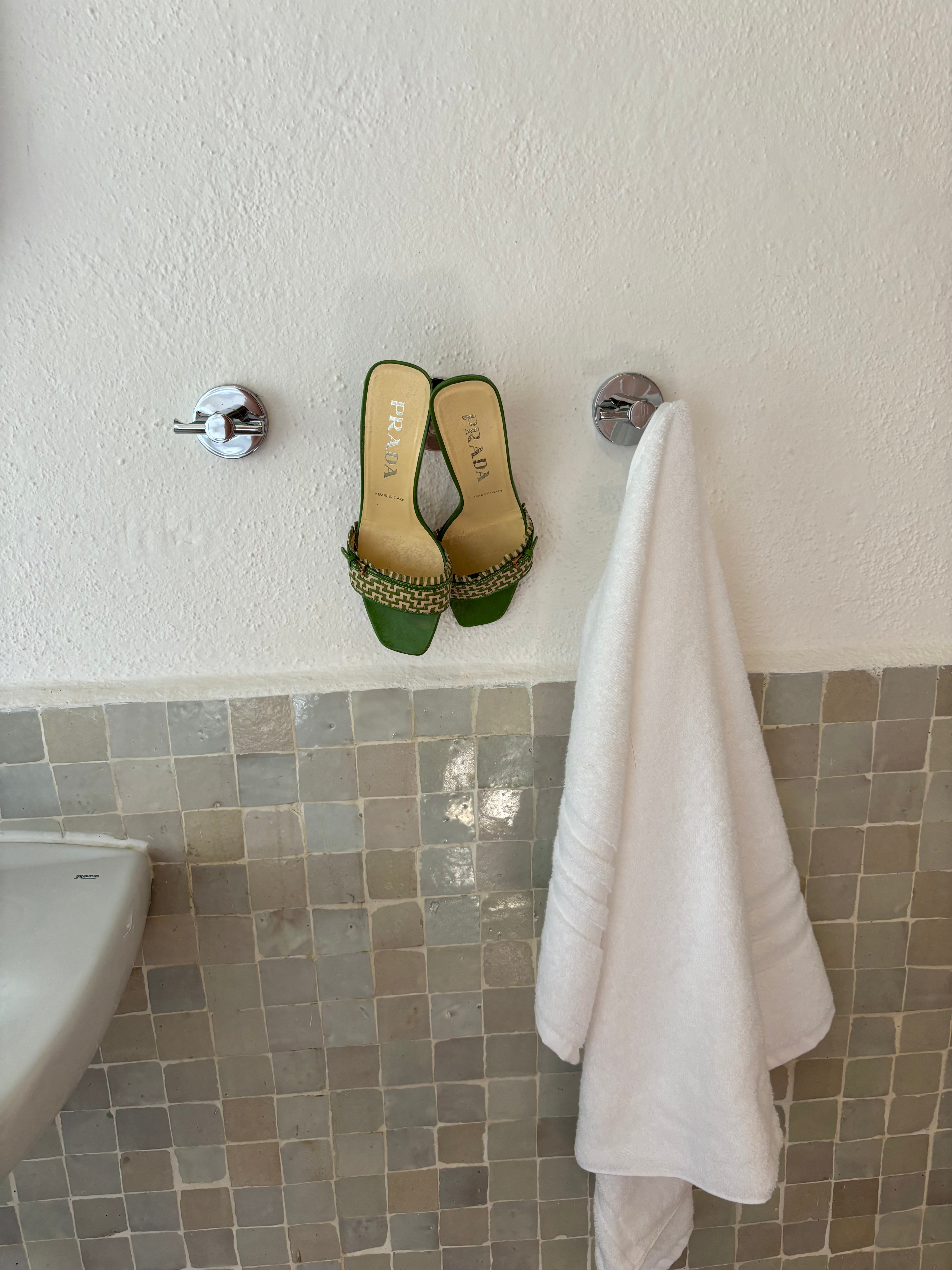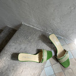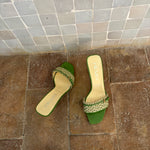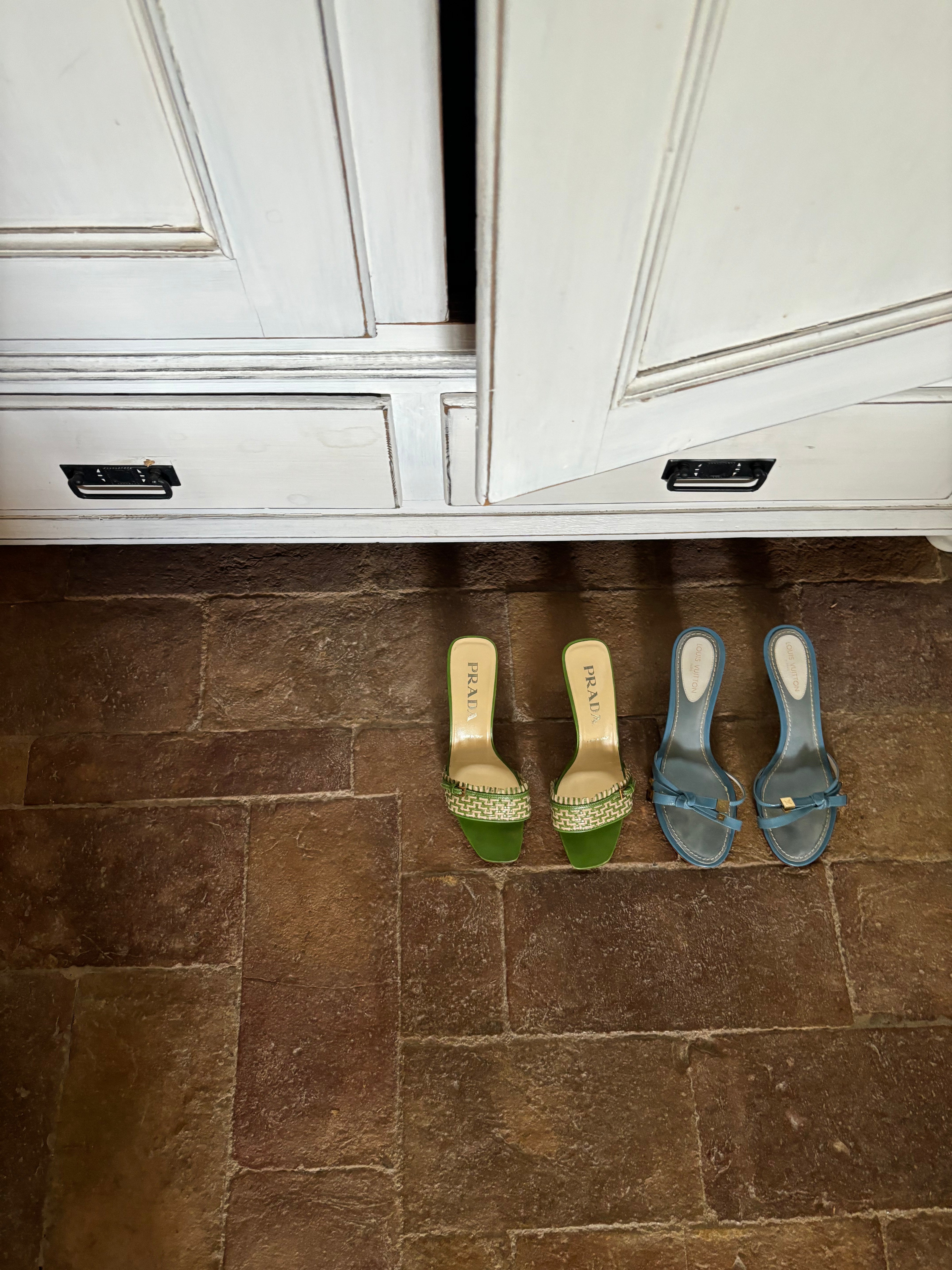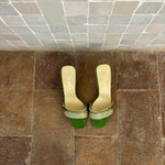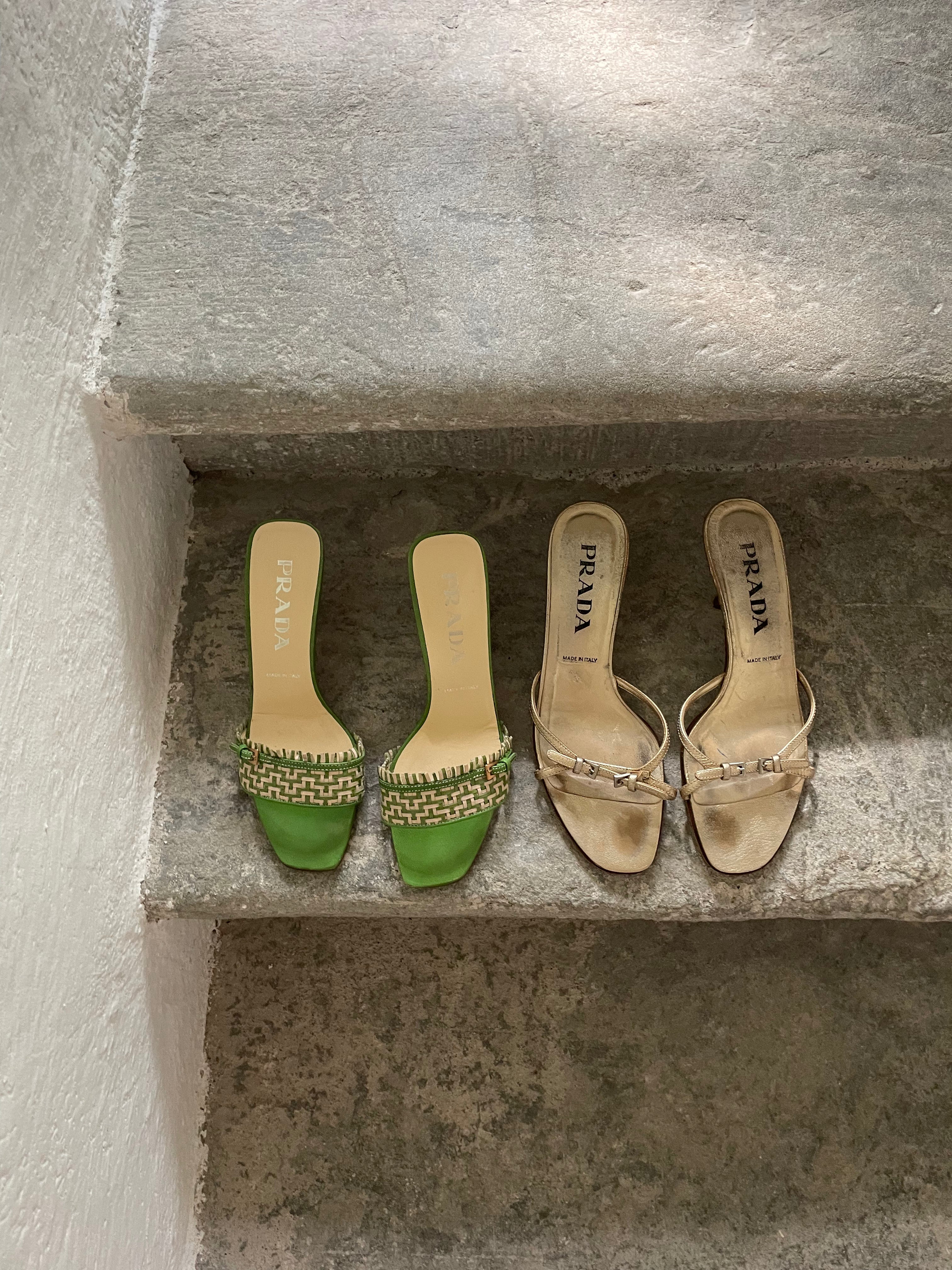 Stunning Prada kitten heels in a chic green and cream color combination, featuring a buckle detail at the front. They are in very good condition and nearly as new.