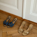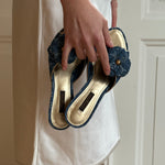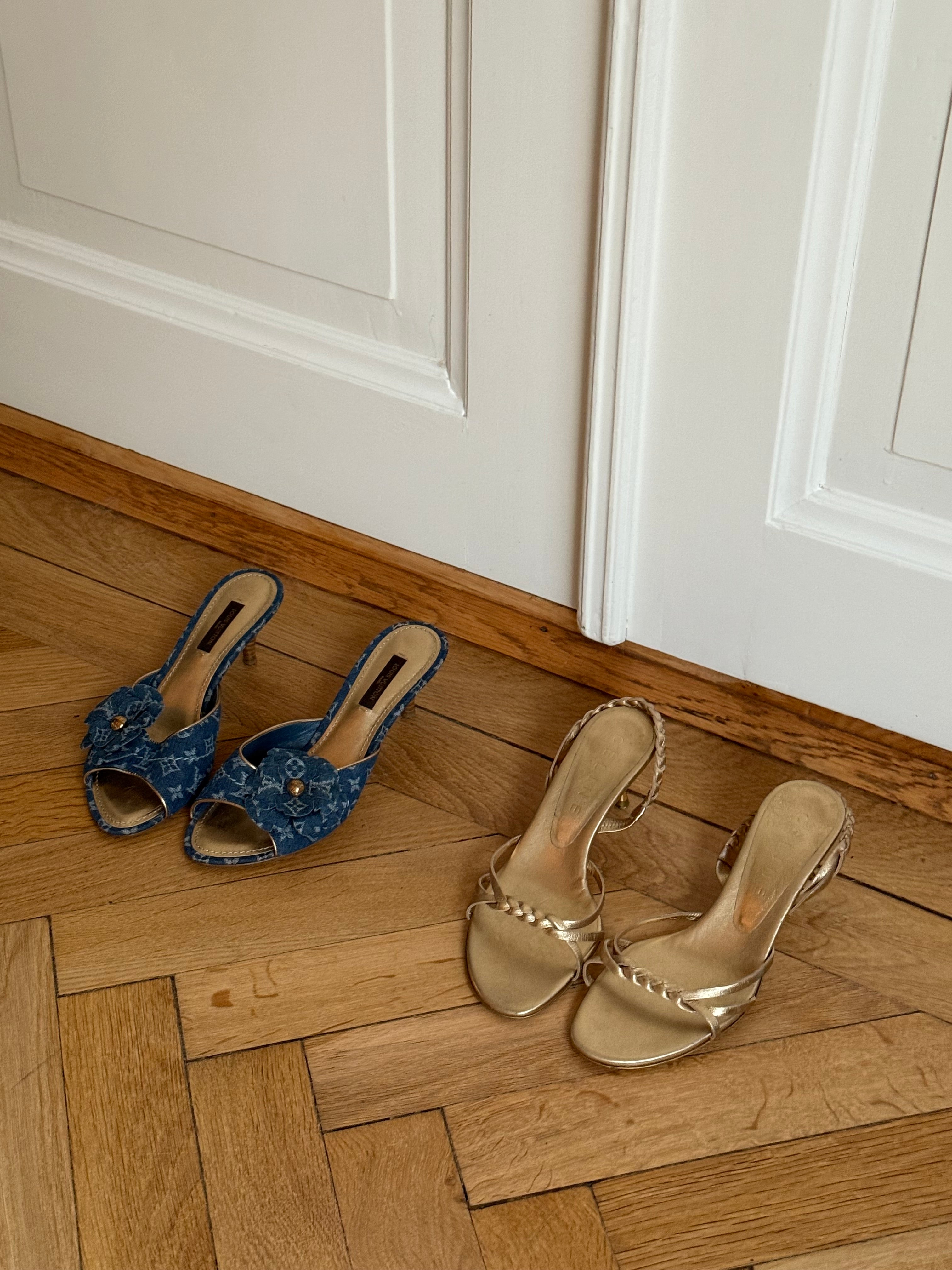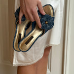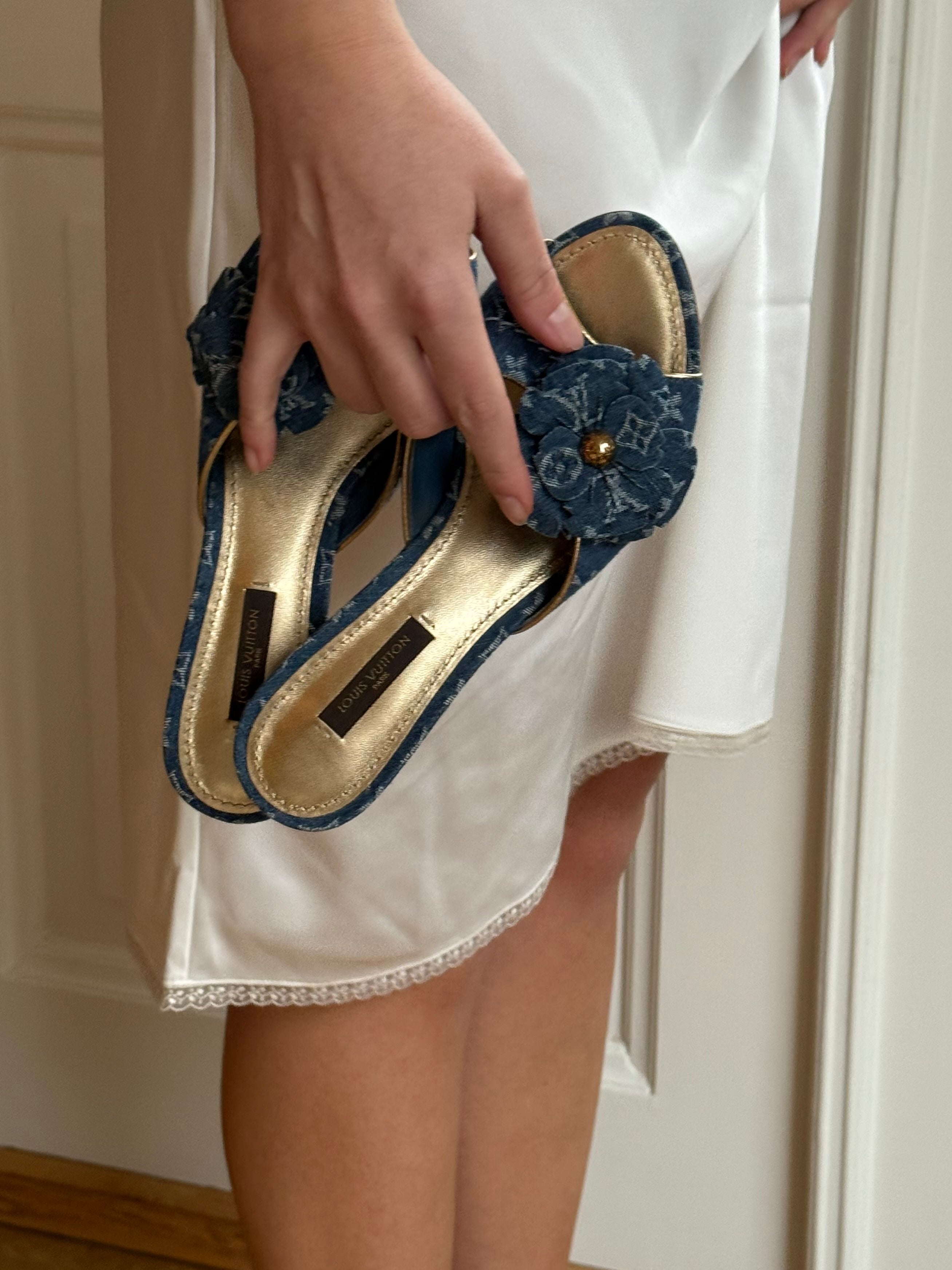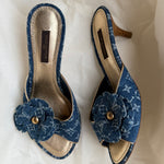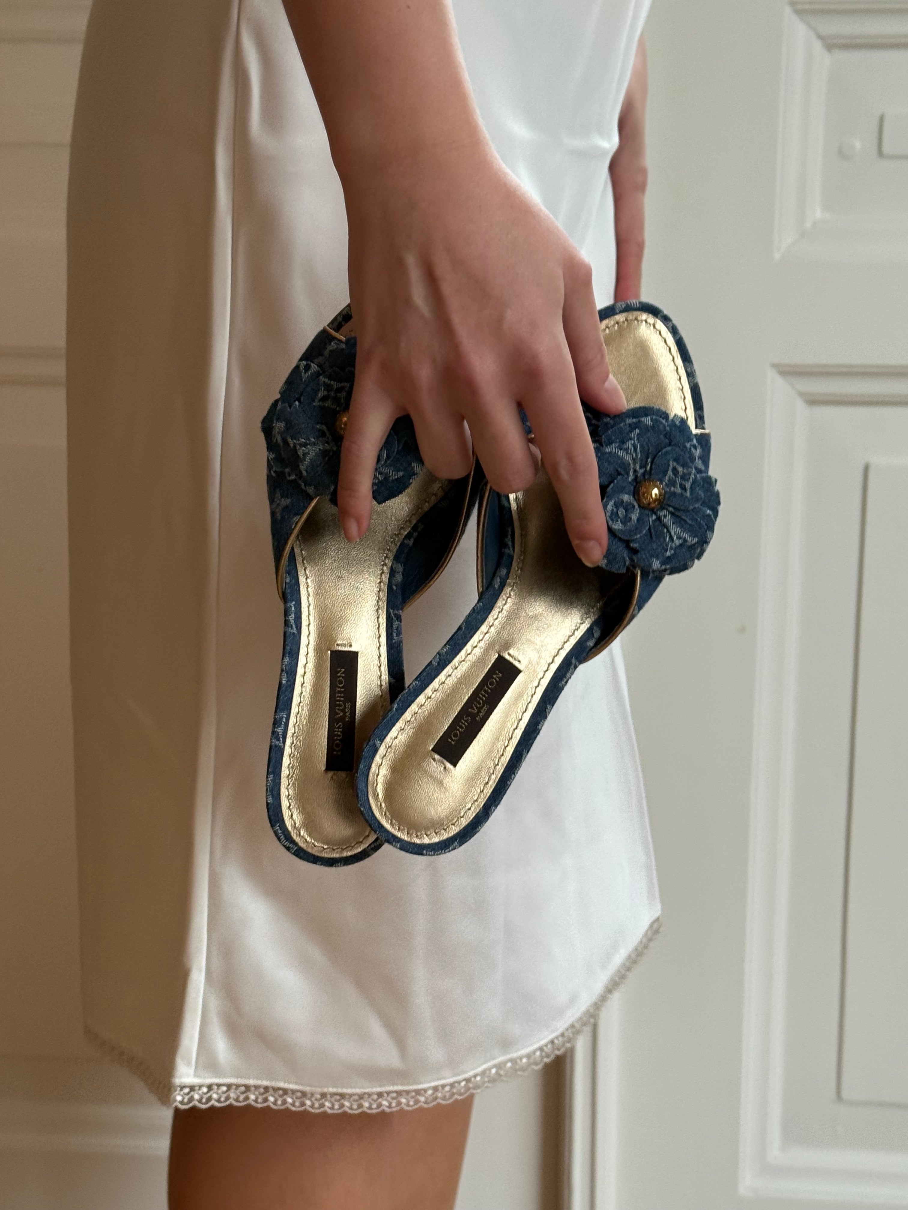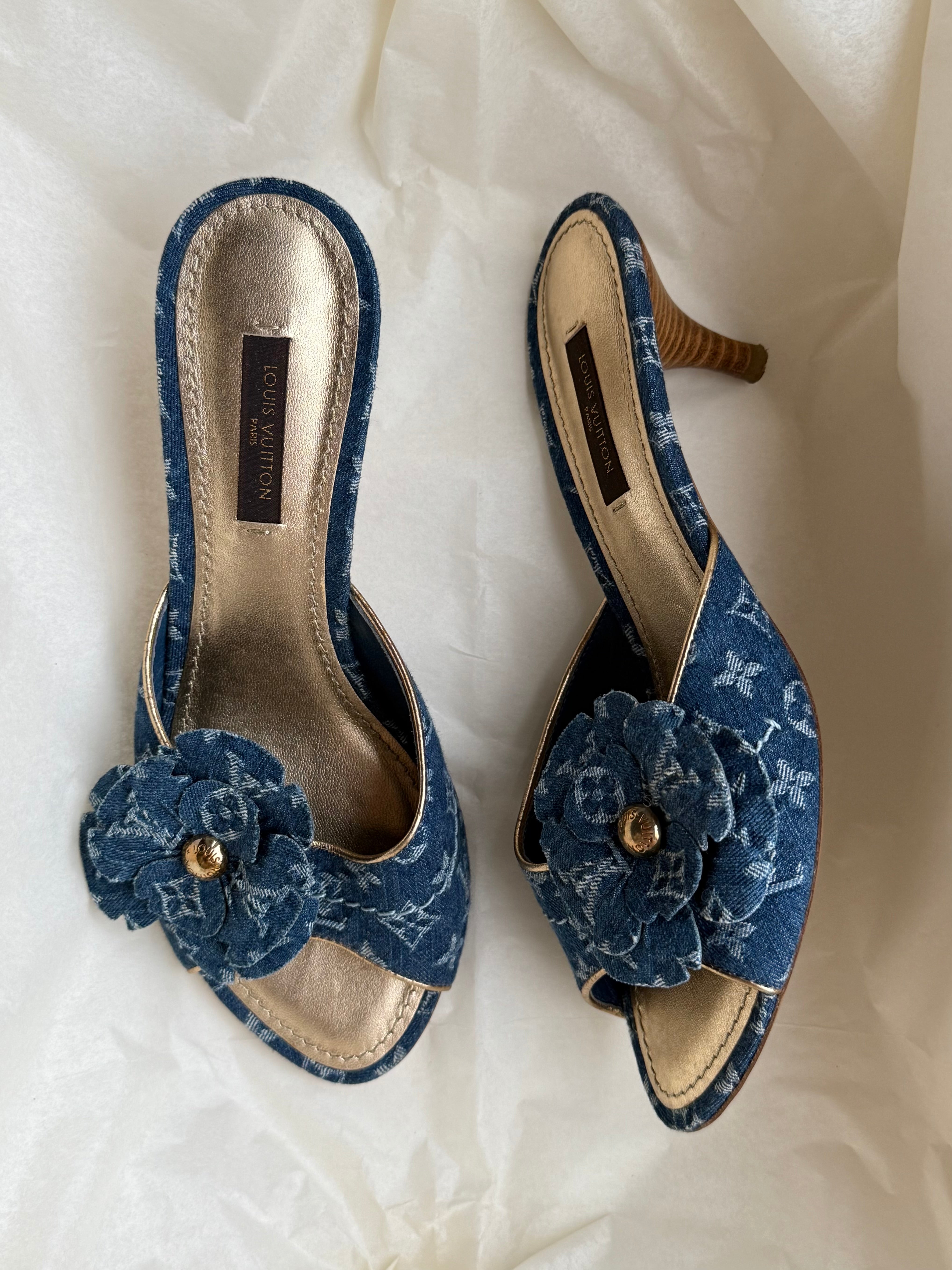 Rare vintage Louis Vuitton denim monogram mules from the early 2000s. Crafted in blue monogram denim with gold-tone leather insoles, detailed with a beautiful denim flower. Comes with the original dustbags.