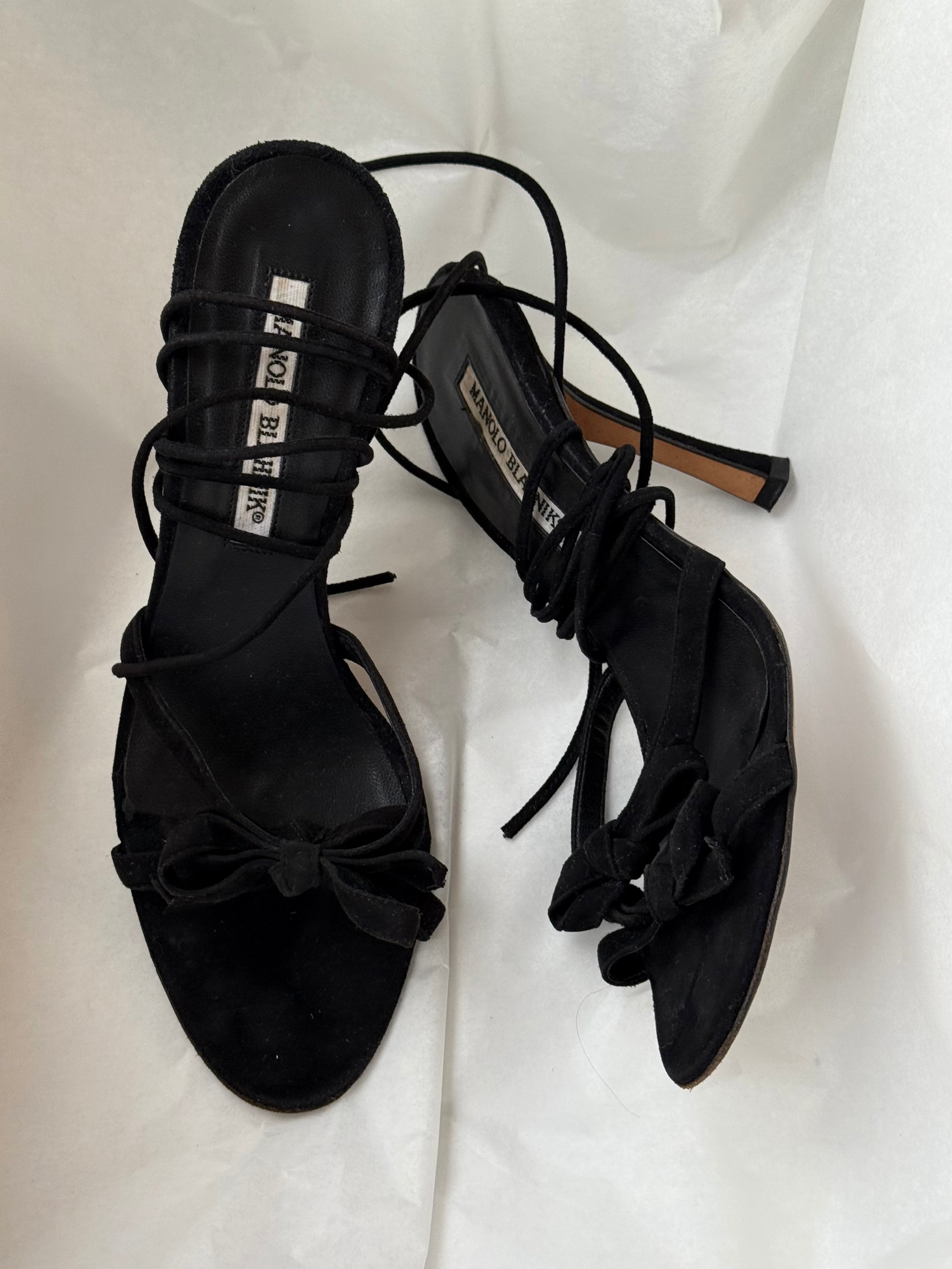 Vintage Manolo Blahnik lace-up sandals in black suede with wrap-around strap.